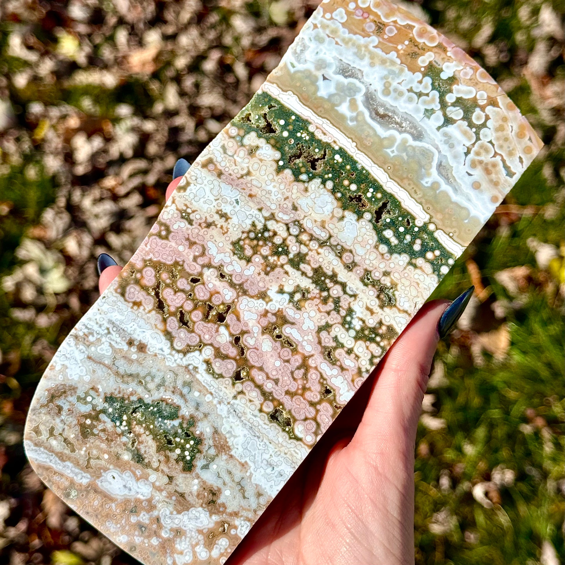 This Large Orbicular Sea Jasper Slab is an amazing statement piece that will take your breath away! With its impressive 7 1/2" length, you'll be mesmerized by its beautiful assortment of colors and orby patterns.