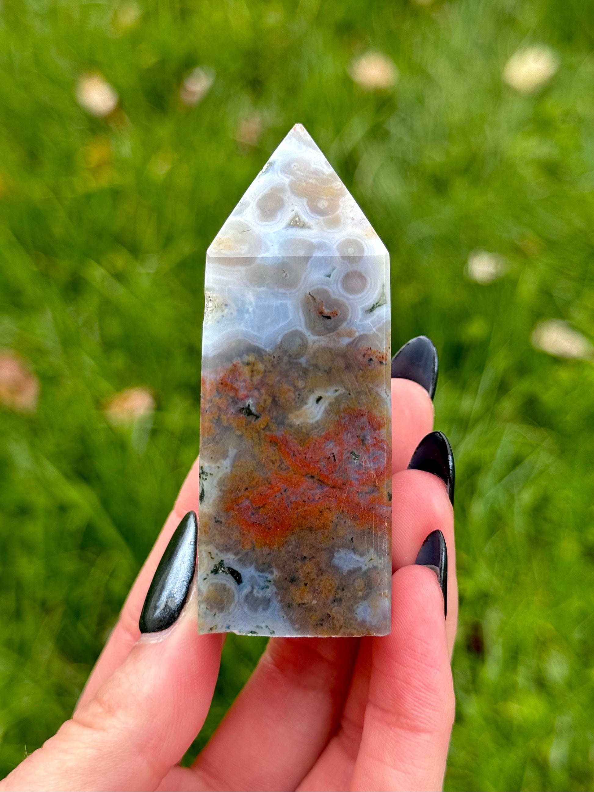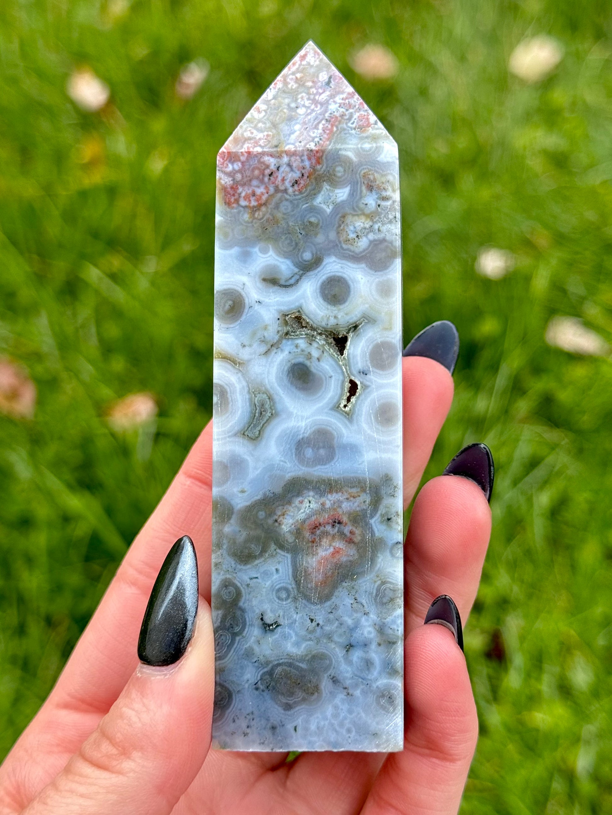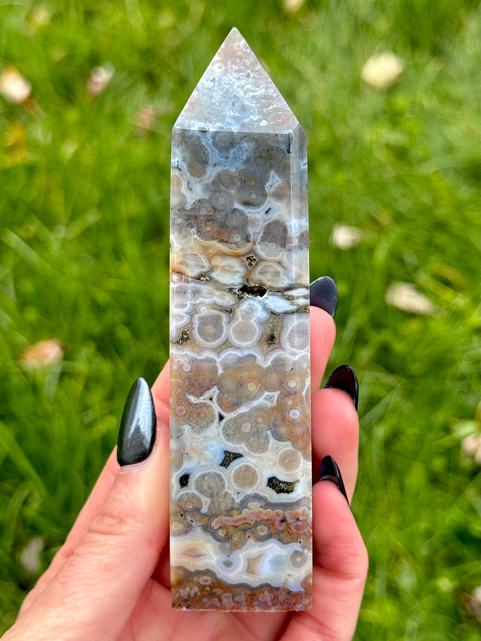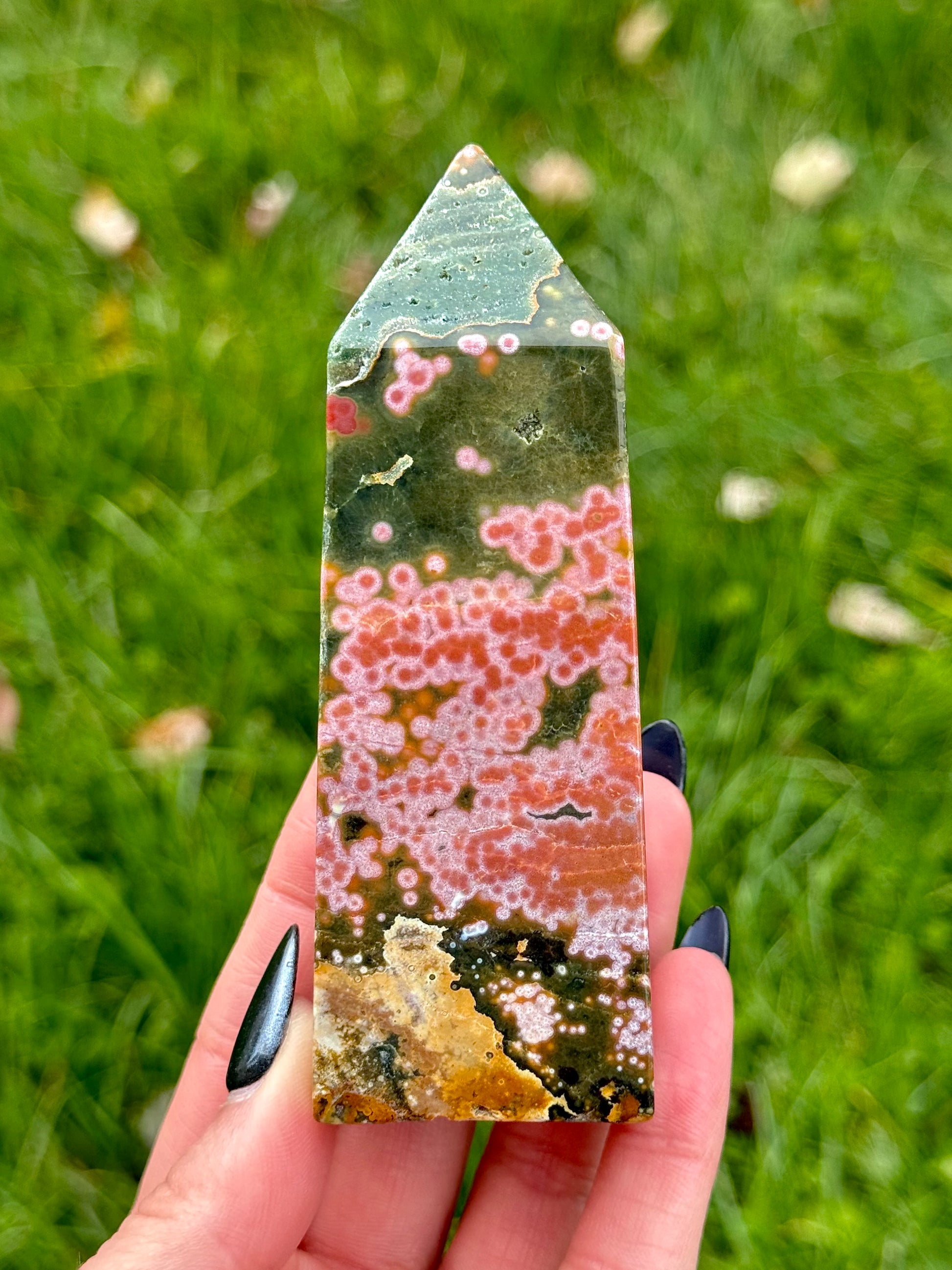 These Orbicular Sea Jasper Towers have colors and patterns that will blow your mind. Each piece is handpicked carefully, so you know you are receiving only the best! Heights of these towers range from 2 3/4" to 4 3/4" tall.