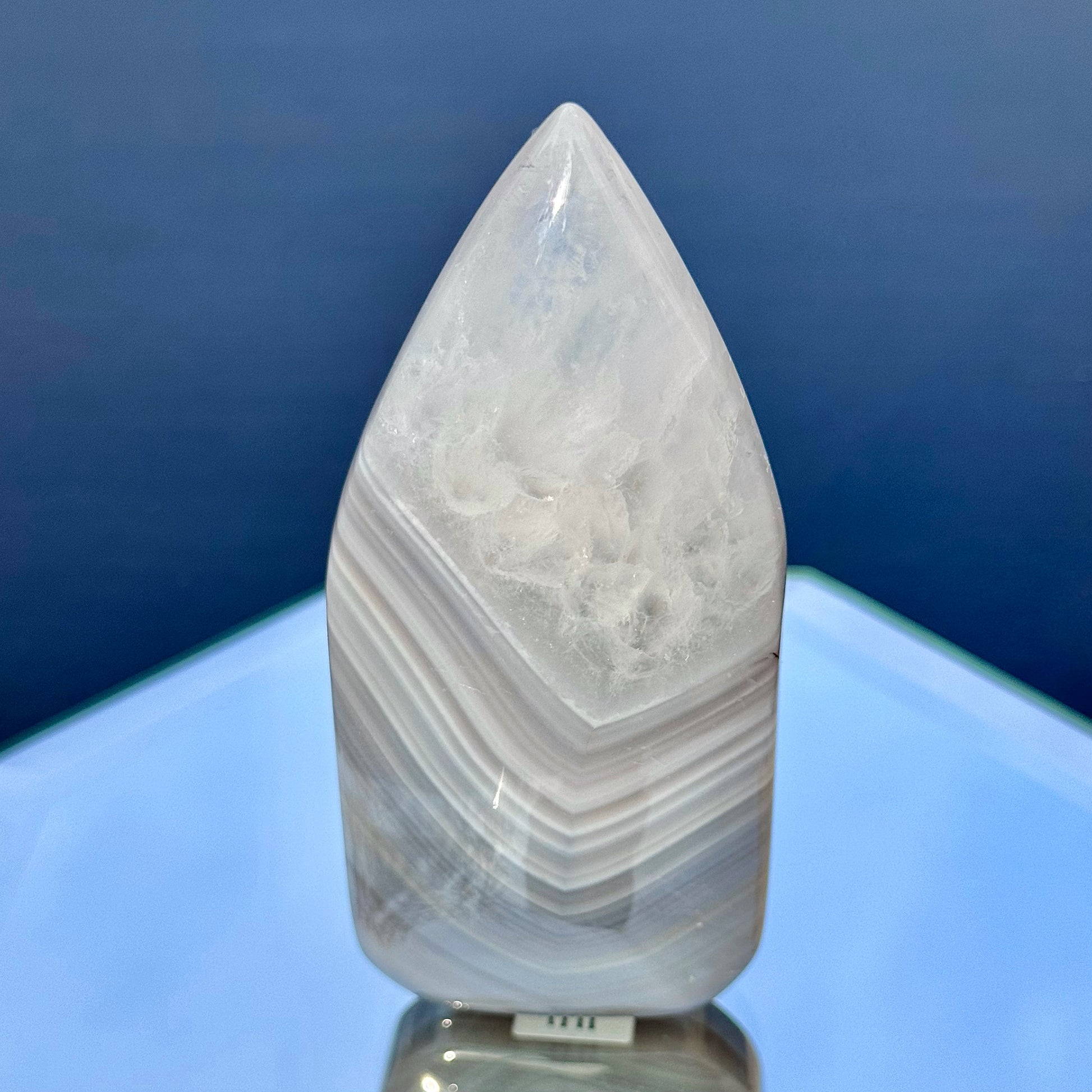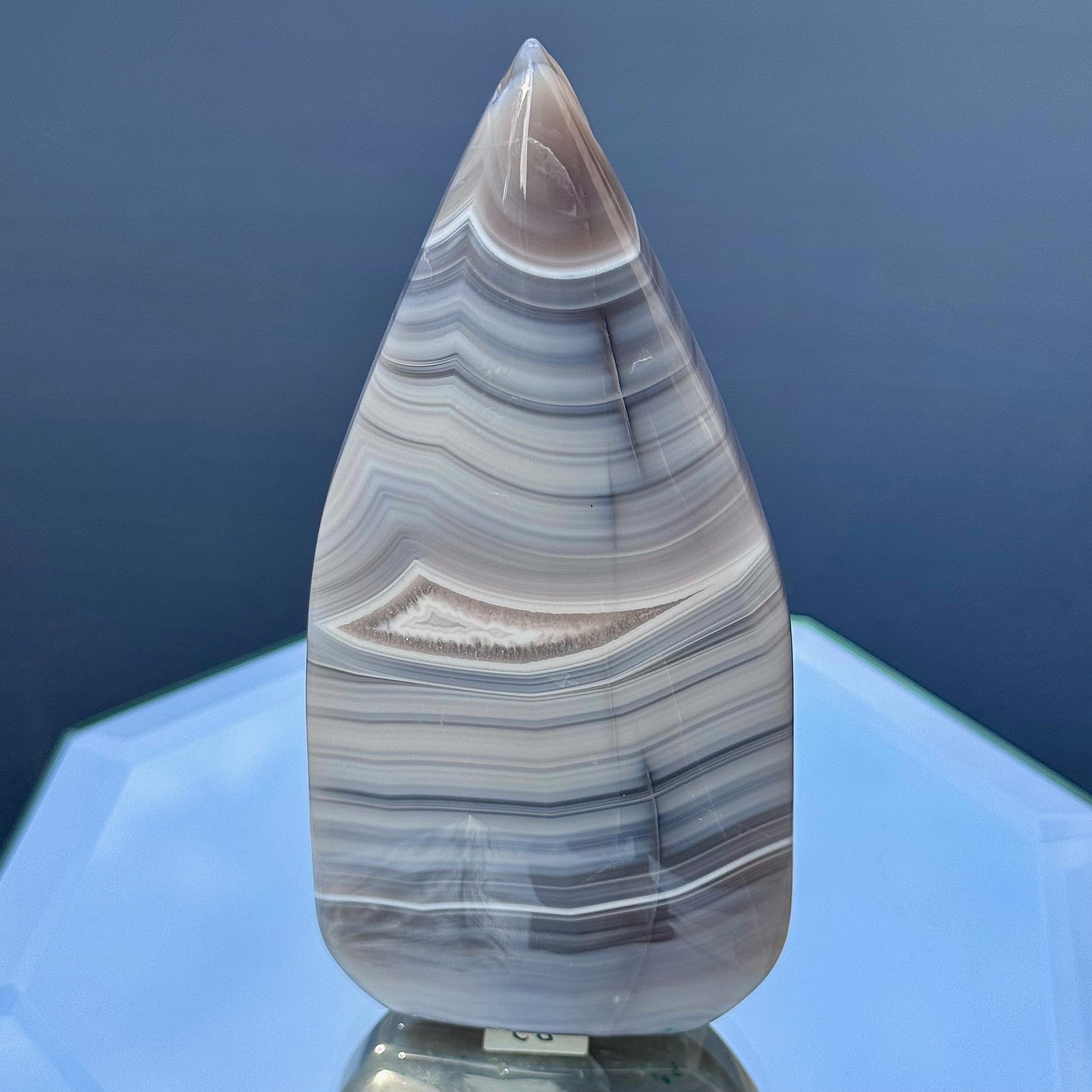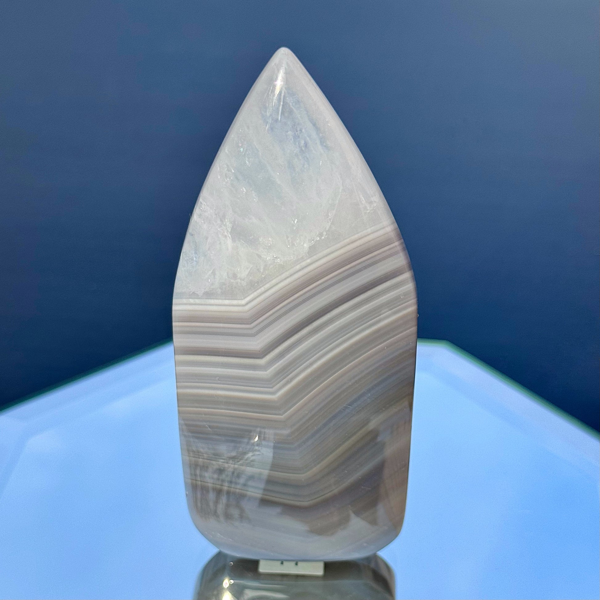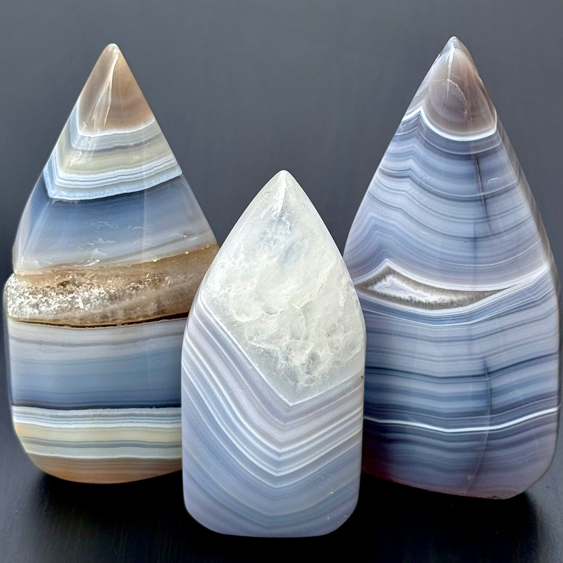 Our Banded Agate Flames will instantly elevate your collection! With unique banding displaying hues of blue, gray, and beige, you'll find the perfect centerpiece for your space. These flames range in heights from 4" to 4 3/4" tall. Obsessed with these!