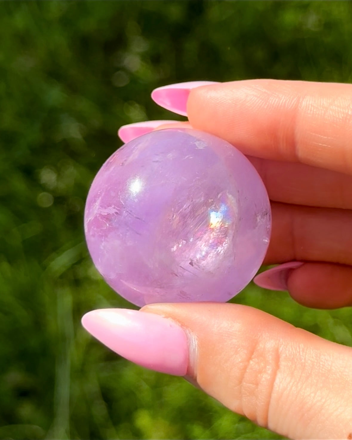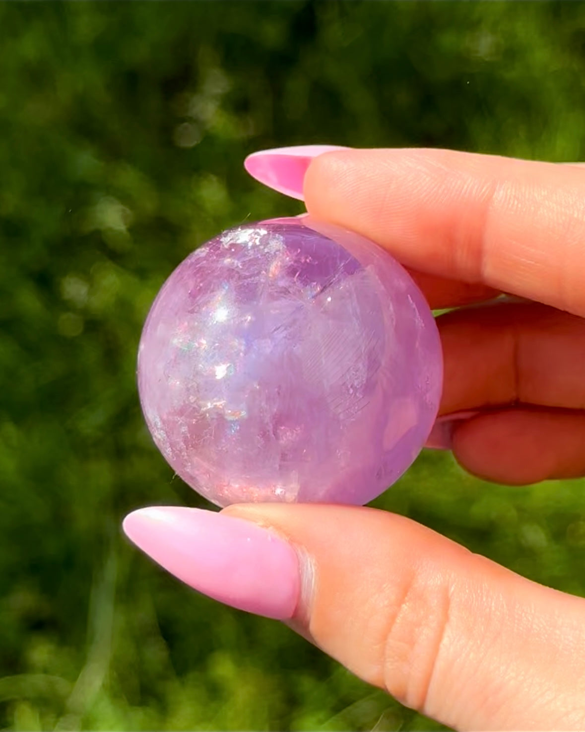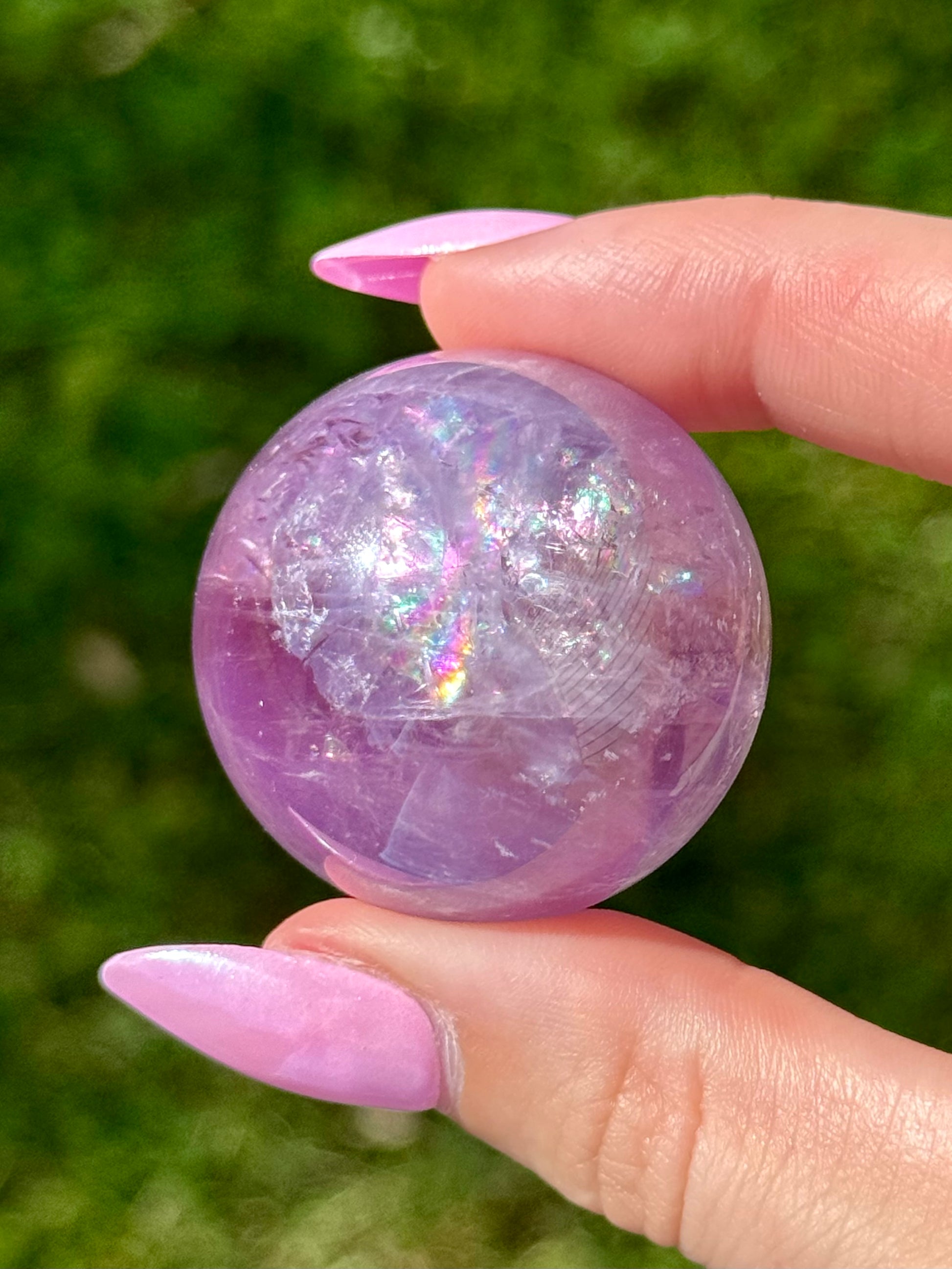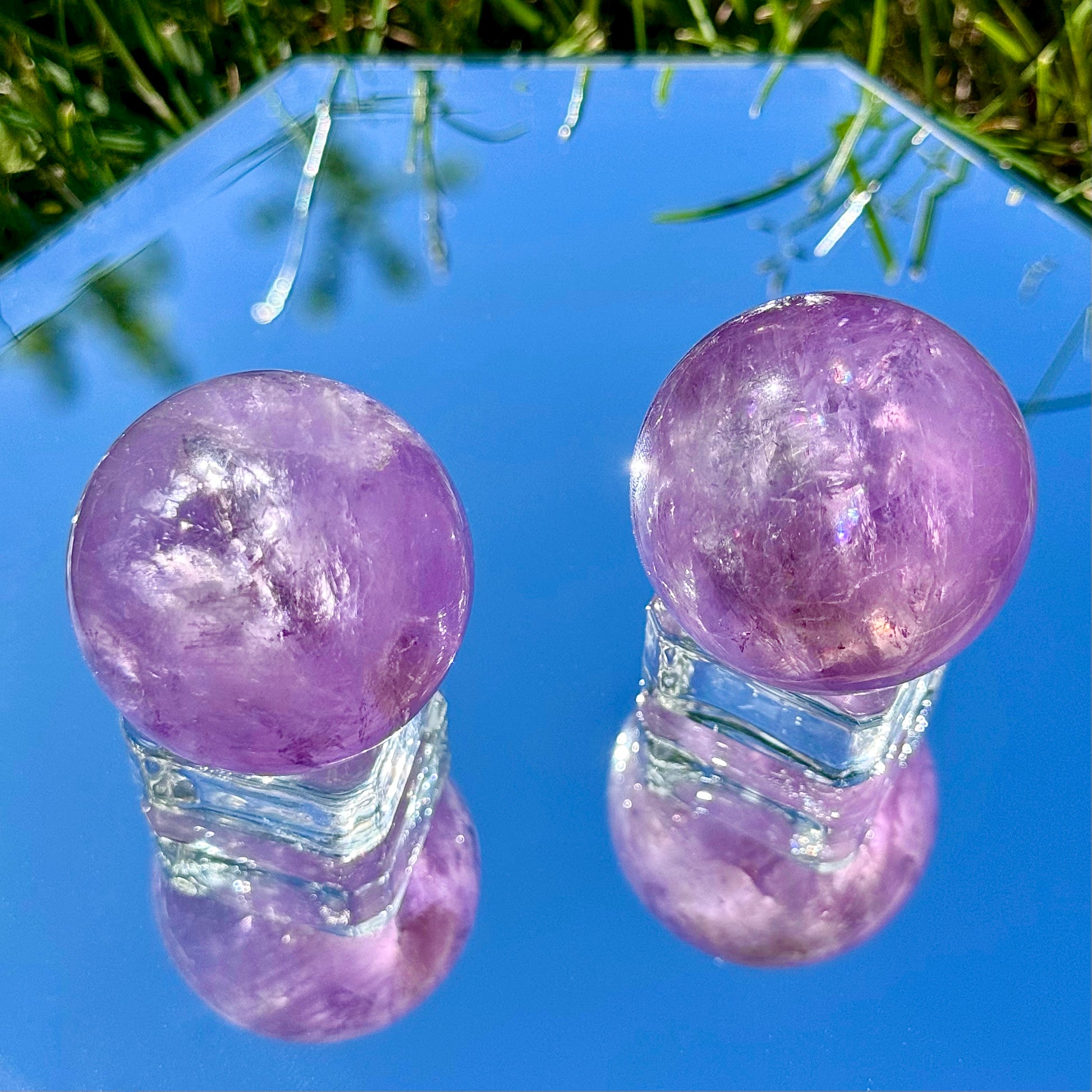 These Amethyst Spheres are on the smaller side, but they have an amazing purple hue with lots of shimmer and rainbow inside!