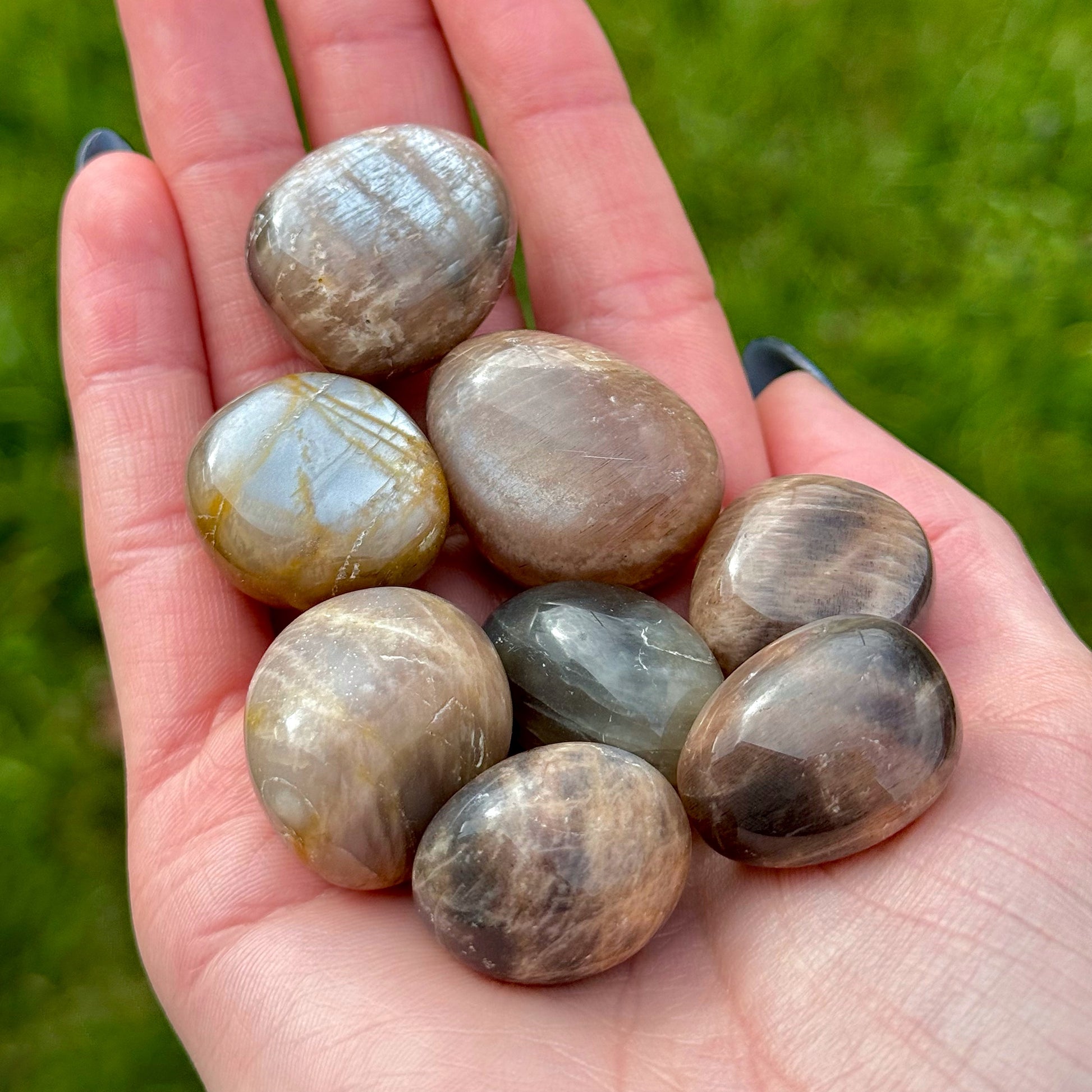 These little Black Moonstone Tumbles feature amazing flash and are available in two different sizes.