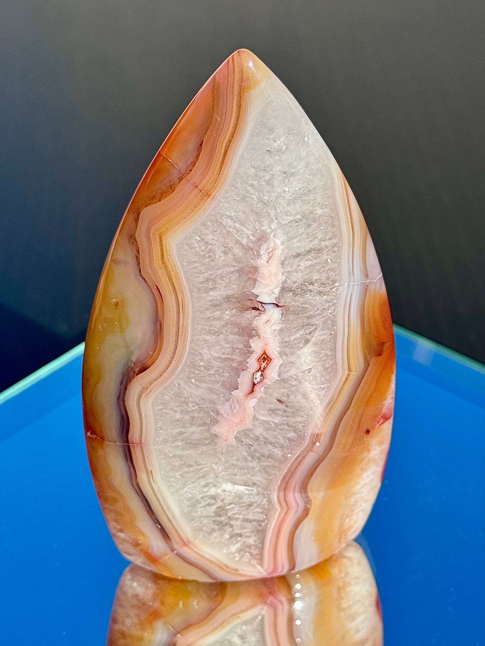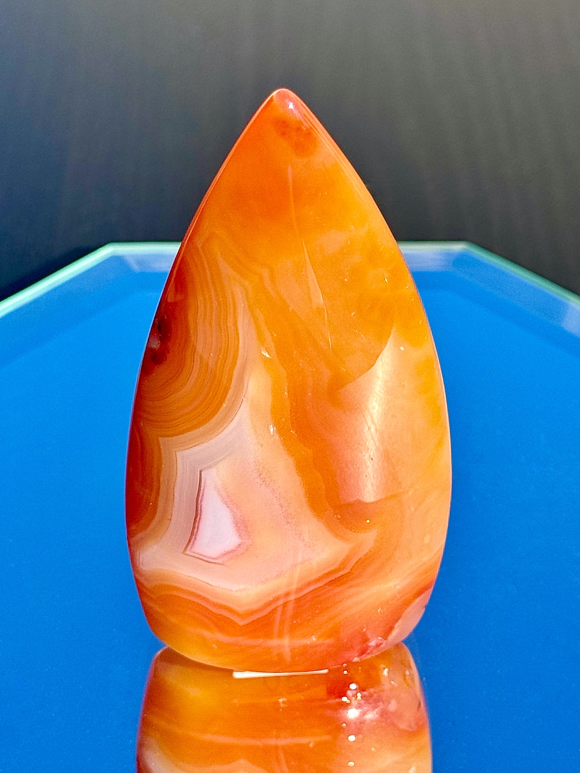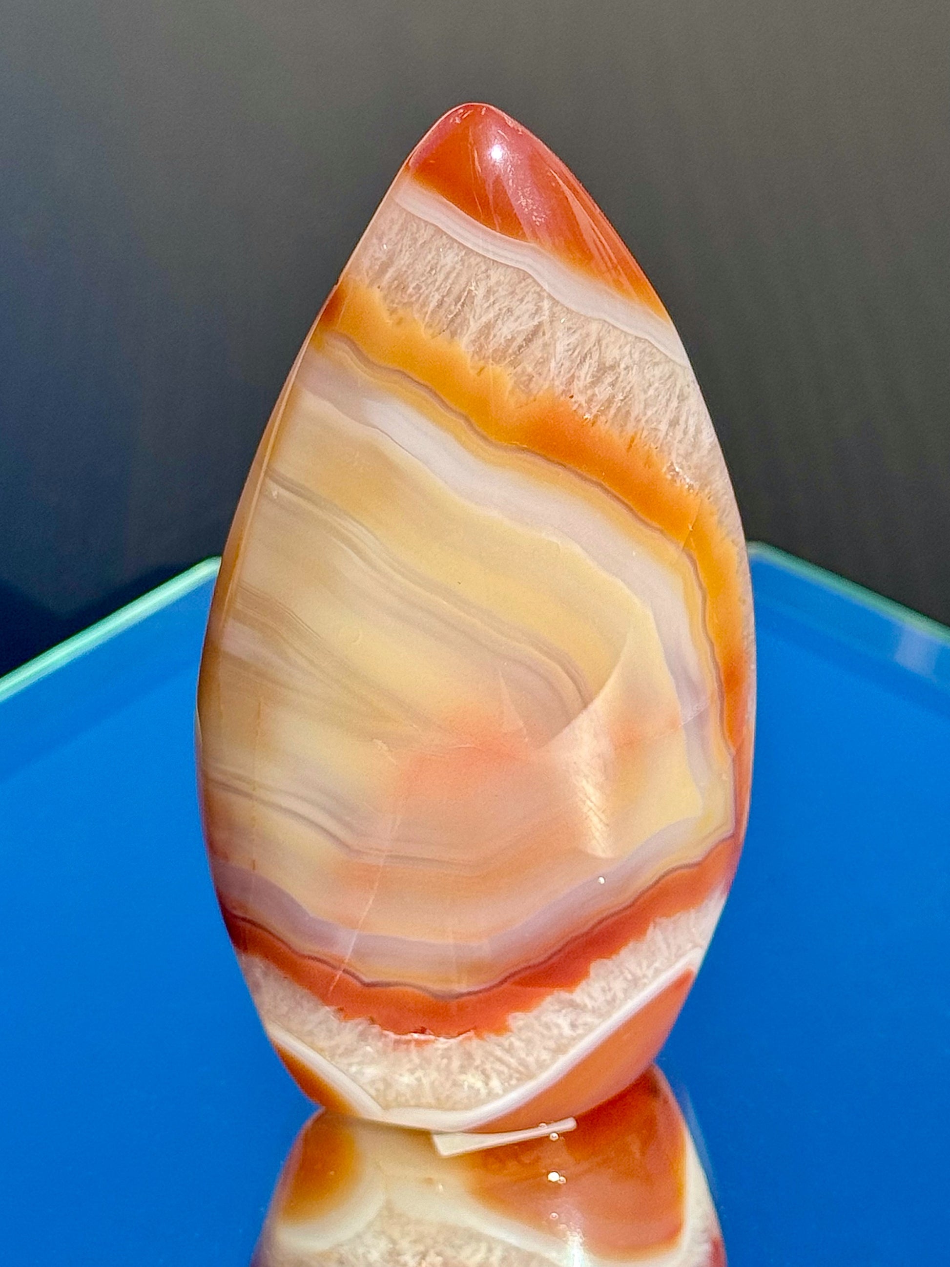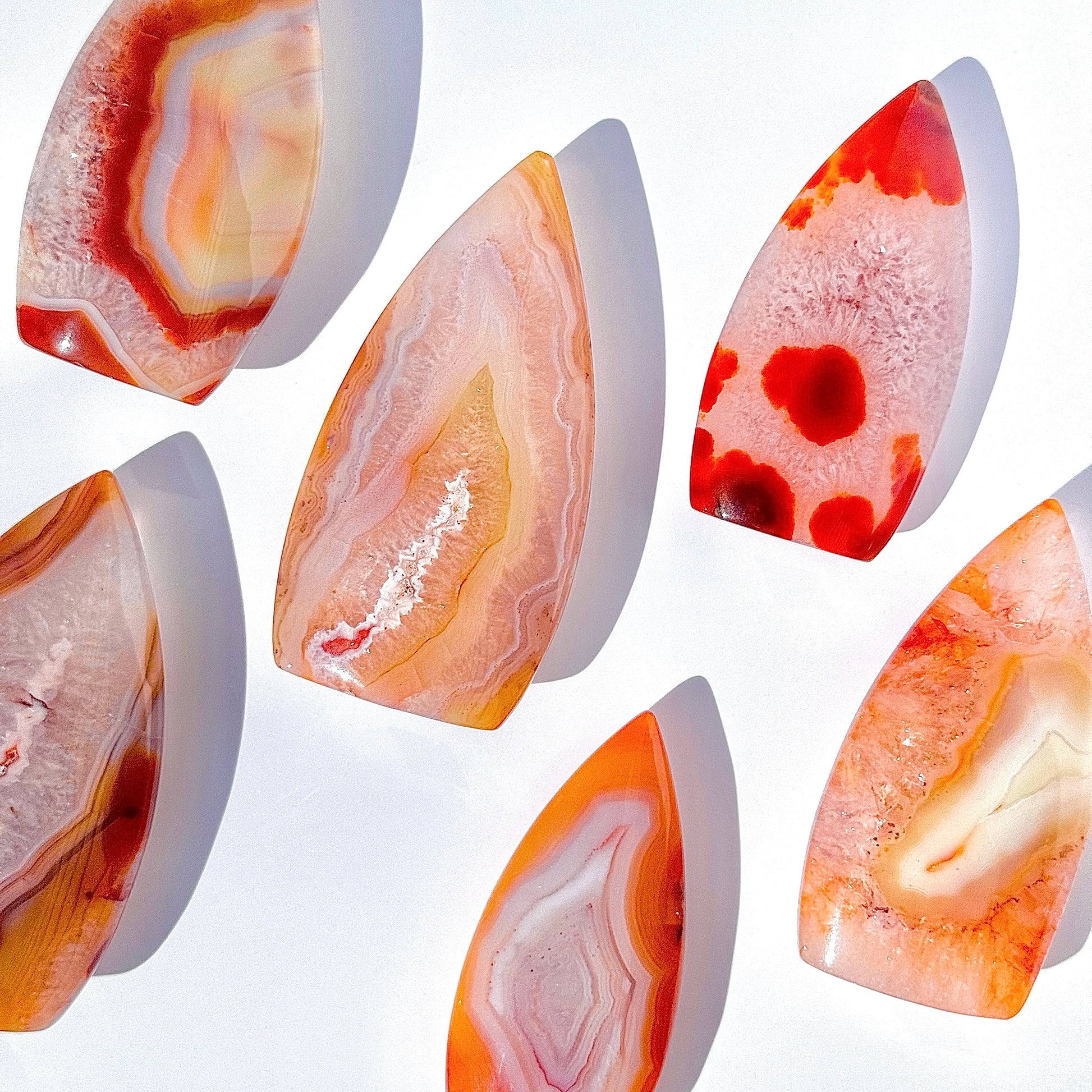 Discover the fiery beauty of these stunning Carnelian Flames! Their colorful warm hues, sparkly quartz inclusions, and unique banding will blow your mind! Choose from different heights, ranging from 3 1/4" to 4 1/4" tall.
