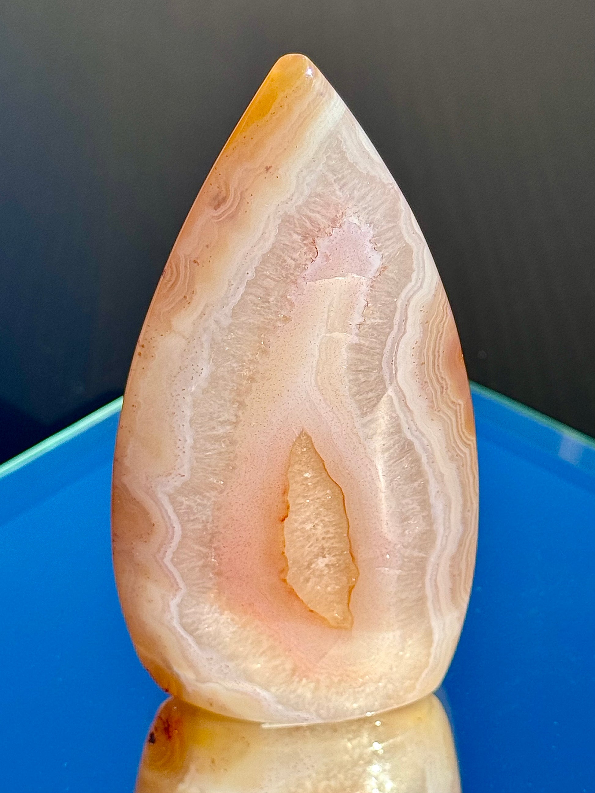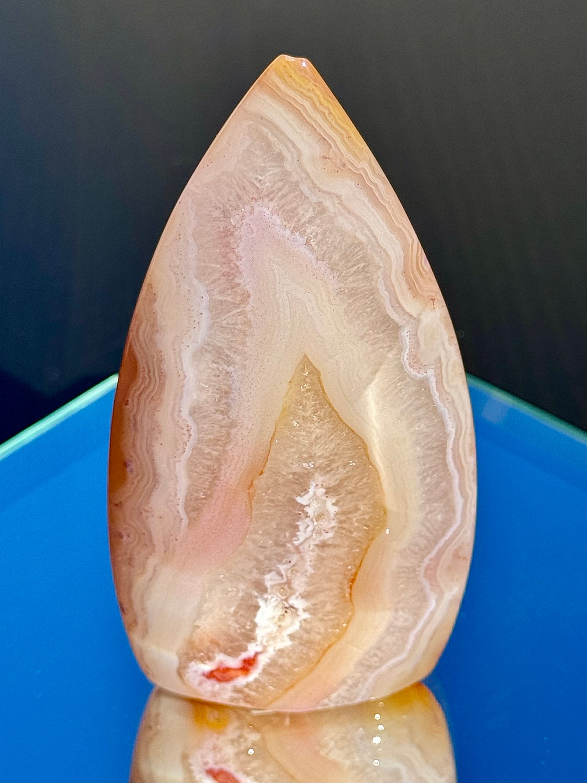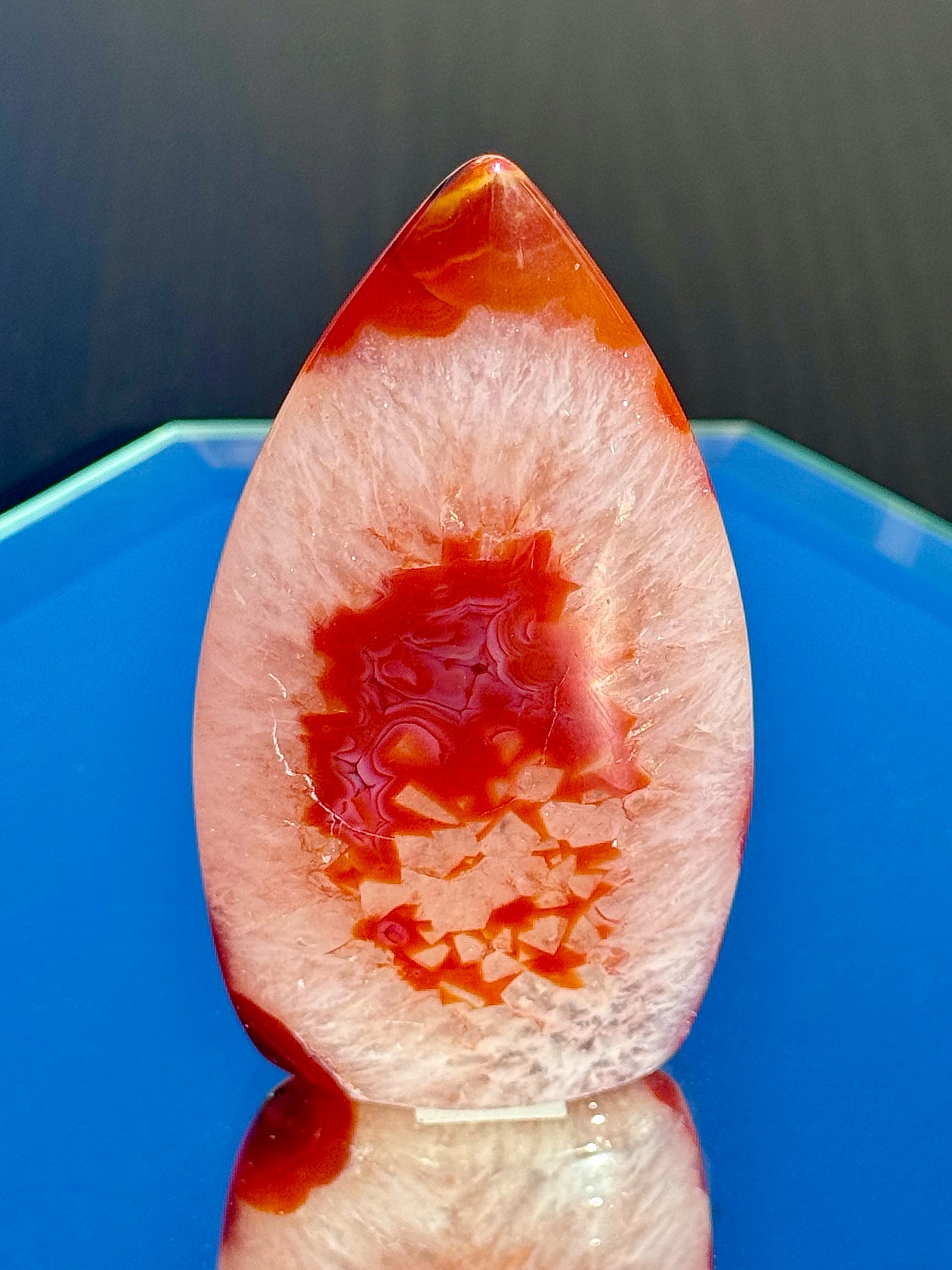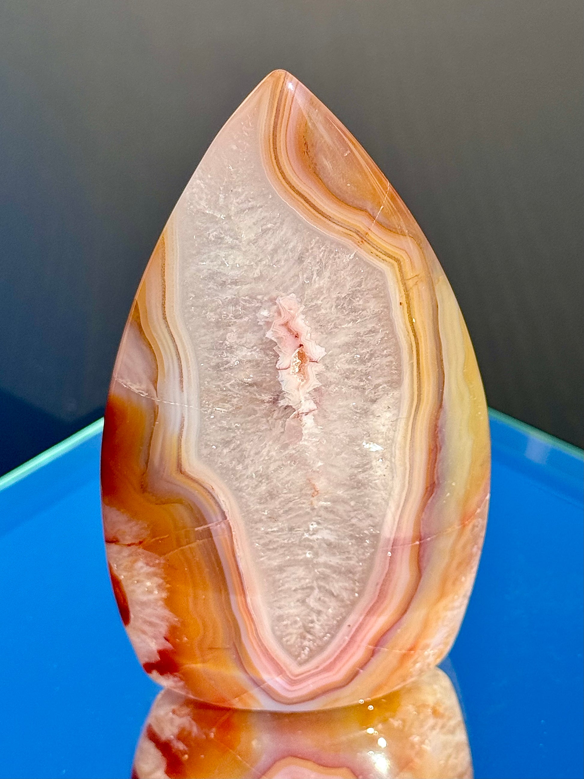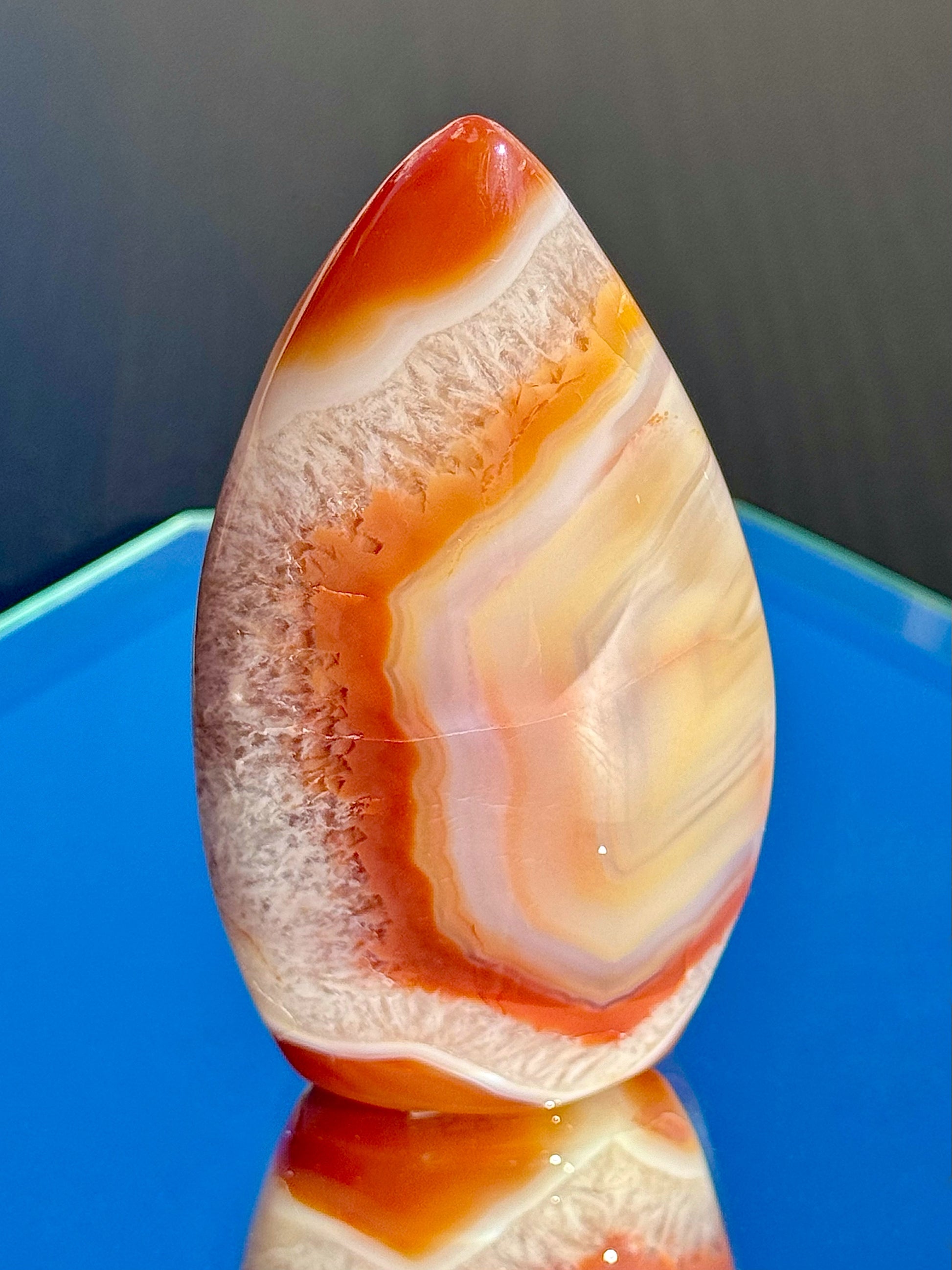 Discover the fiery beauty of these stunning Carnelian Flames! Their colorful warm hues, sparkly quartz inclusions, and unique banding will blow your mind! Choose from different heights, ranging from 3 1/4" to 4 1/4" tall.