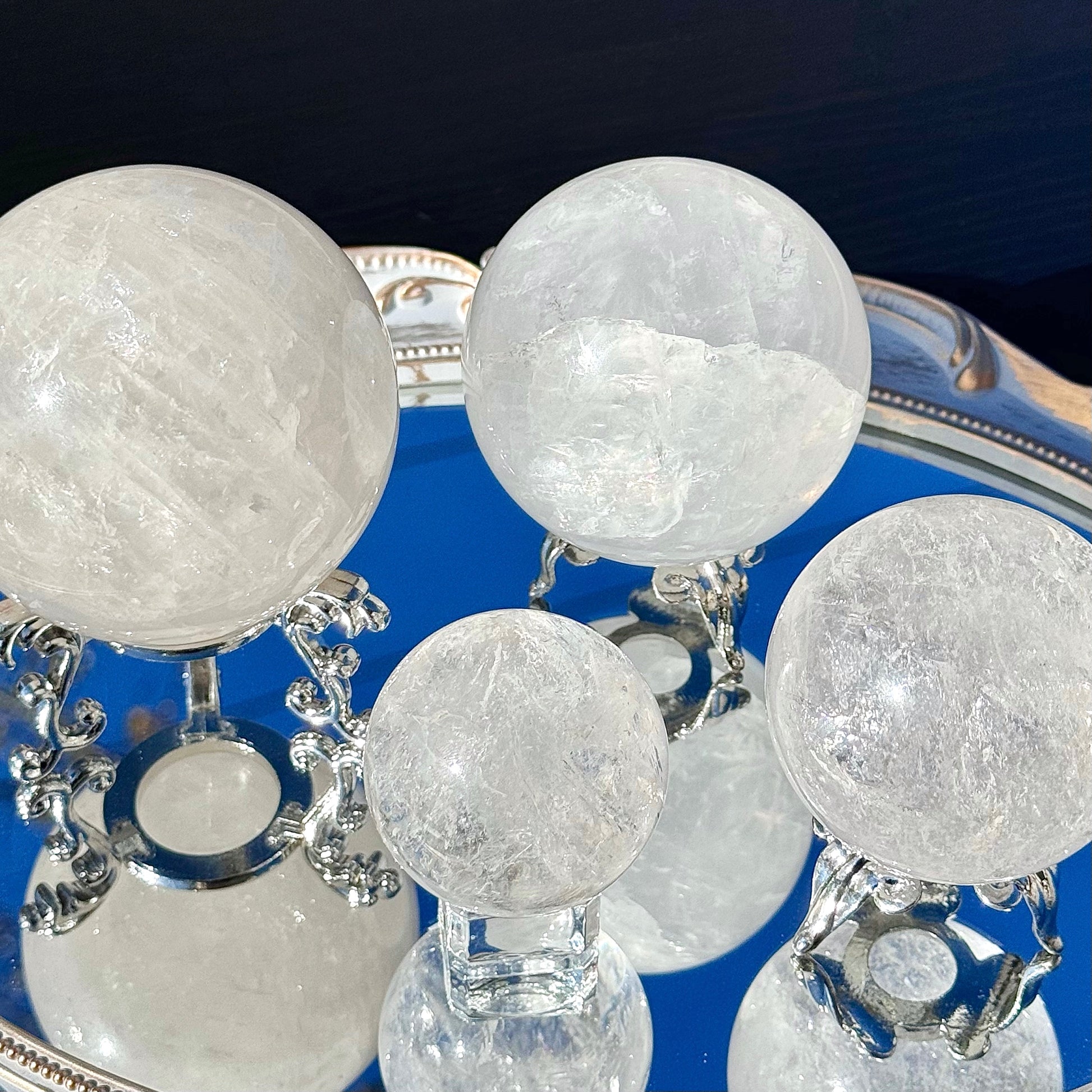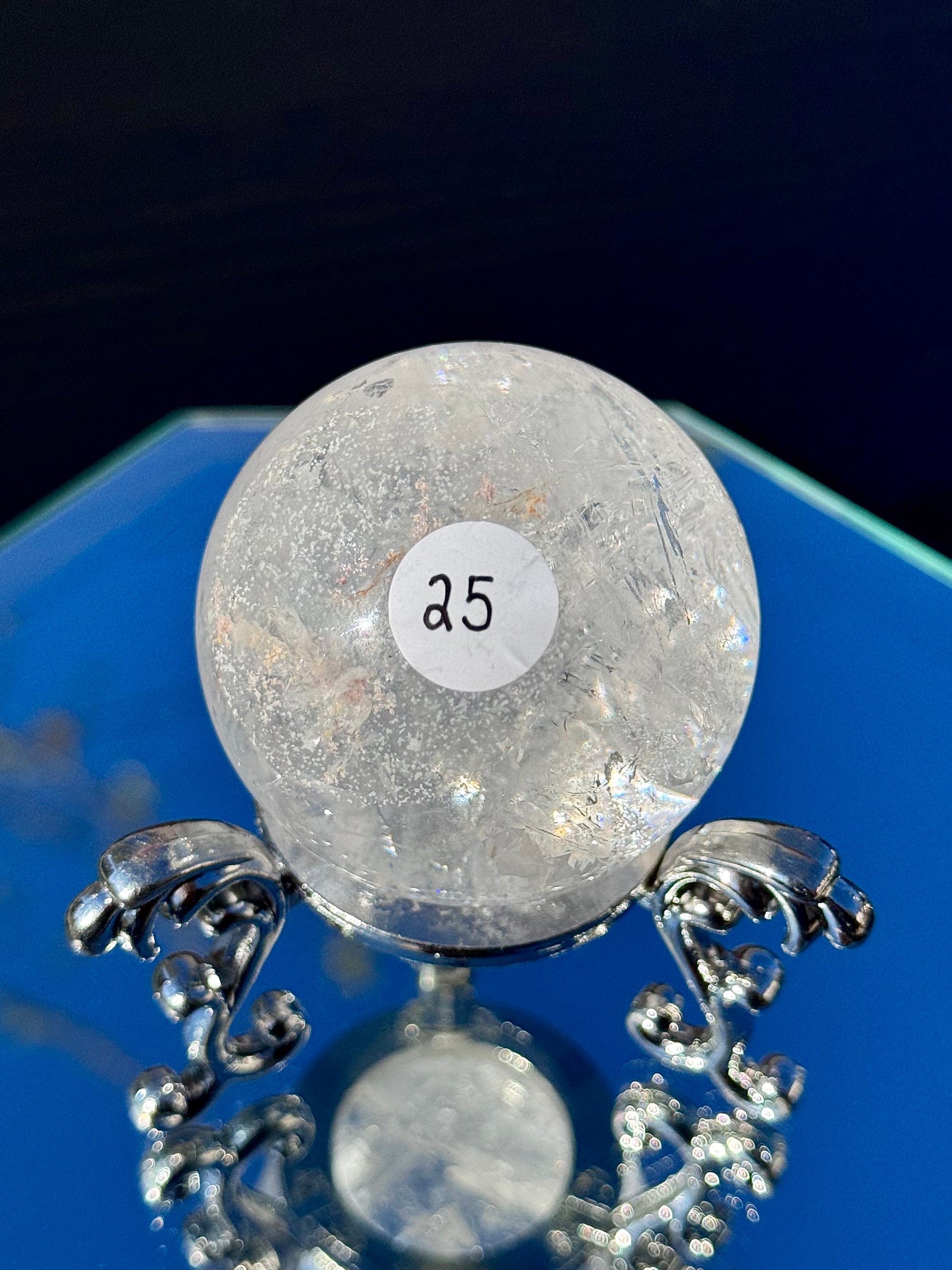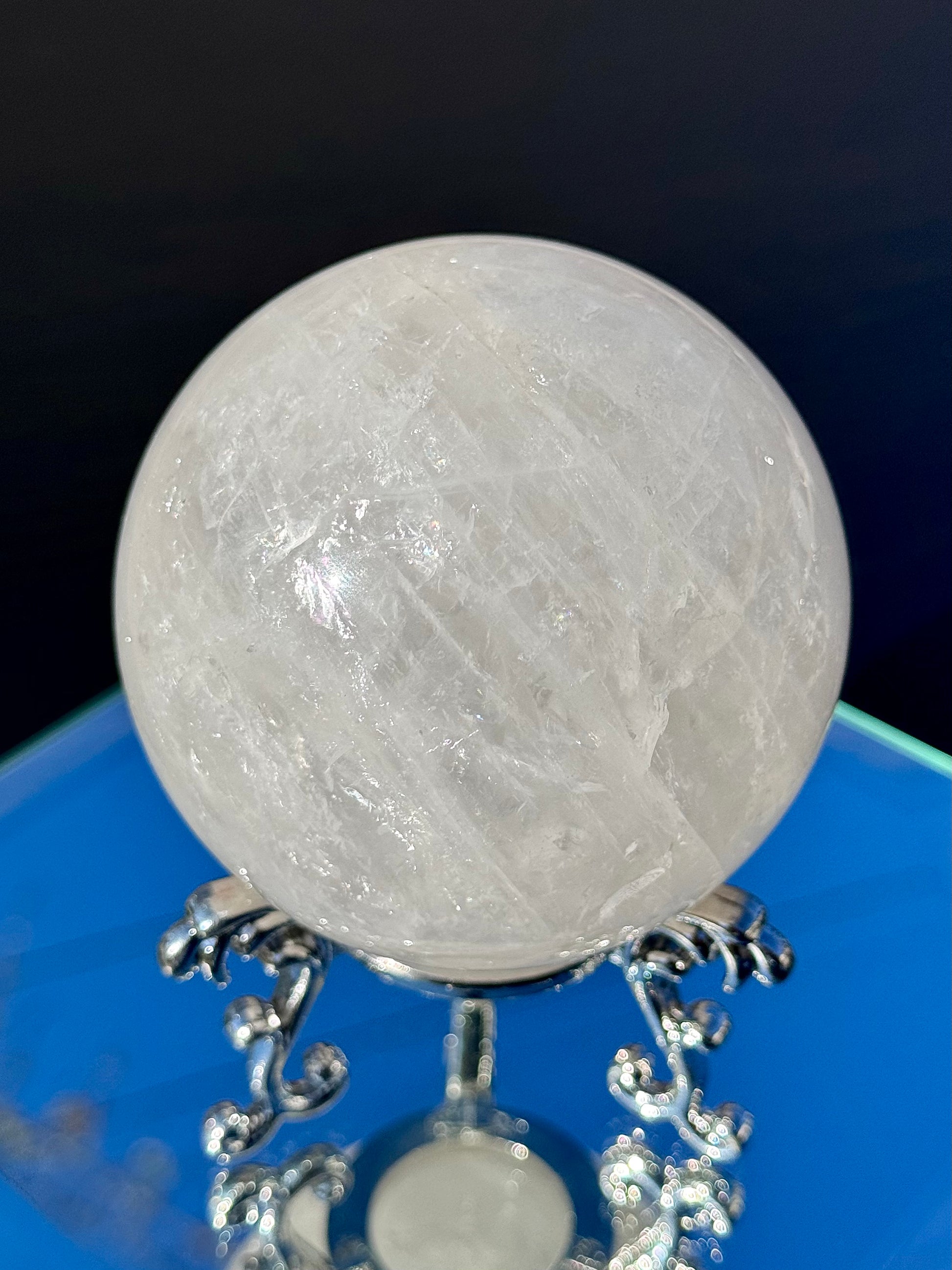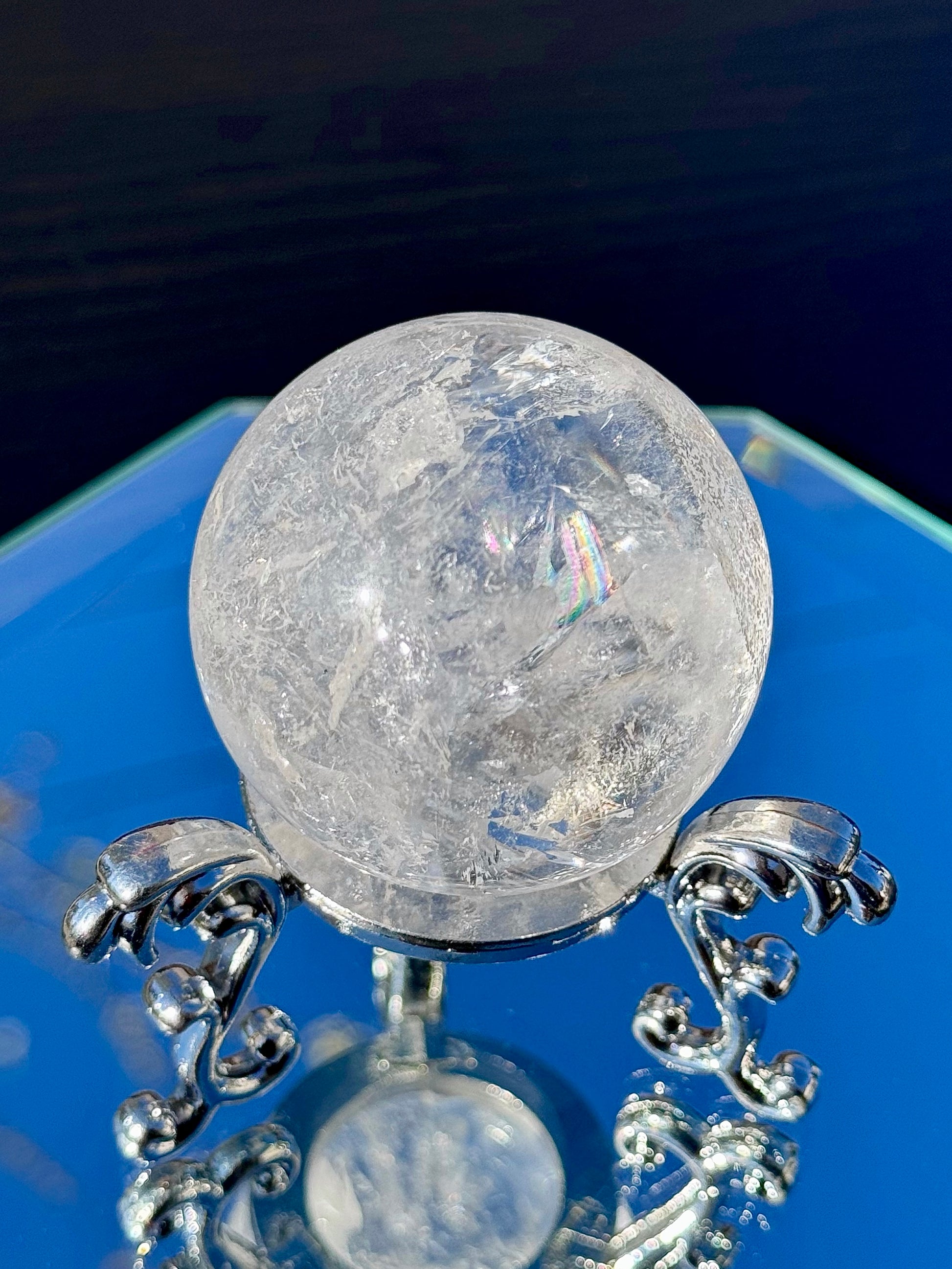 Our Clear Quartz Spheres come in sizes ranging from 48mm to 77mm in diameter and are full of shimmer and hidden rainbows.