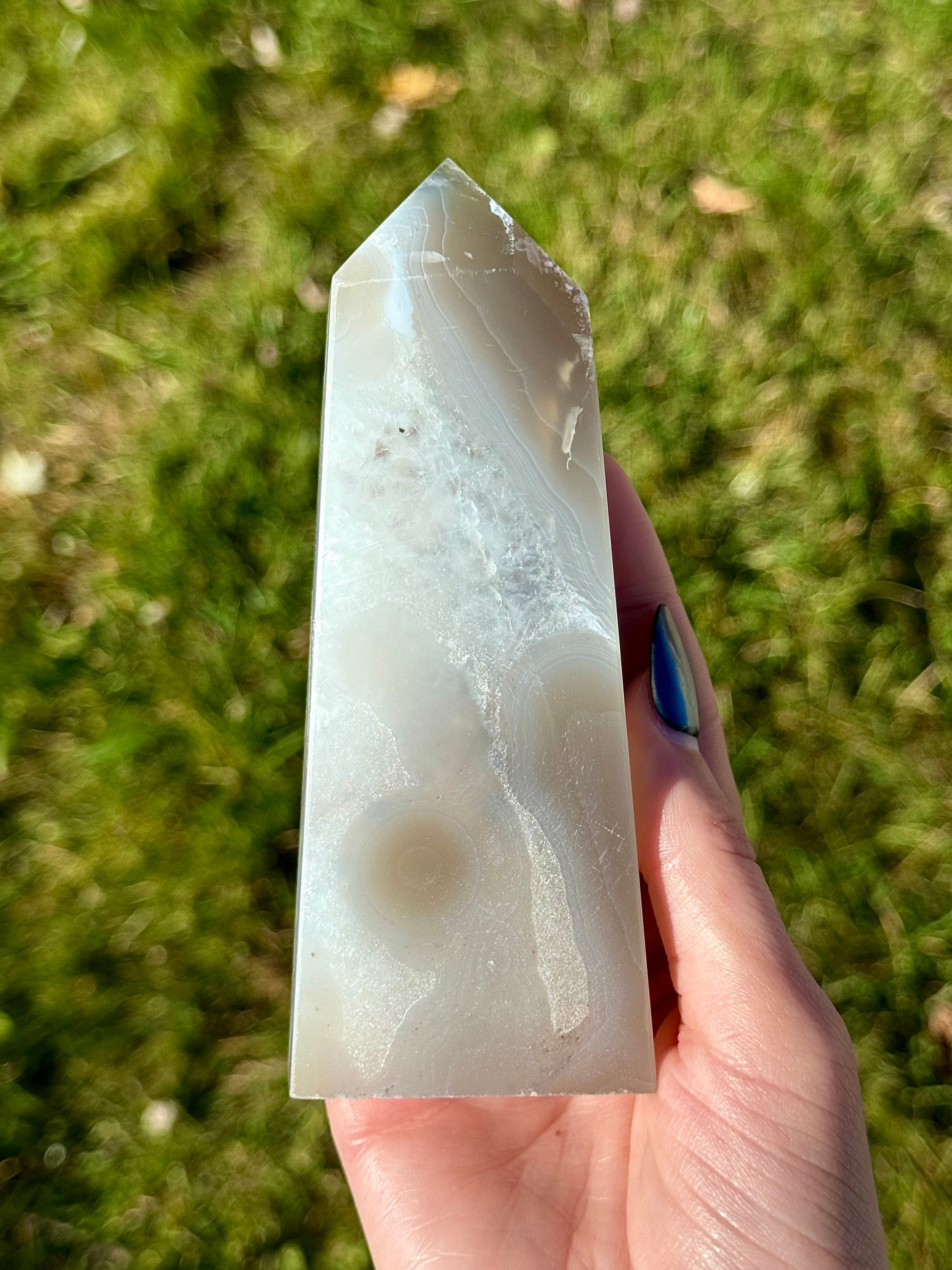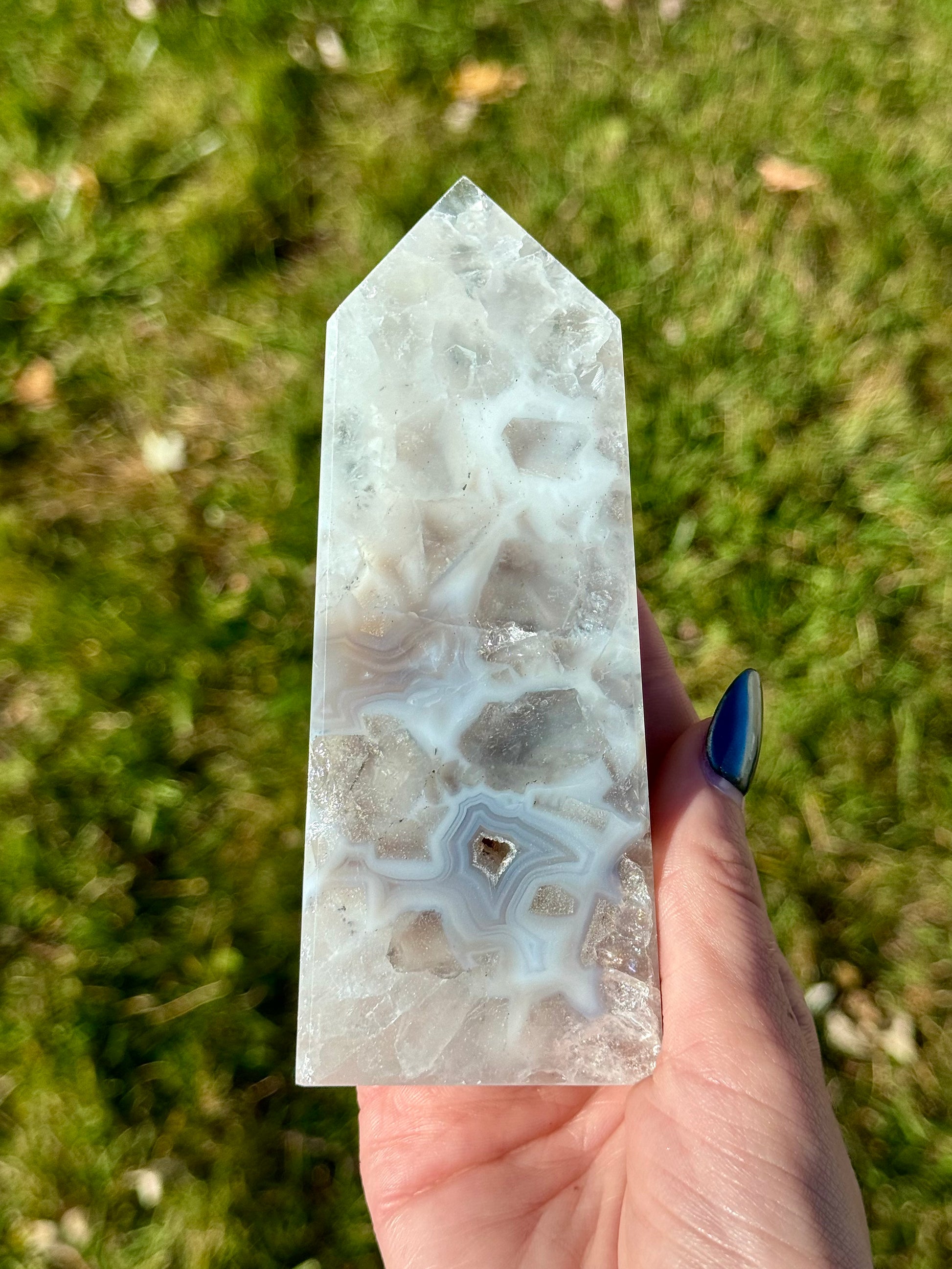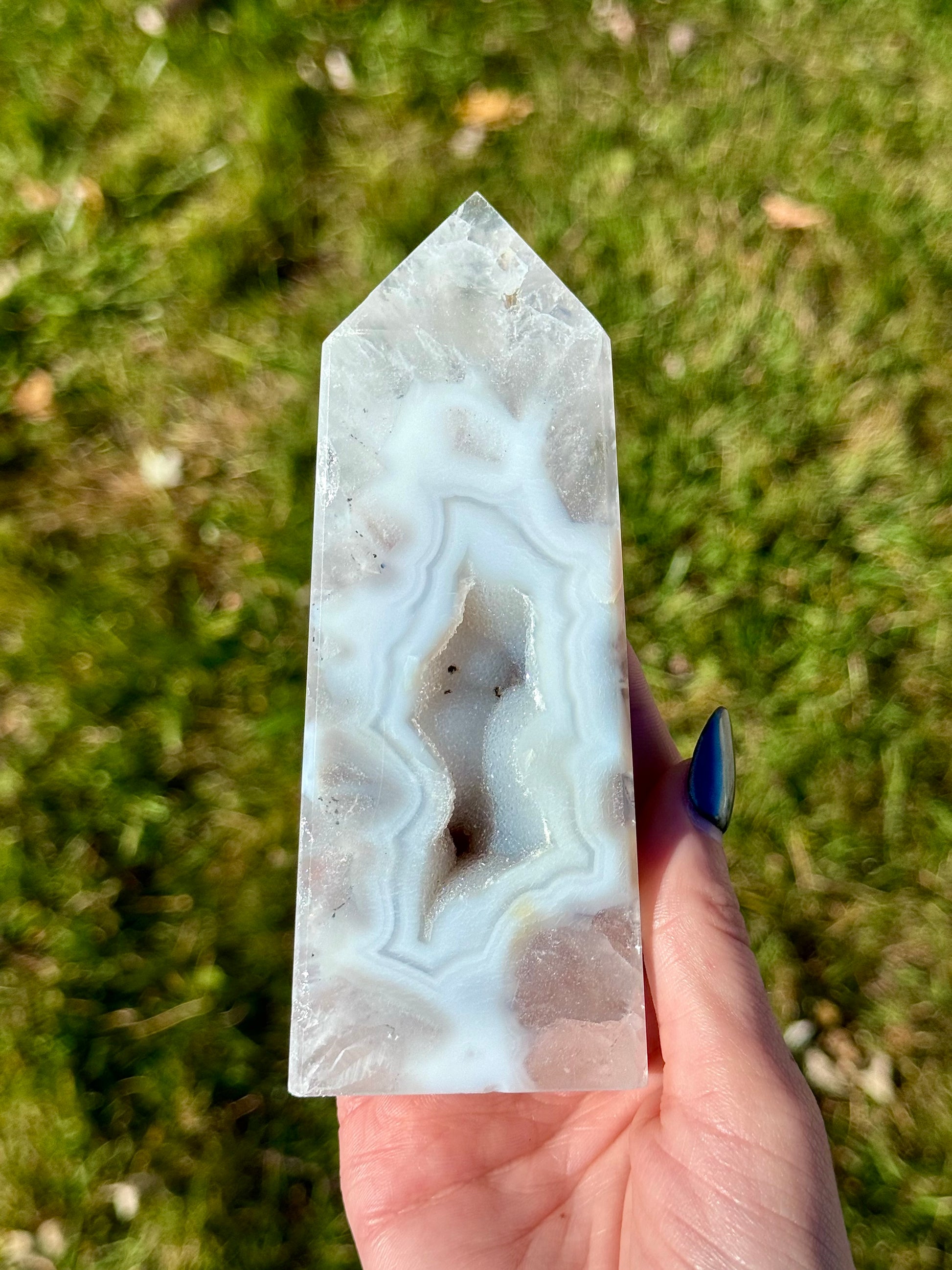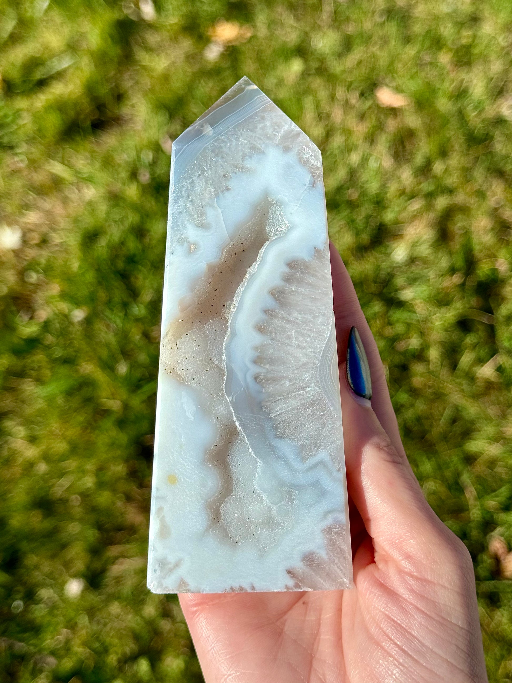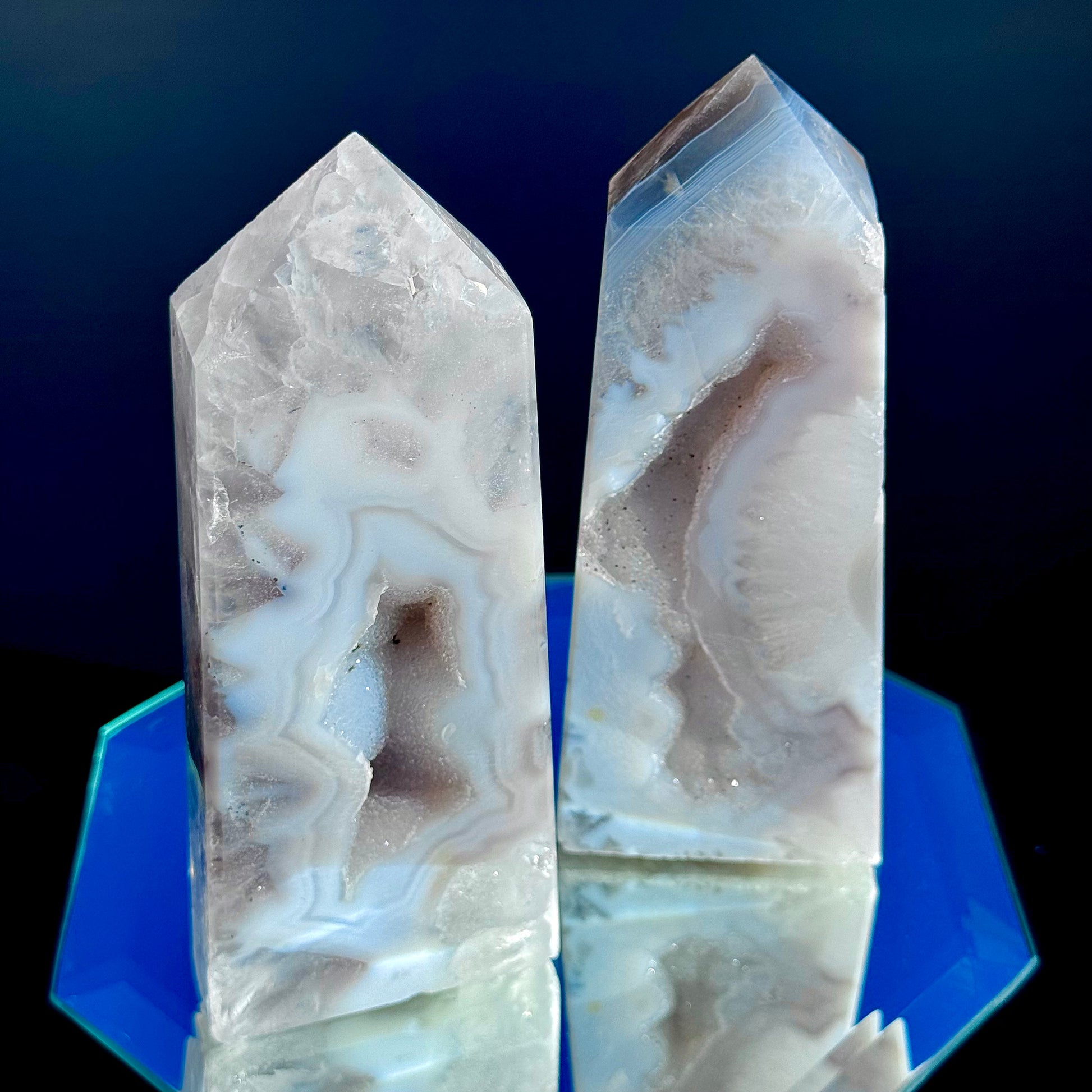 These Druzy Agate Towers are a must-have for any crystal enthusiast and will be sure to make your collection sparkle! These blue hued towers are carved at about 5" tall.