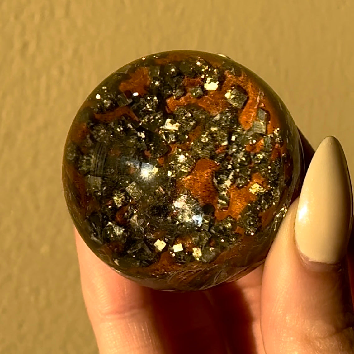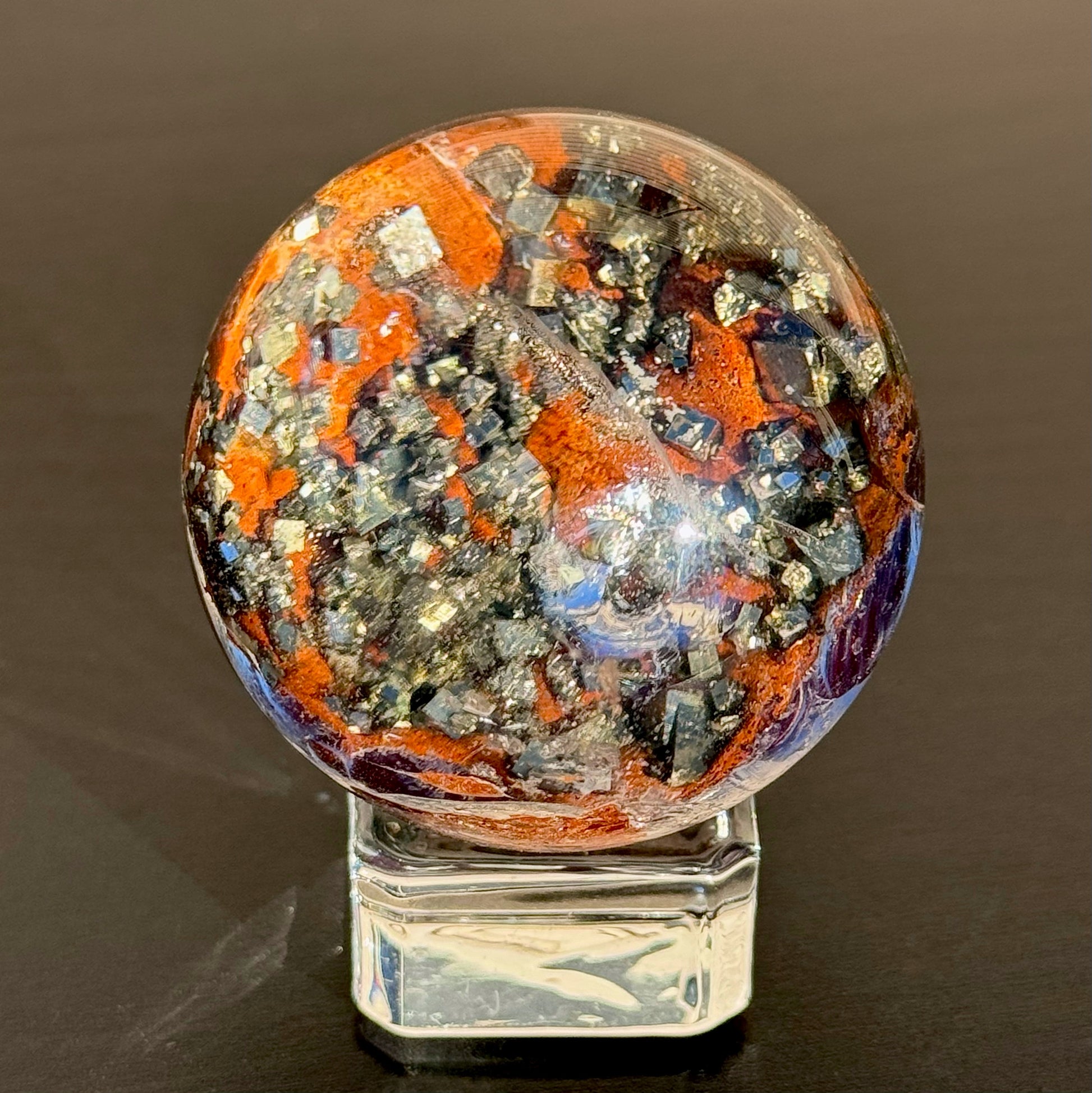 This Garden Quartz with Pyrite Sphere is 44mm in diameter and contains lots of sparkly pyrite chunks.