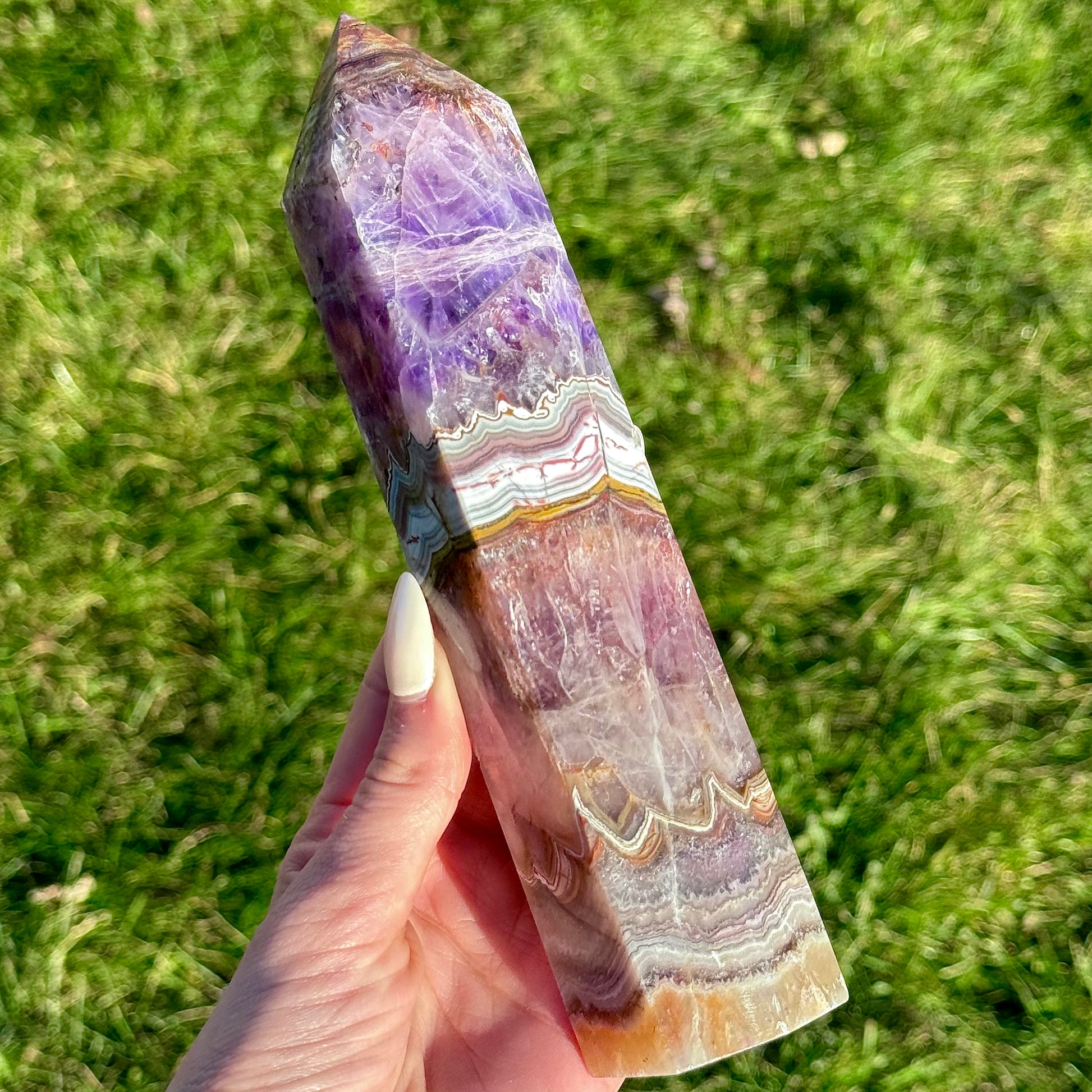Add a touch of color to your home with this jumbo 7 1/2" tall Large Amethyst Mexican Agate Tower. This stunning statement piece has amethyst with rainbows and perfect Mexican agate banding.