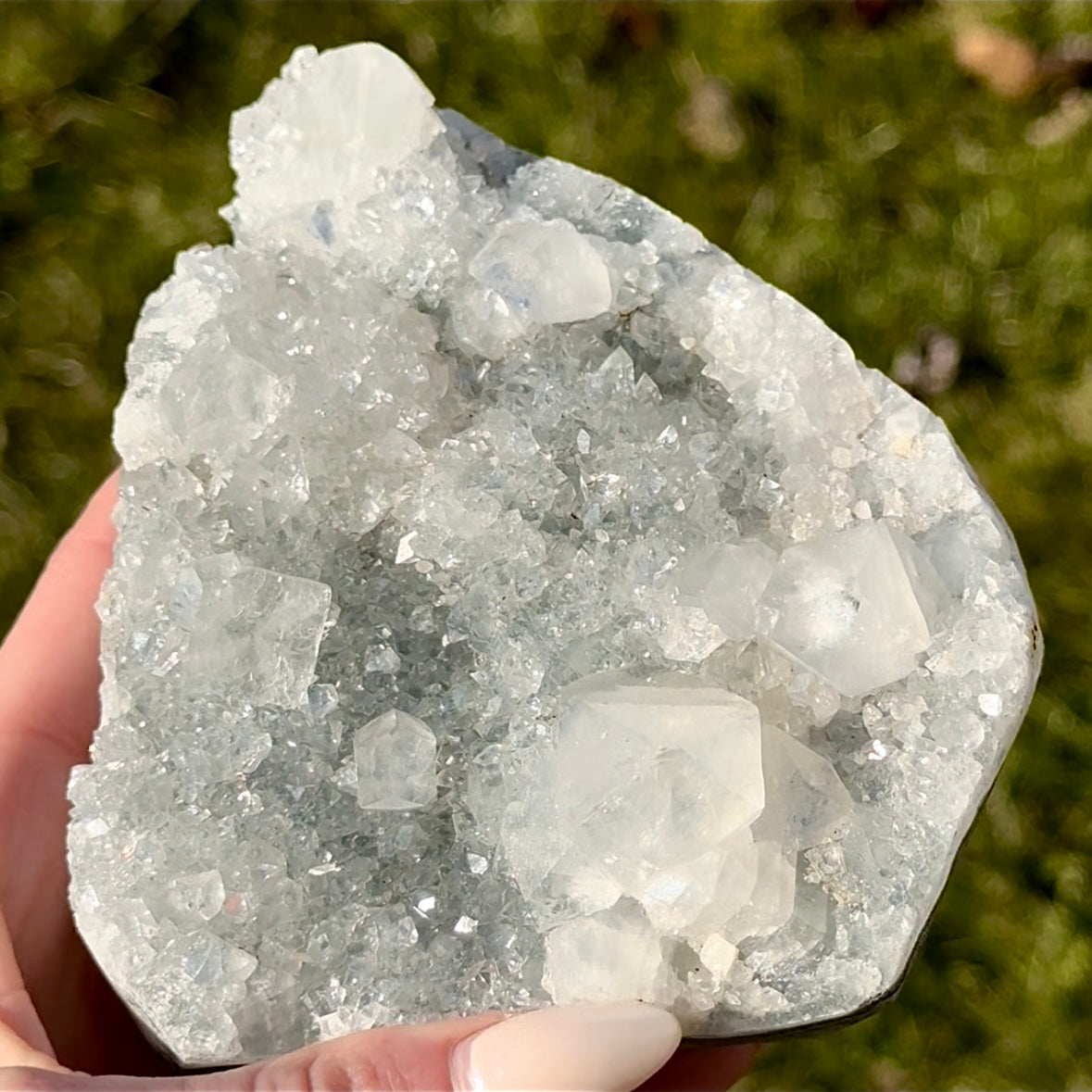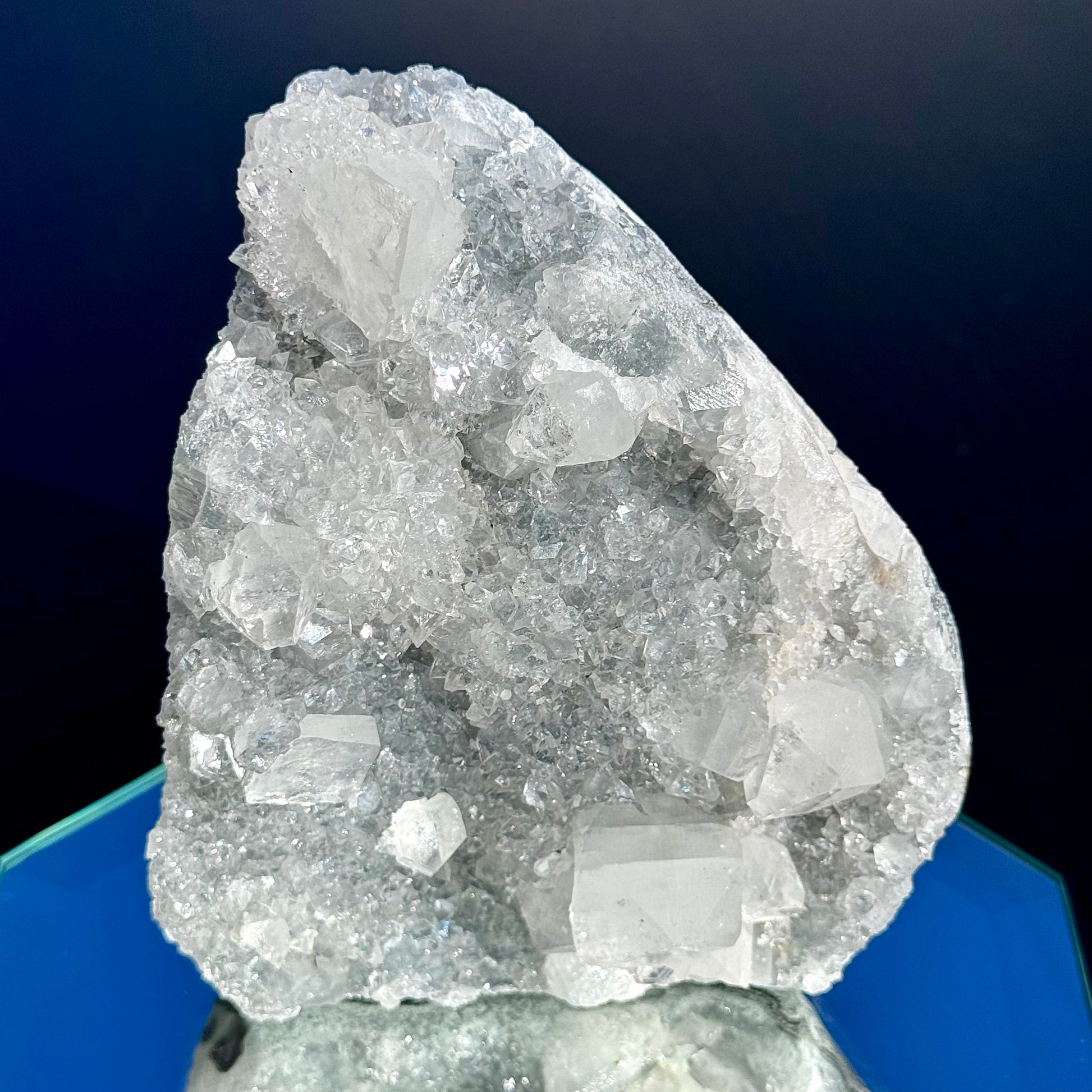 Look no further for the perfect centerpiece. This Large Diamond Apophyllite Cut-Base is so elegant and sparkly! This piece is 4 3/4" tall and weighs almost 2 lb. It features apophyllite diamond chunks...and if you look carefully, you will find rainbows in the diamond chunks!