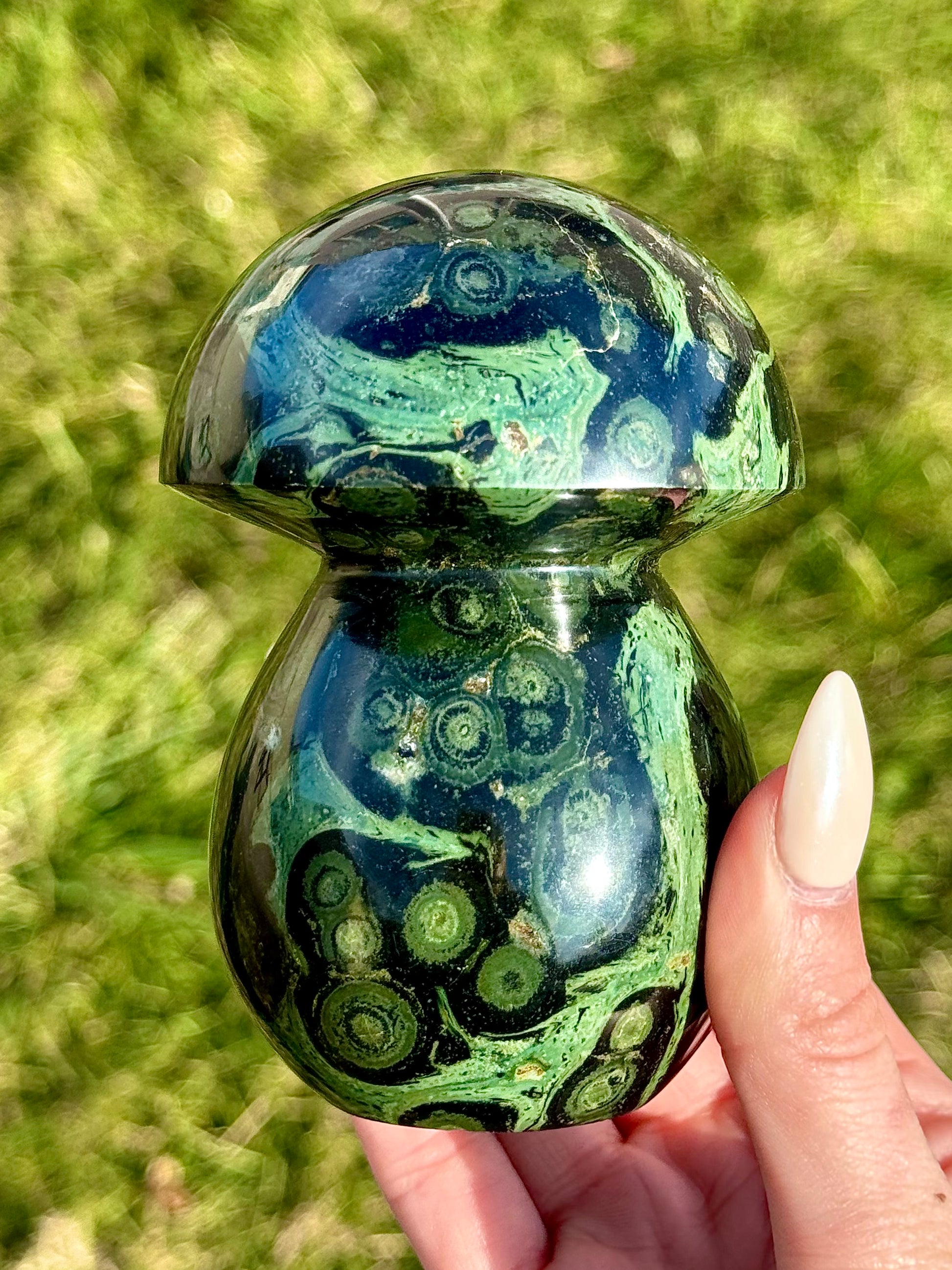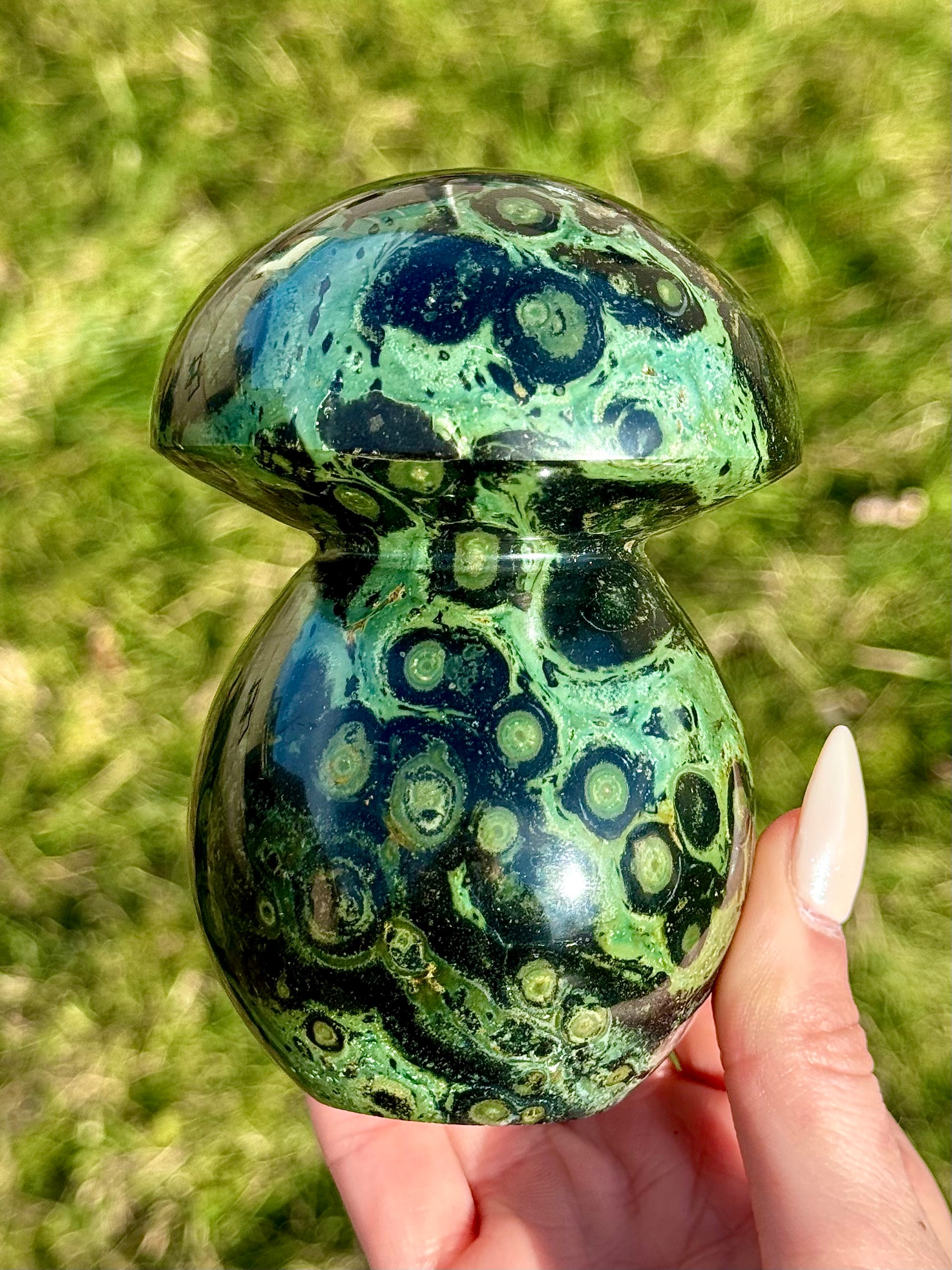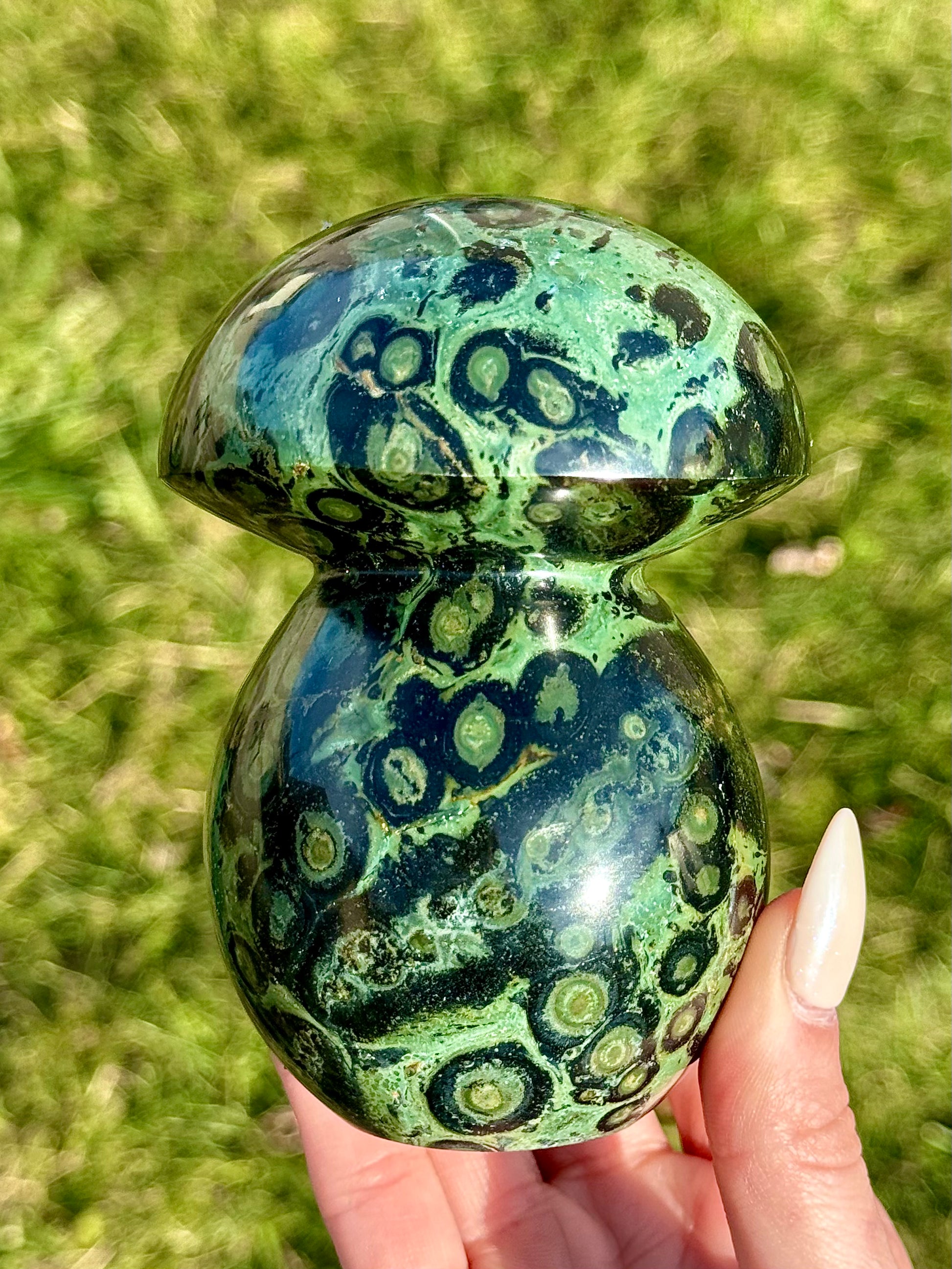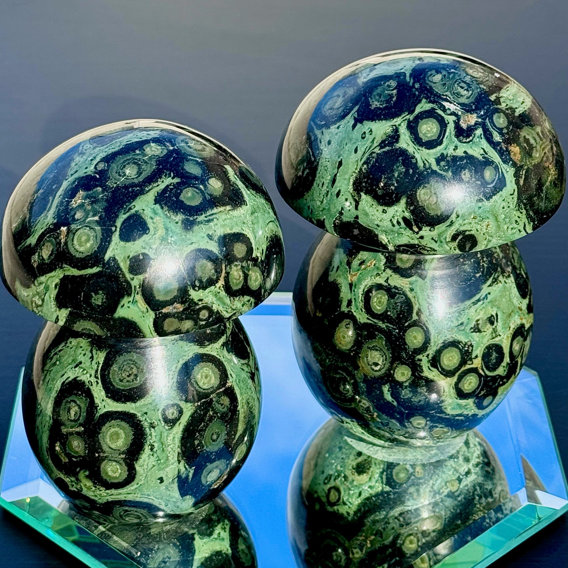 These Large Kambaba Jasper Mushrooms are not only massive, but also carved to perfection! Both mushrooms stand at about 4" tall and weigh around 1 1/2 lb, showcasing unique and stunning patterns. Great for mushroom lovers!