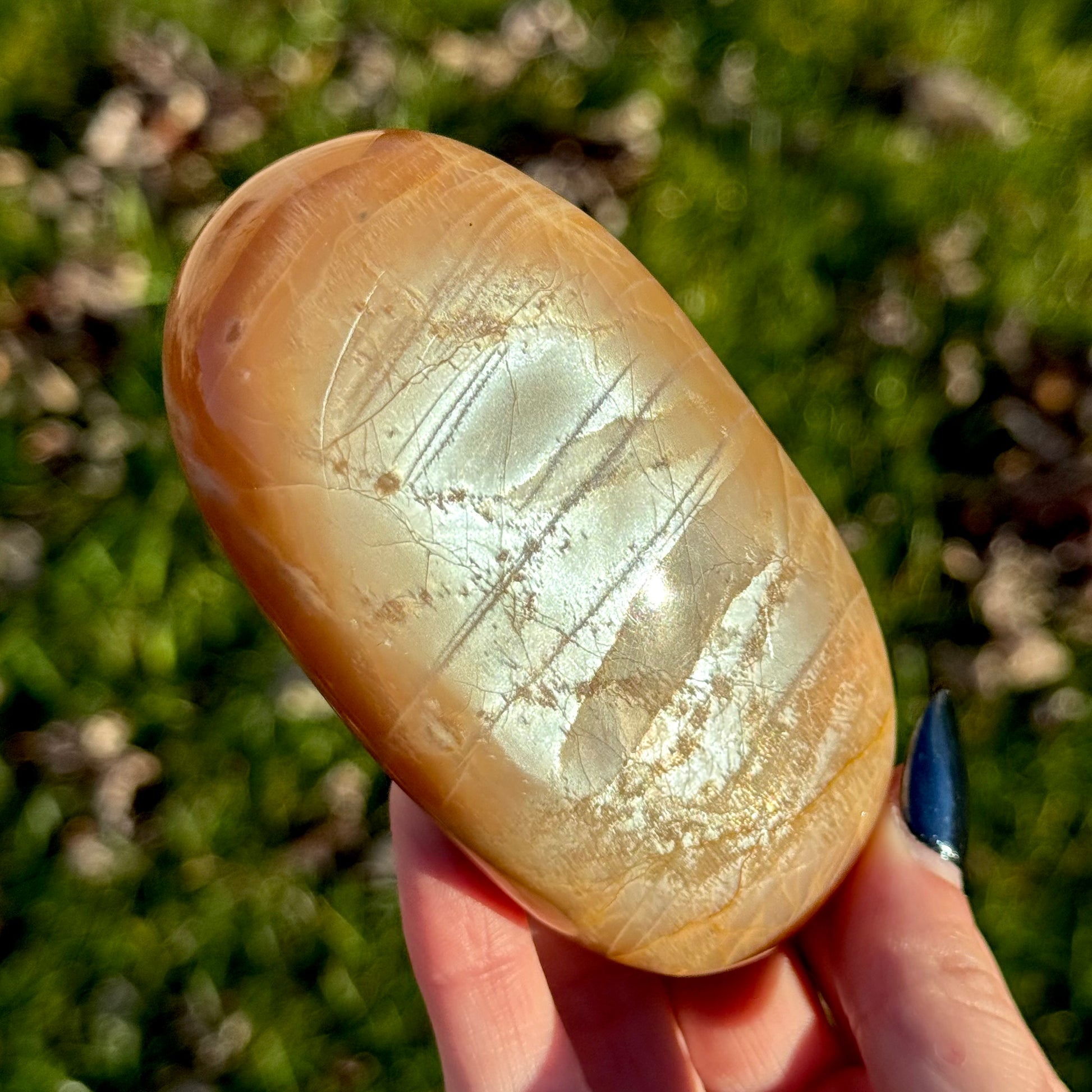A dreamy piece of delight, this Large Peach Moonstone Palm Stone is a perfect pick-me-up. It has a stunning flash that is sure to draw the eye.