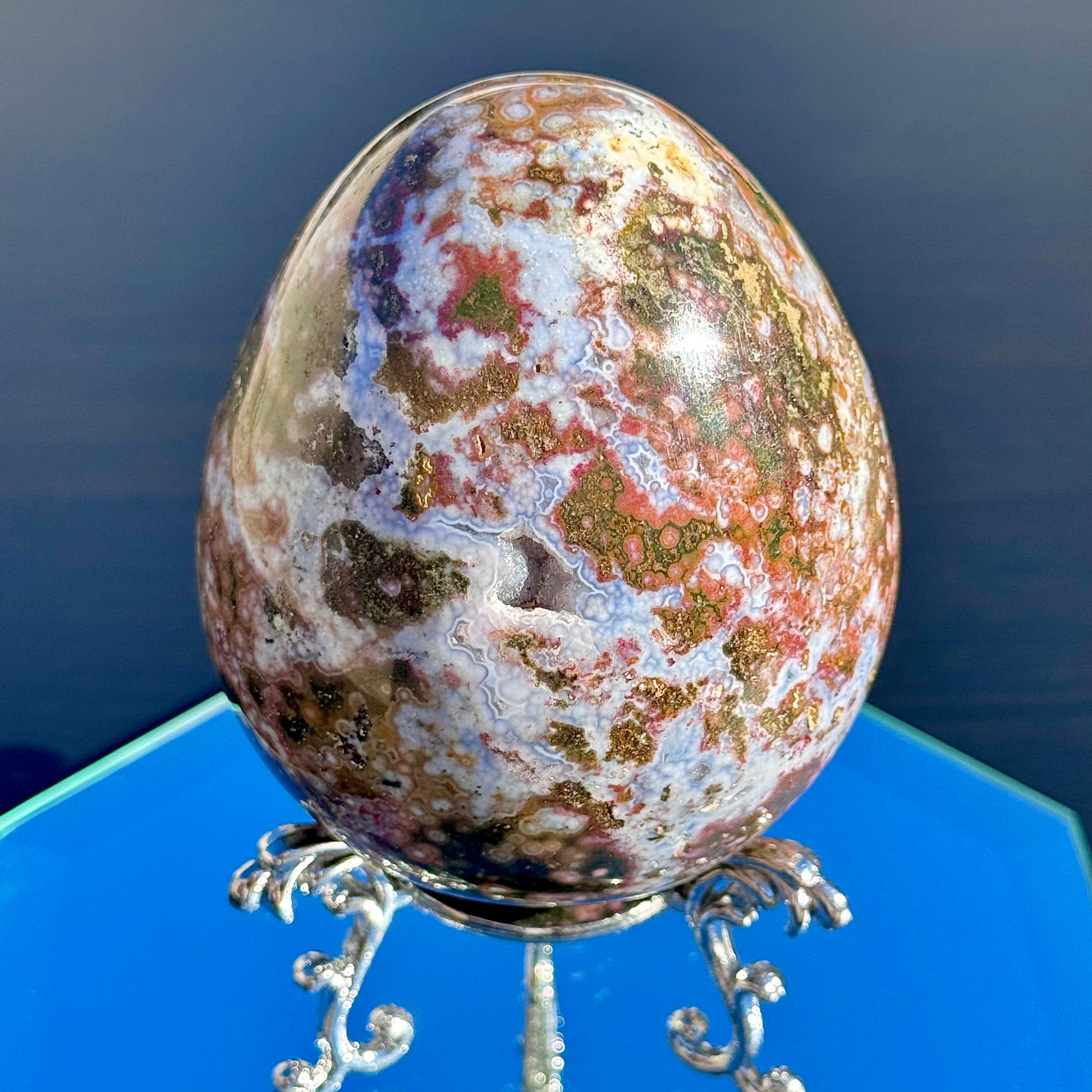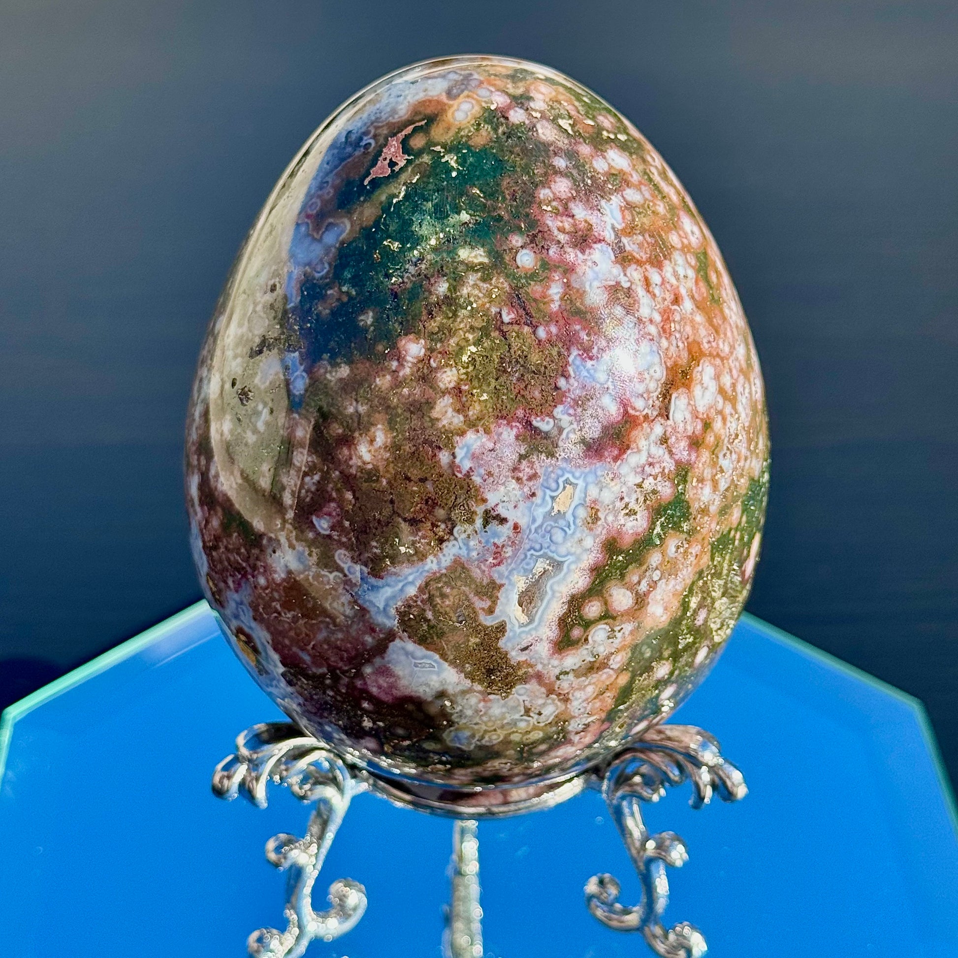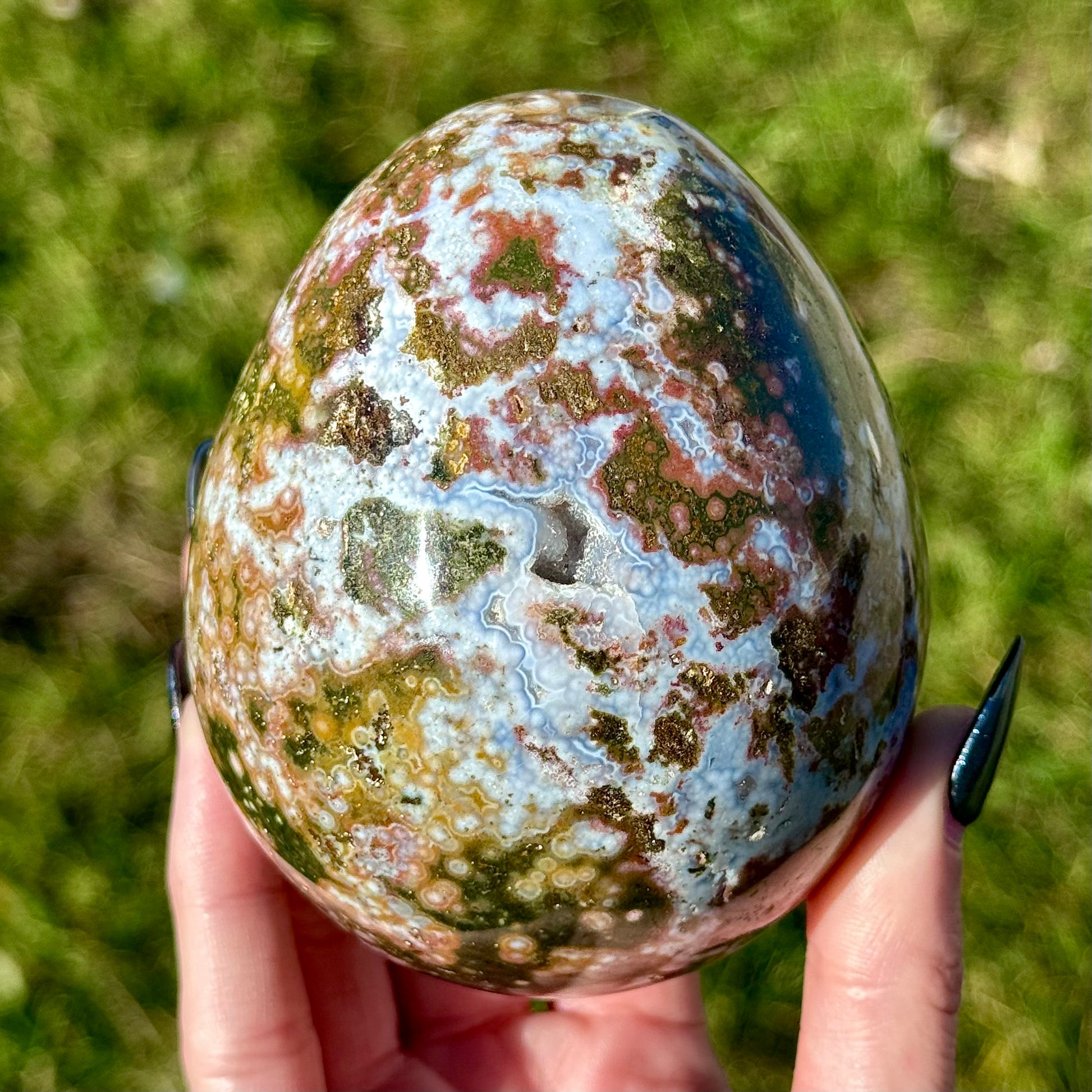 This Large Sea Jasper Egg features beautiful orby patterns, multi-colored hues, and mini druzy pockets. It is just below 4" tall and weighs over 1 1/2 lb.