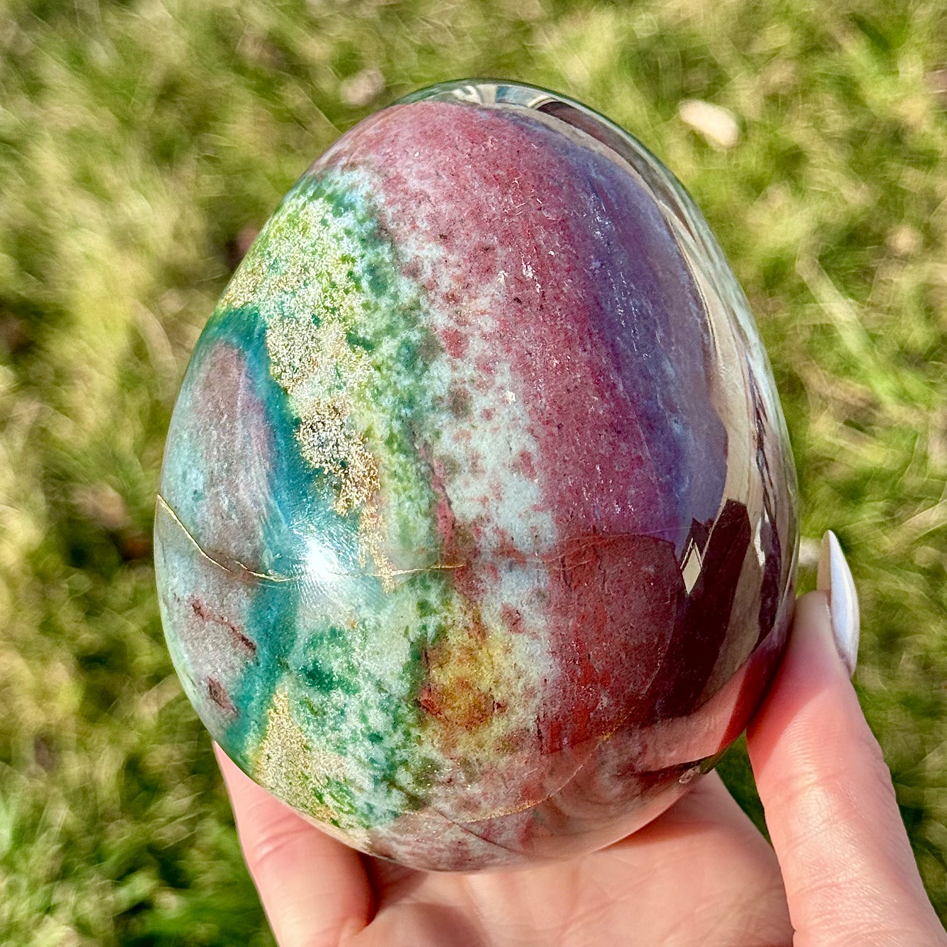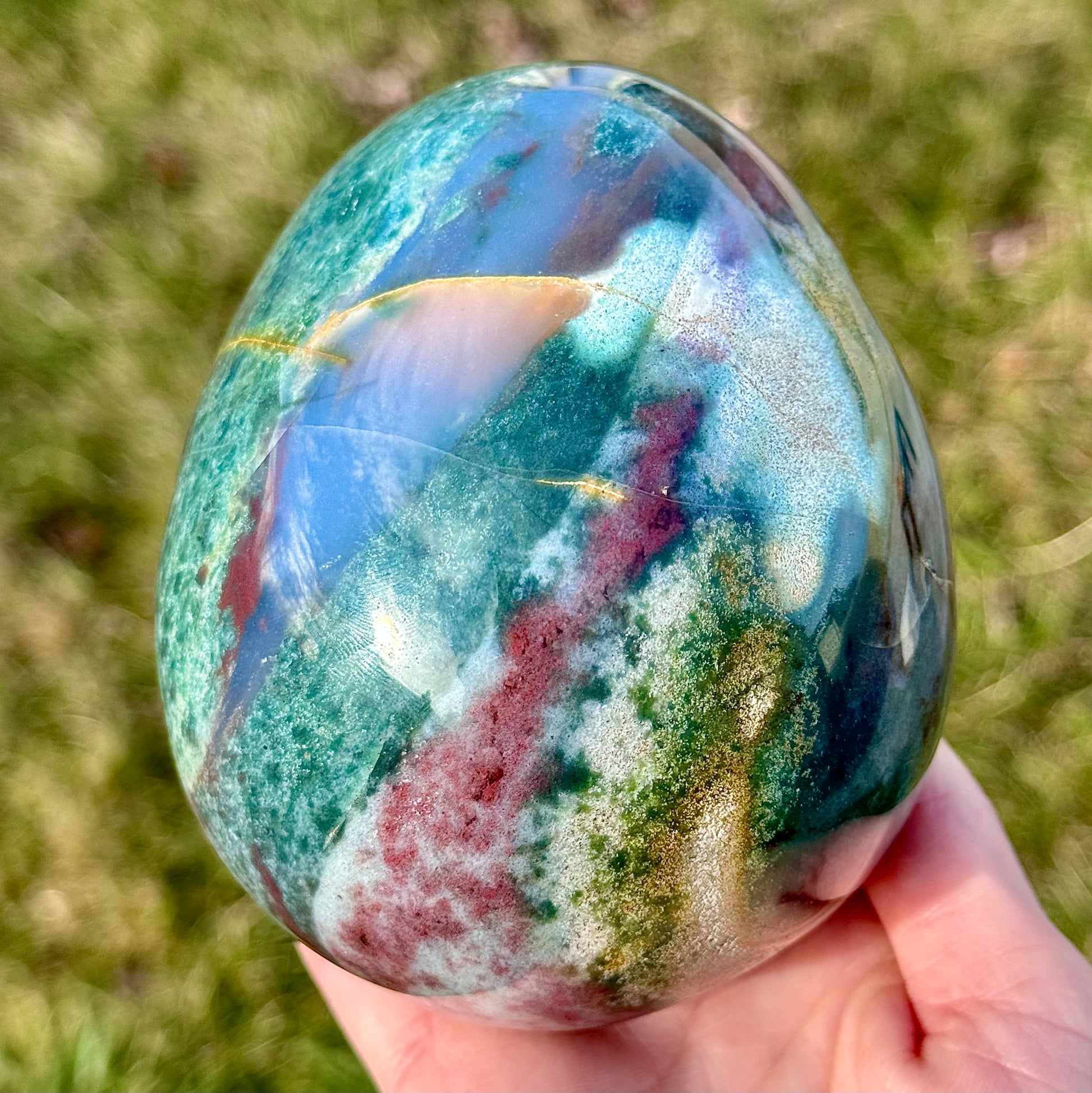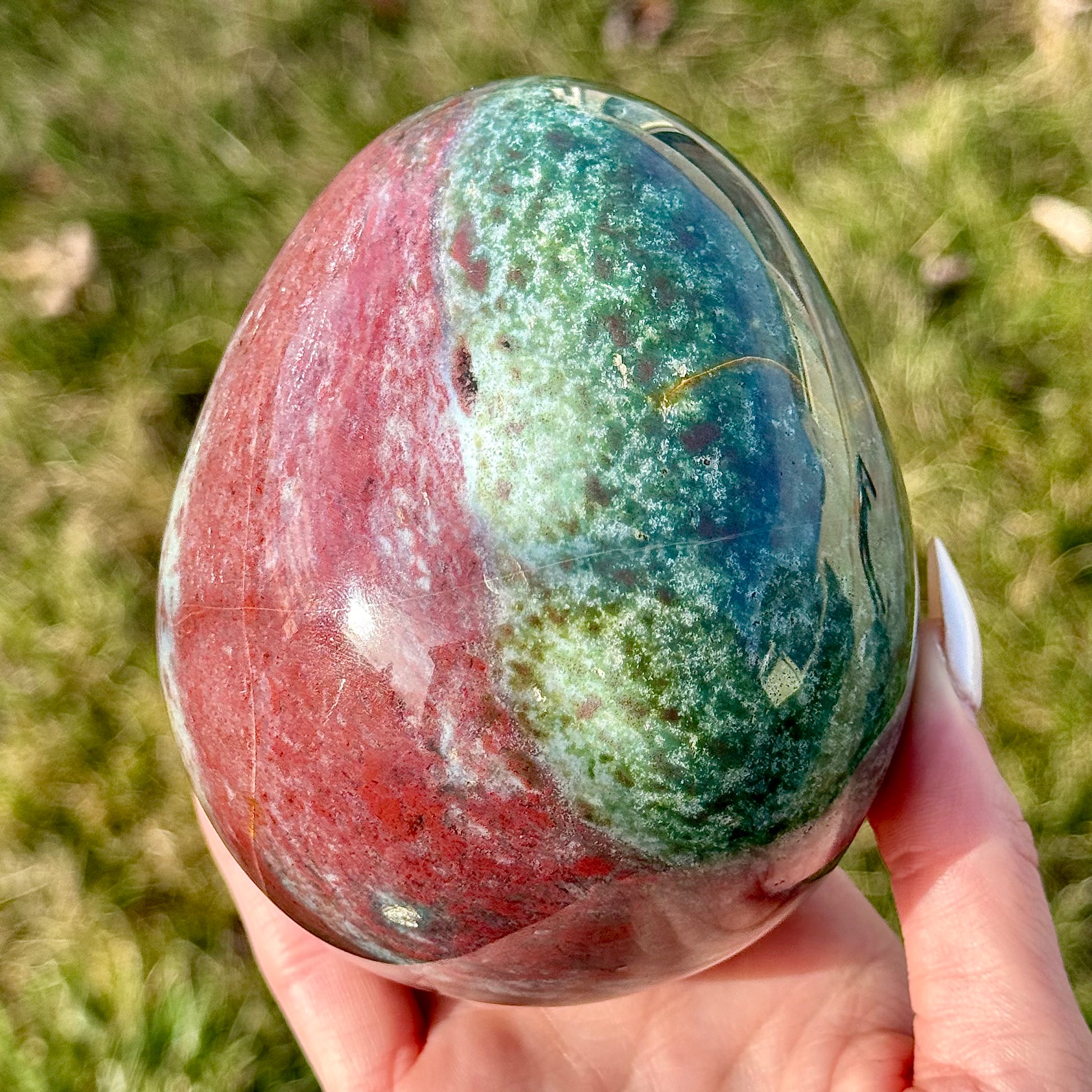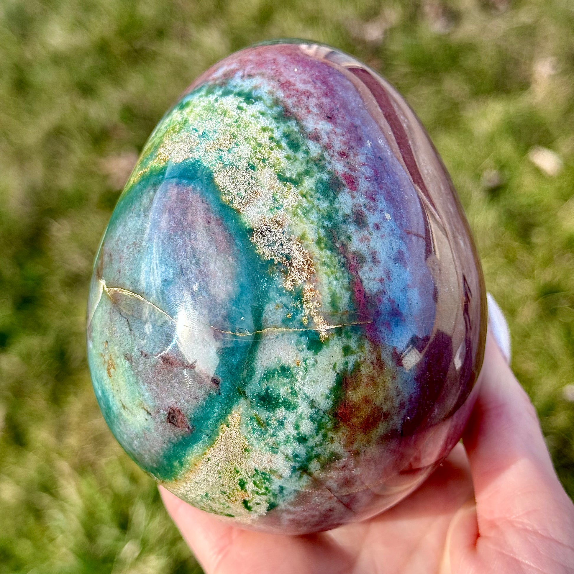 Introducing our Large Sea Jasper Egg, the perfect pick for sea jasper lovers. This statement egg boasts a diameter of 108mm and weighs 2 1/2 lb, making it a huge and impressive piece. Elevate your collection with this stunning egg.