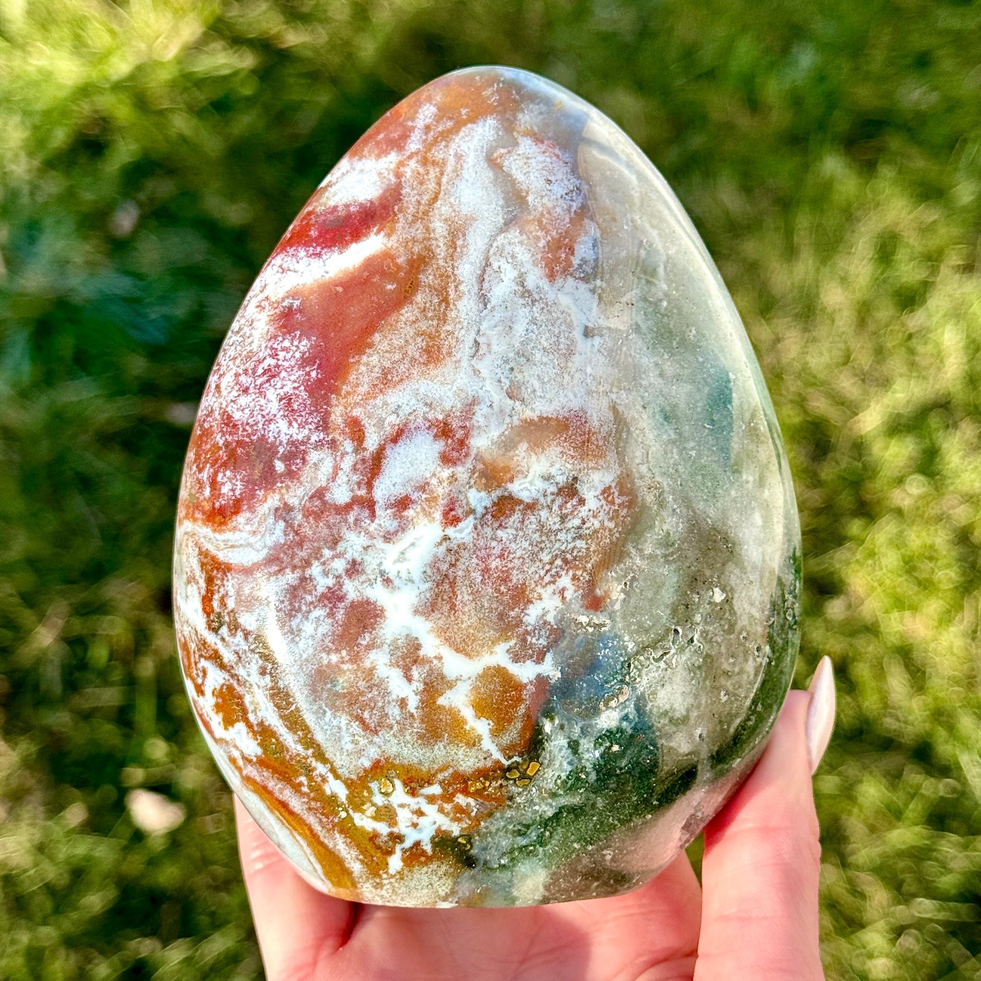 This 4 3/4" tall Large Sea Jasper Freeform boasts an adorable shape, showcasing stunning colors that are sure to catch the eye. This piece is just under 2 lb and stands perfectly!