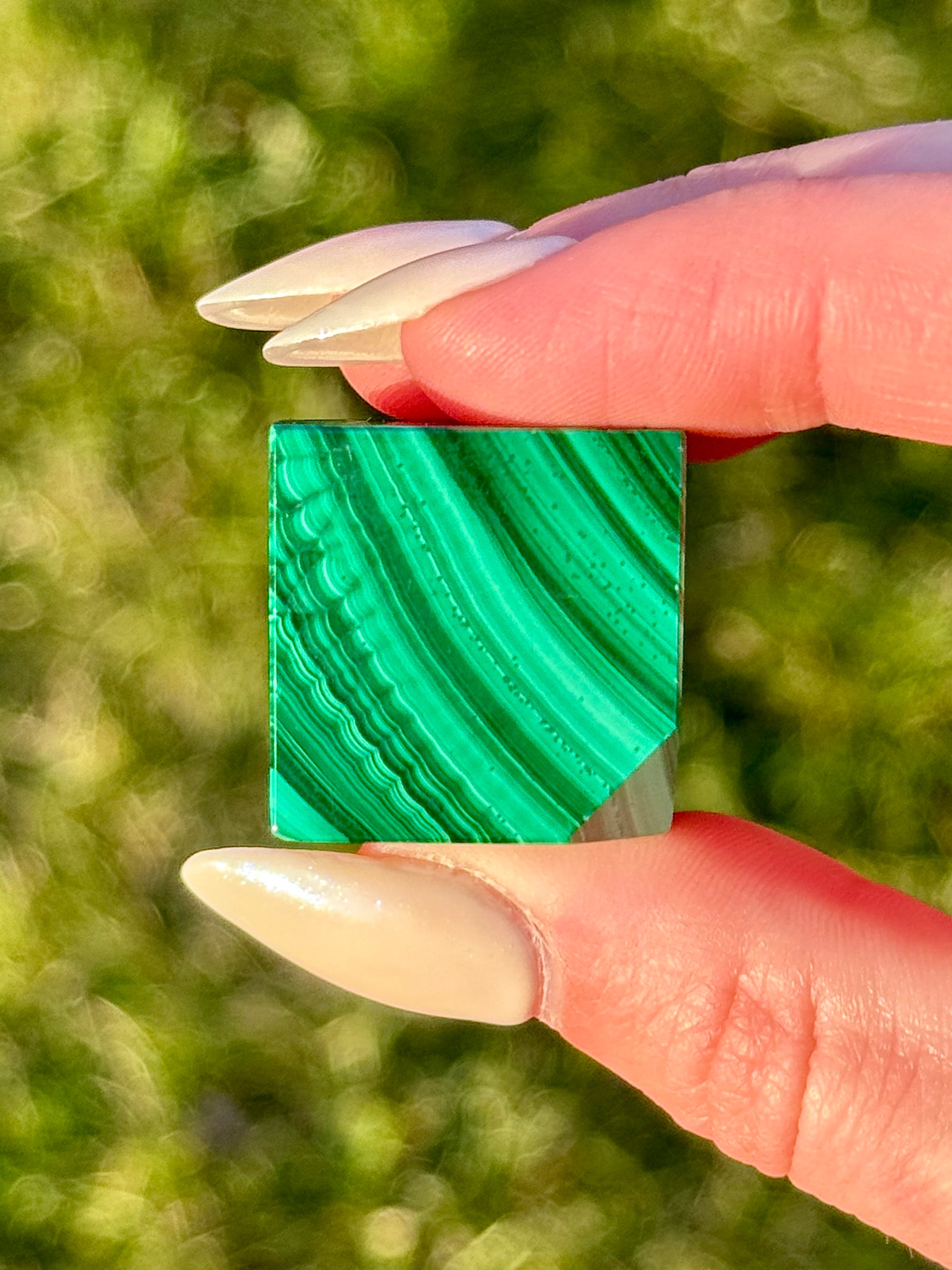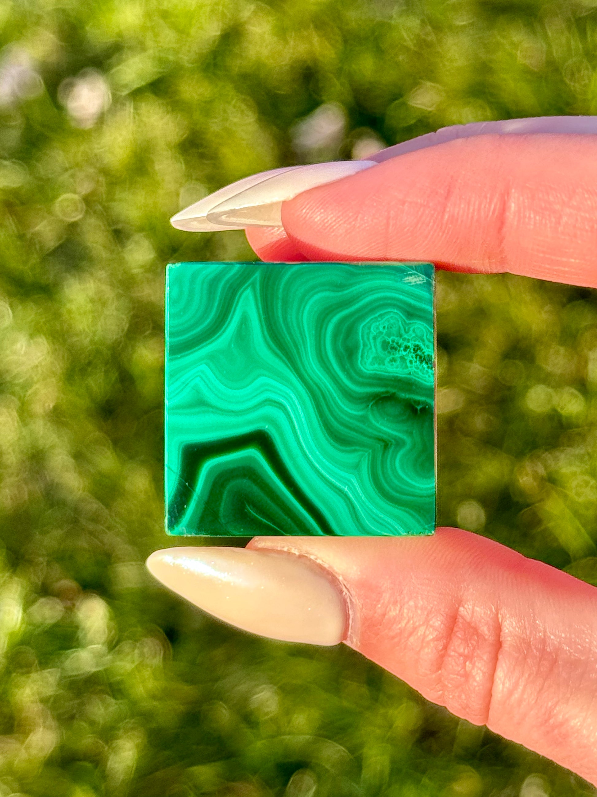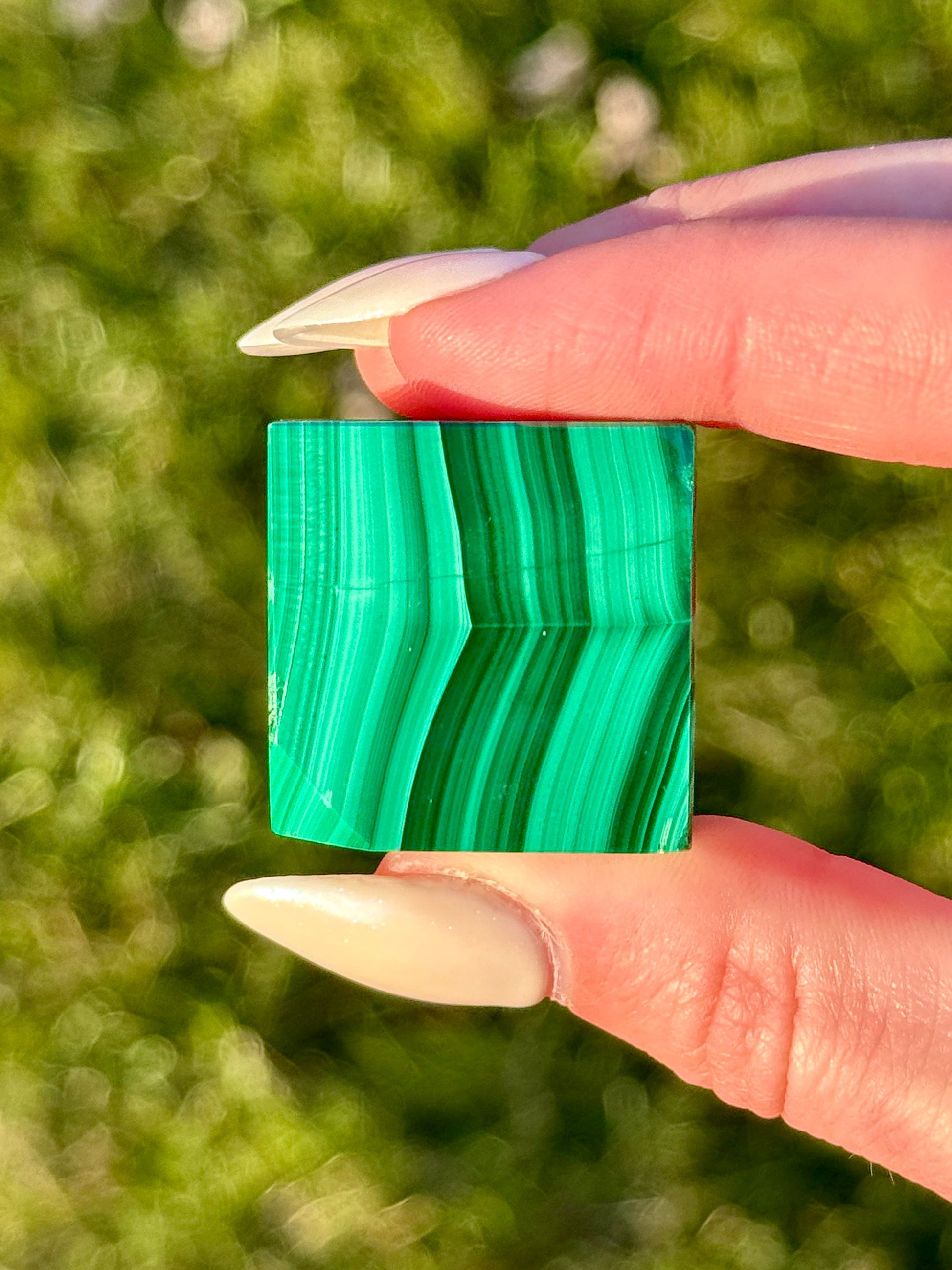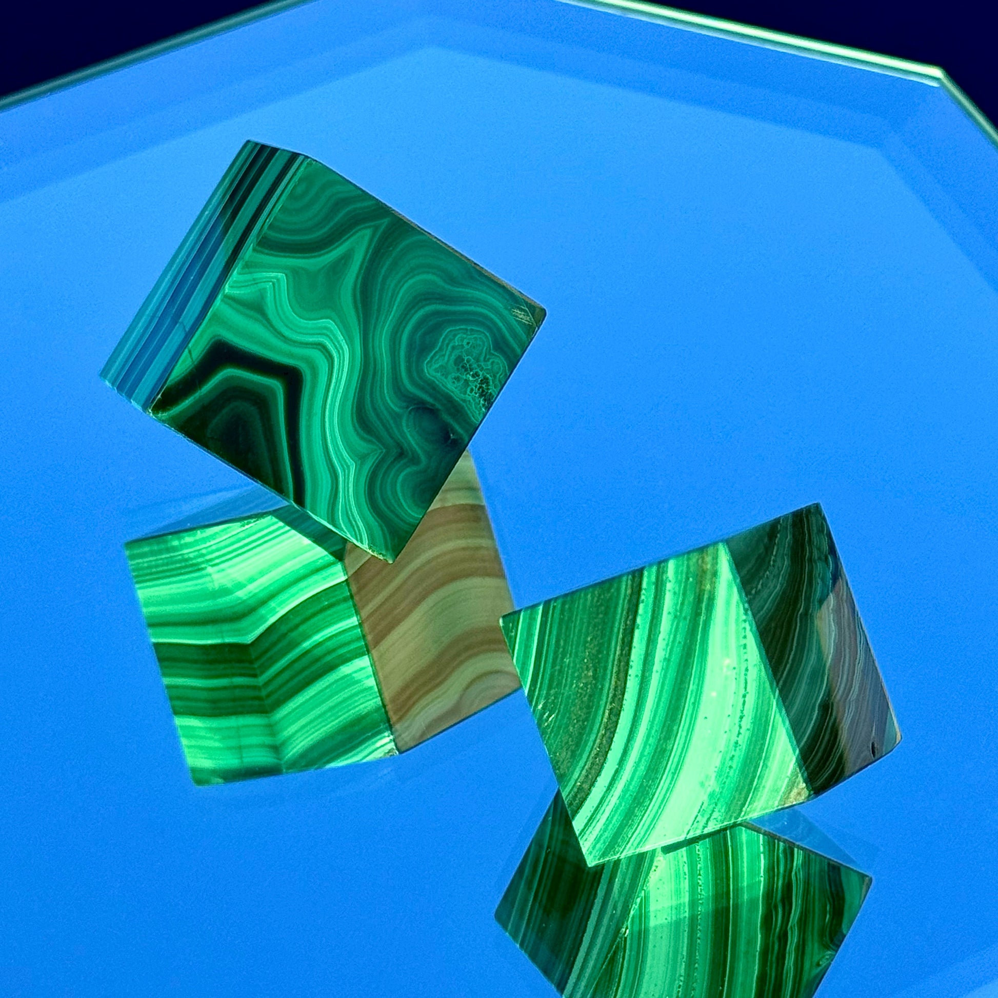 Add a unique touch to your collection with our Malachite Cubes. These small cubes showcase amazing patterns. The smaller cube measures 3/4" on each side and the larger cube 1".