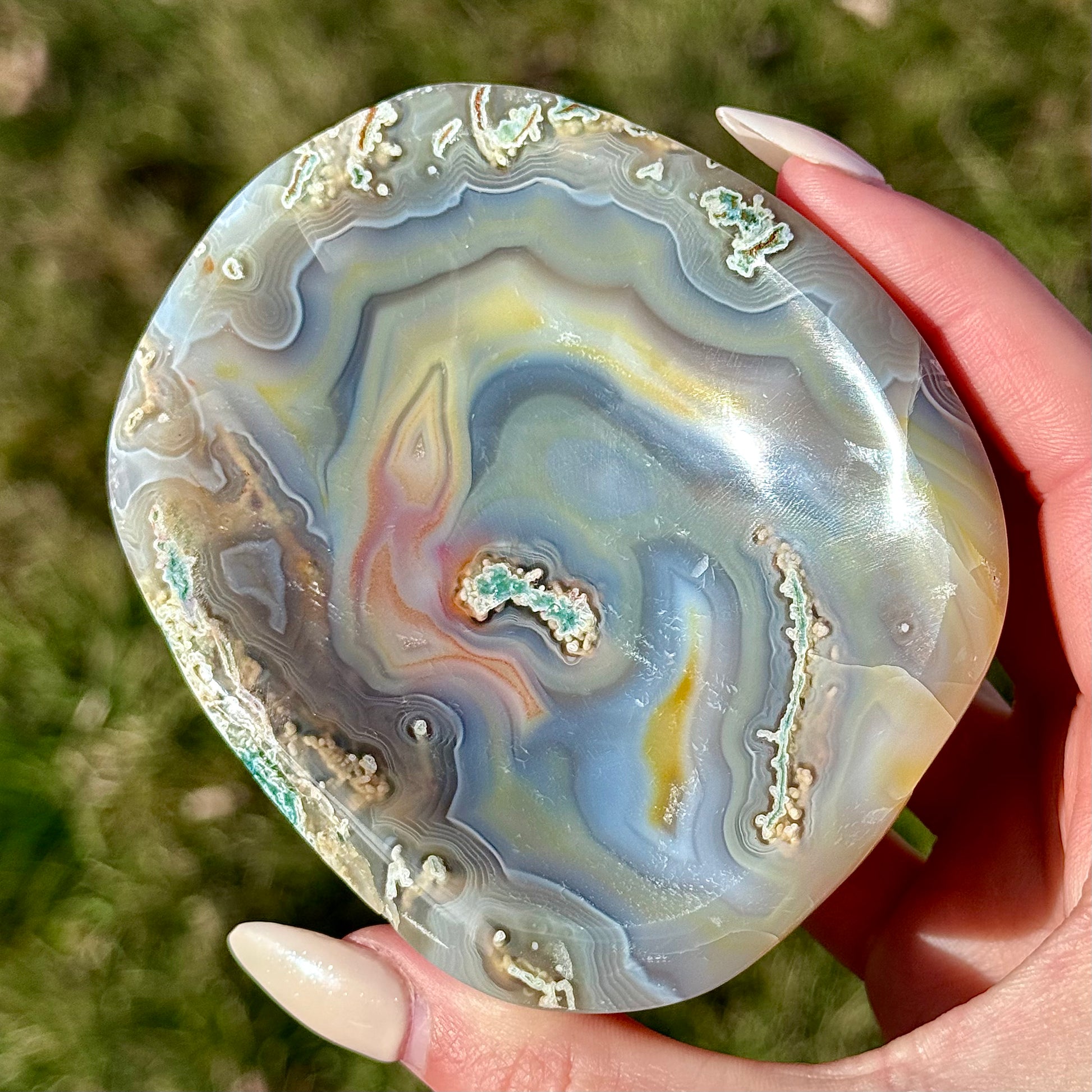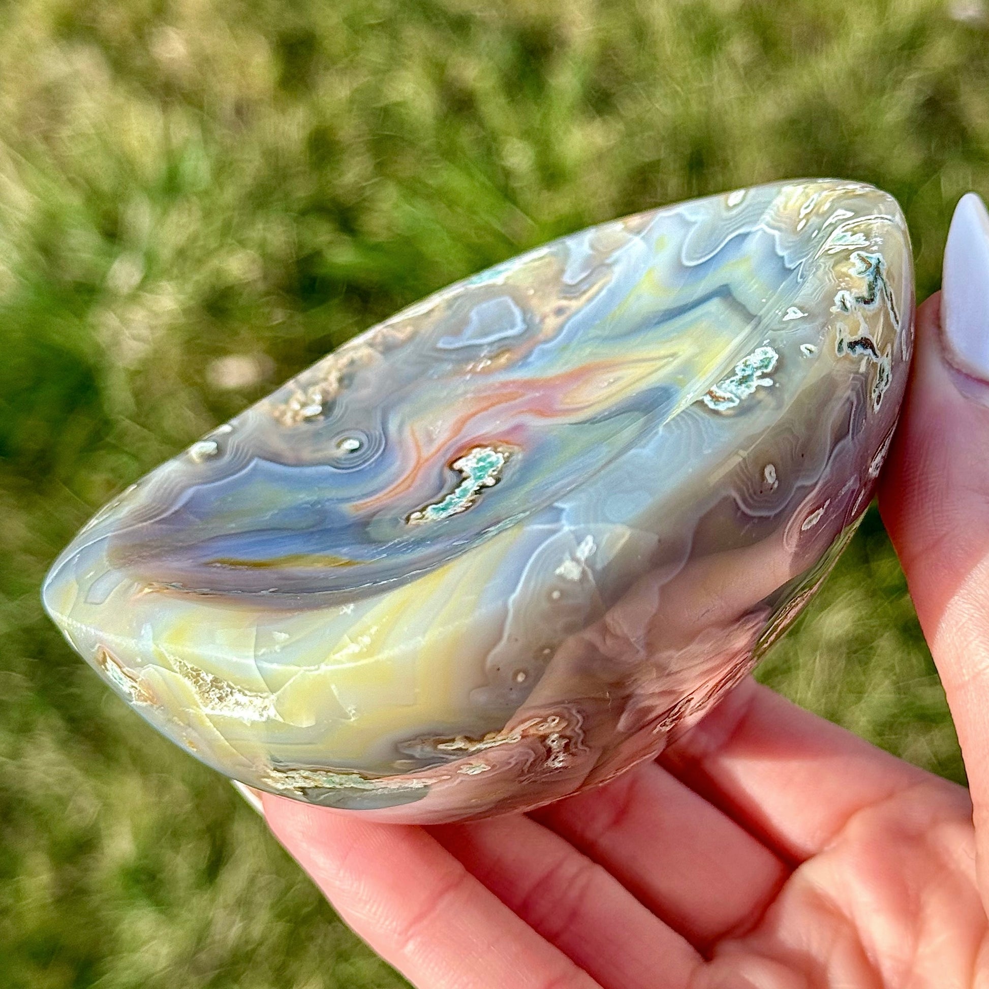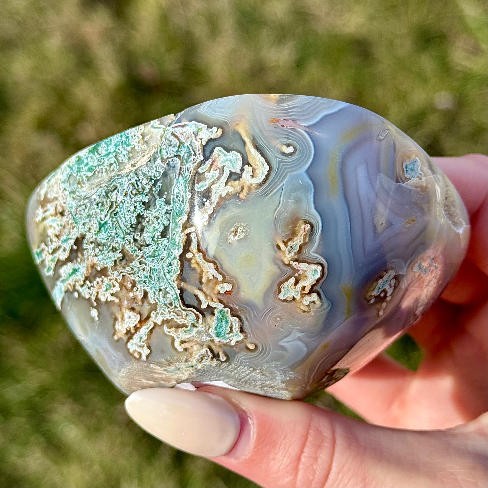 This Moss Agate Bowl is perfect for holding your favorite tiny crystals. This bowl is 3 1/4" long and showcases beautiful moss and agate patterns. Treat yourself or a loved one to this cute and functional piece.