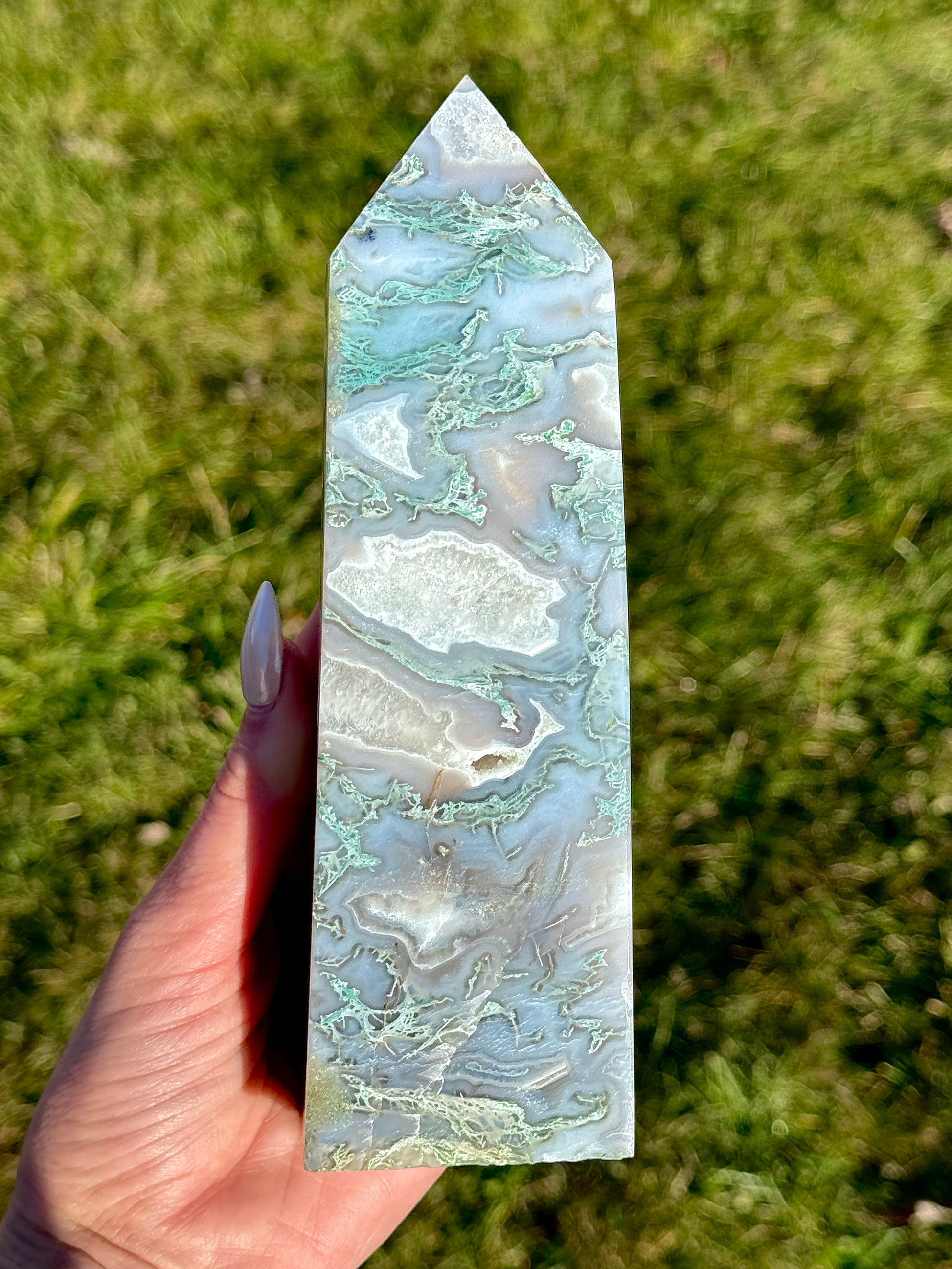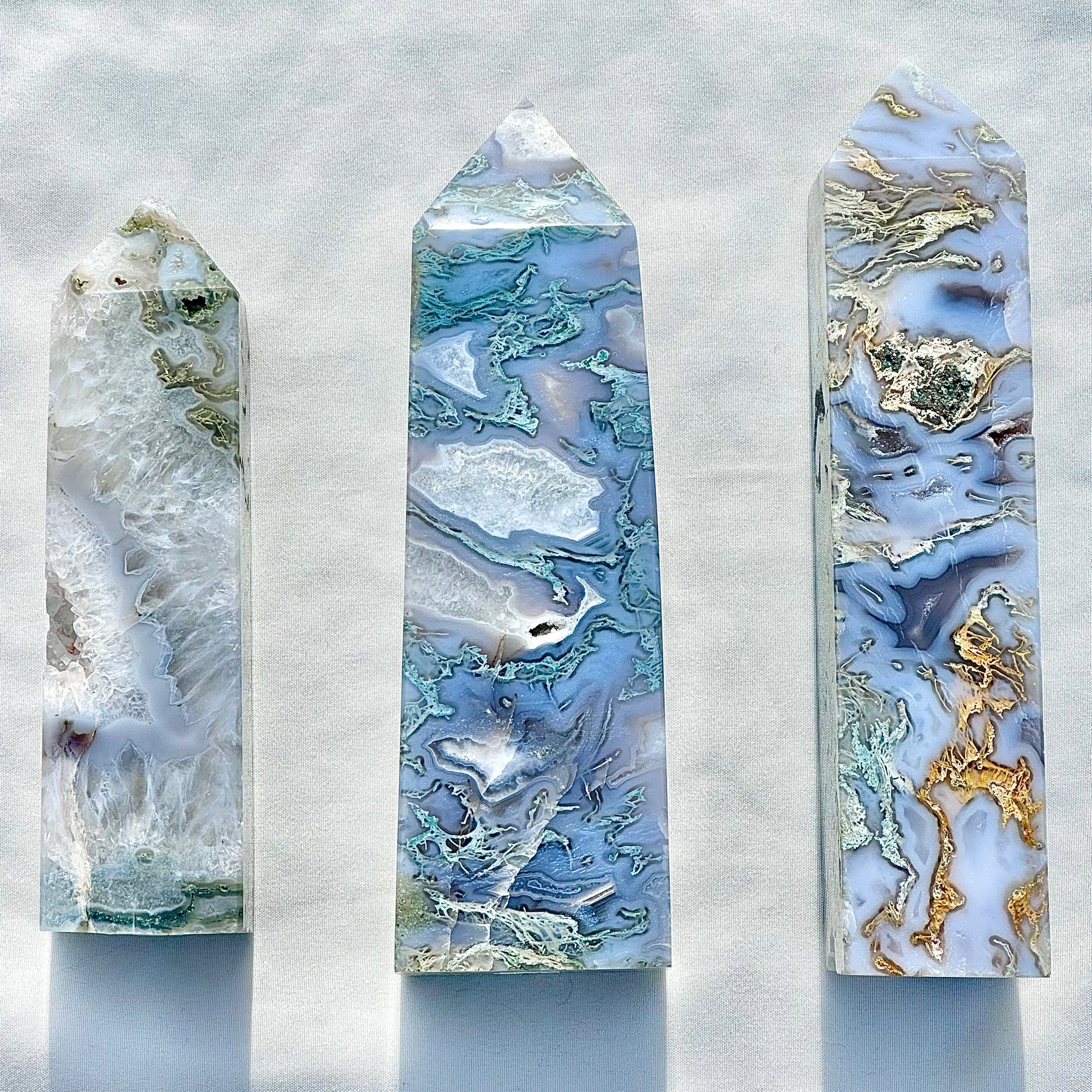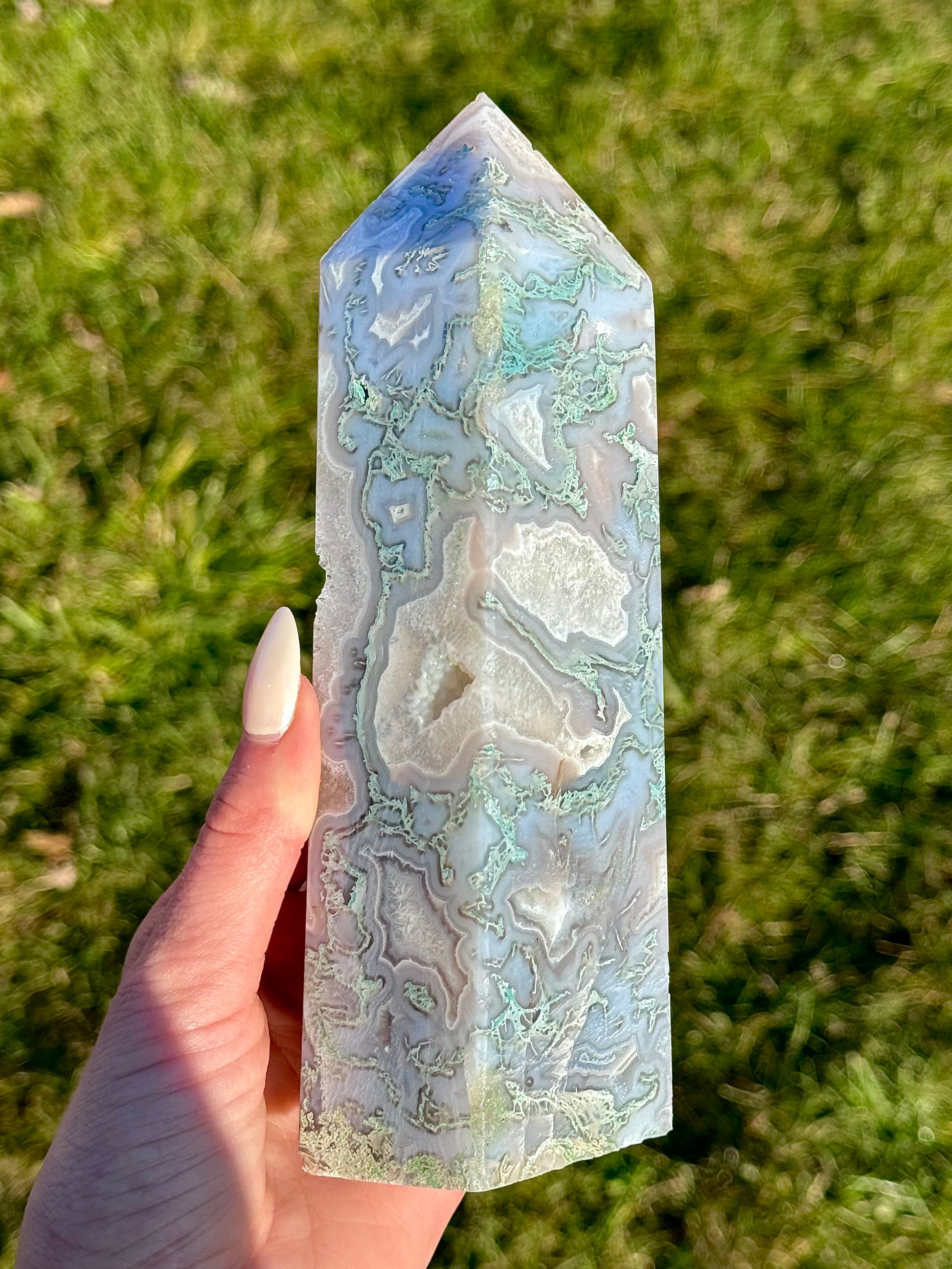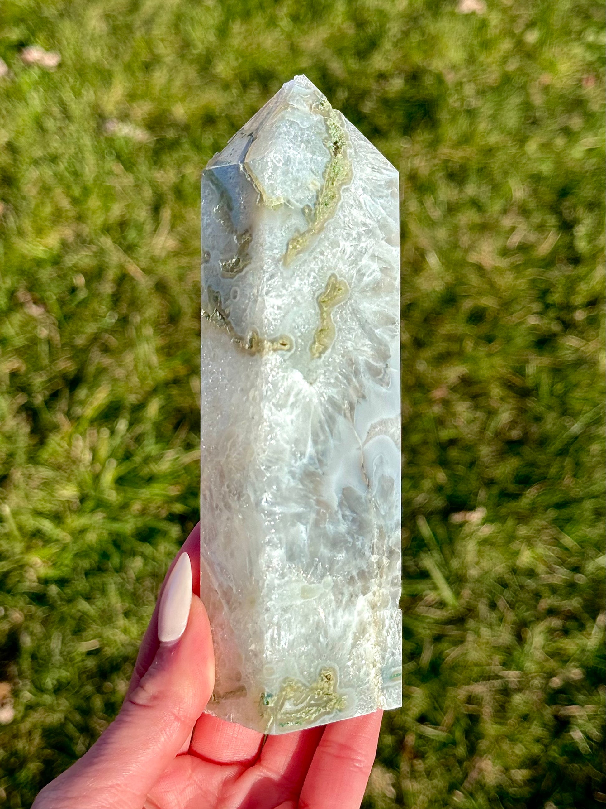 Elevate your space with these dazzling Large Moss Agate Towers! Each one is covered with sparkly druzy and spectacular moss patterns so you can find the perfect statement piece for your collection. The heights of these towers range from 5 1/4" to 6 3/4" tall.