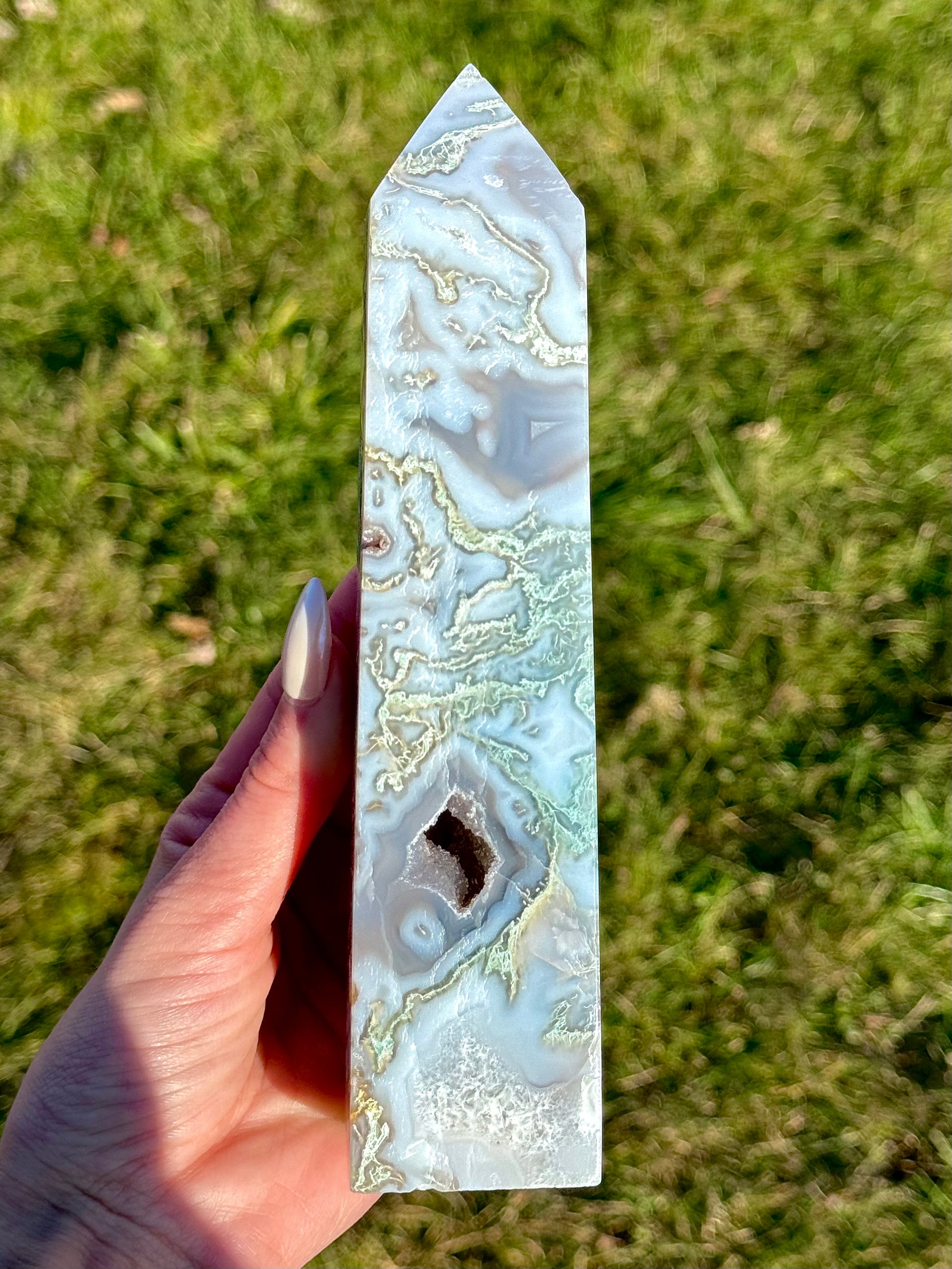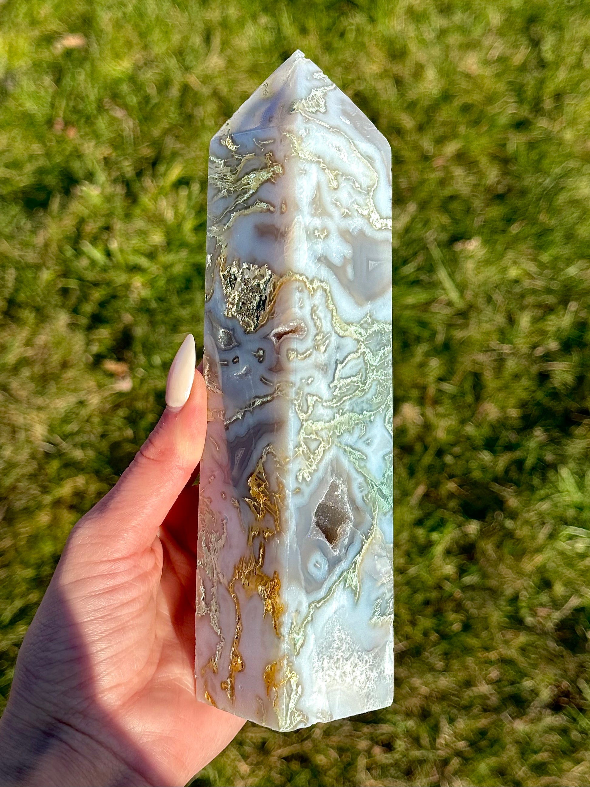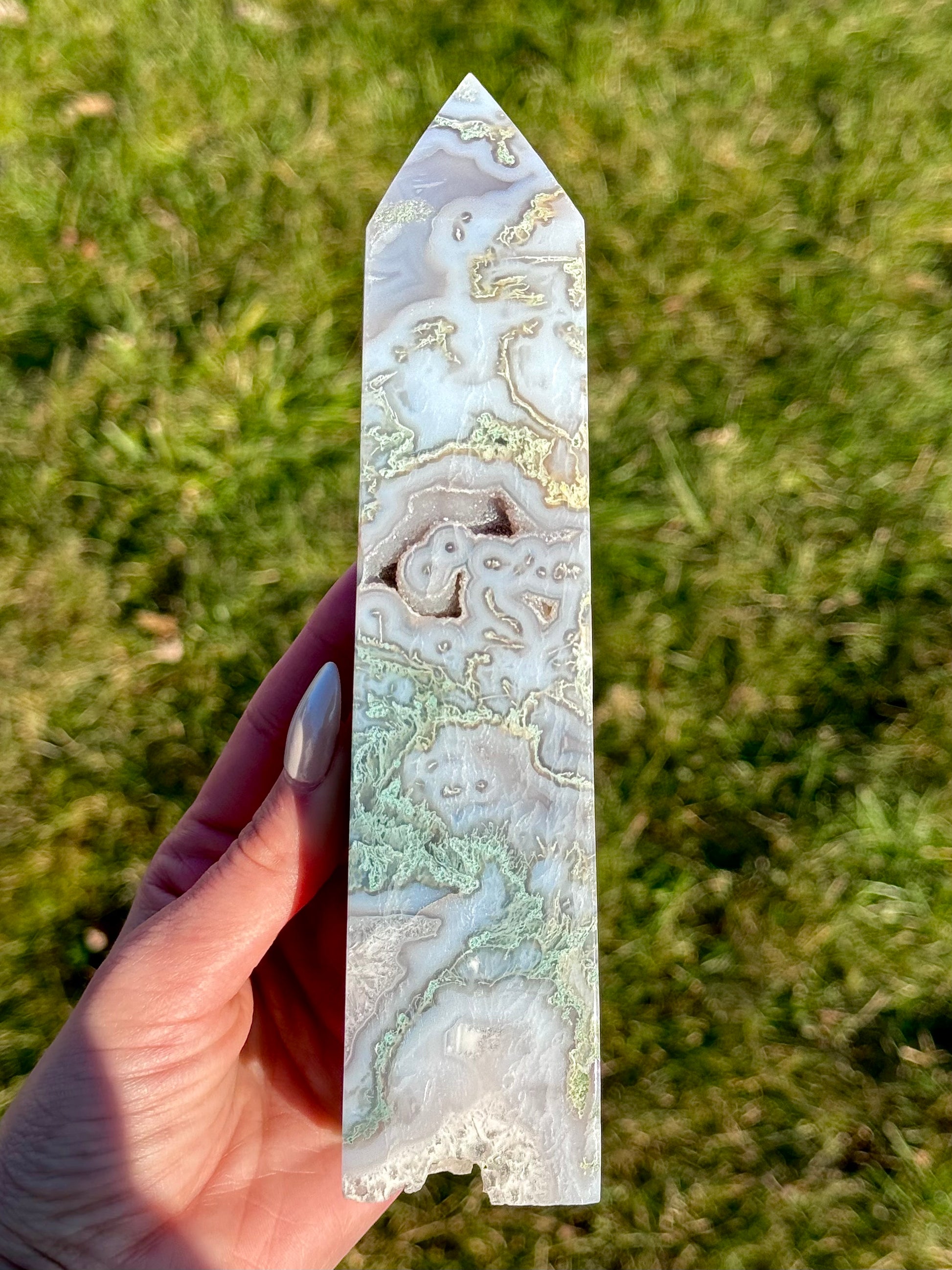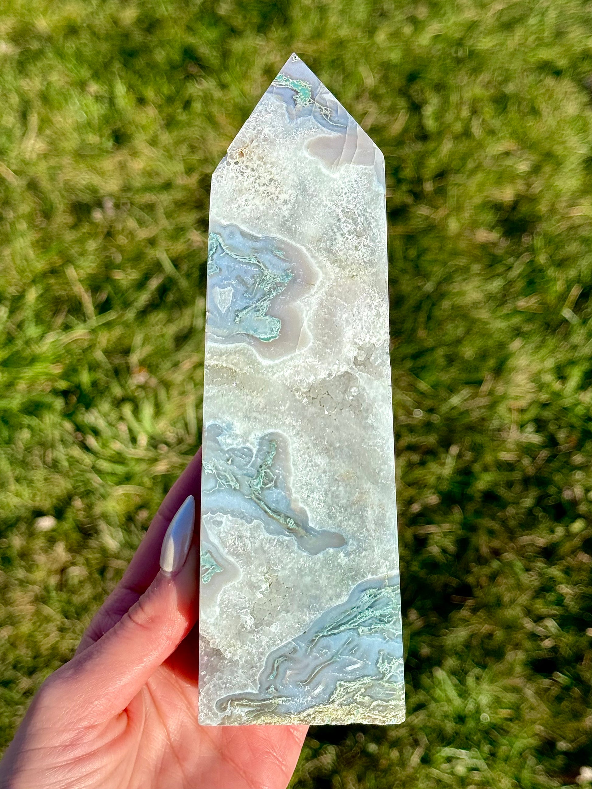 Elevate your space with these dazzling Large Moss Agate Towers! Each one is covered with sparkly druzy and spectacular moss patterns so you can find the perfect statement piece for your collection. The heights of these towers range from 5 1/4" to 6 3/4" tall.