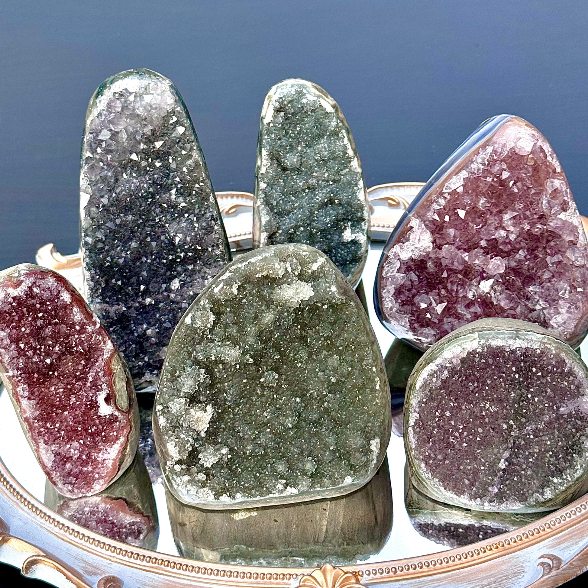 These Multi-Colored Amethyst Cut-Bases are here to make a statement with sparkling shades of pink, red, green, and blue. The heights of these cut-bases range from 3 1/2" to 4 1/2" tall.