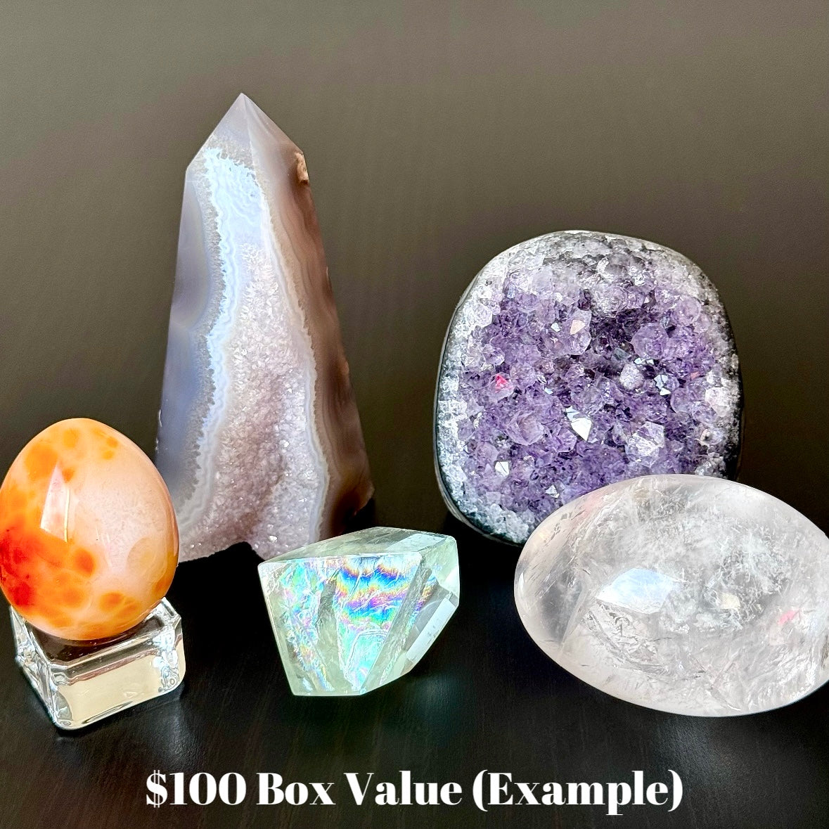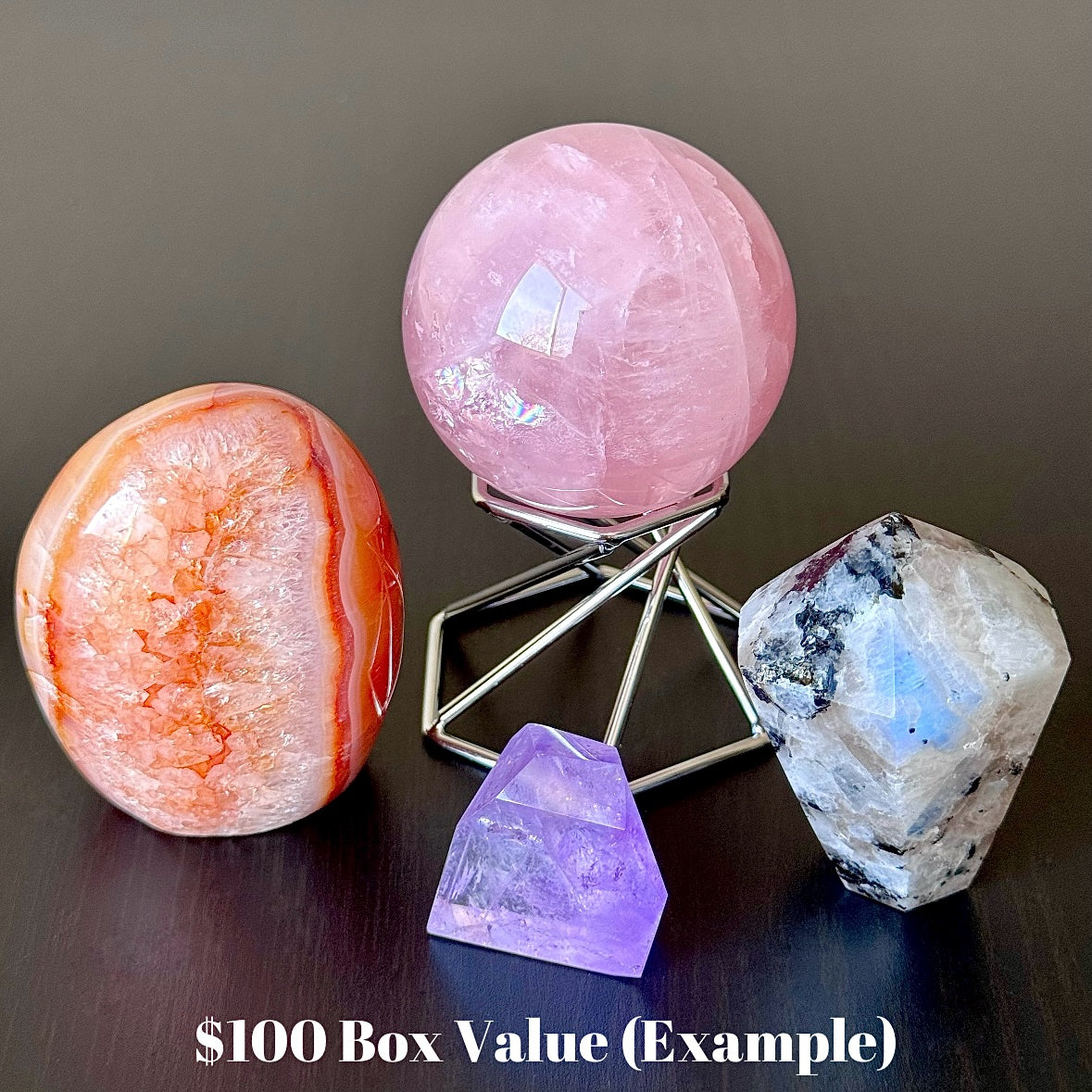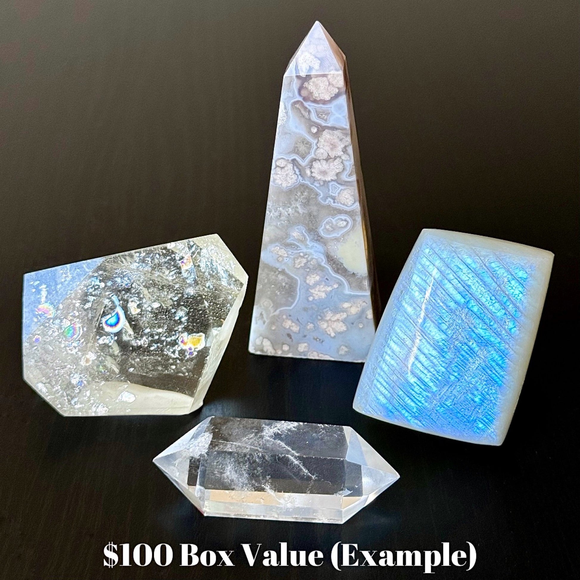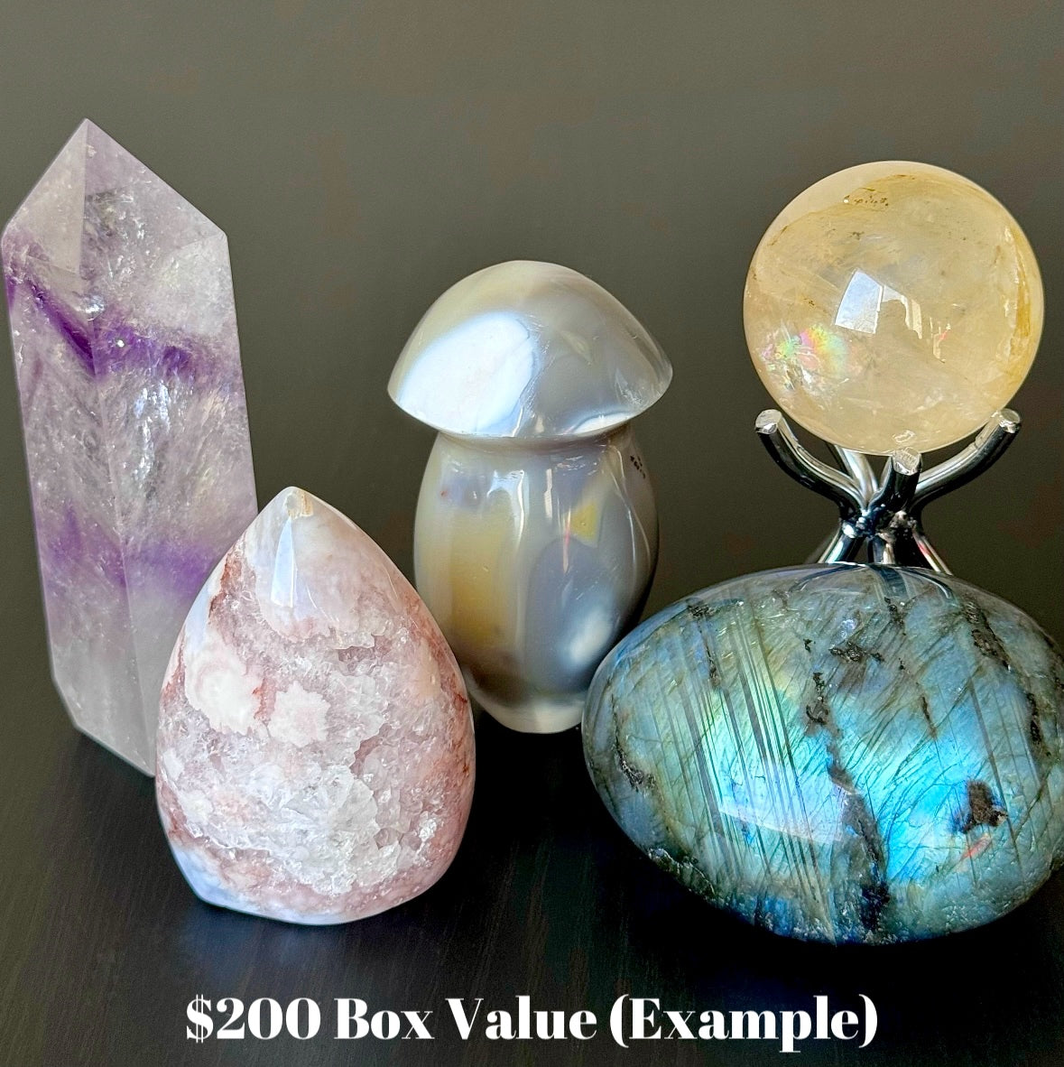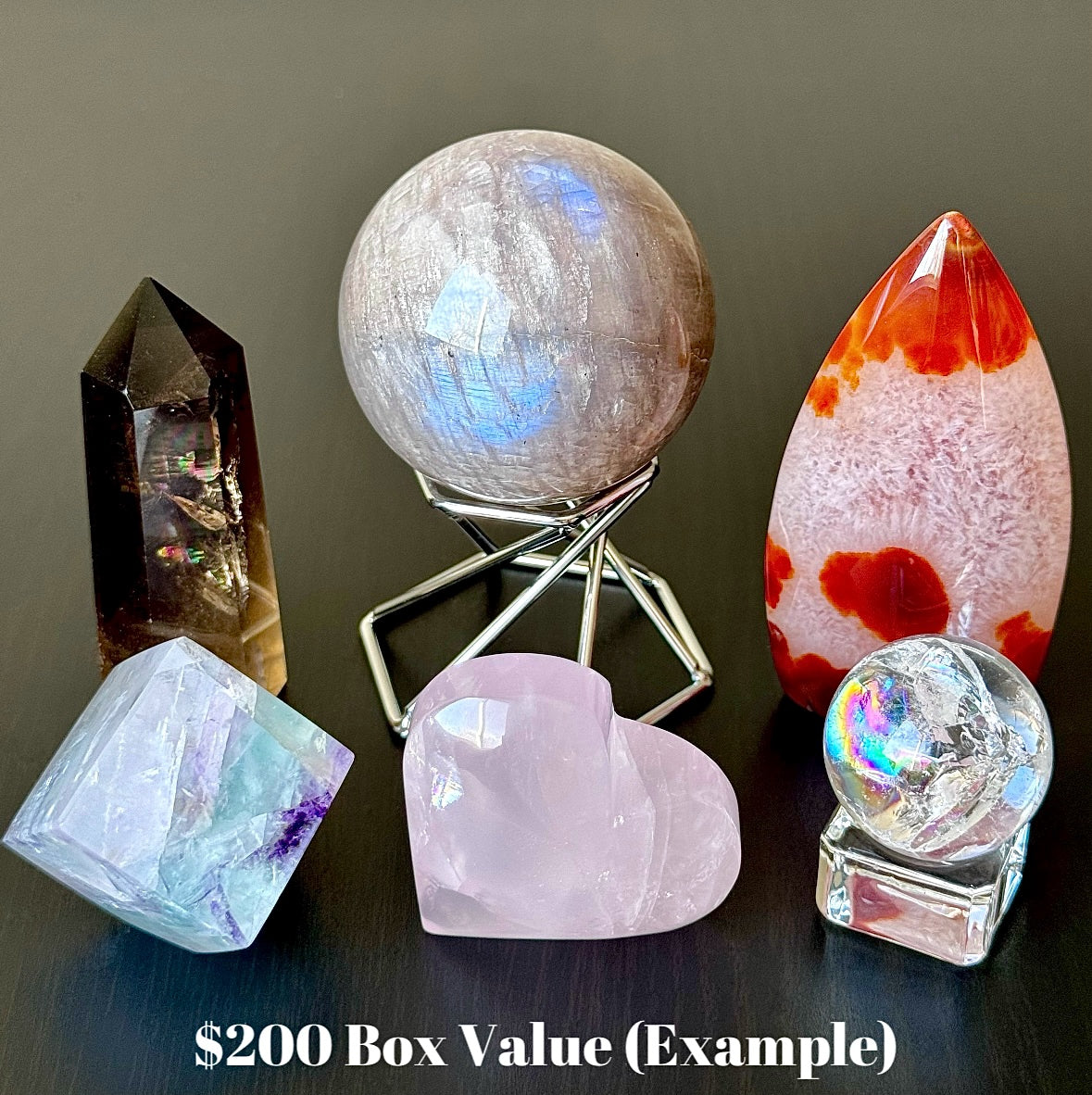Boxes will include different materials of crystals in various sizes and shapes composing of tumbles, palms, towers, spheres, freeforms, carvings, specimens, etc.
