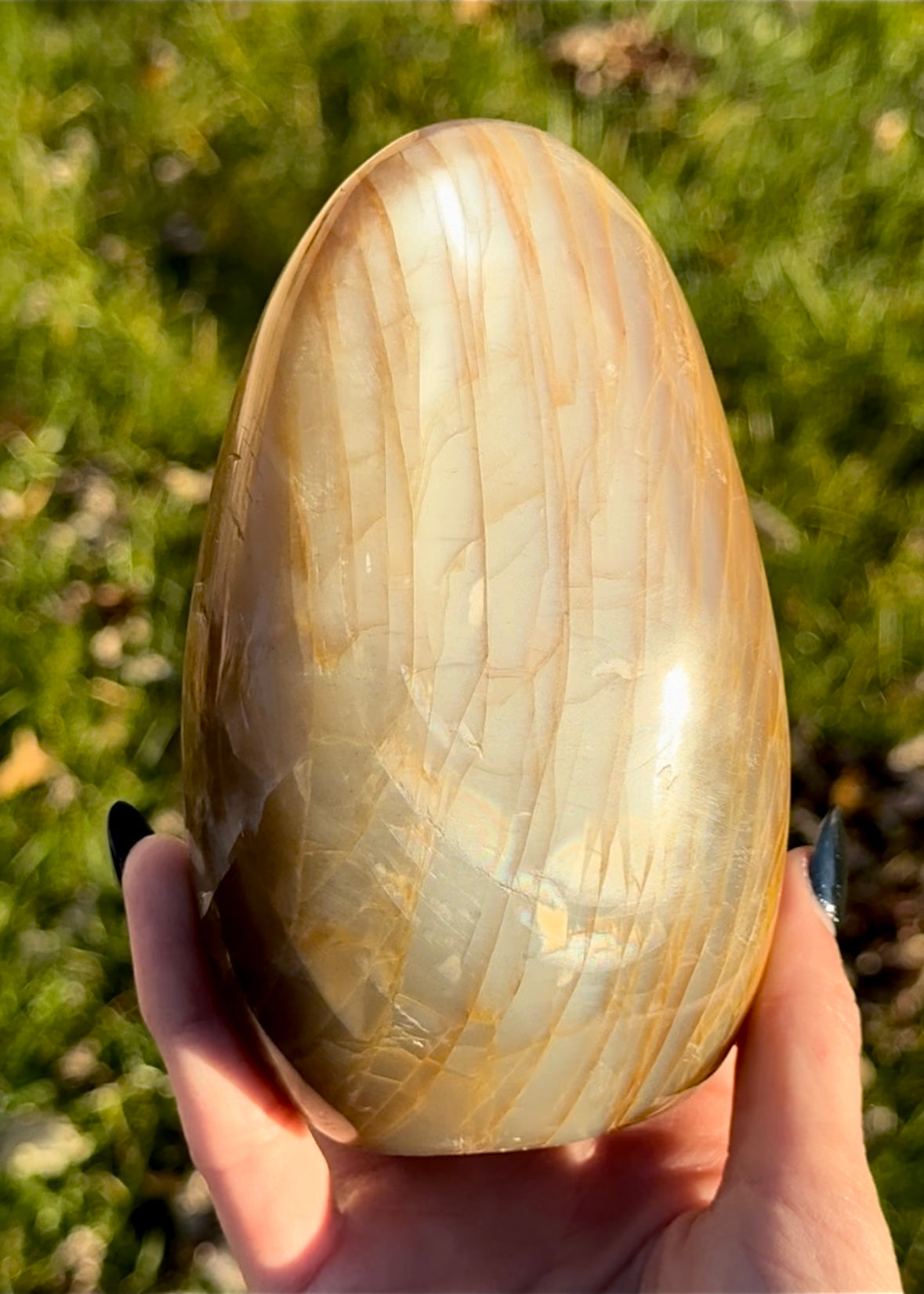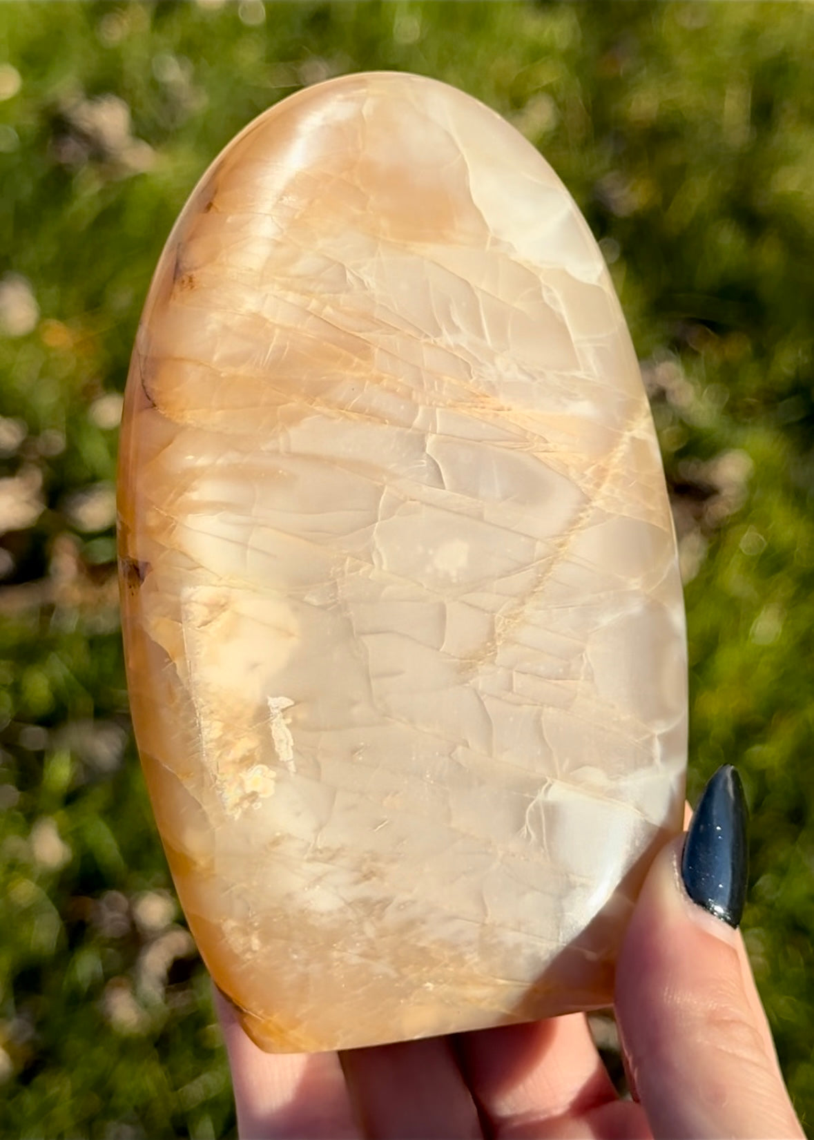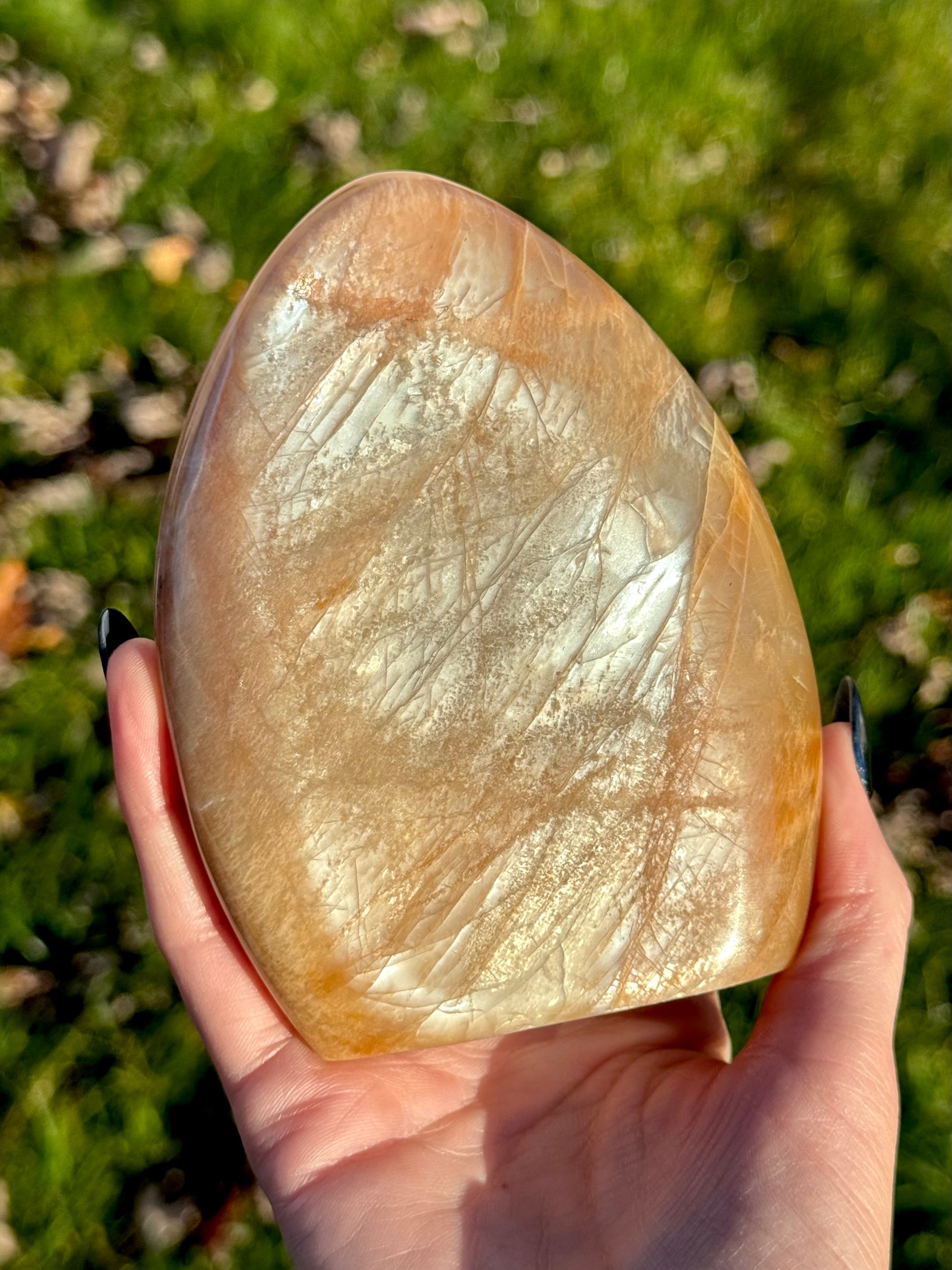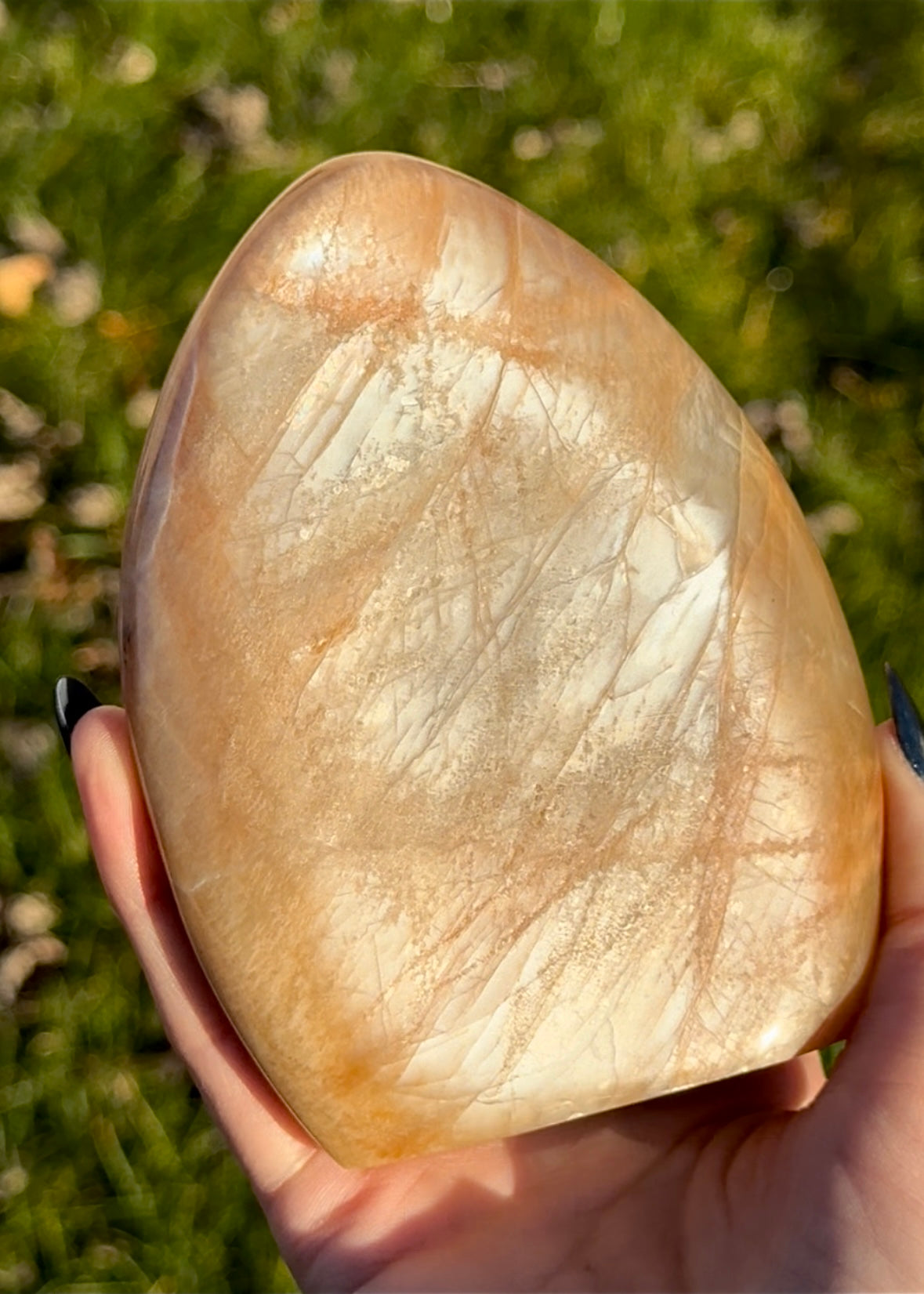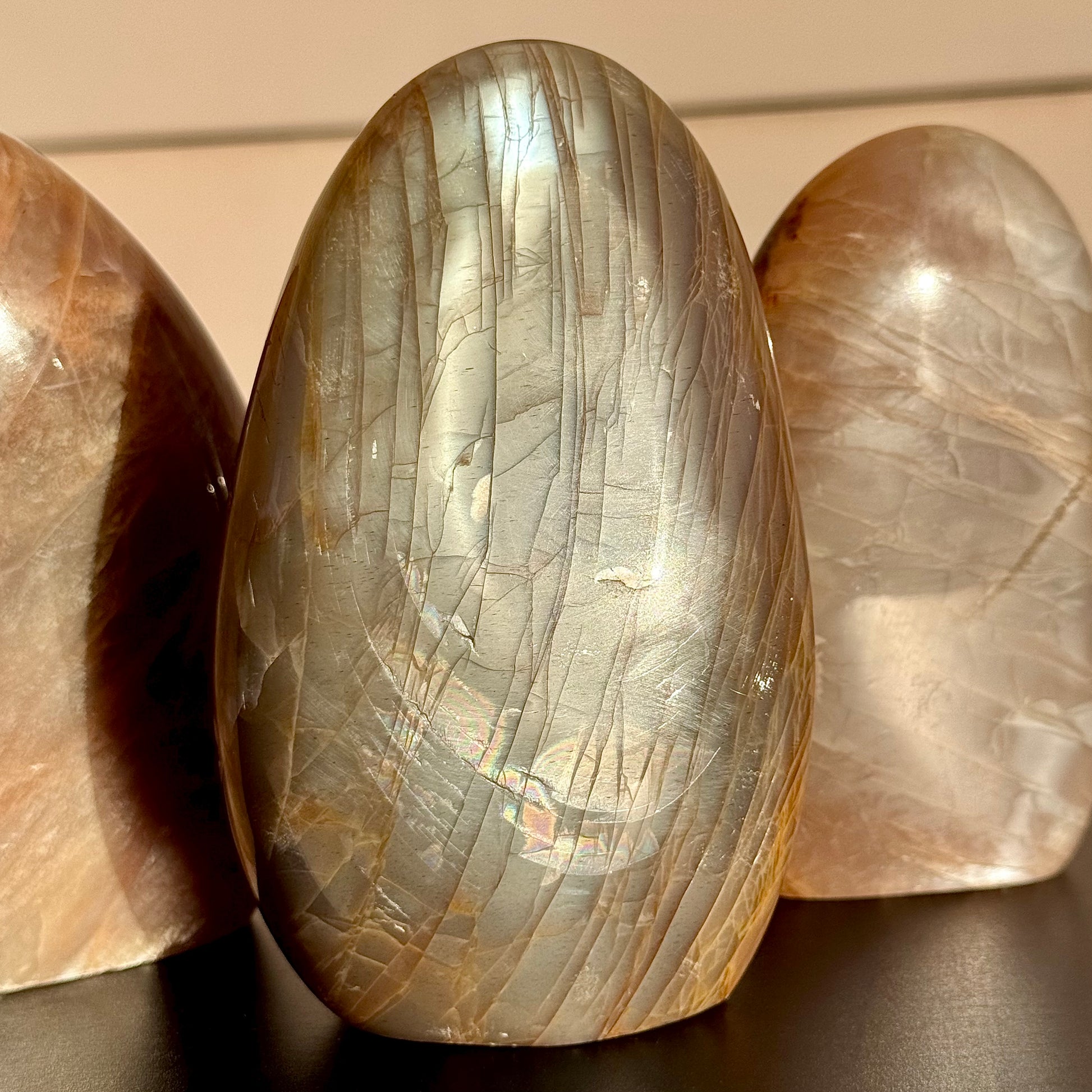 These Peach Moonstone Freeforms are one of our favorites! Each one has a strong flash that stands out against their warm peachy hues. The heights of these pieces range from 4 1/2" to 5" tall.