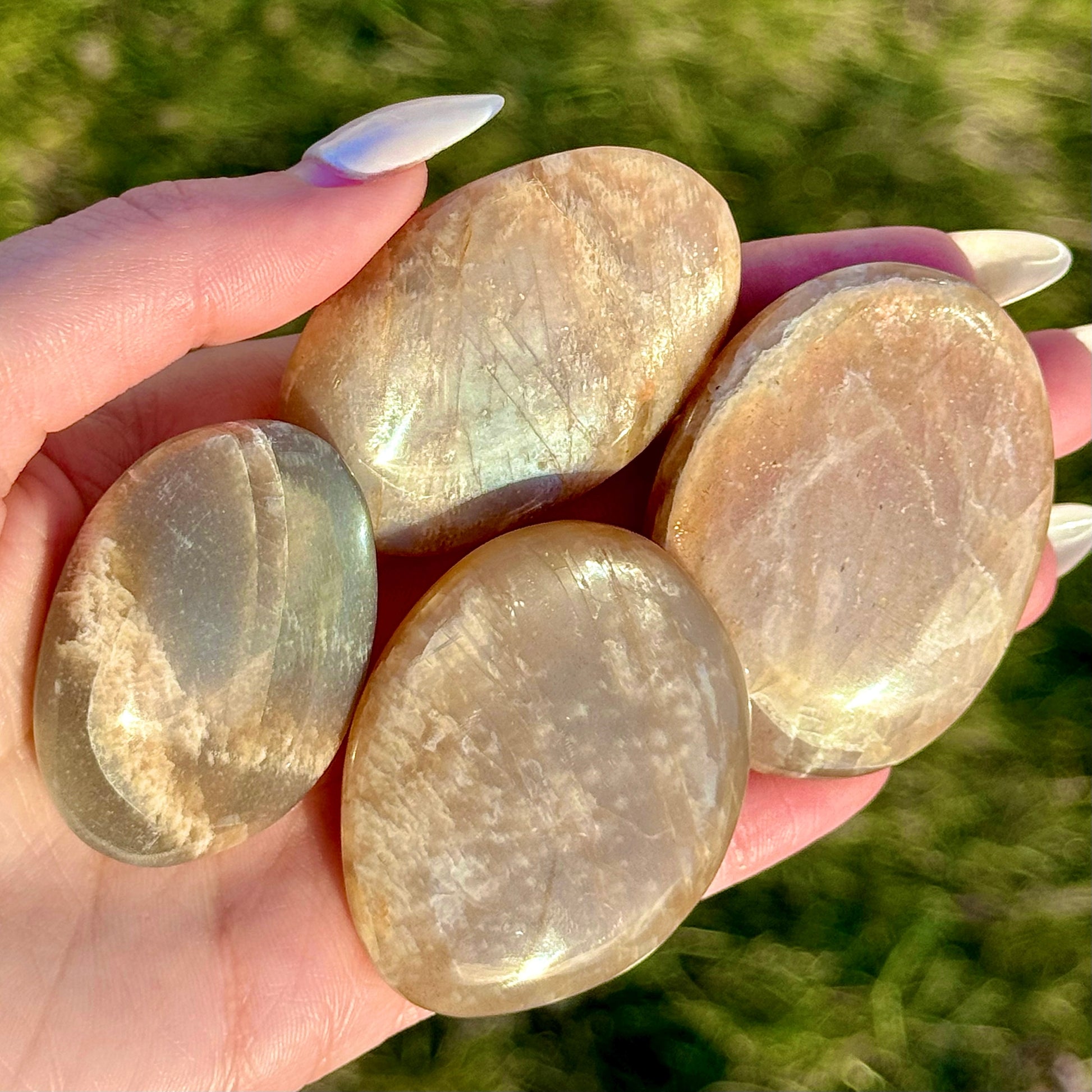 Our Peach Moonstone Palm Stones are available in two sizes: a smaller size or standard palm size. Each palm has stunning white flash and some feature sparkly sunstone.