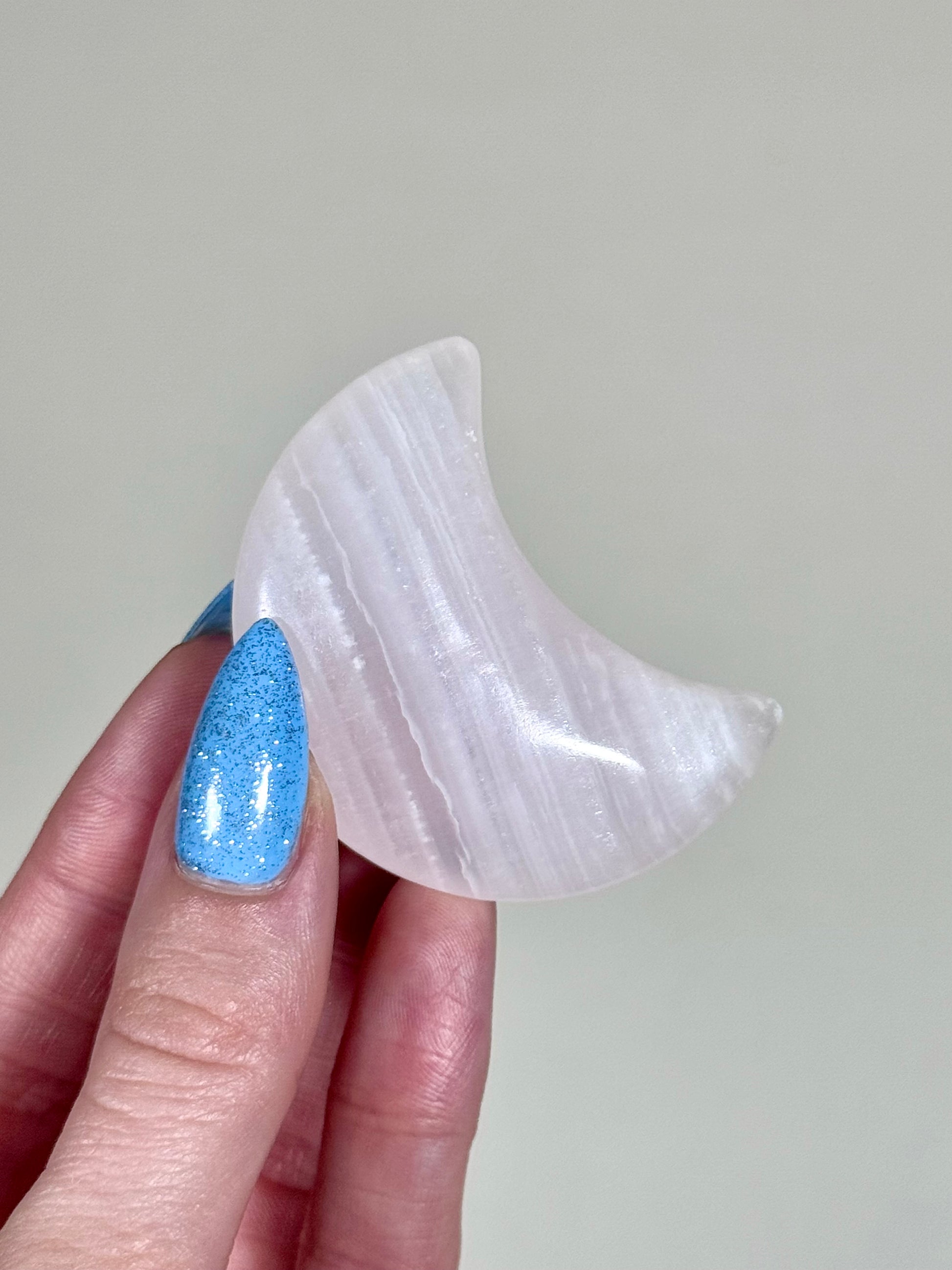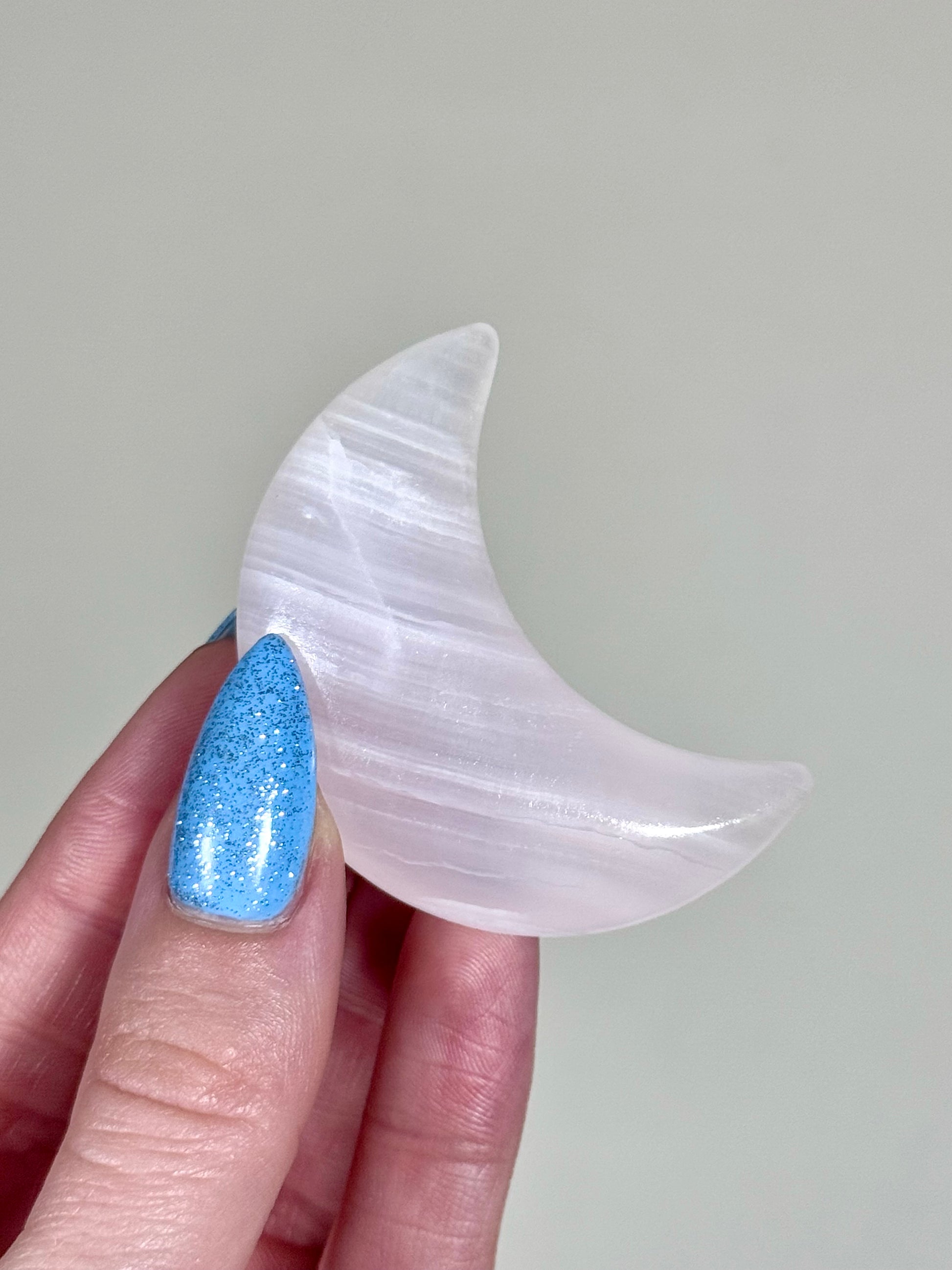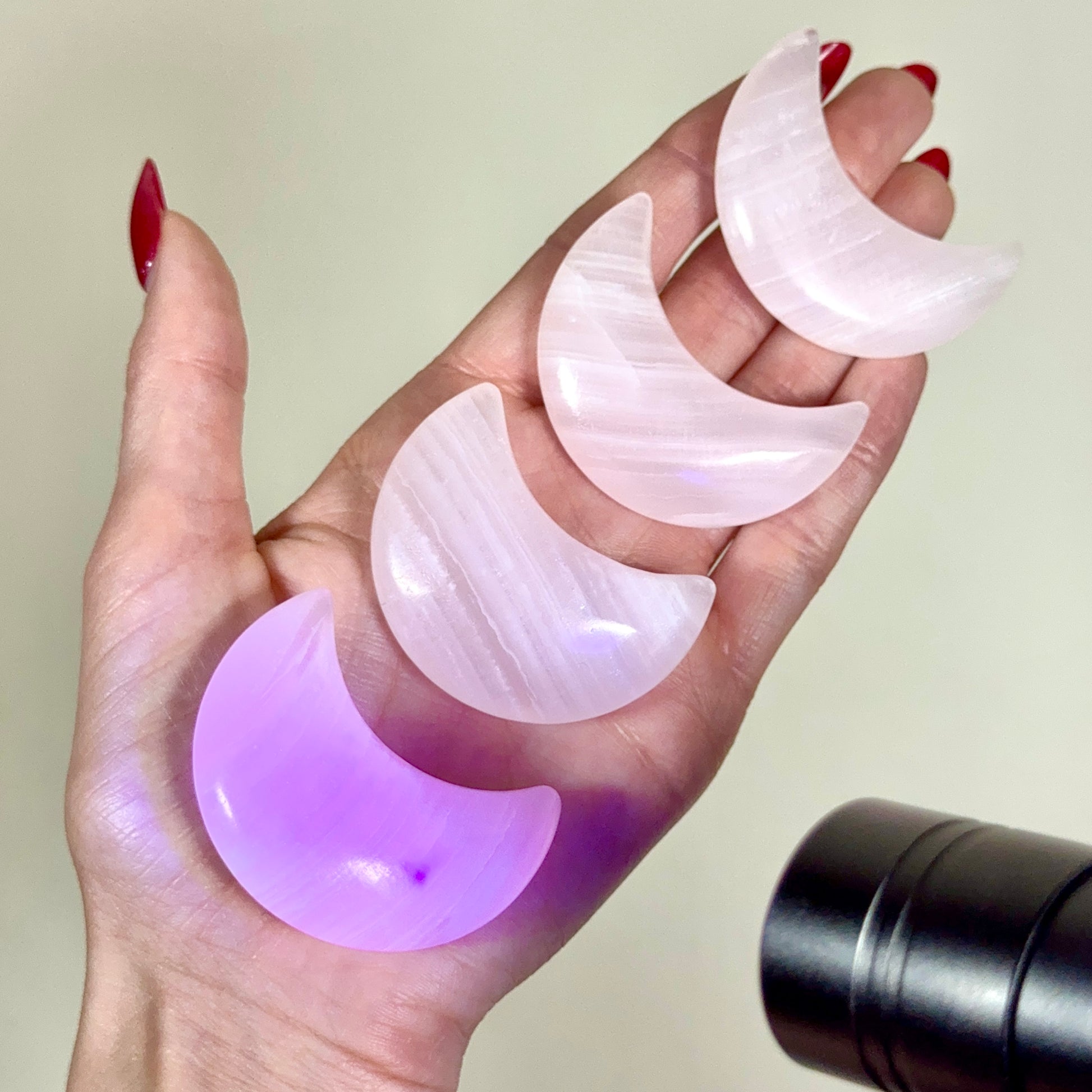 The UV reaction on these Pink Calcite Moon Carvings is very strong (see in last photo).
