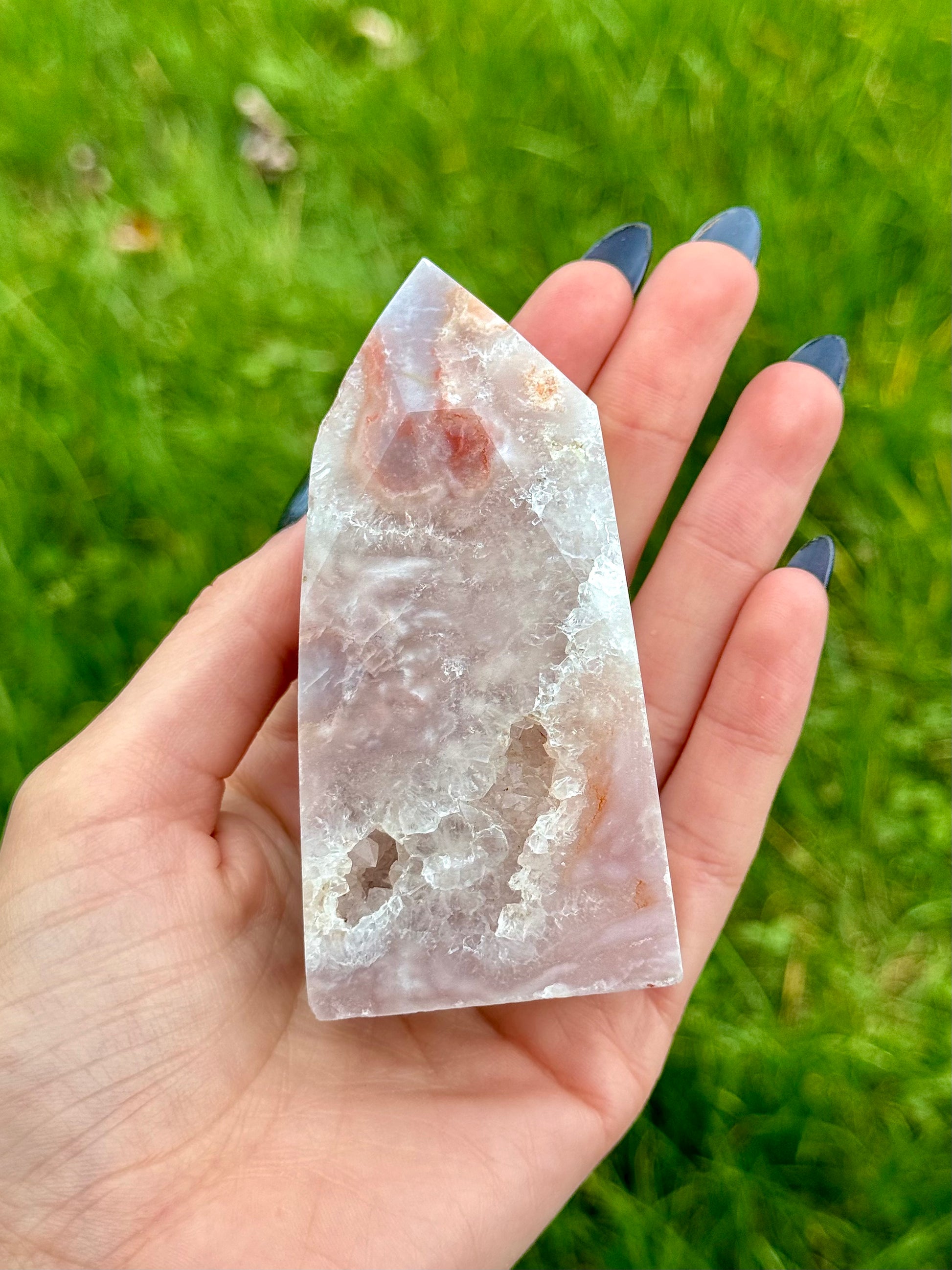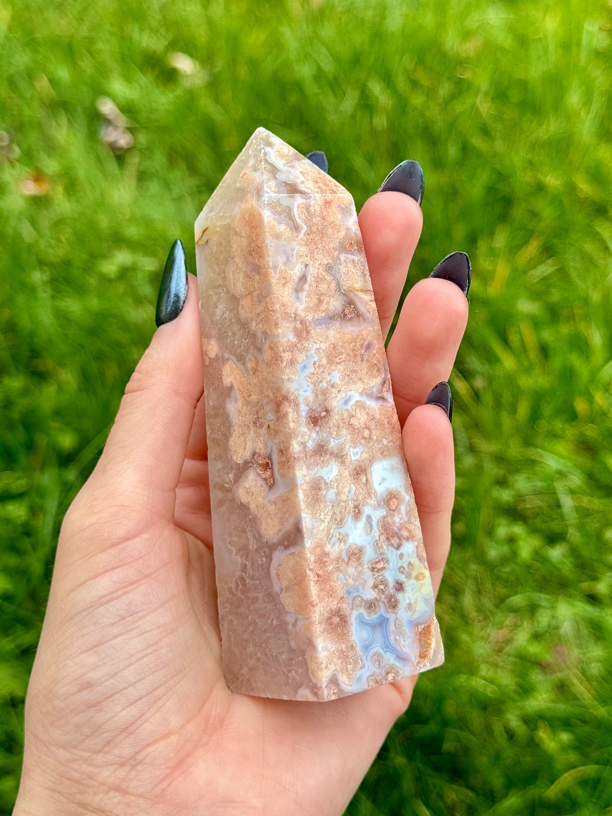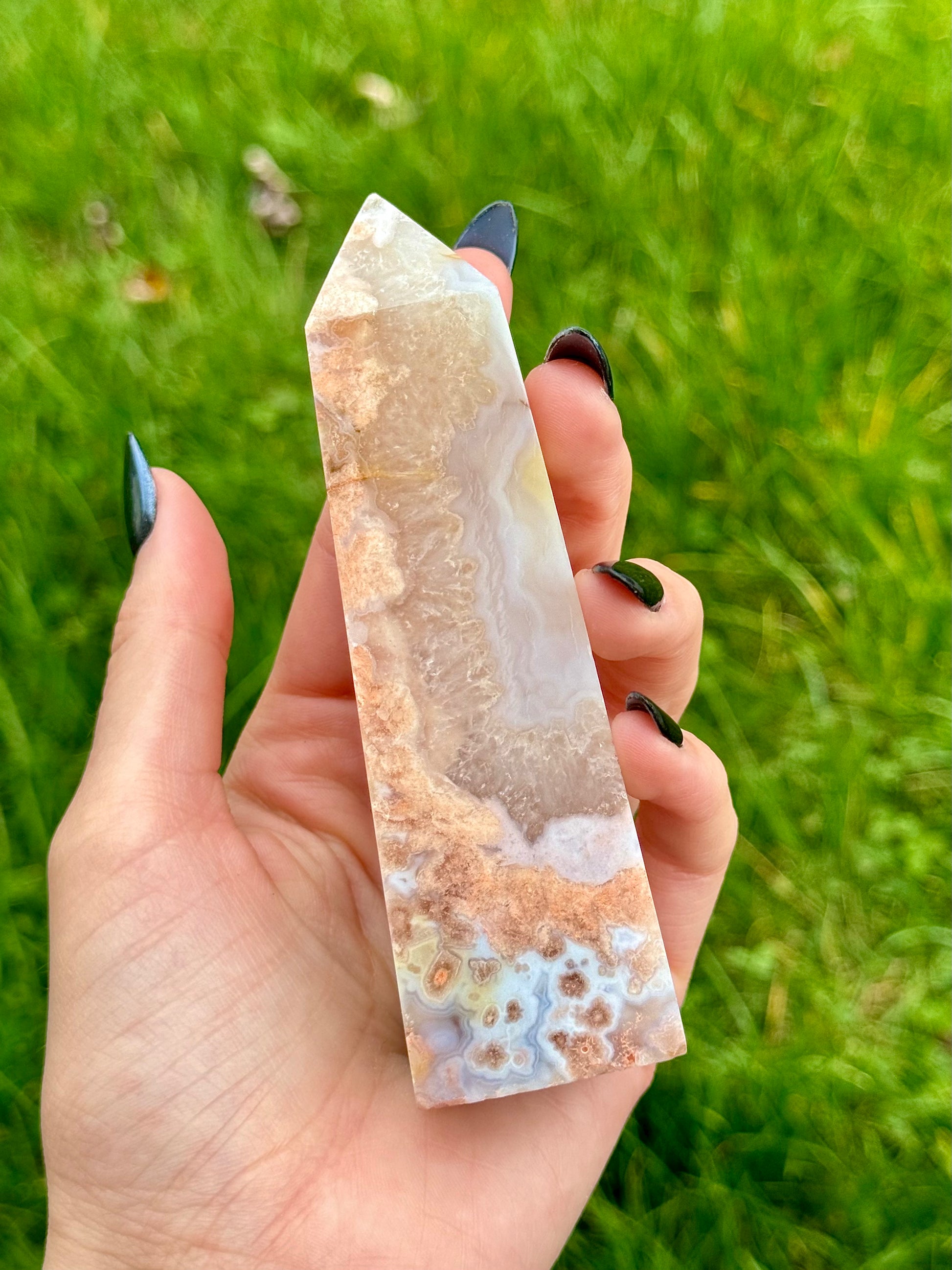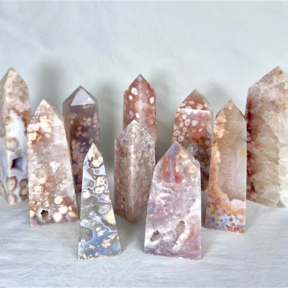 Select your favorite from these Flower Agate Towers that showcase fantastic flower designs. Most of these pieces feature some quartz and agate. These towers have heights ranging from about 3 1/2" to 5 1/2" tall.