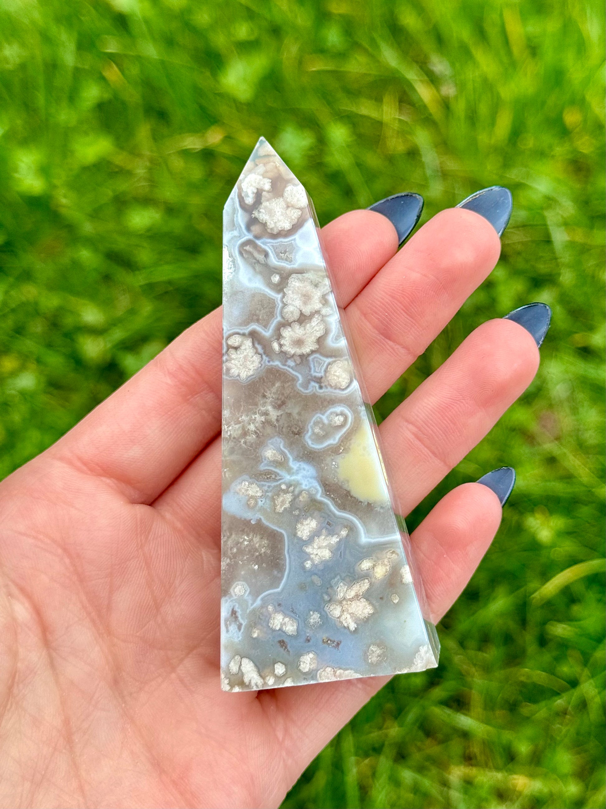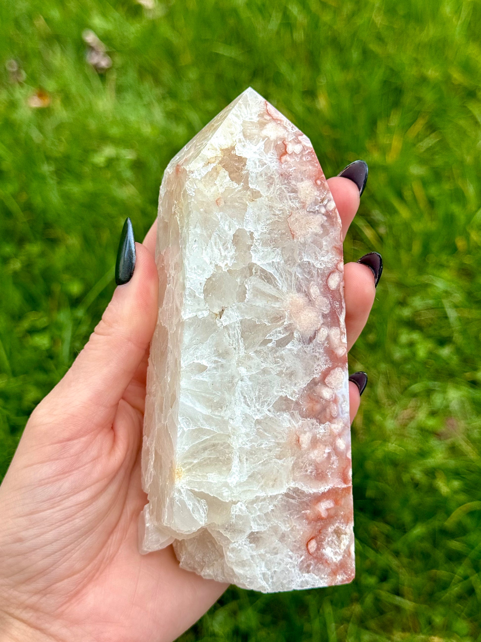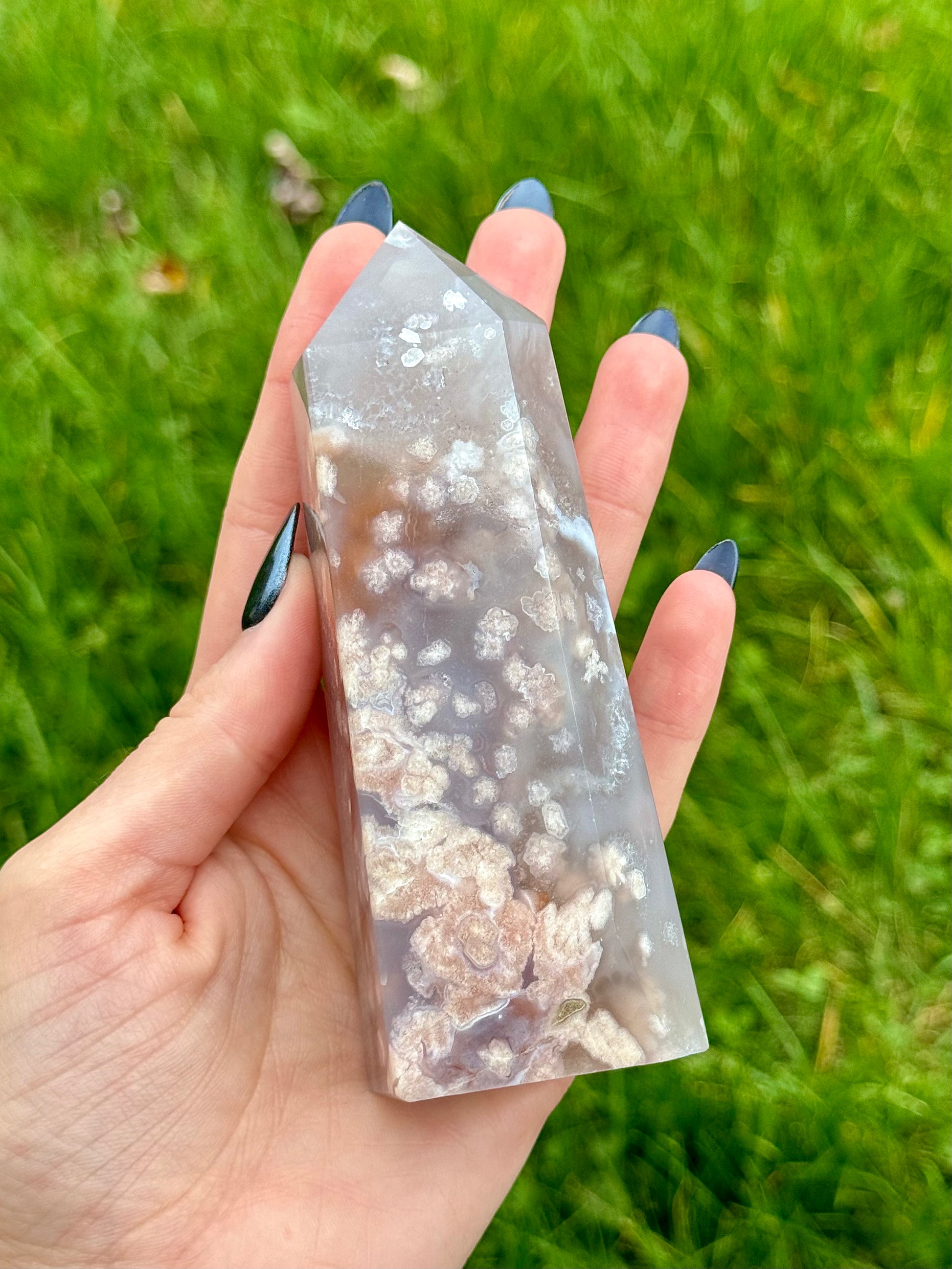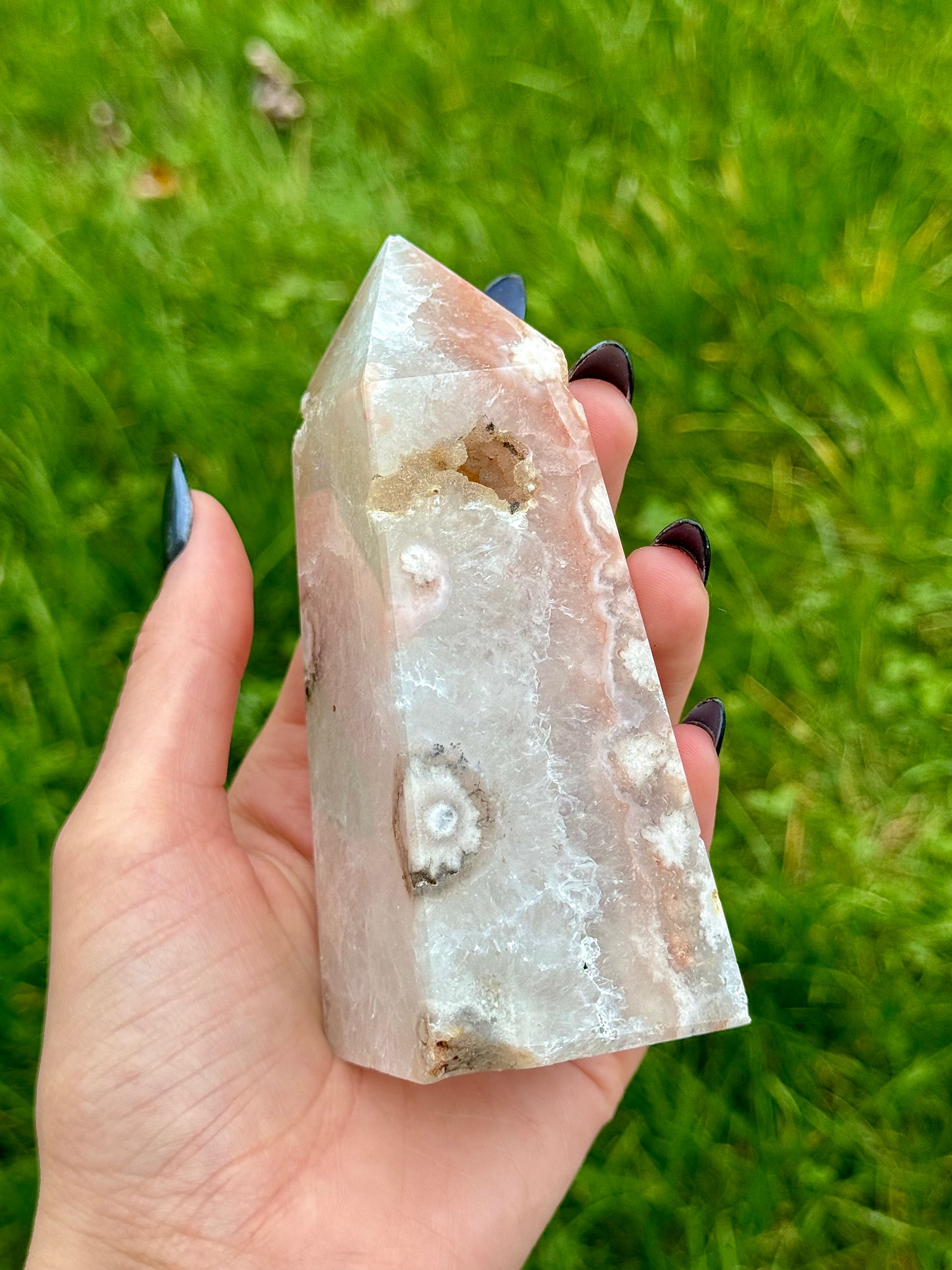 Select your favorite from these Flower Agate Towers that showcase fantastic flower designs. Most of these pieces feature some quartz and agate. These towers have heights ranging from about 3 1/2" to 5 1/2" tall.