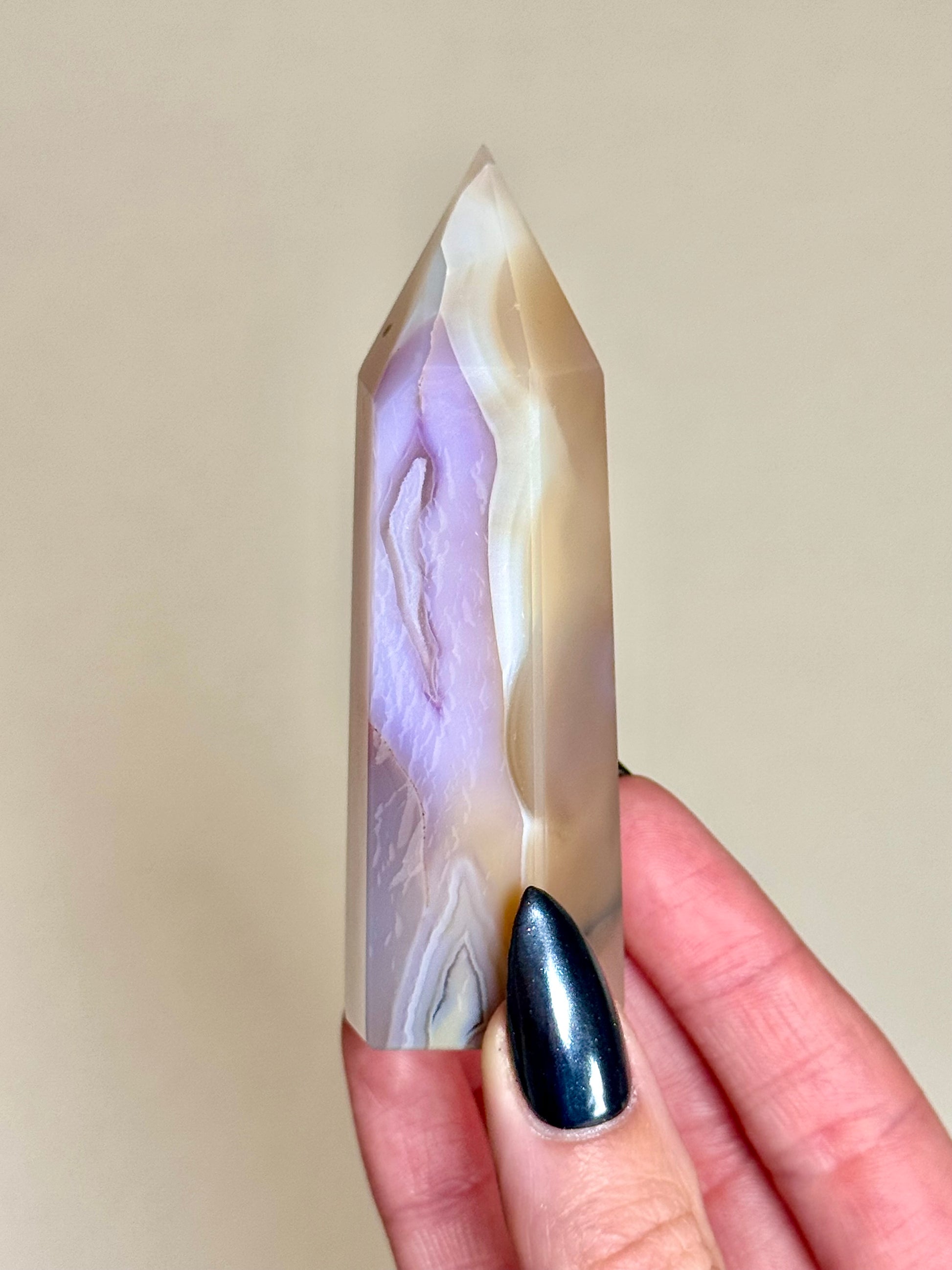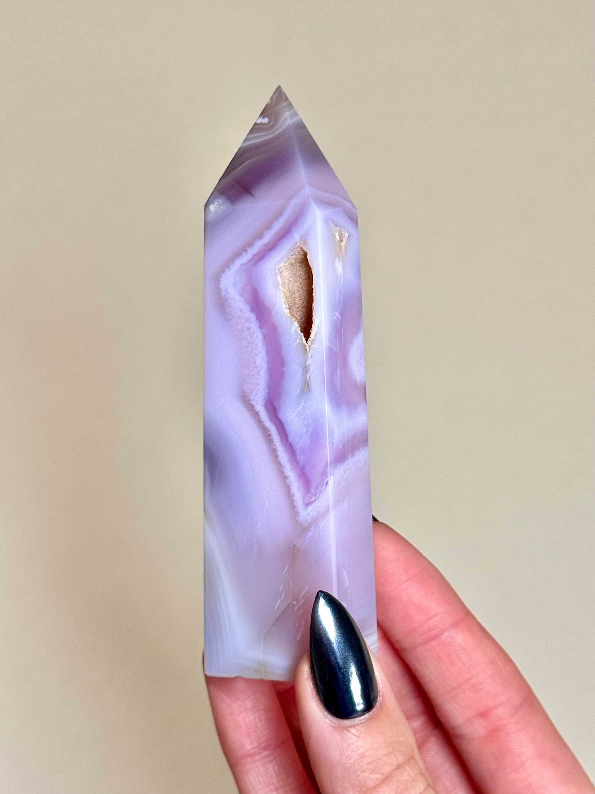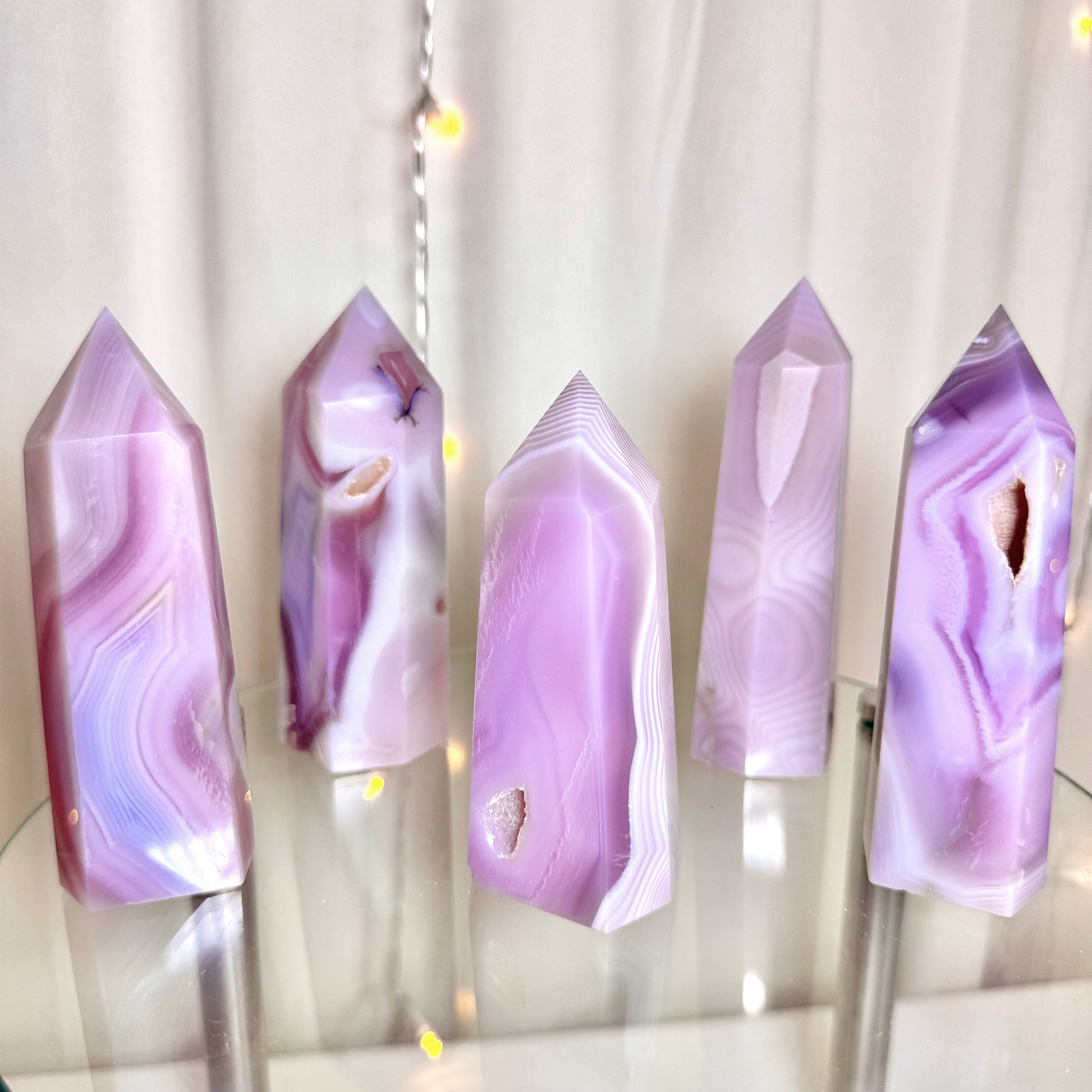 These Pink Jelly Agate Towers have heights ranging from 2 1/2” & 4 1/2” tall.