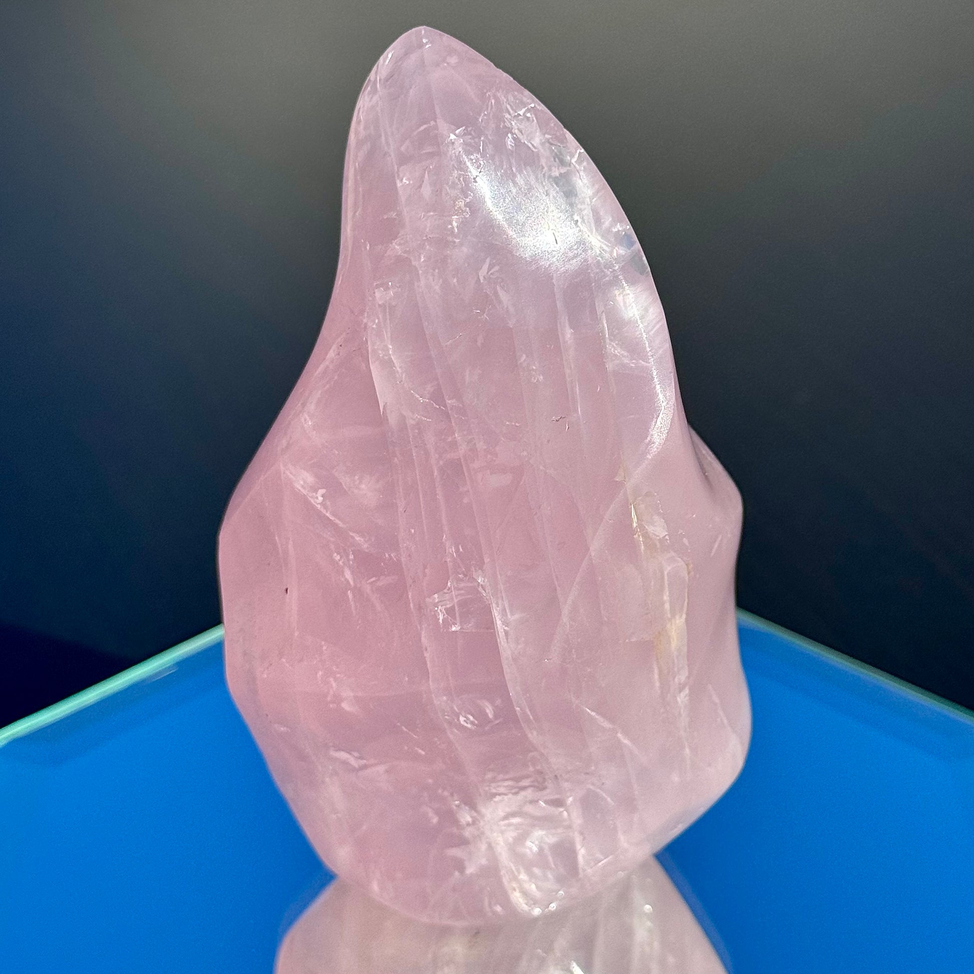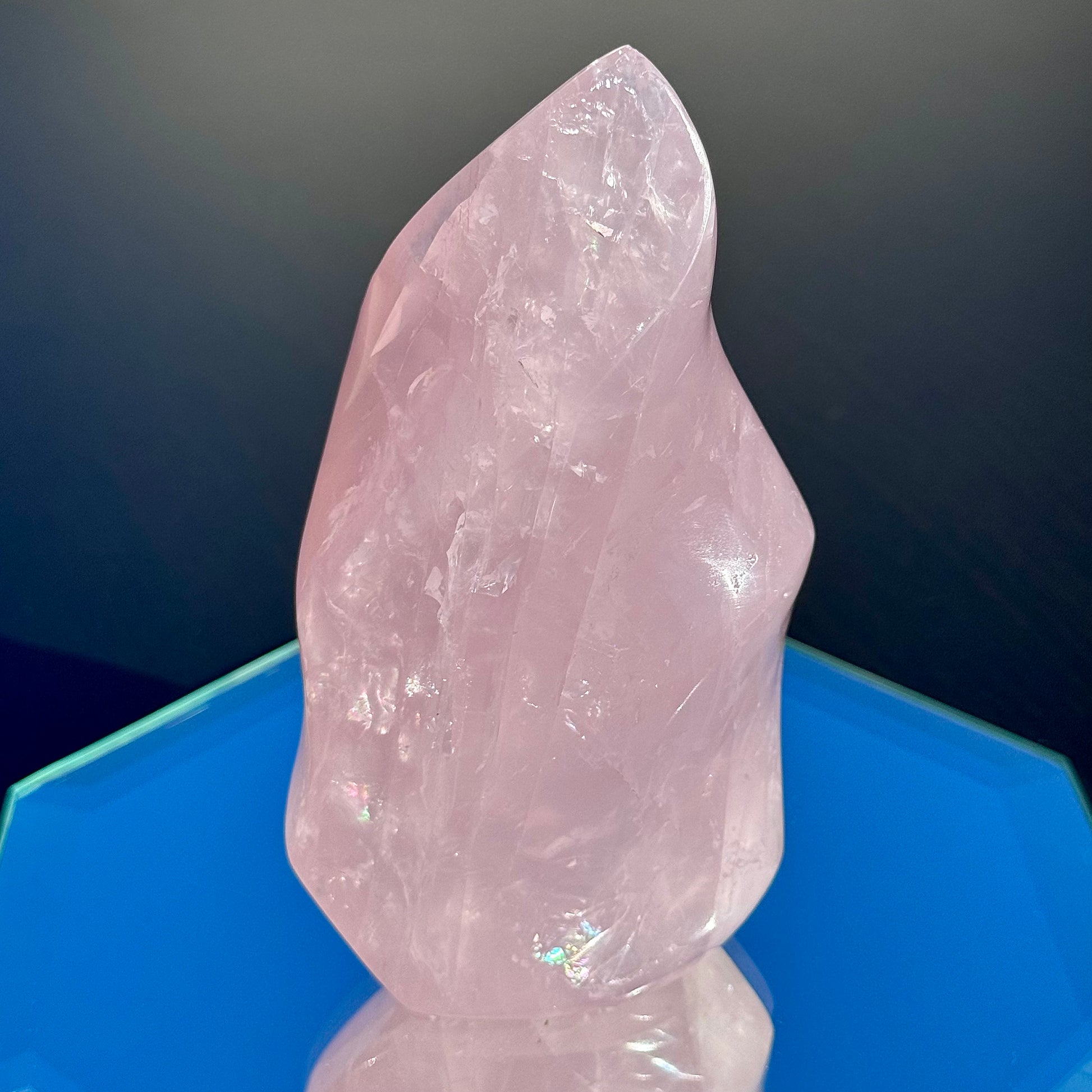This Rose Quartz Flame is a stunning addition to any space. This piece has star light and is coated in shimmery rainbow accents. It is 4 1/2" tall.
