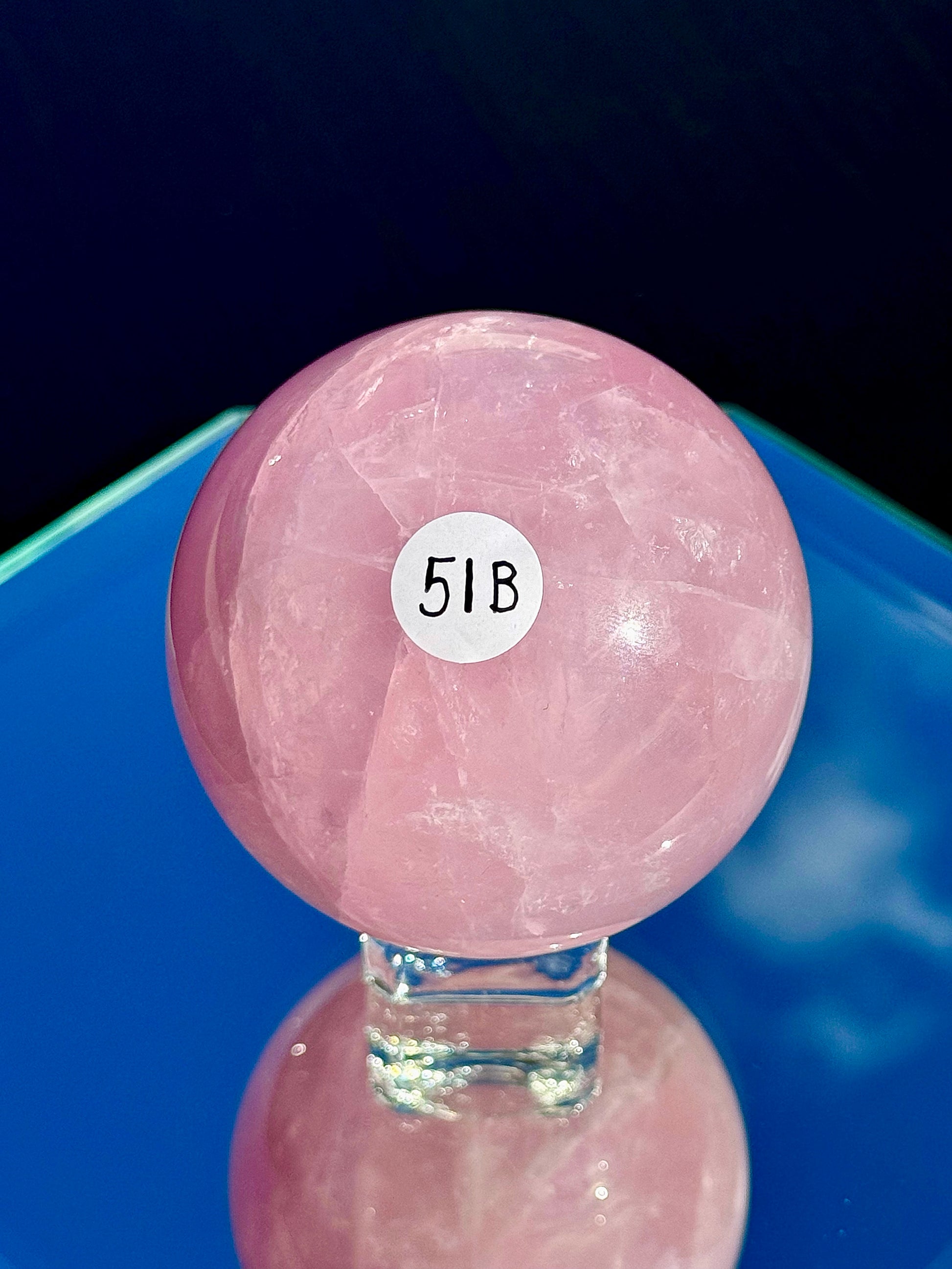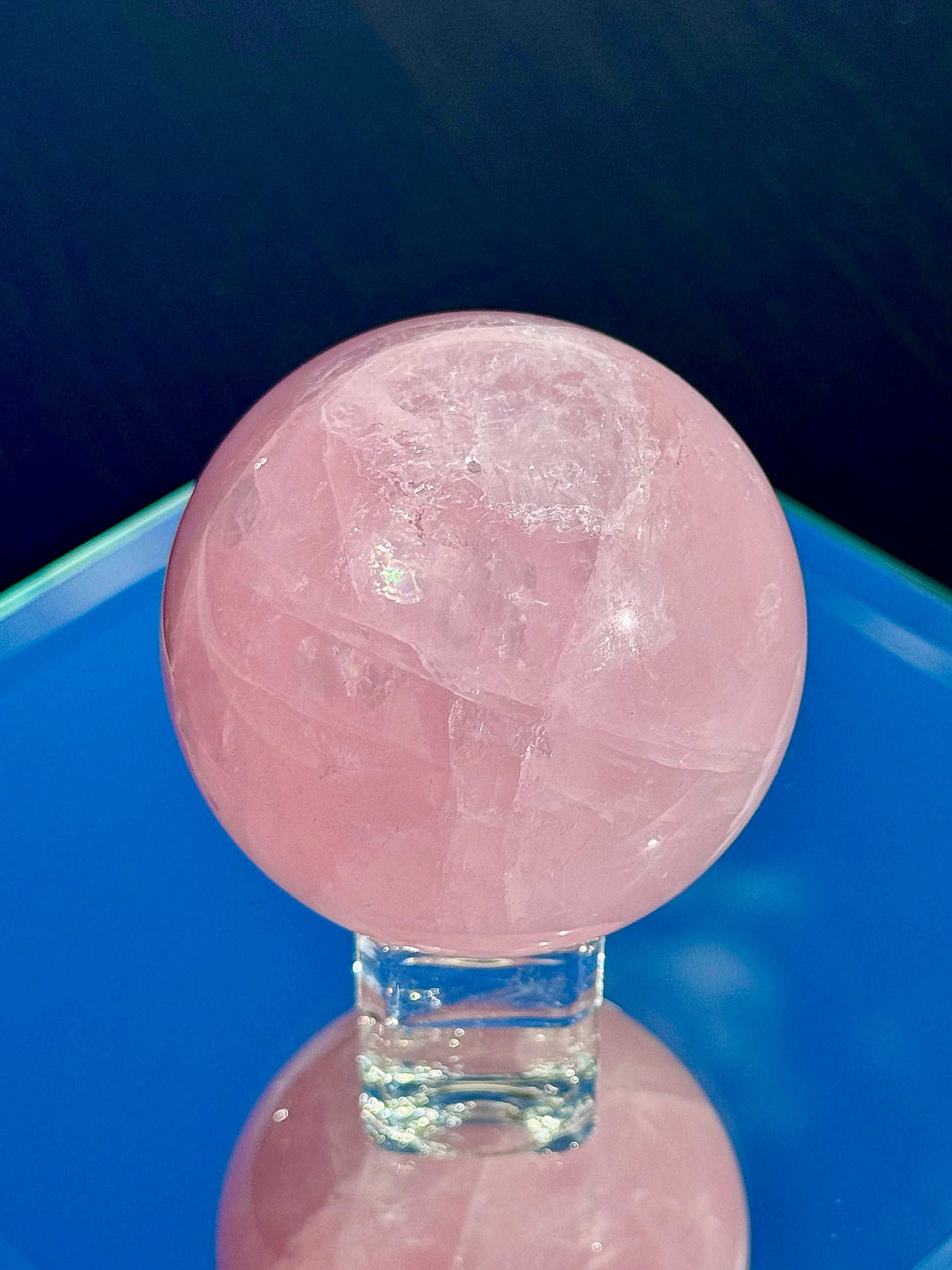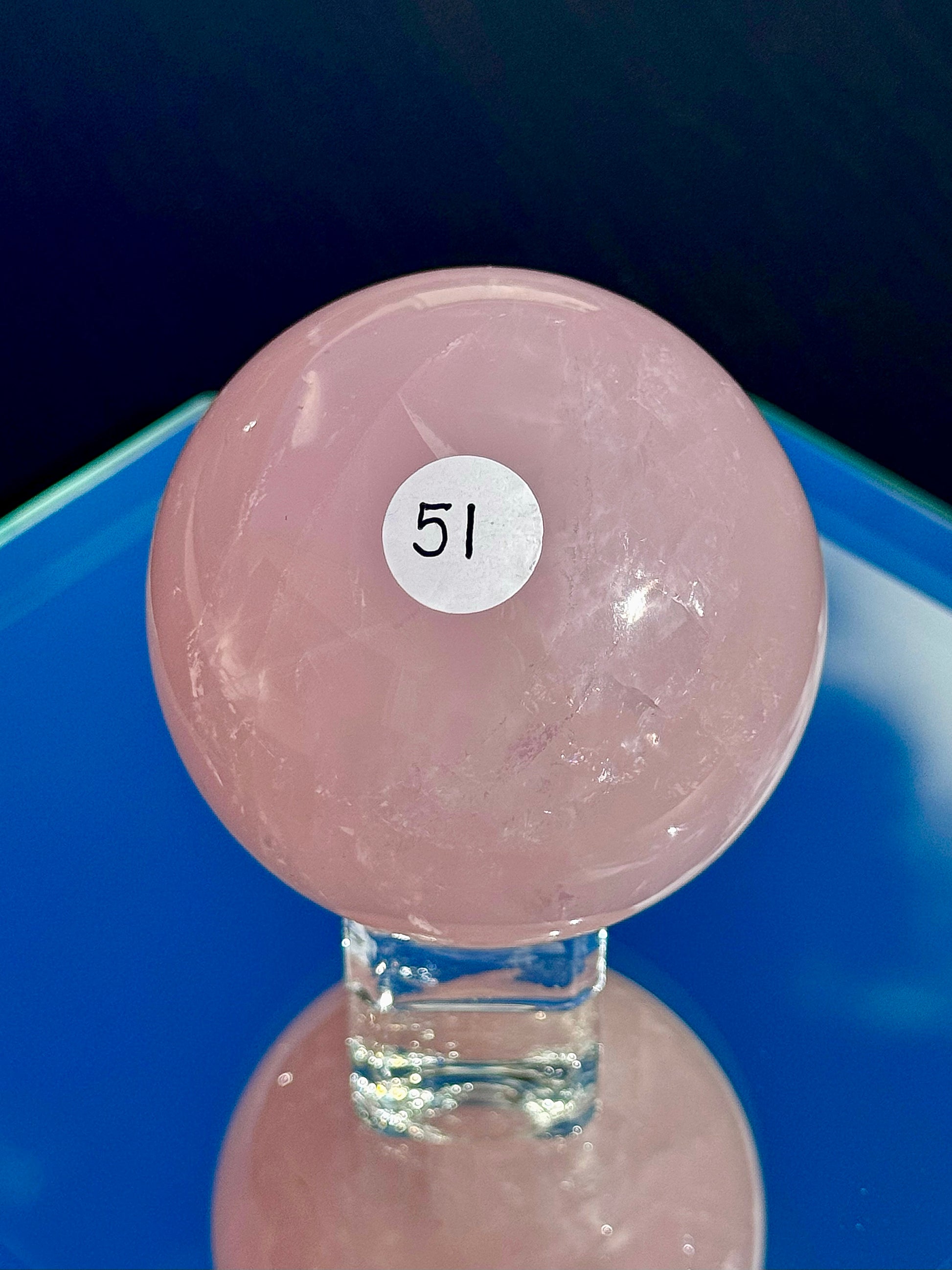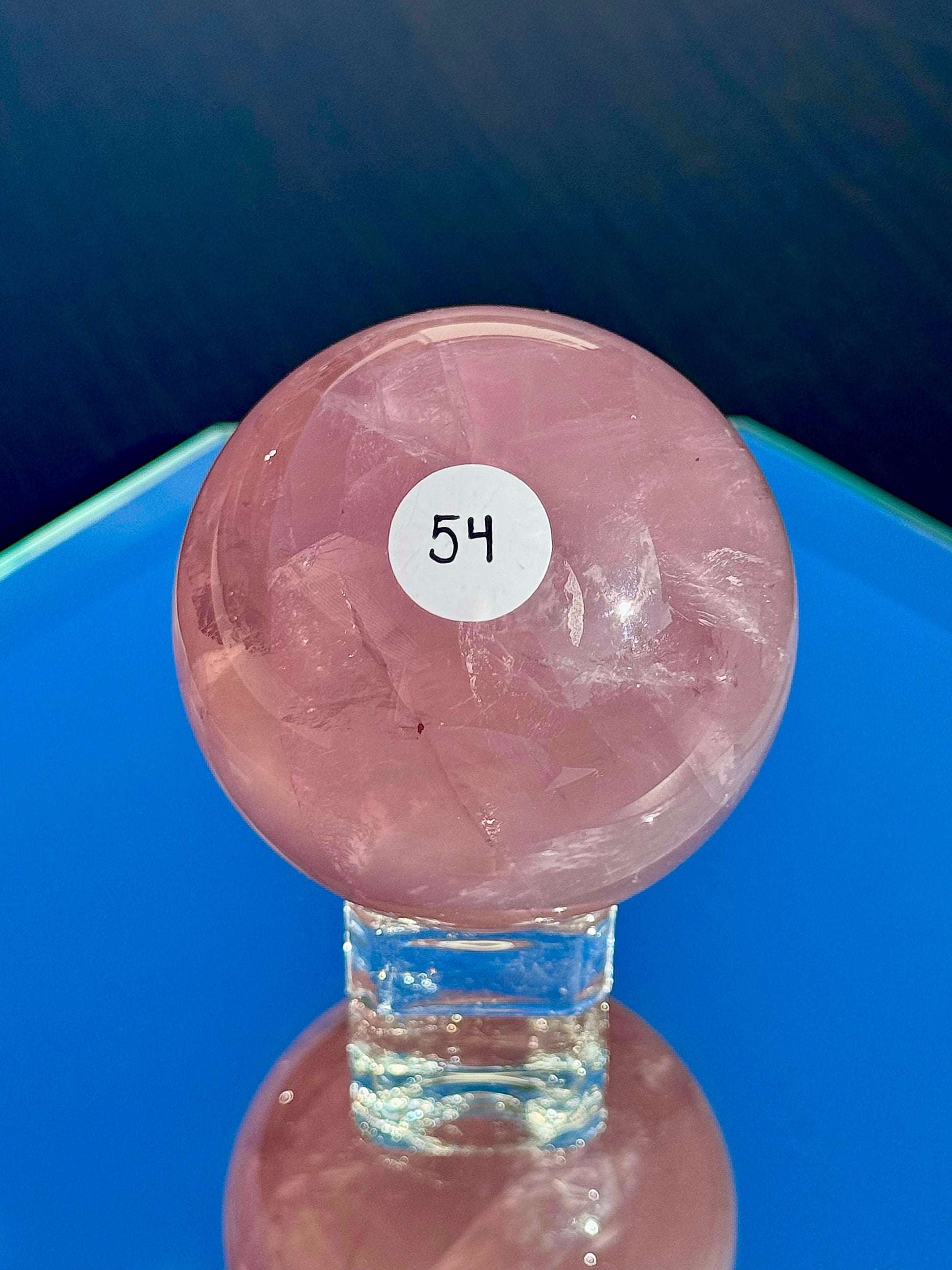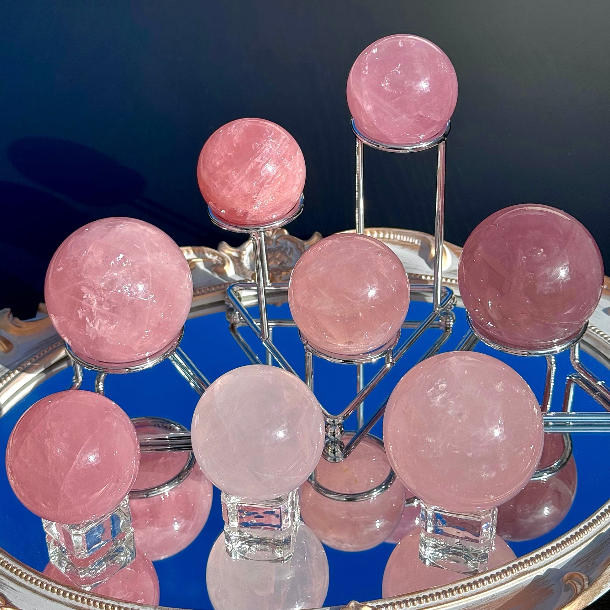 Discover the beauty of these Rose Quartz Spheres! Each one has its own shade of pink that is brought to life with shimmer, star light, and rainbows. Their diameters range from 39mm to 61mm.