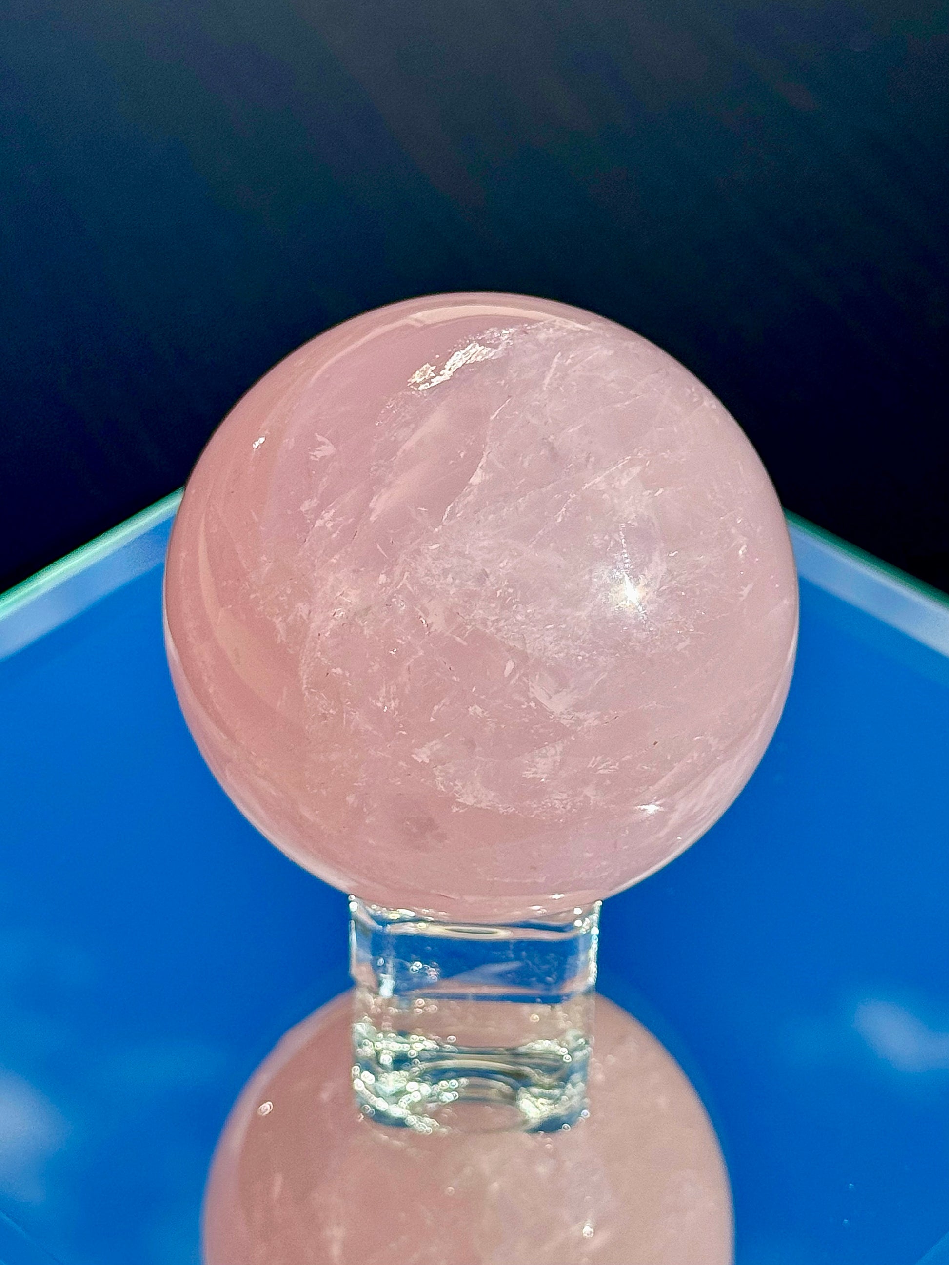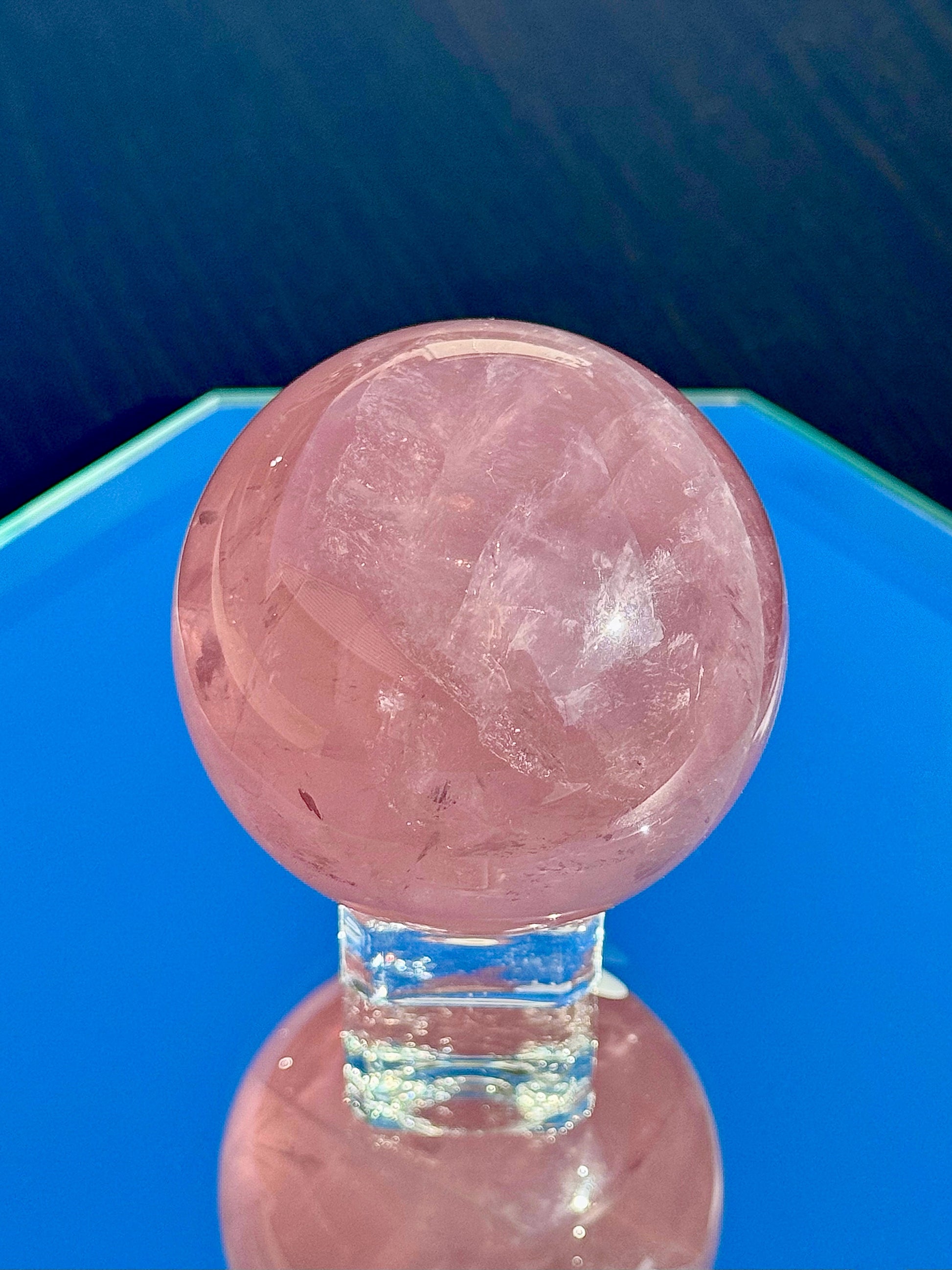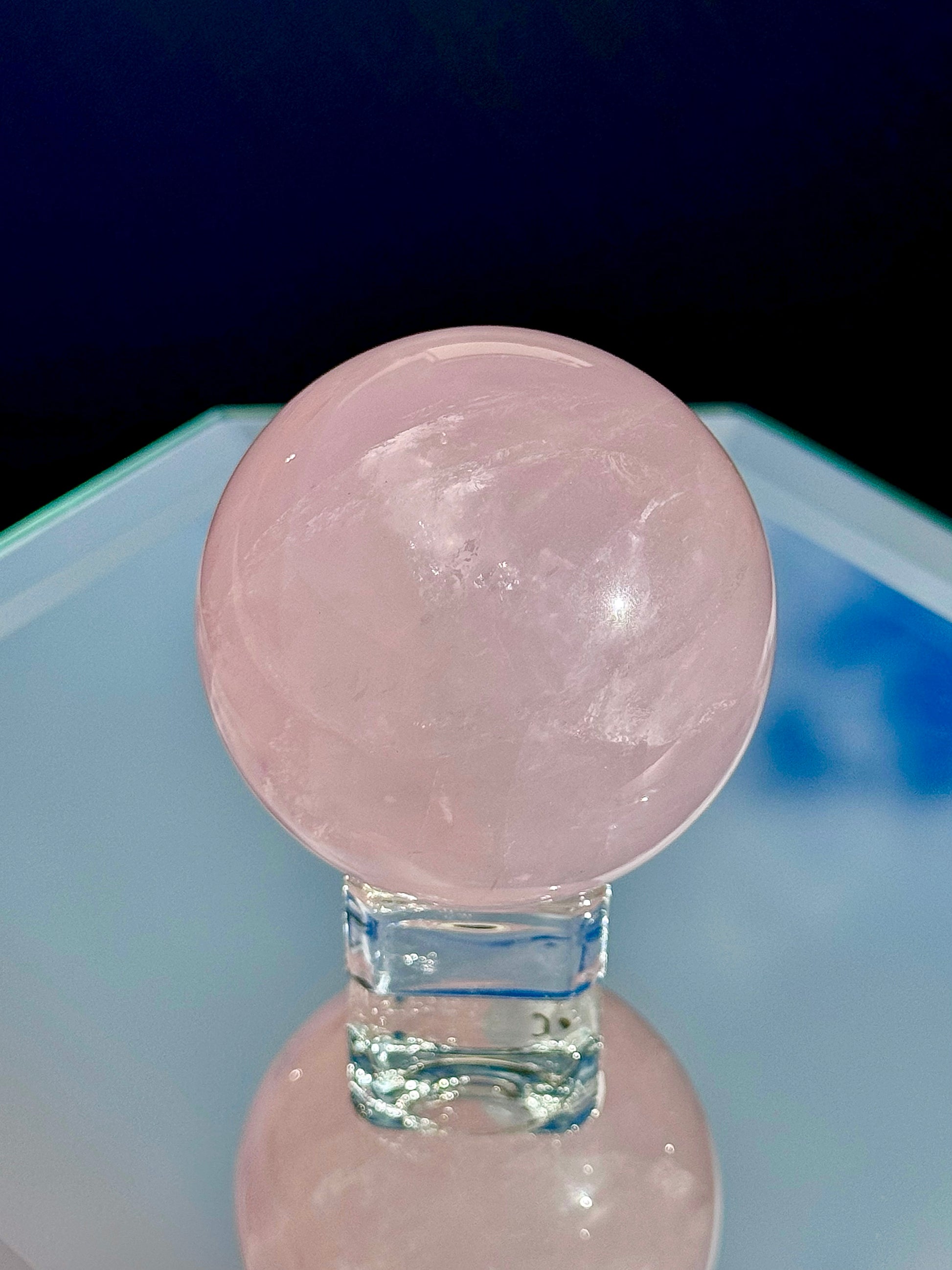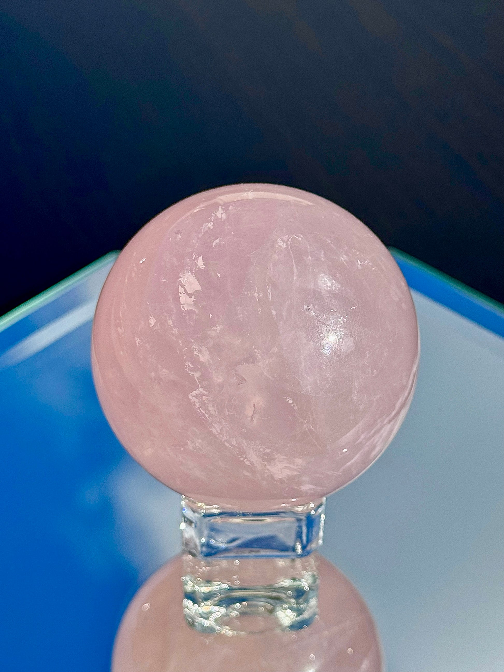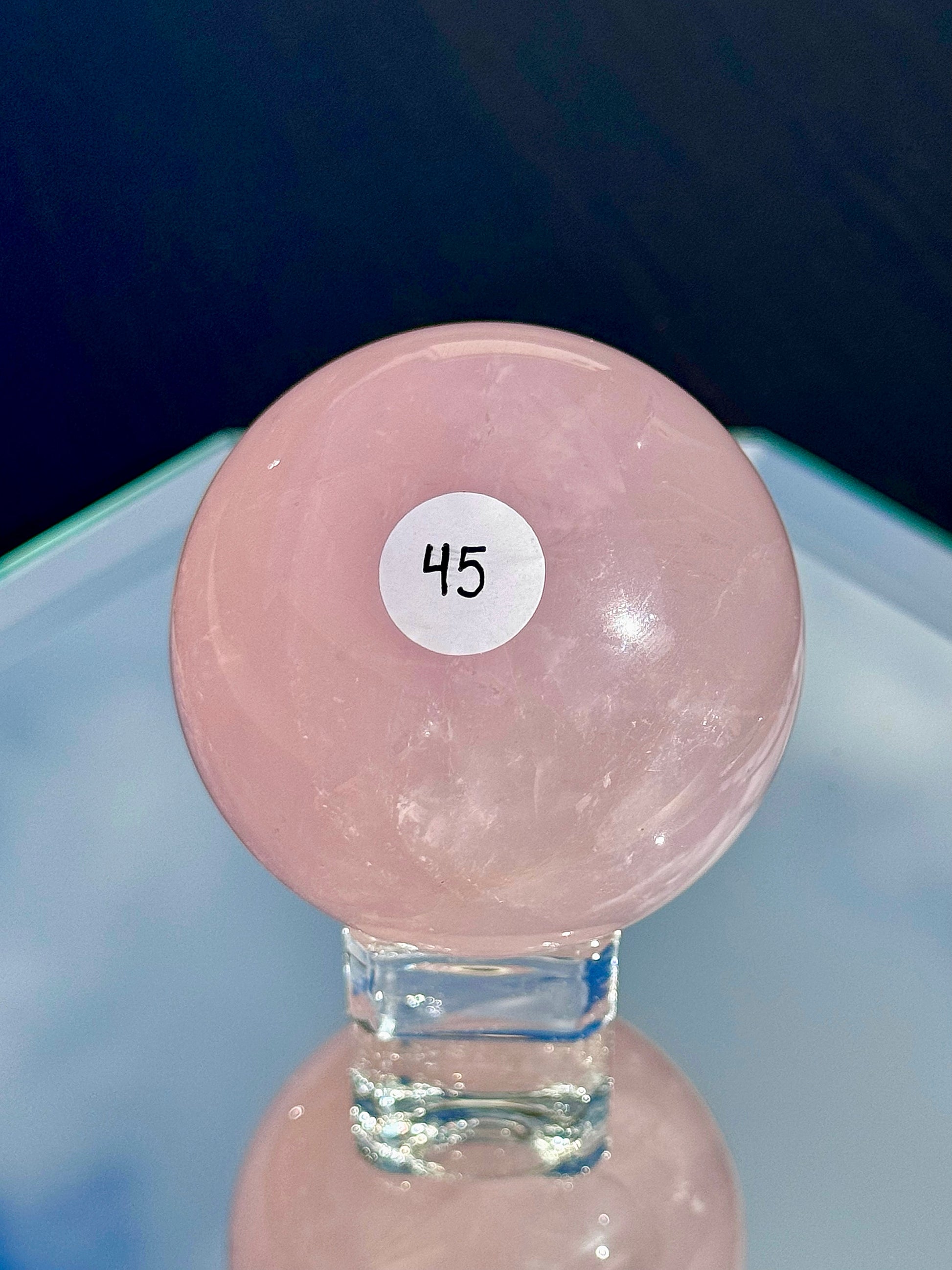 Discover the beauty of these Rose Quartz Spheres! Each one has its own shade of pink that is brought to life with shimmer, star light, and rainbows. Their diameters range from 39mm to 61mm.