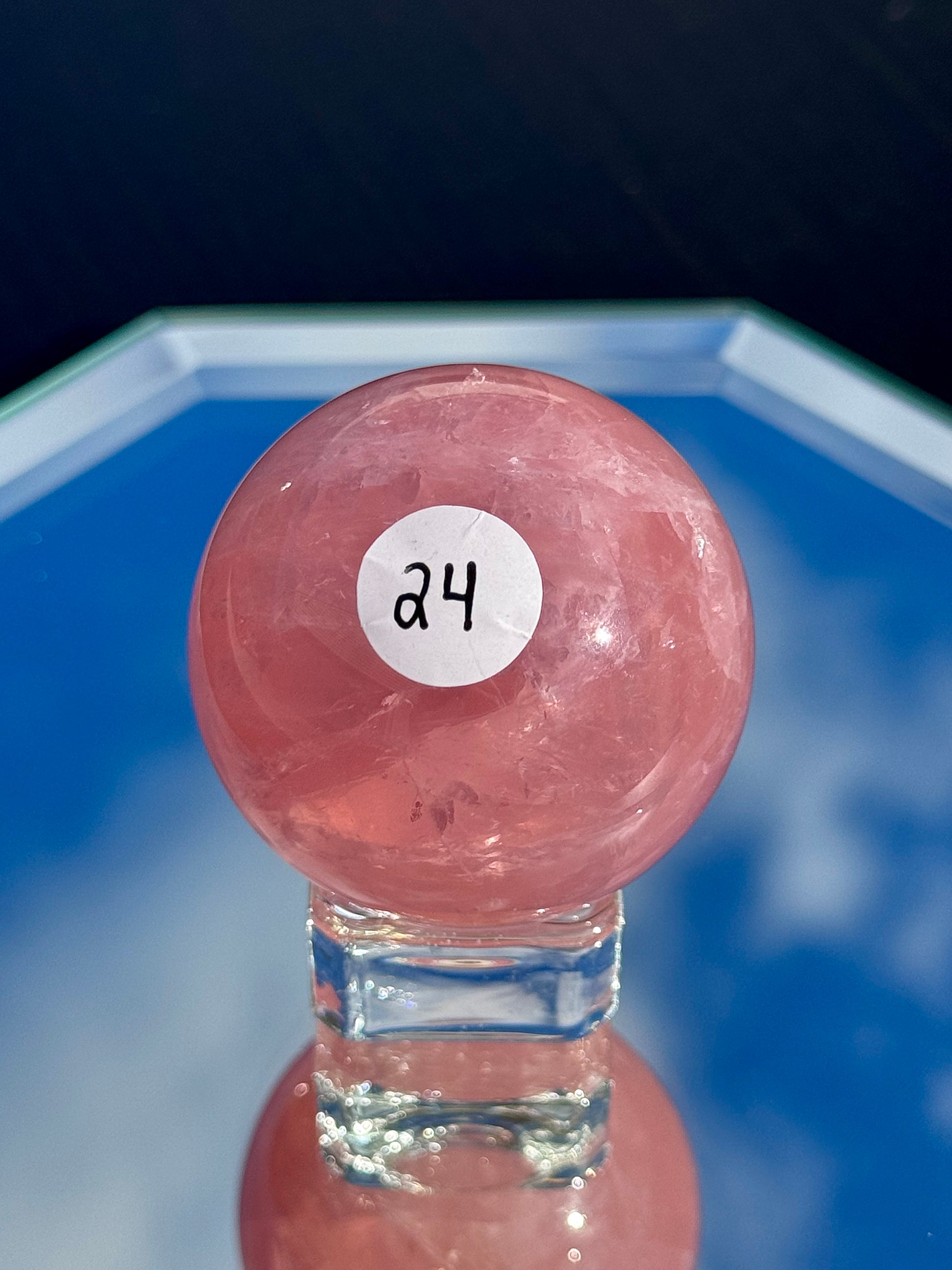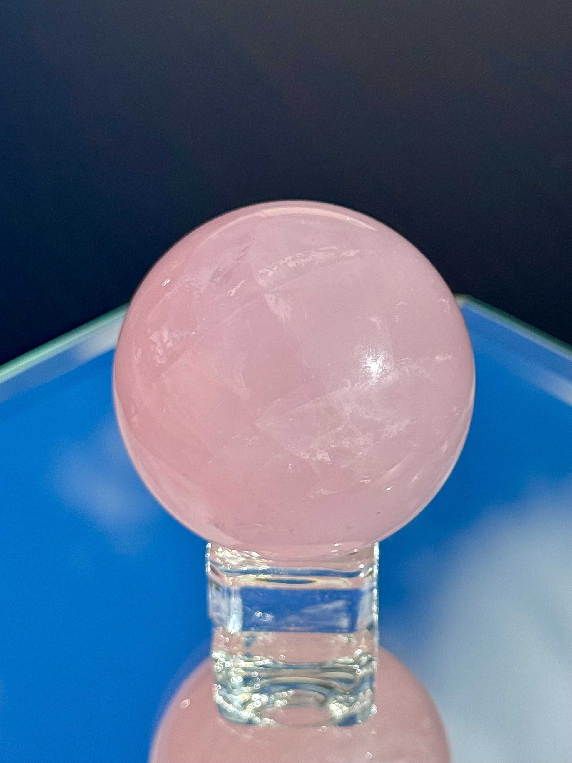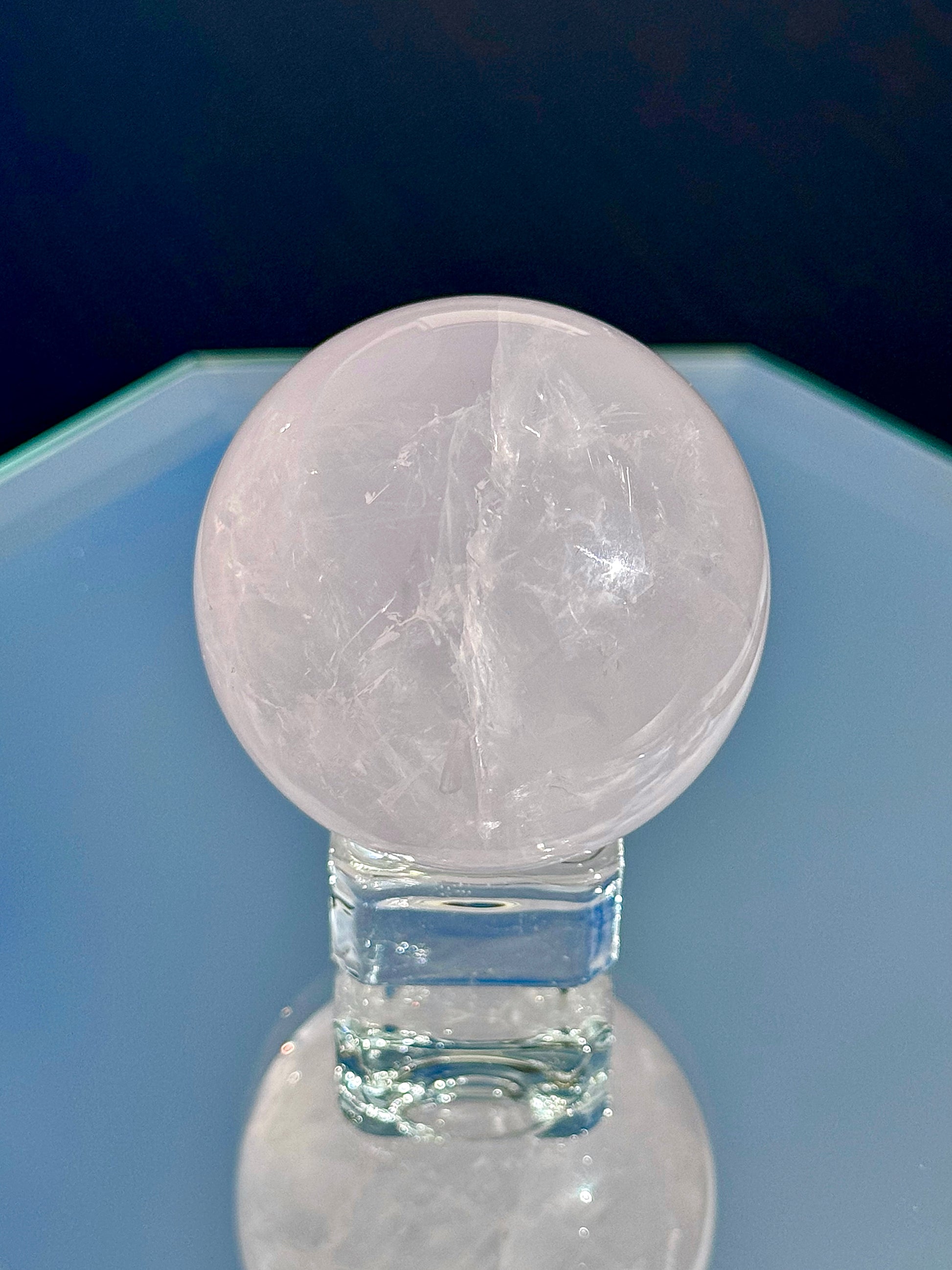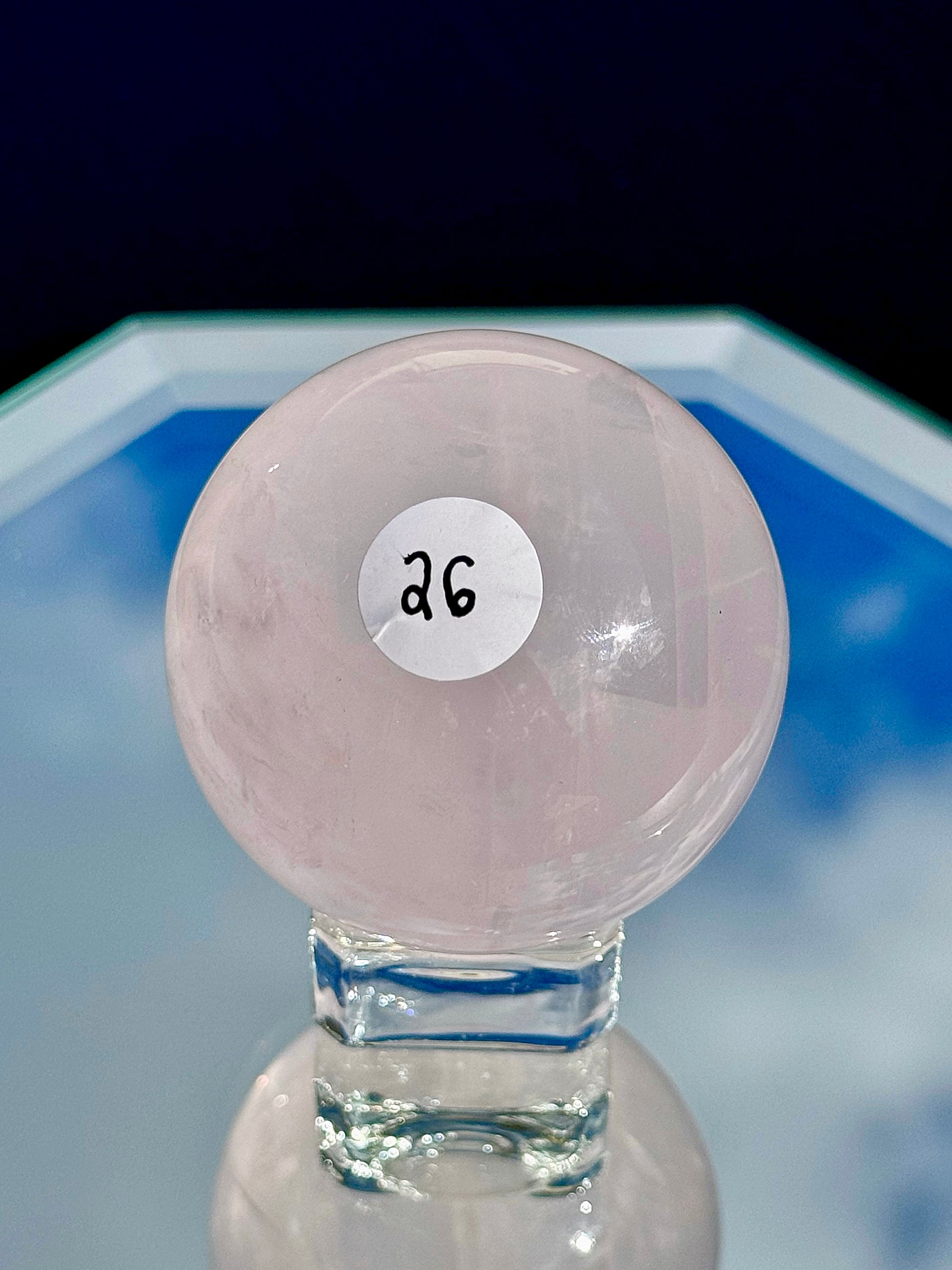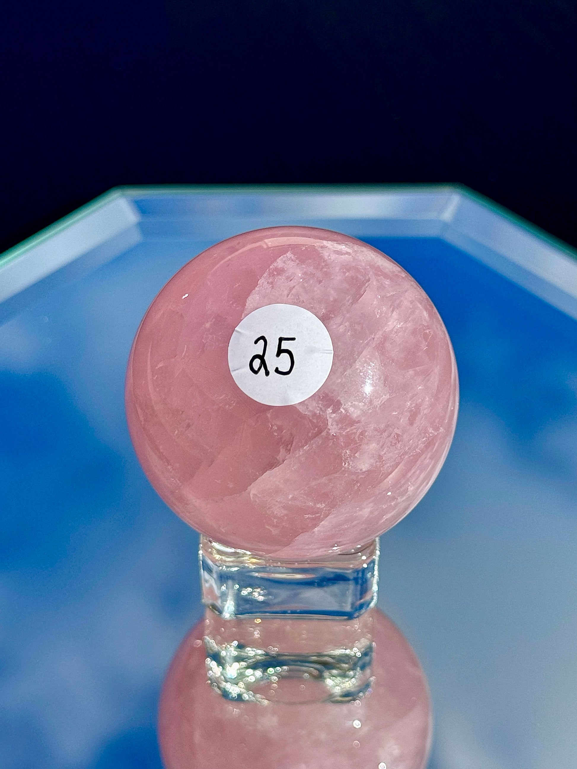Discover the beauty of these Rose Quartz Spheres! Each one has its own shade of pink that is brought to life with shimmer, star light, and rainbows. Their diameters range from 39mm to 61mm.