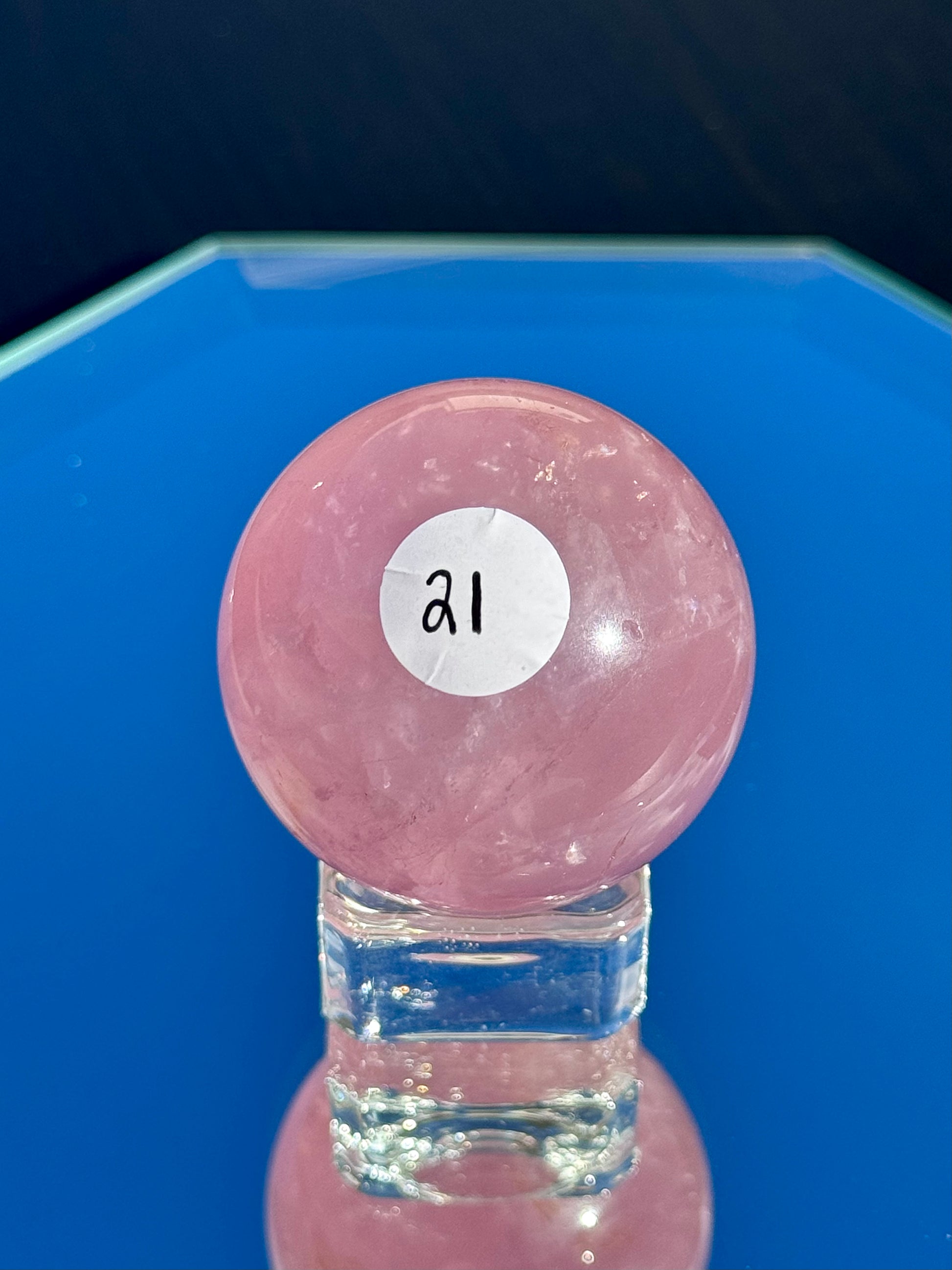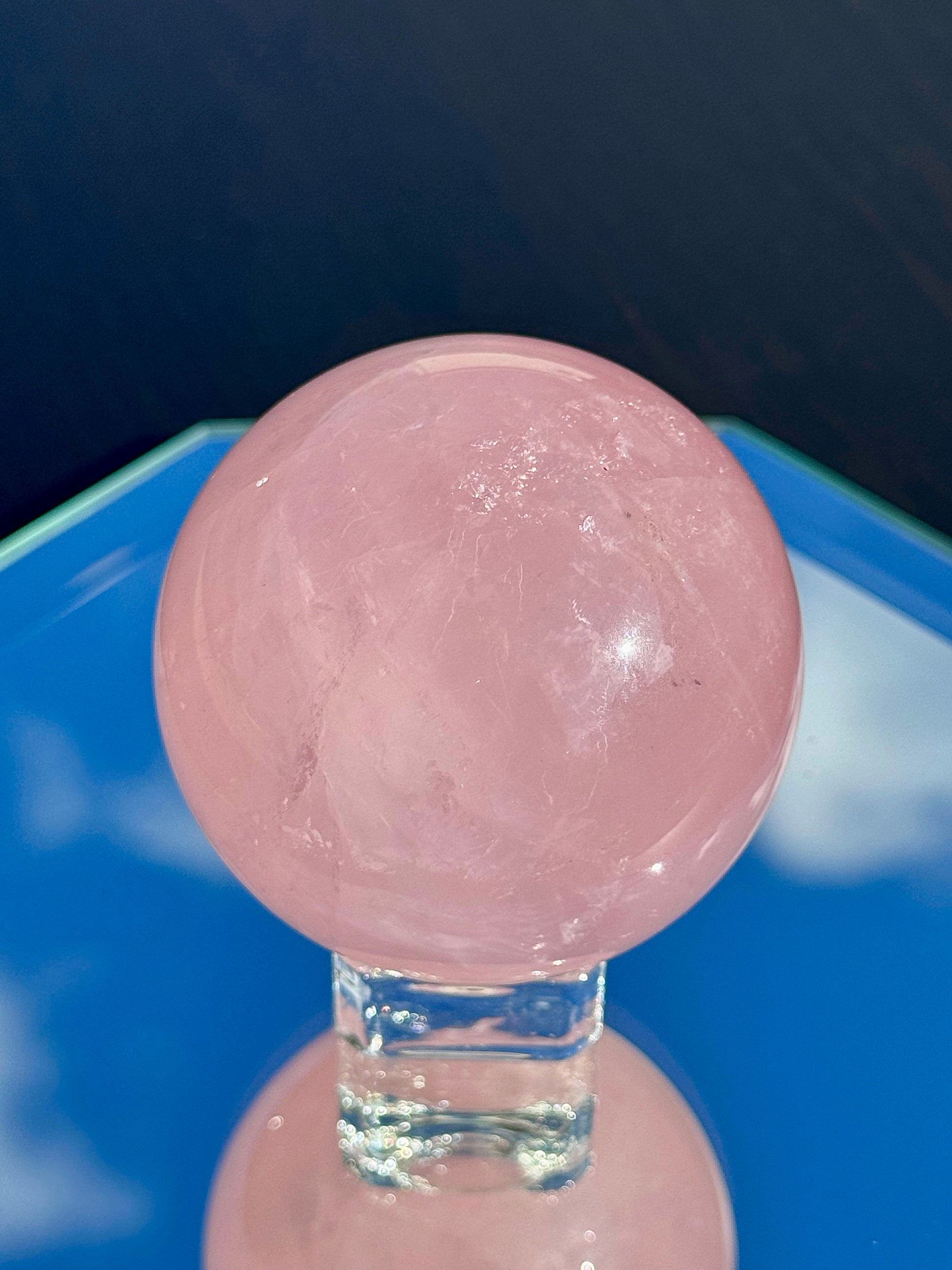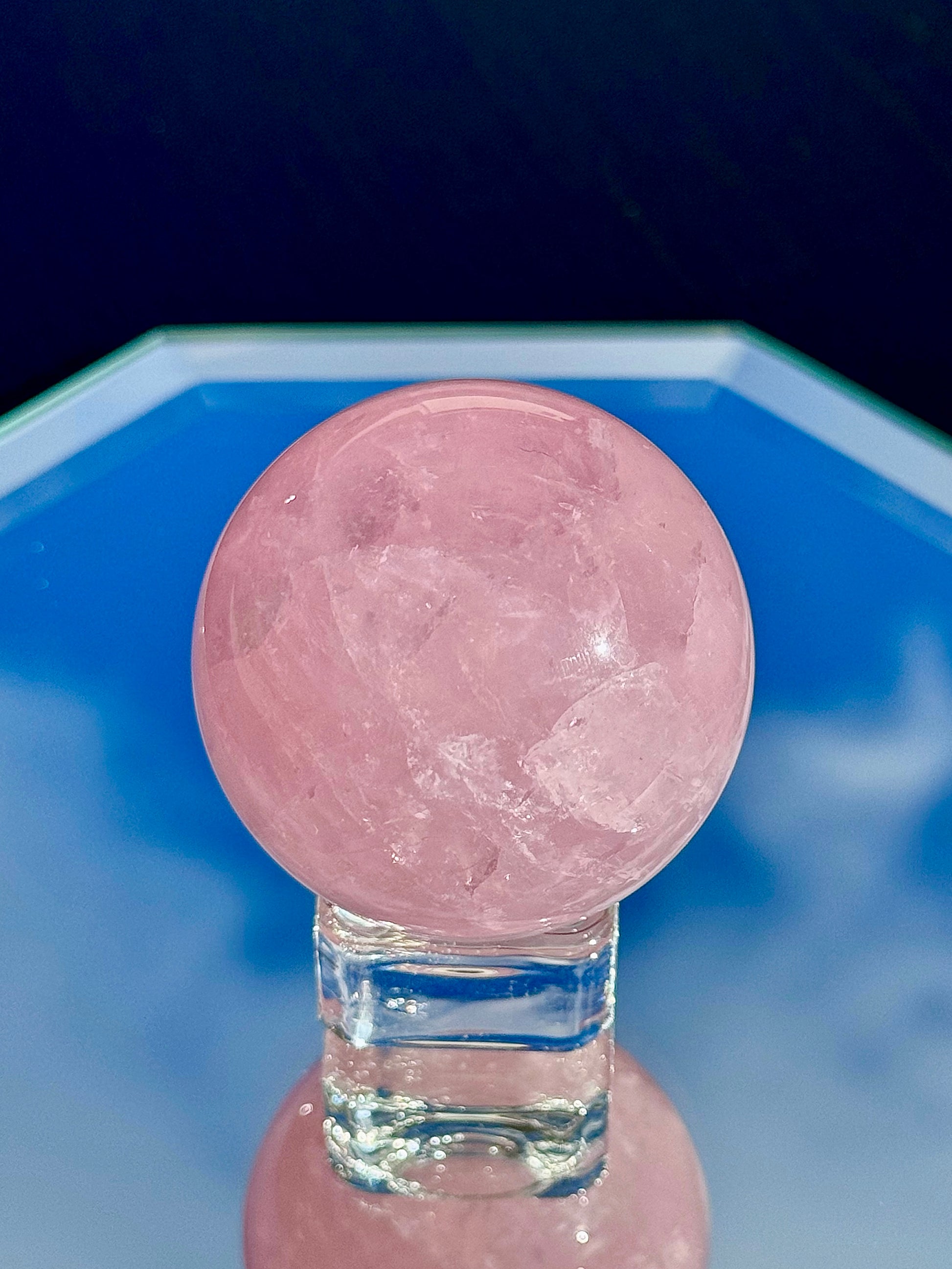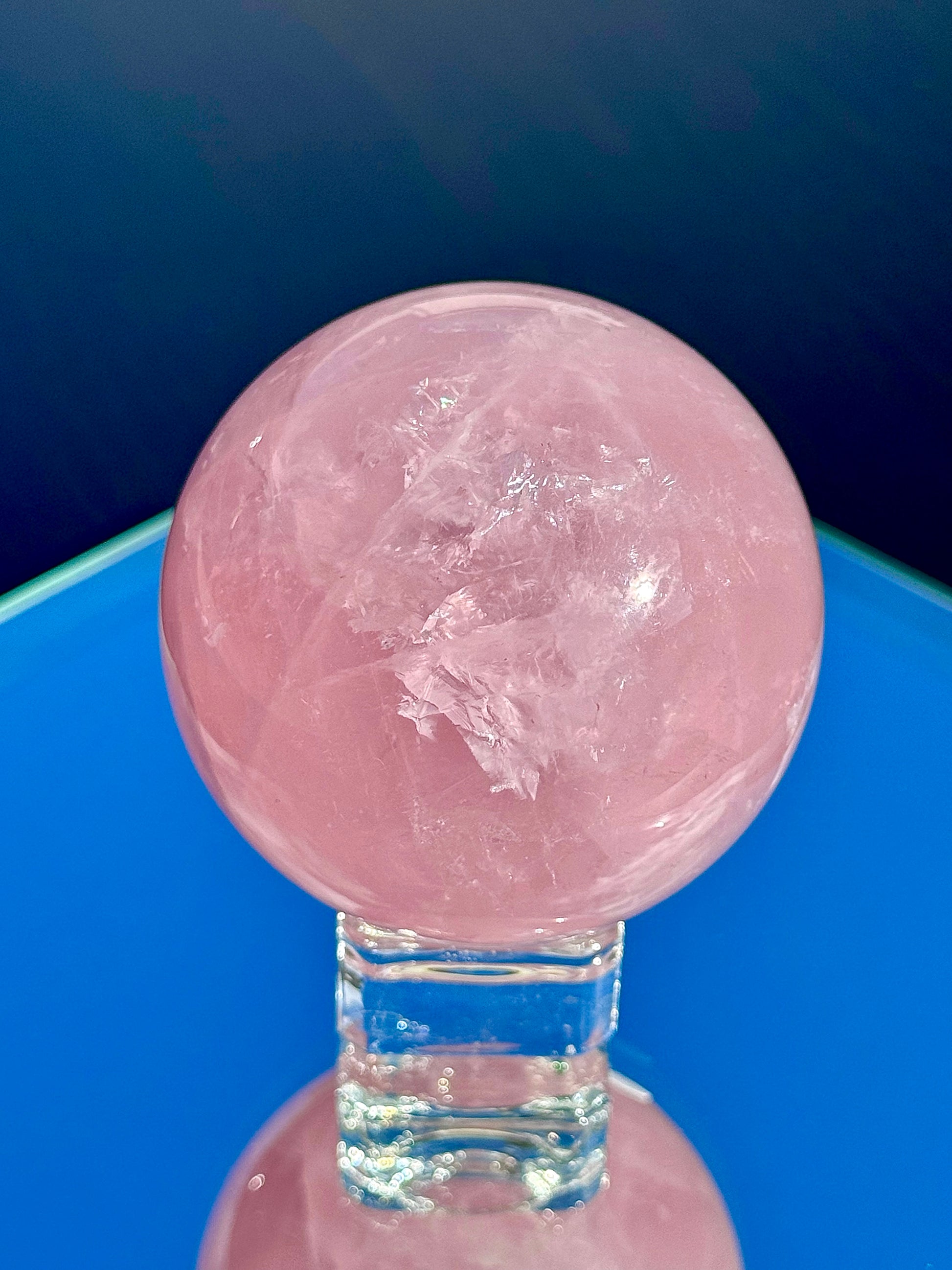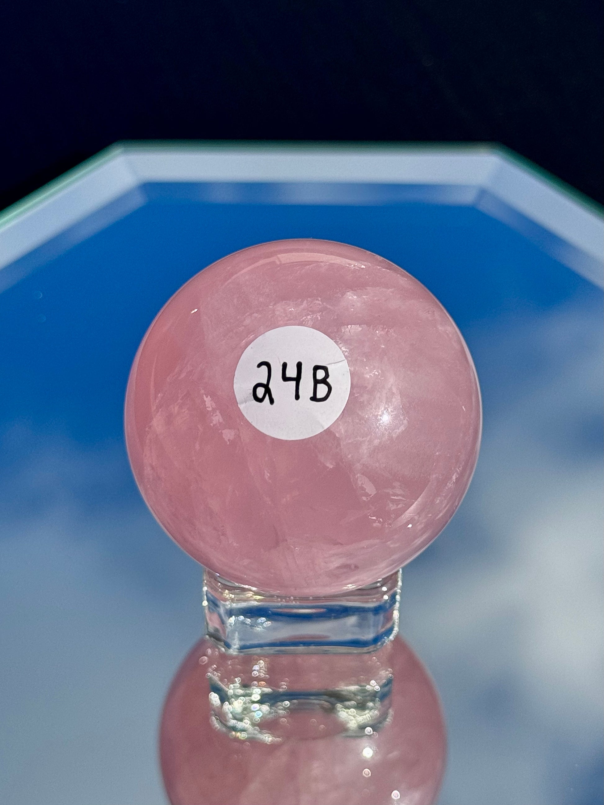 Discover the beauty of these Rose Quartz Spheres! Each one has its own shade of pink that is brought to life with shimmer, star light, and rainbows. Their diameters range from 39mm to 61mm.