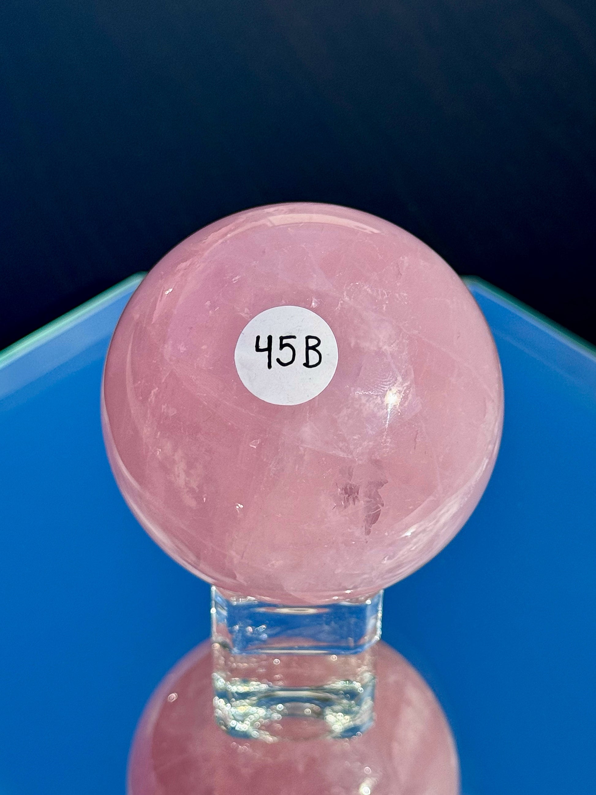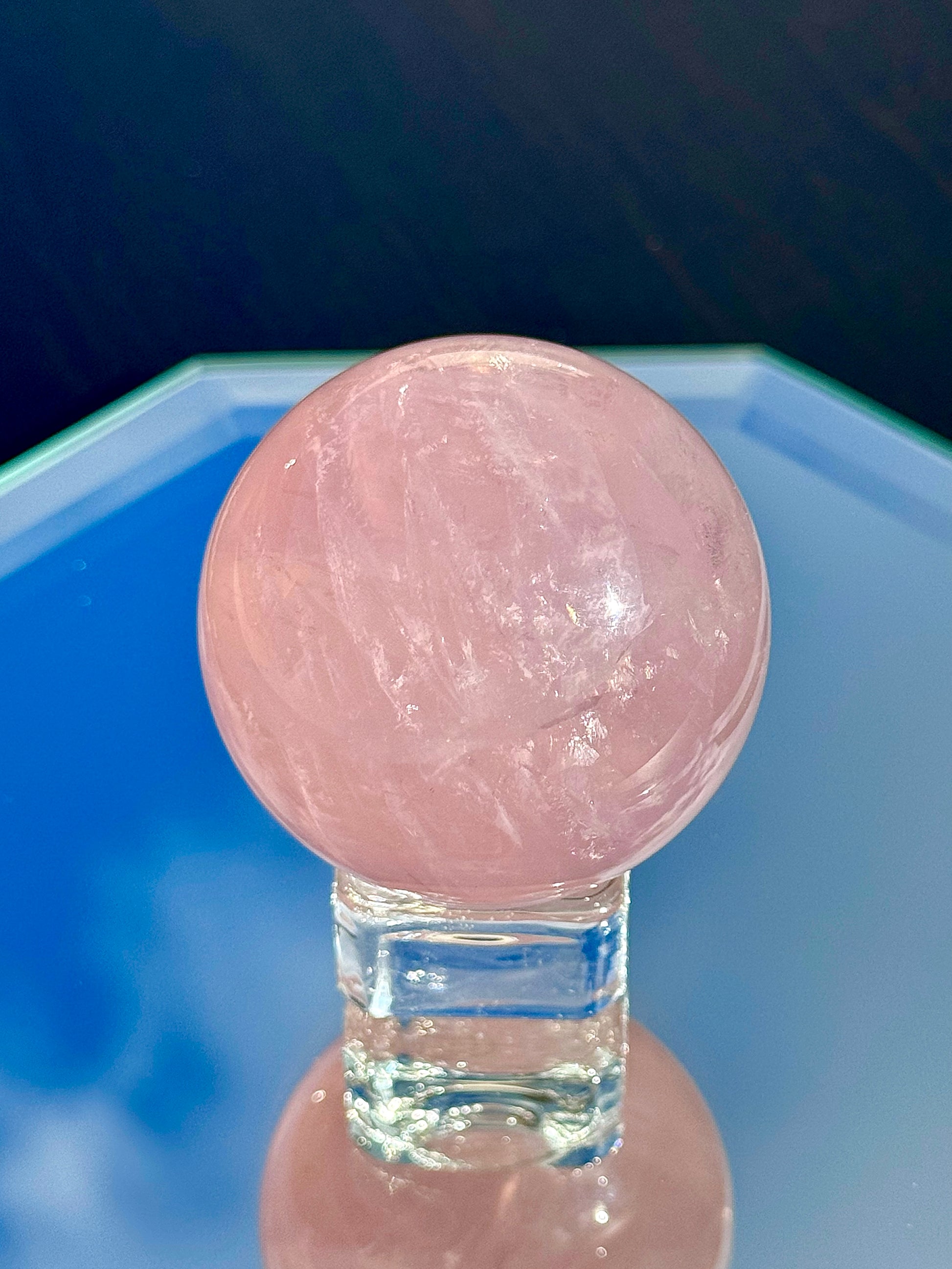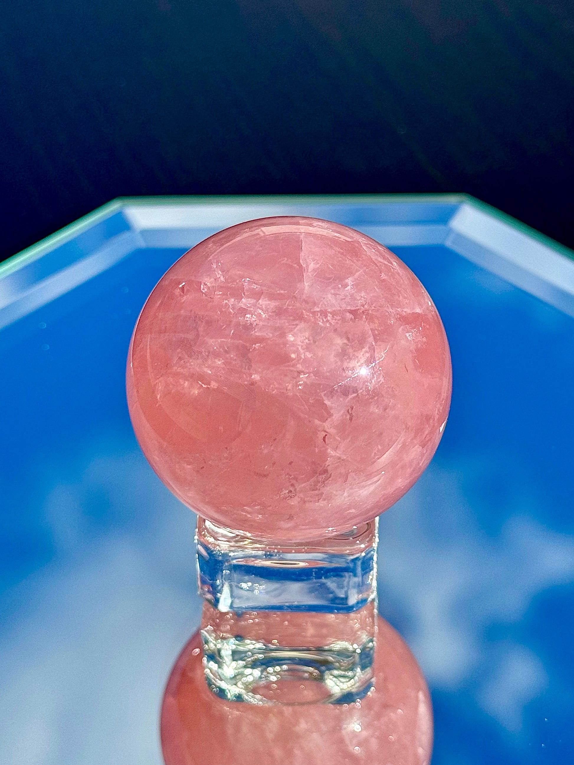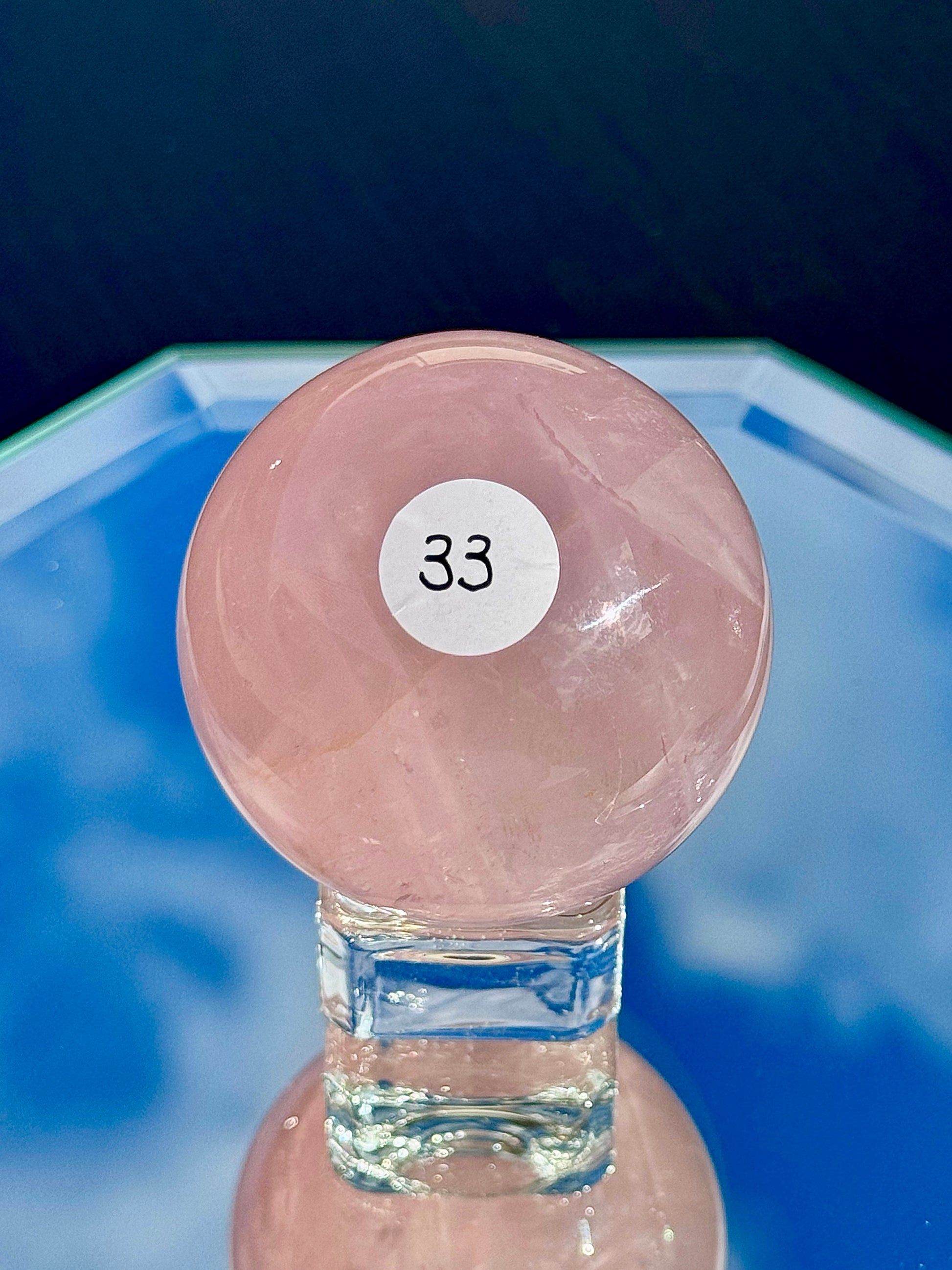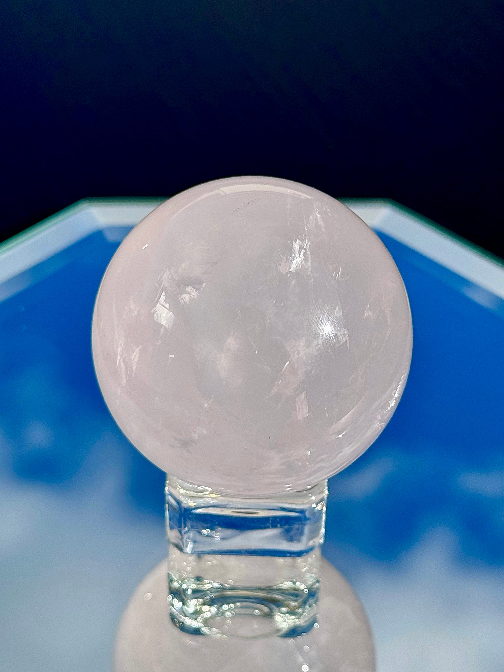 Discover the beauty of these Rose Quartz Spheres! Each one has its own shade of pink that is brought to life with shimmer, star light, and rainbows. Their diameters range from 39mm to 61mm.