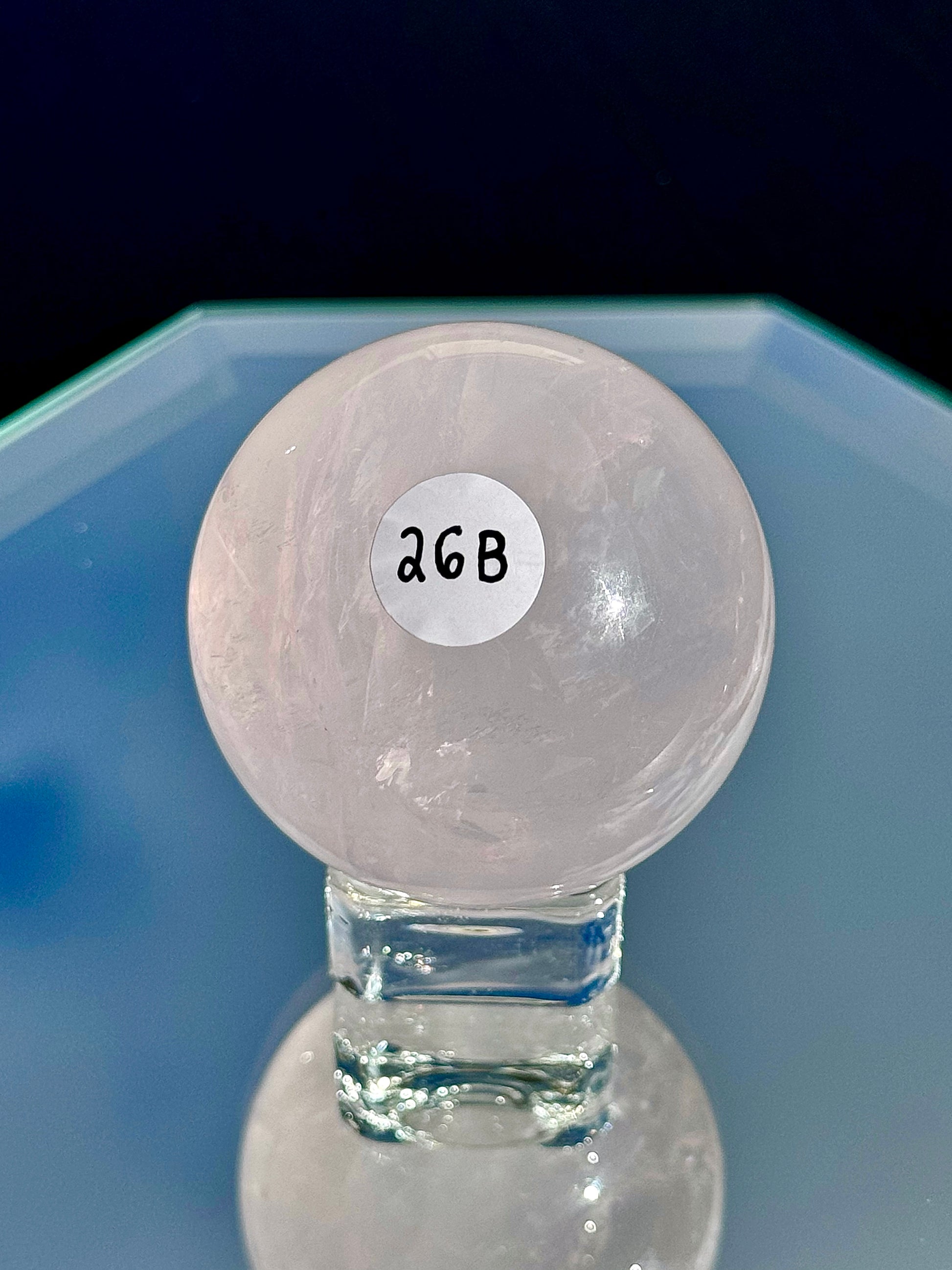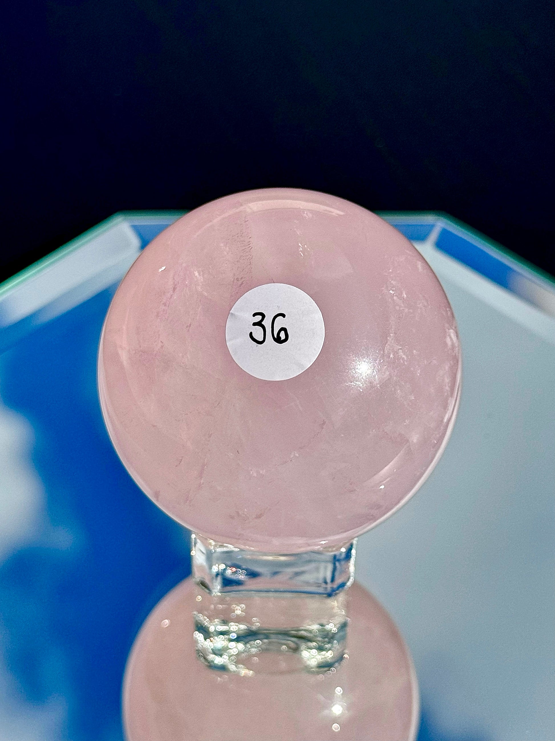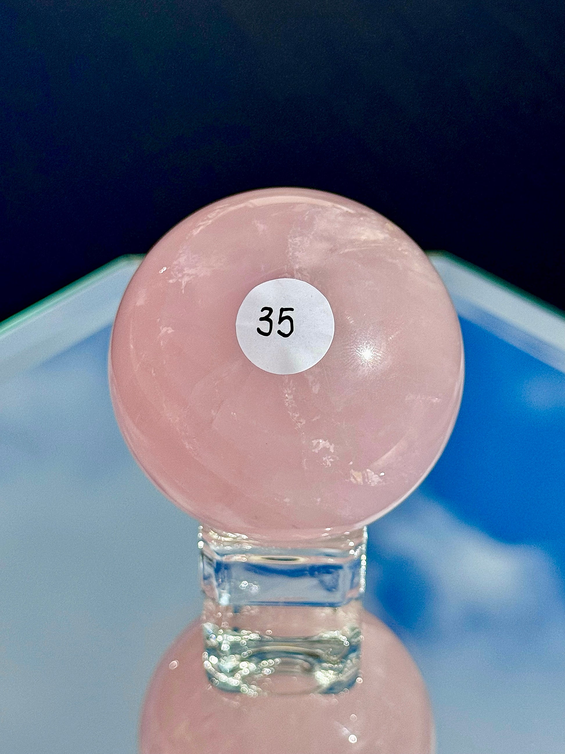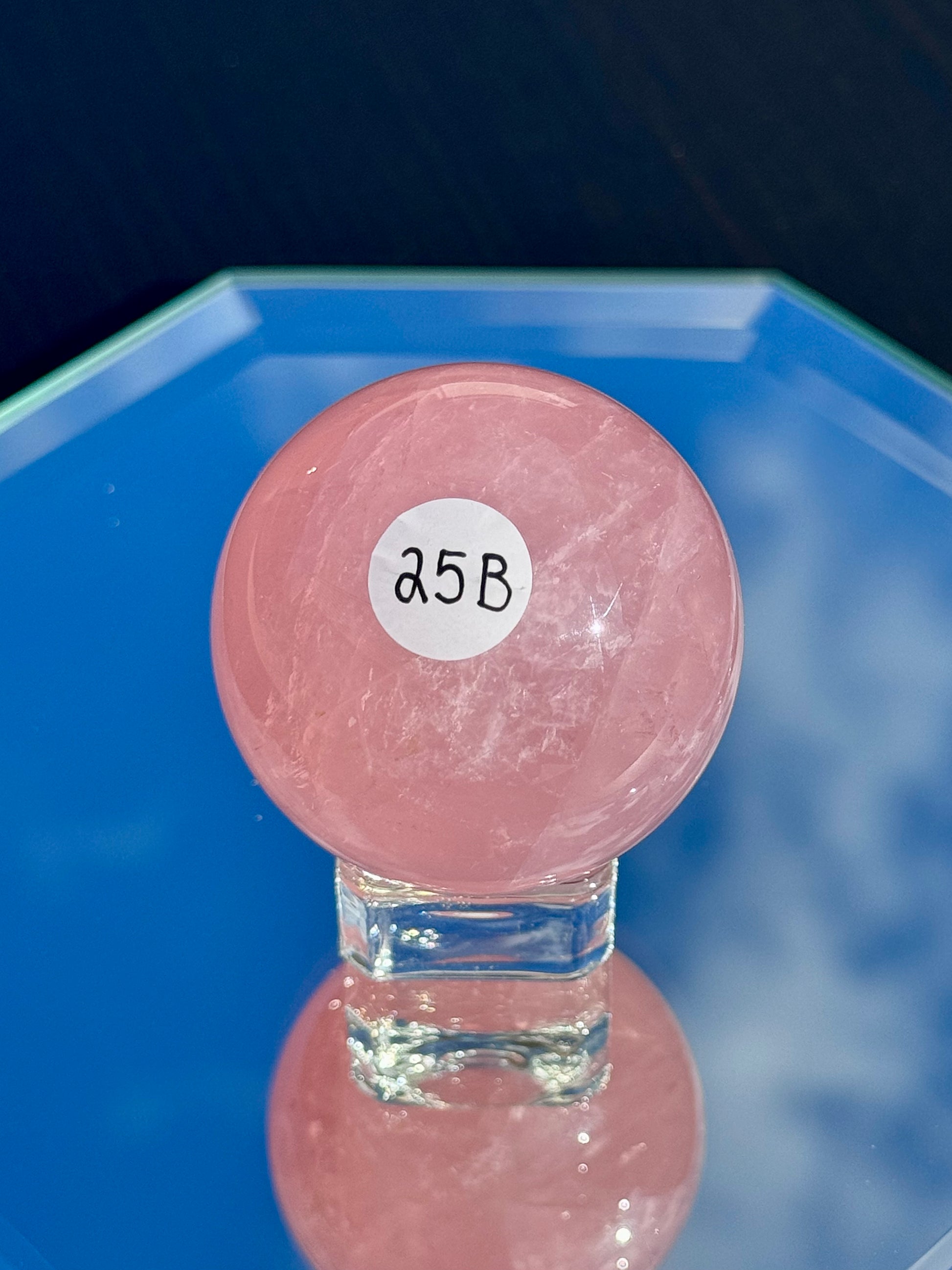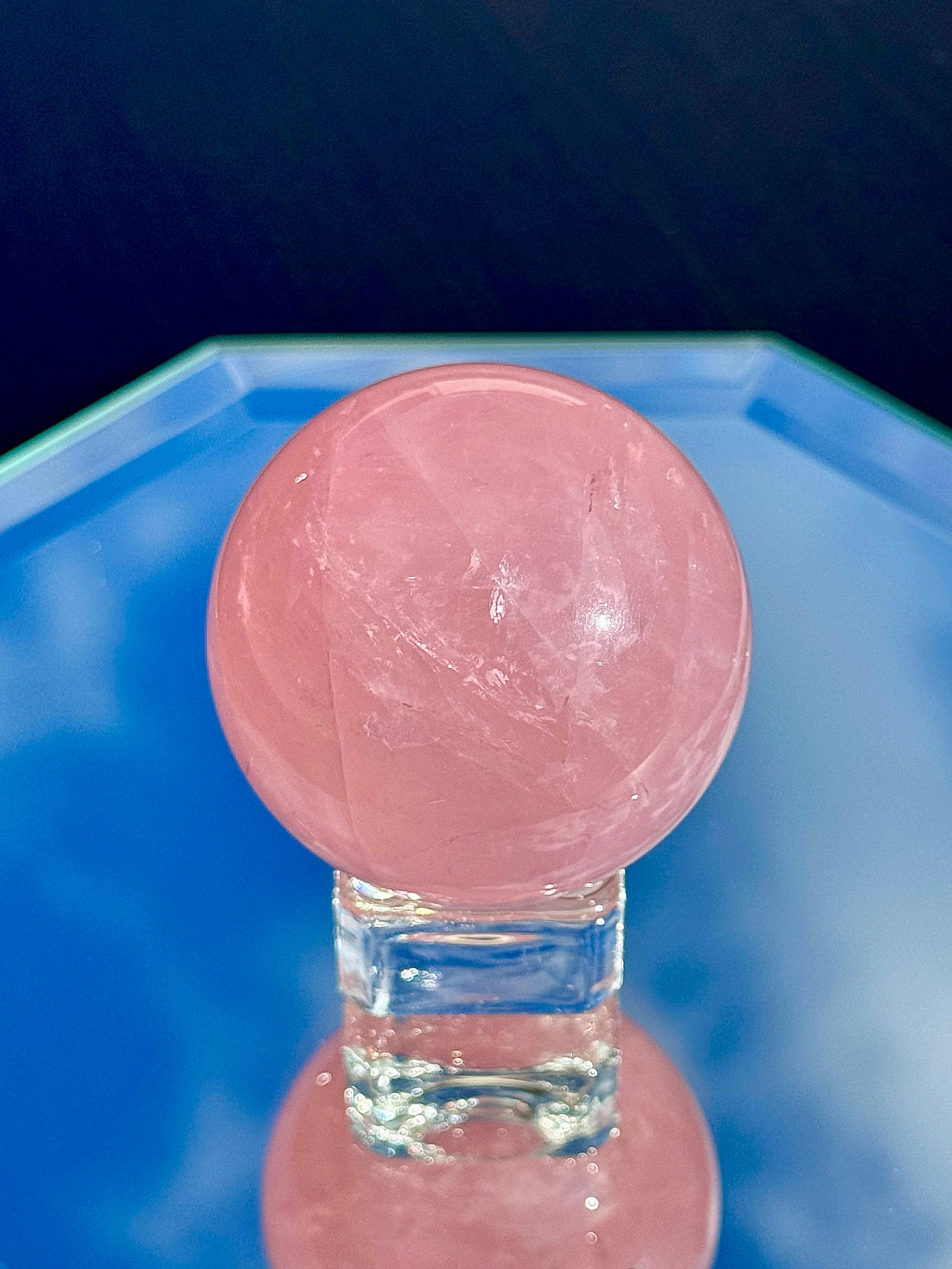 Discover the beauty of these Rose Quartz Spheres! Each one has its own shade of pink that is brought to life with shimmer, star light, and rainbows. Their diameters range from 39mm to 61mm.