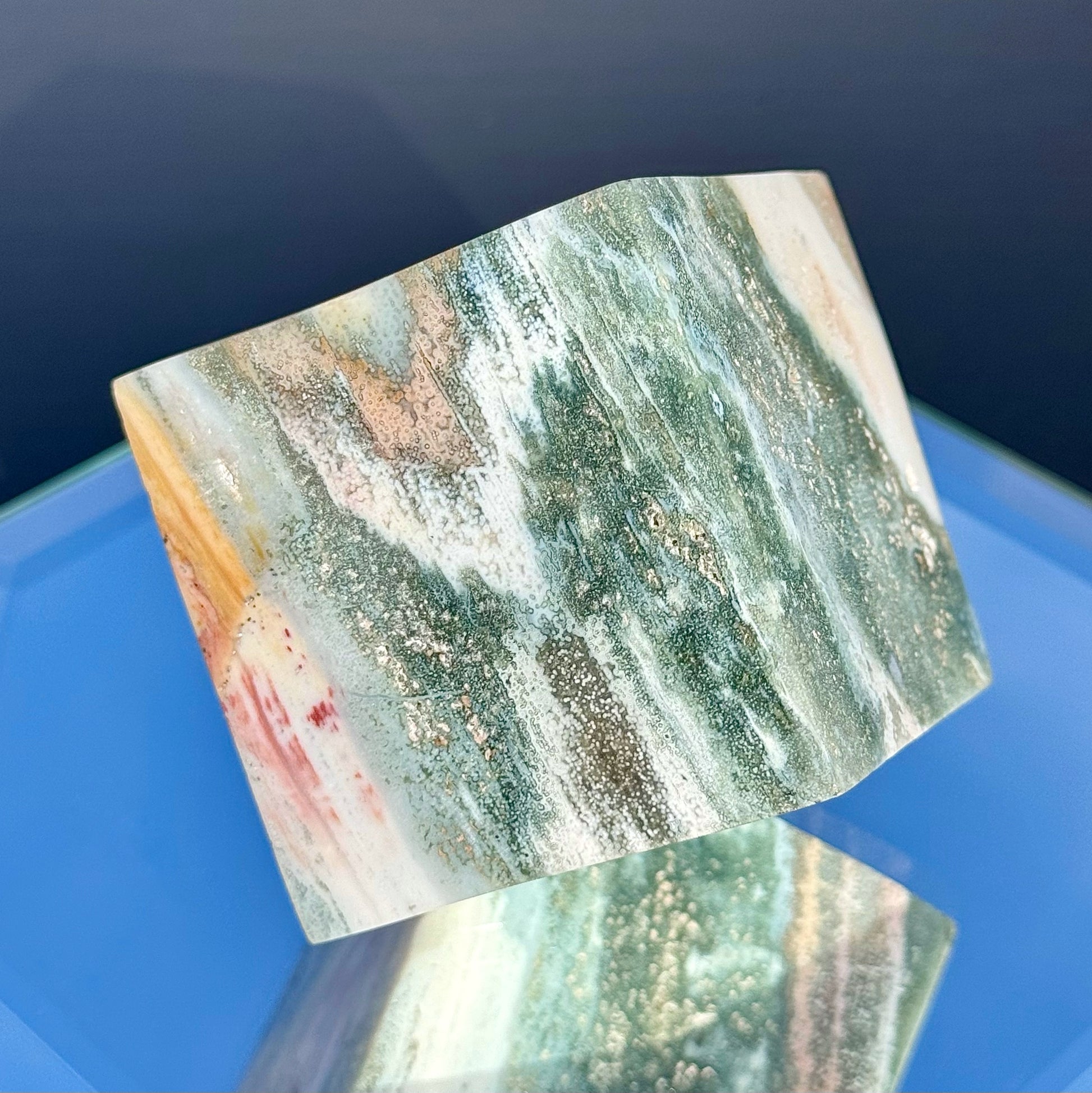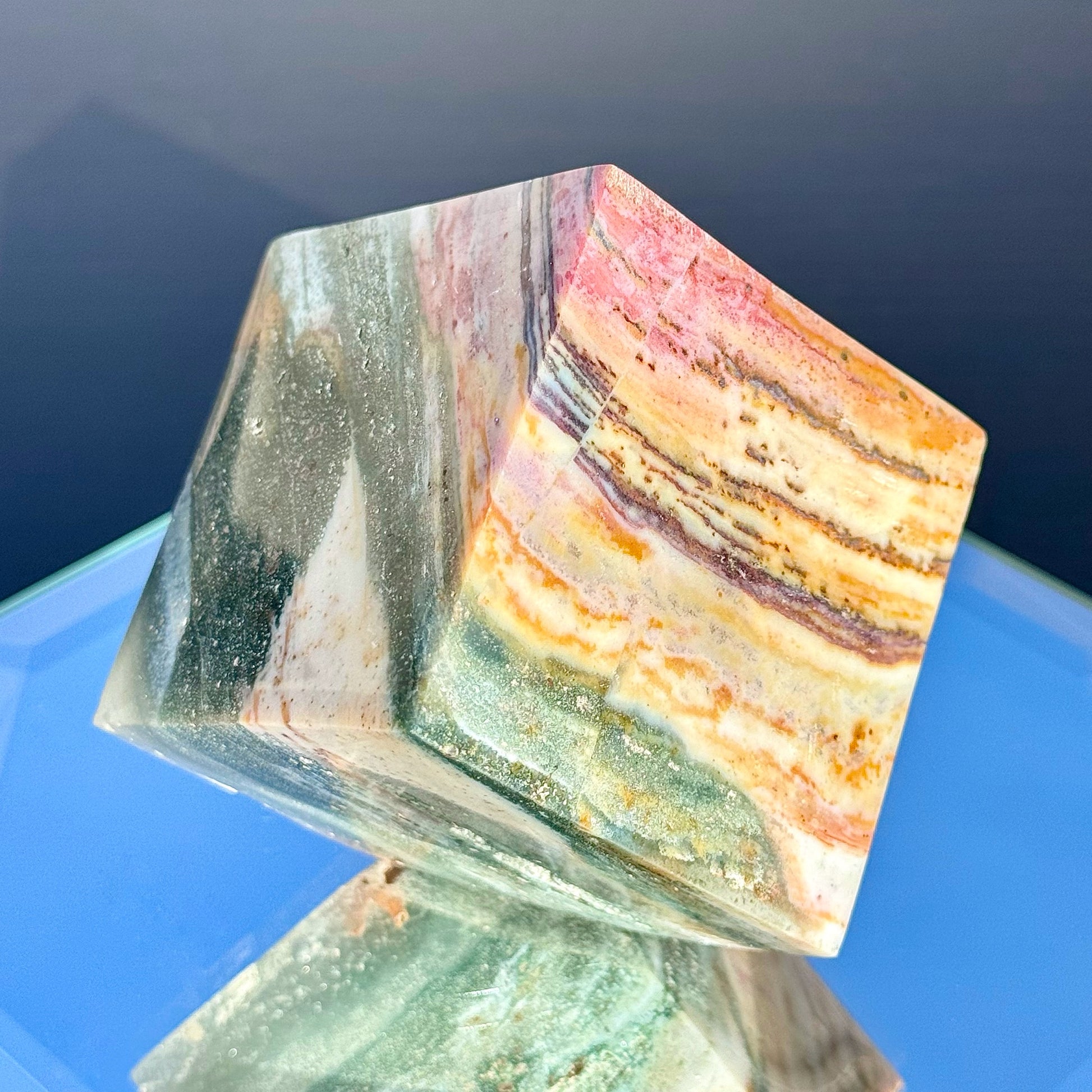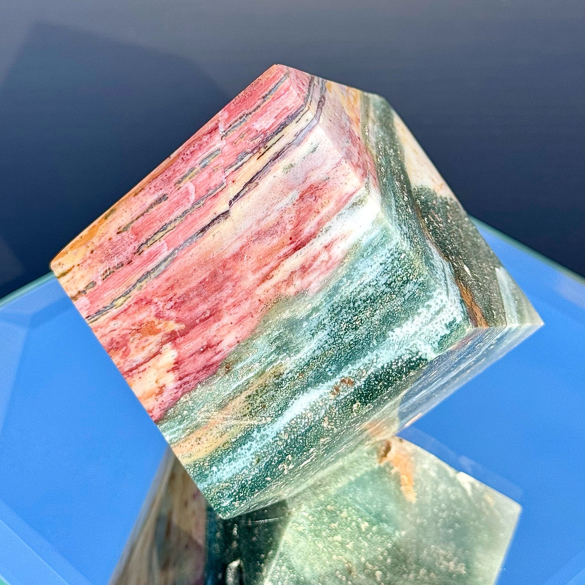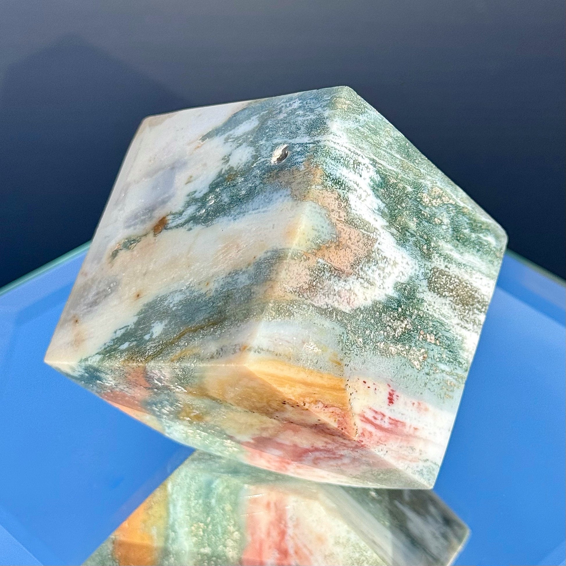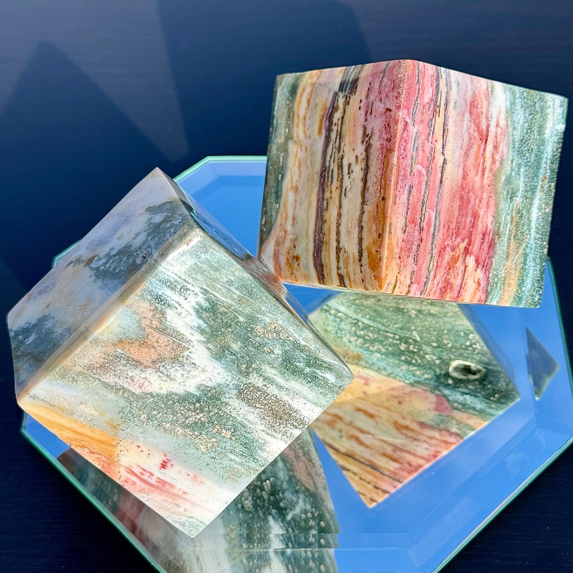 These Sea Jasper cubes are perfect for collecting or decorating. Their large size and unique colors make them a great statement piece. Plus, they stand perfectly for ease of display.