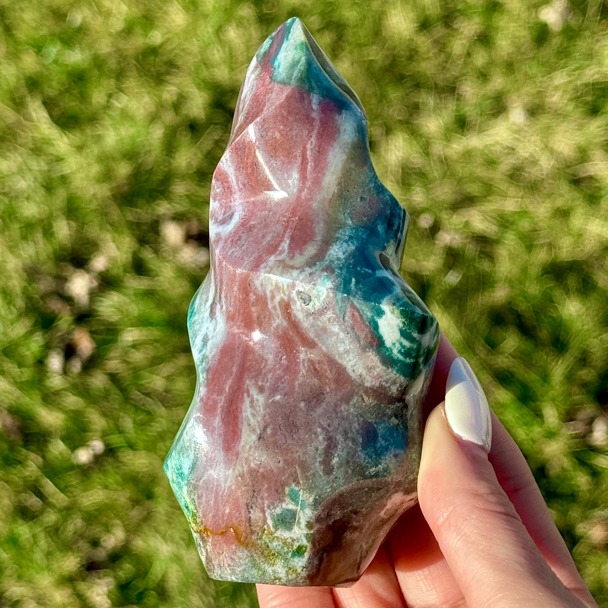 Get ready to add a splash of color to your collection with this Sea Jasper Flame! This 4 1/2" tall piece showcases shades of red, green, and blue.