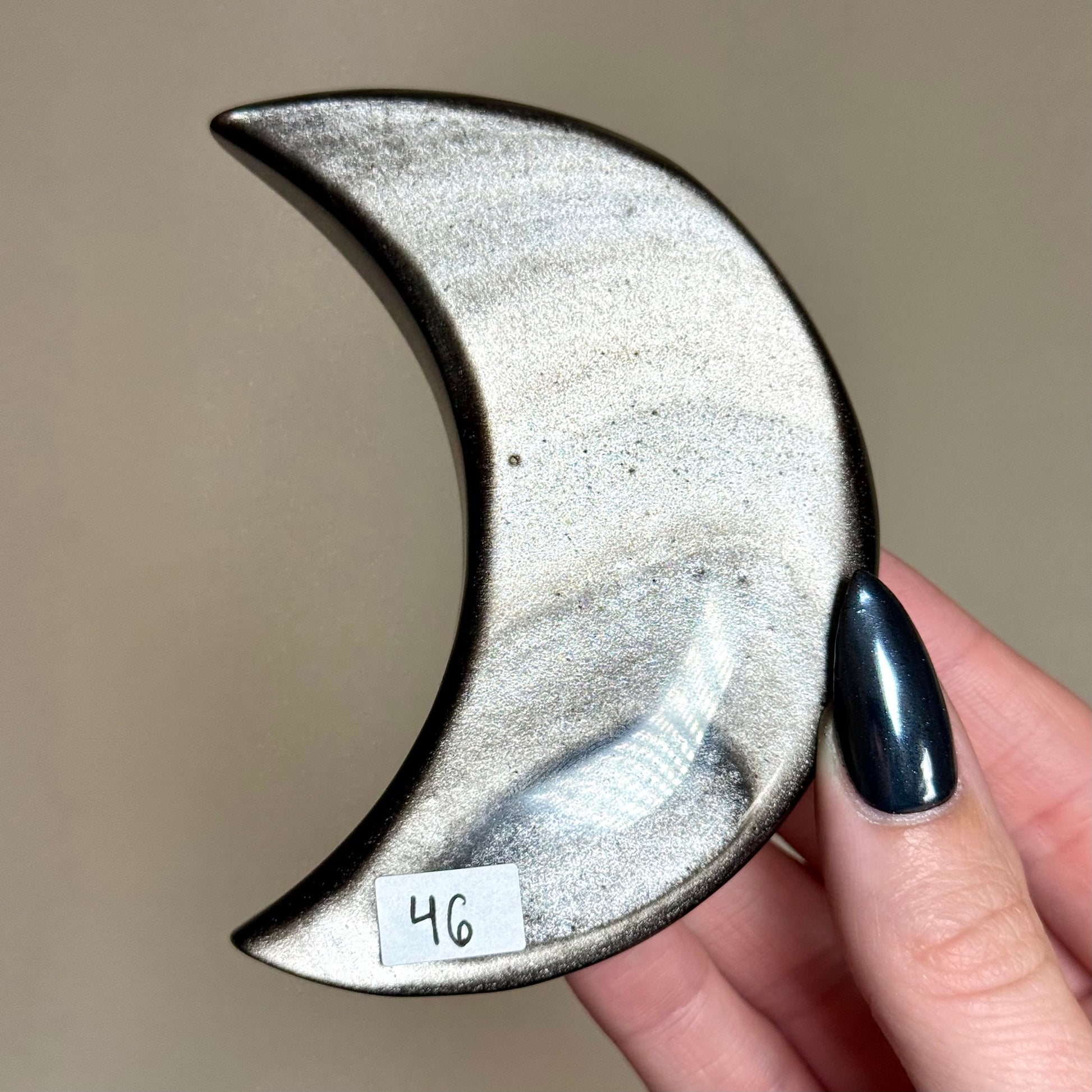 These Silver Obsidian Moon Carvings are about 3 1/2” tall and have strong full flash on both sides!