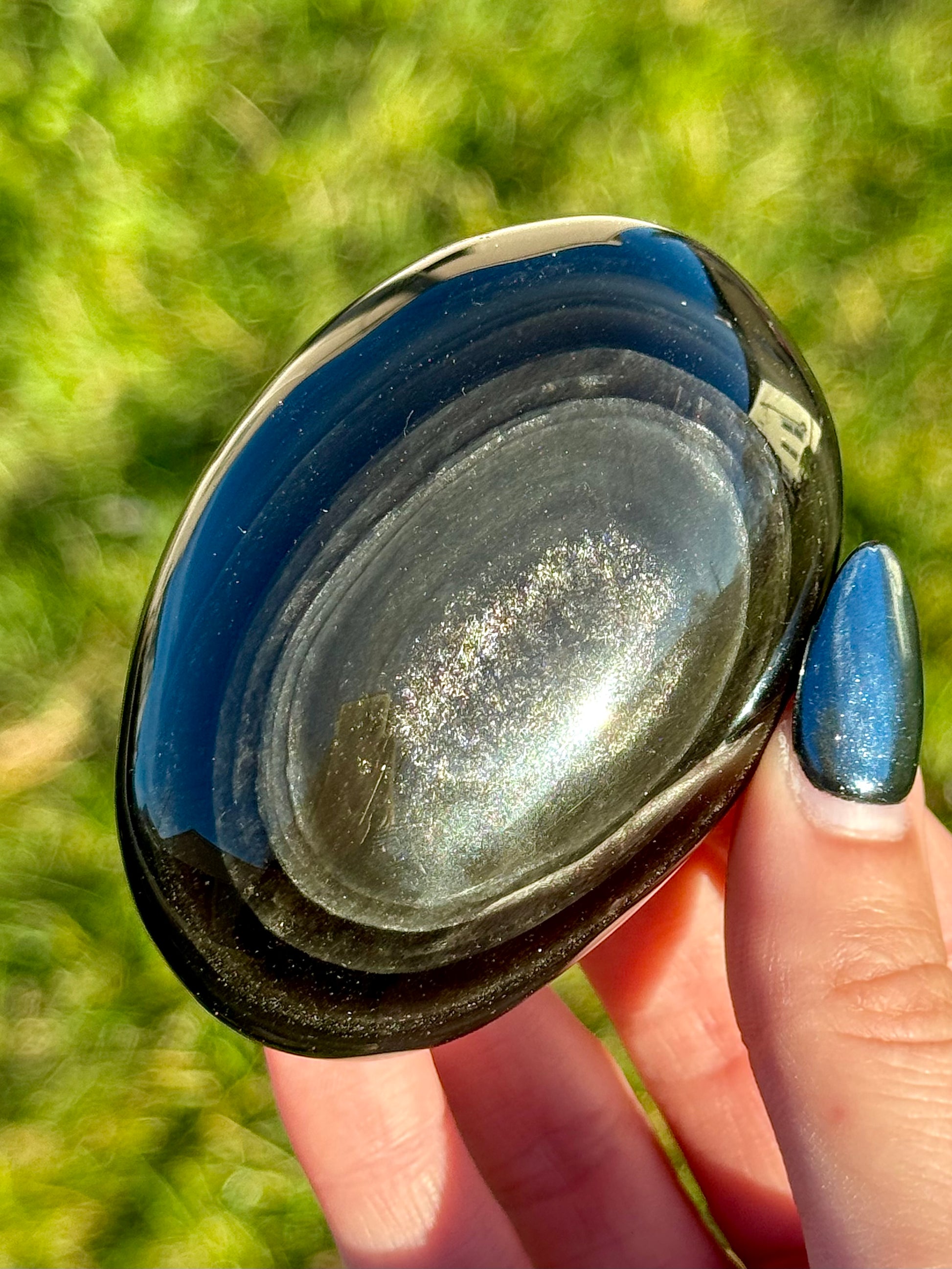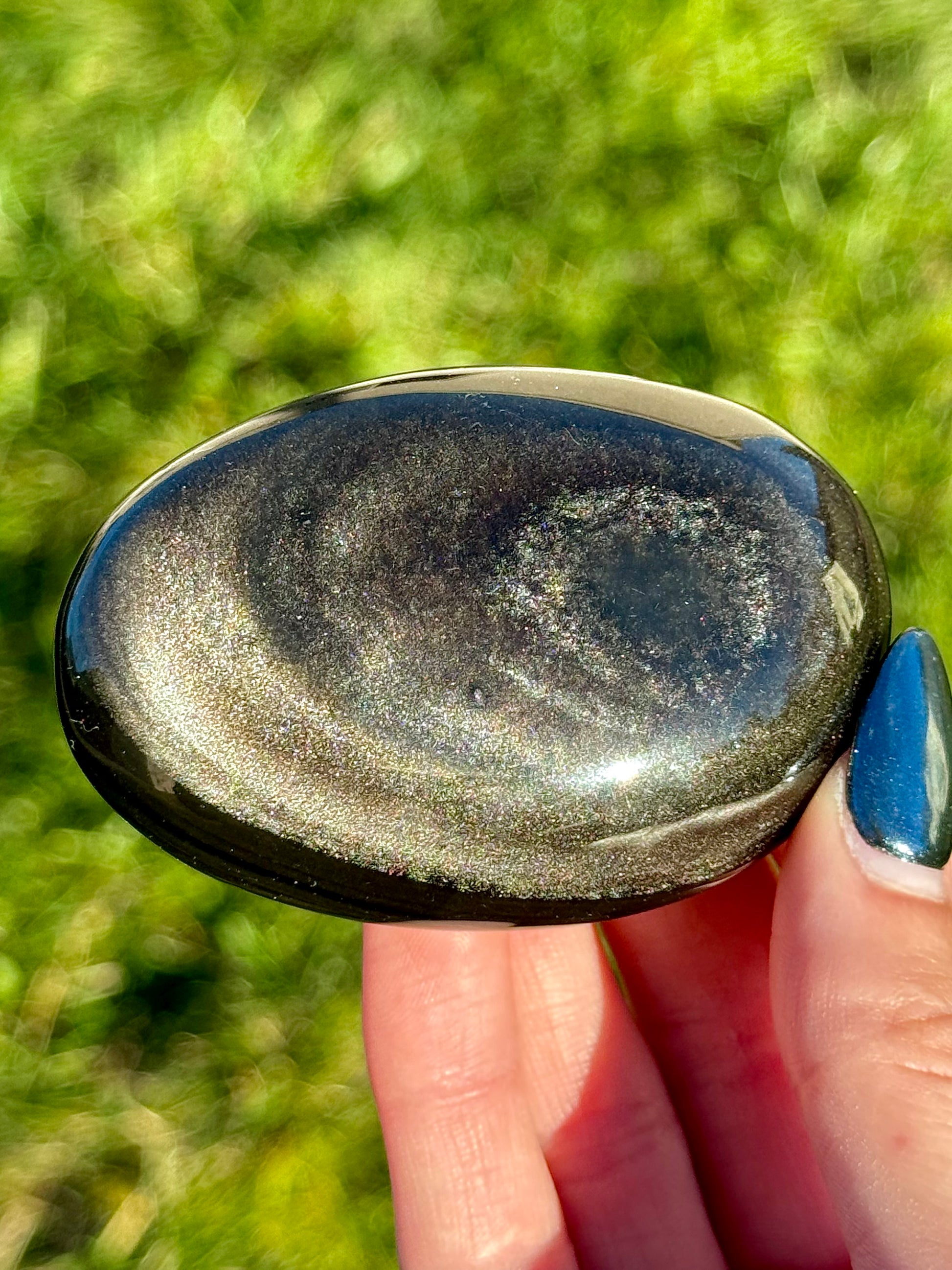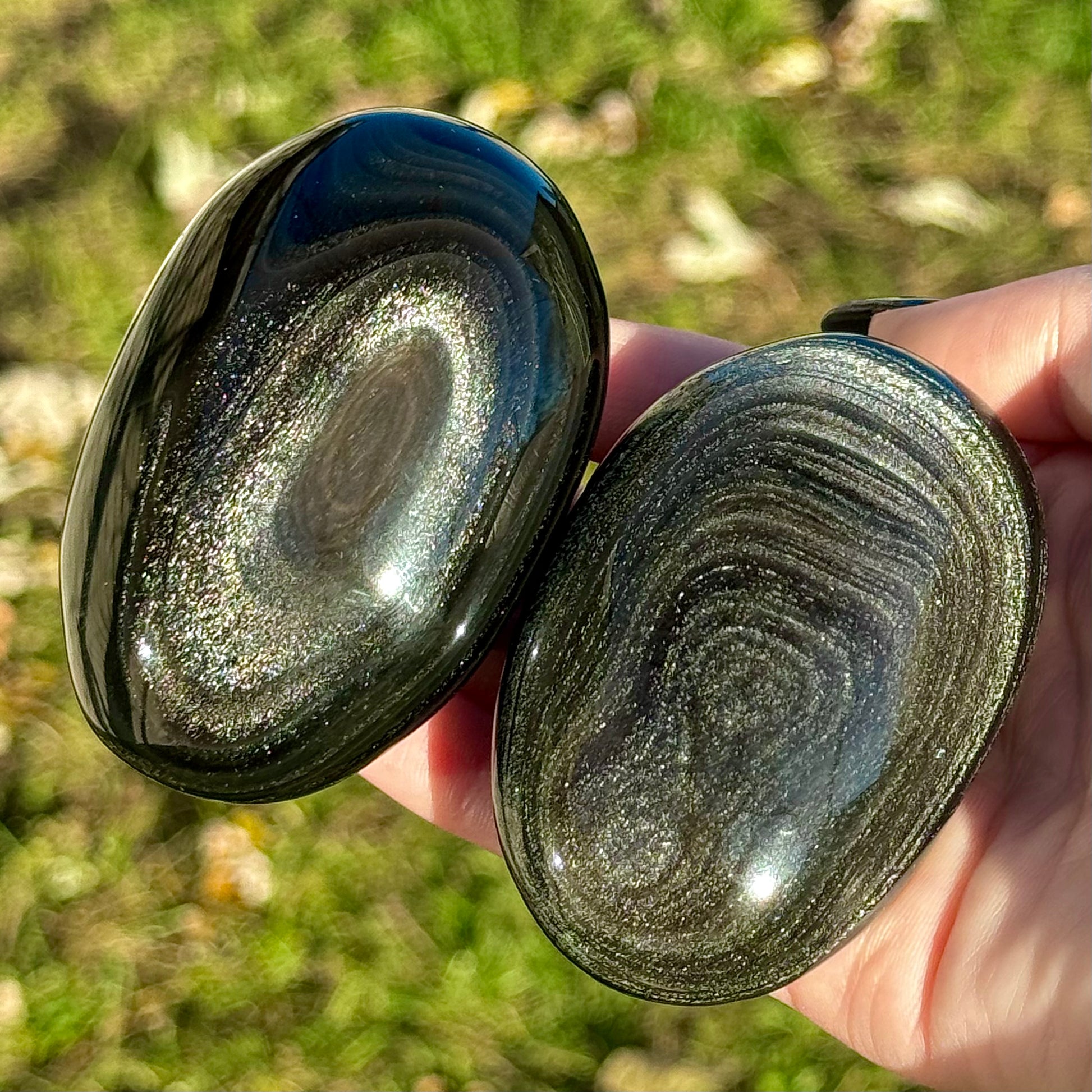 Bring a piece of the universe to your collection with these beautiful Silver Obsidian Palm Stones. Each palm stone resembles a little galaxy. Enjoy some cosmic vibes!