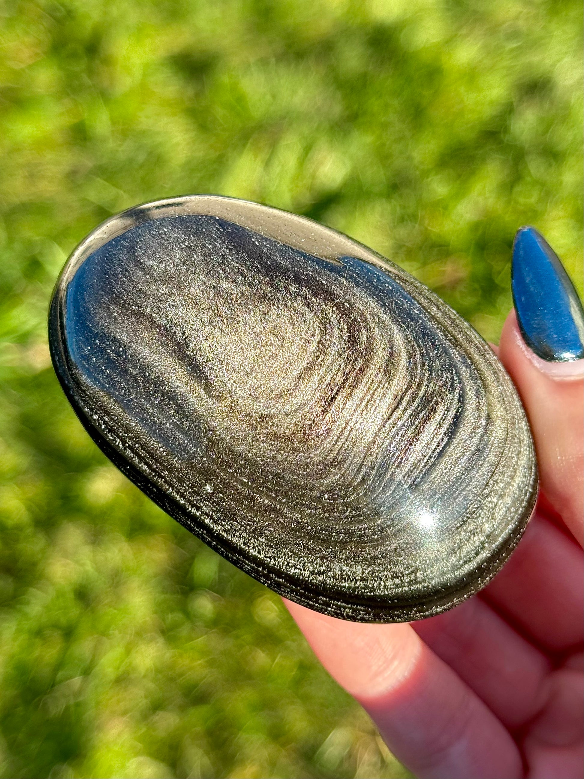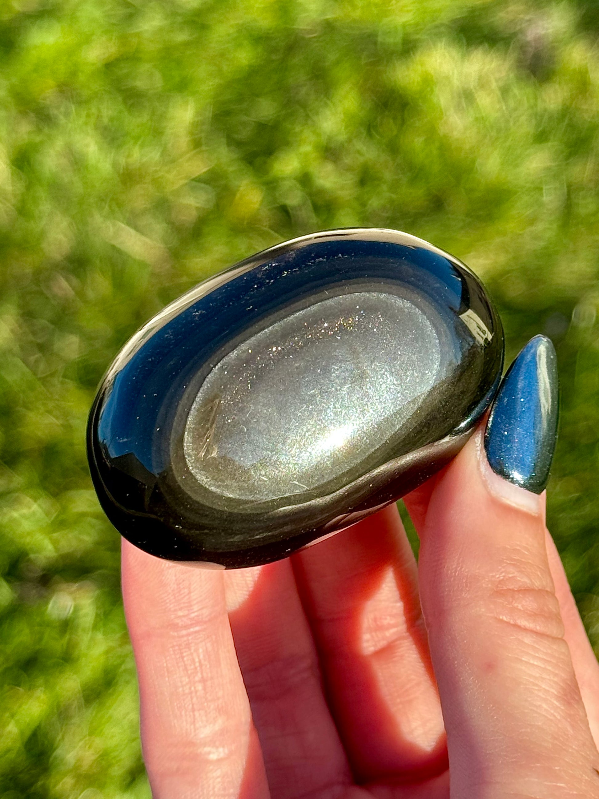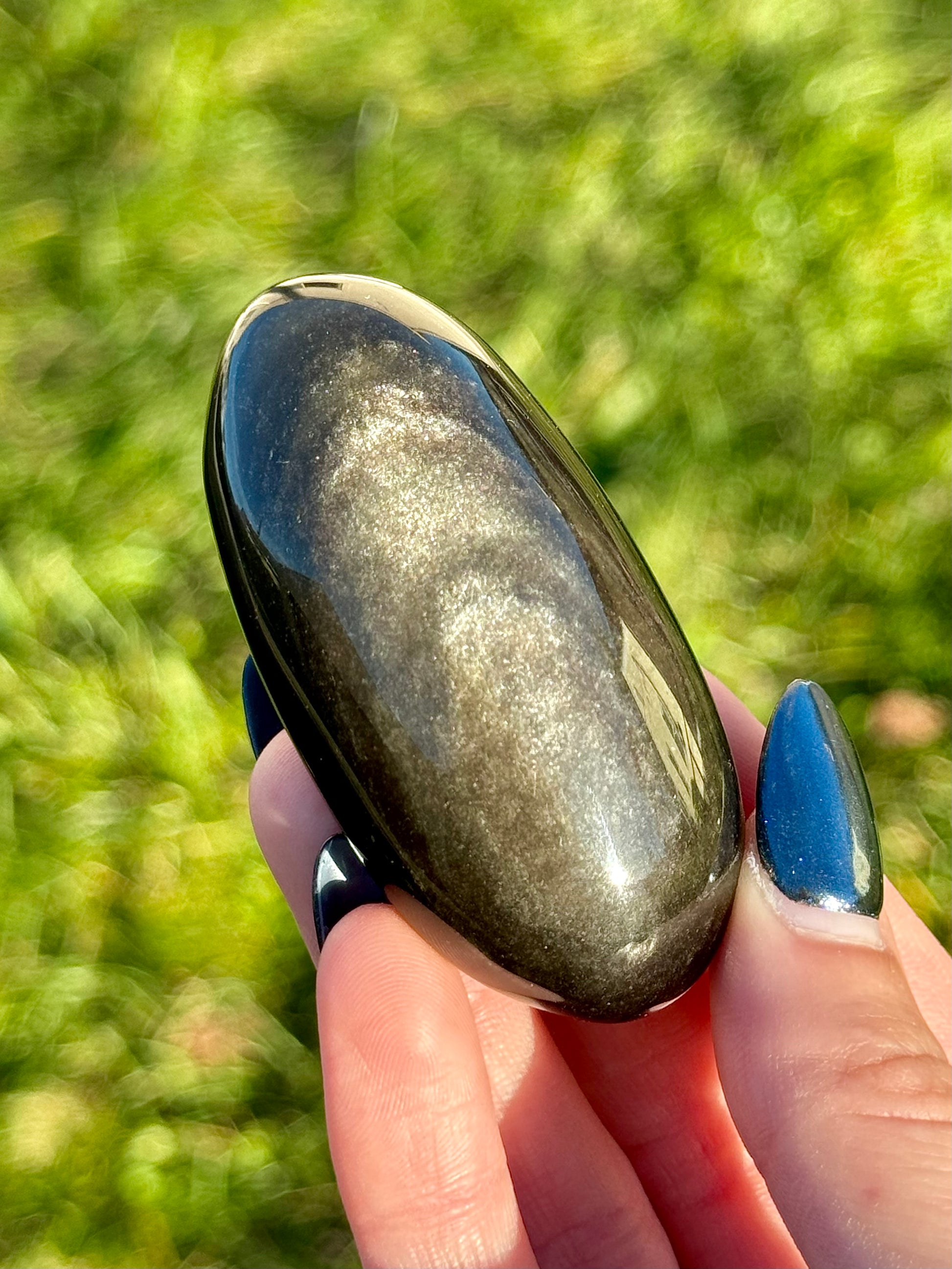 Bring a piece of the universe to your collection with these beautiful Silver Obsidian Palm Stones. Each palm stone resembles a little galaxy. Enjoy some cosmic vibes!