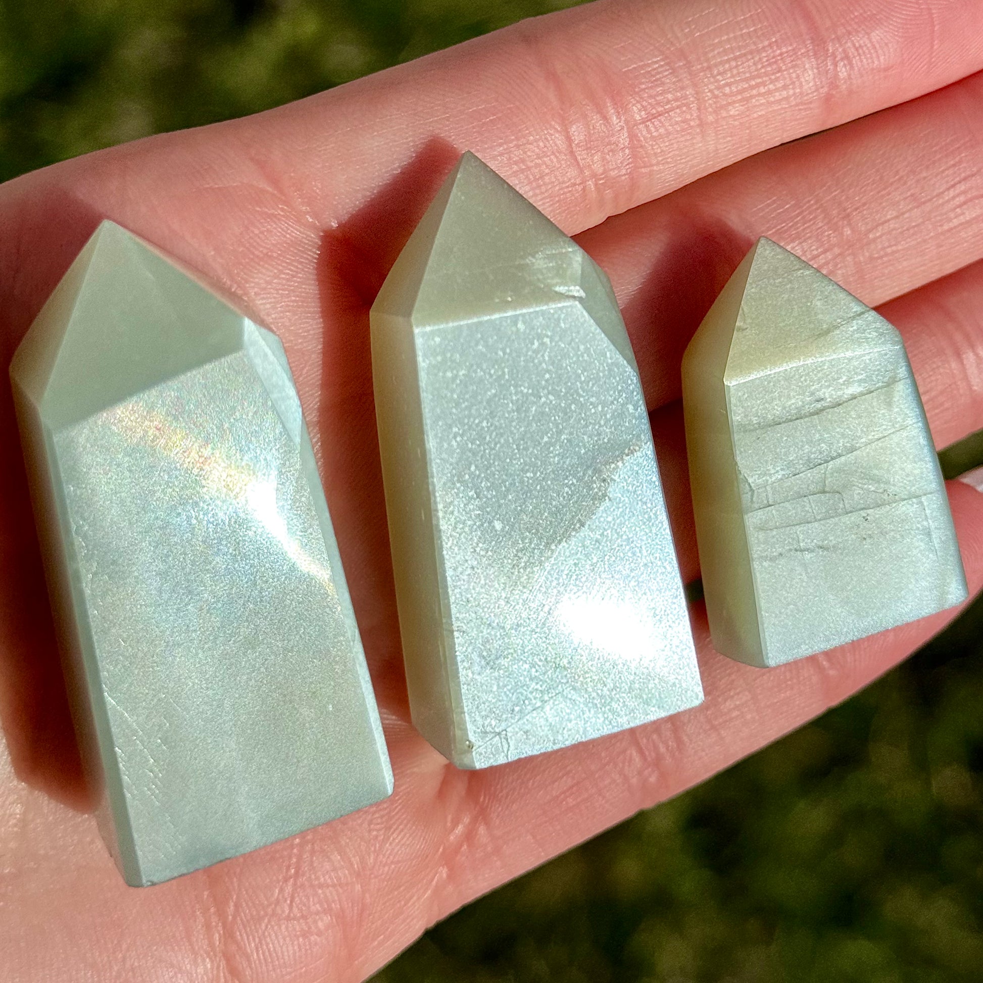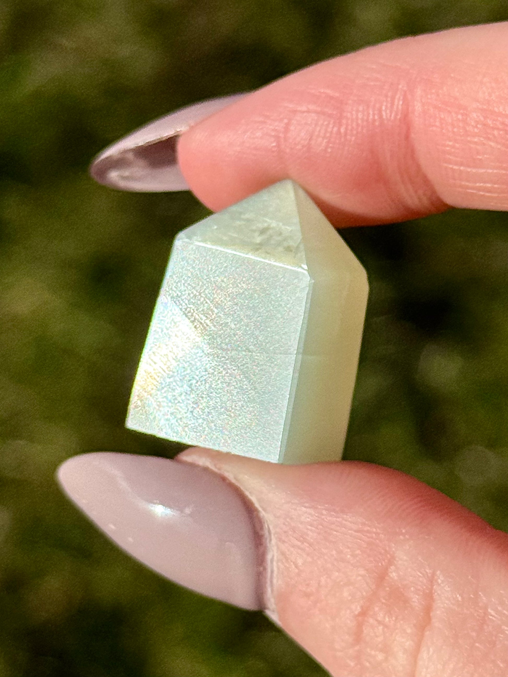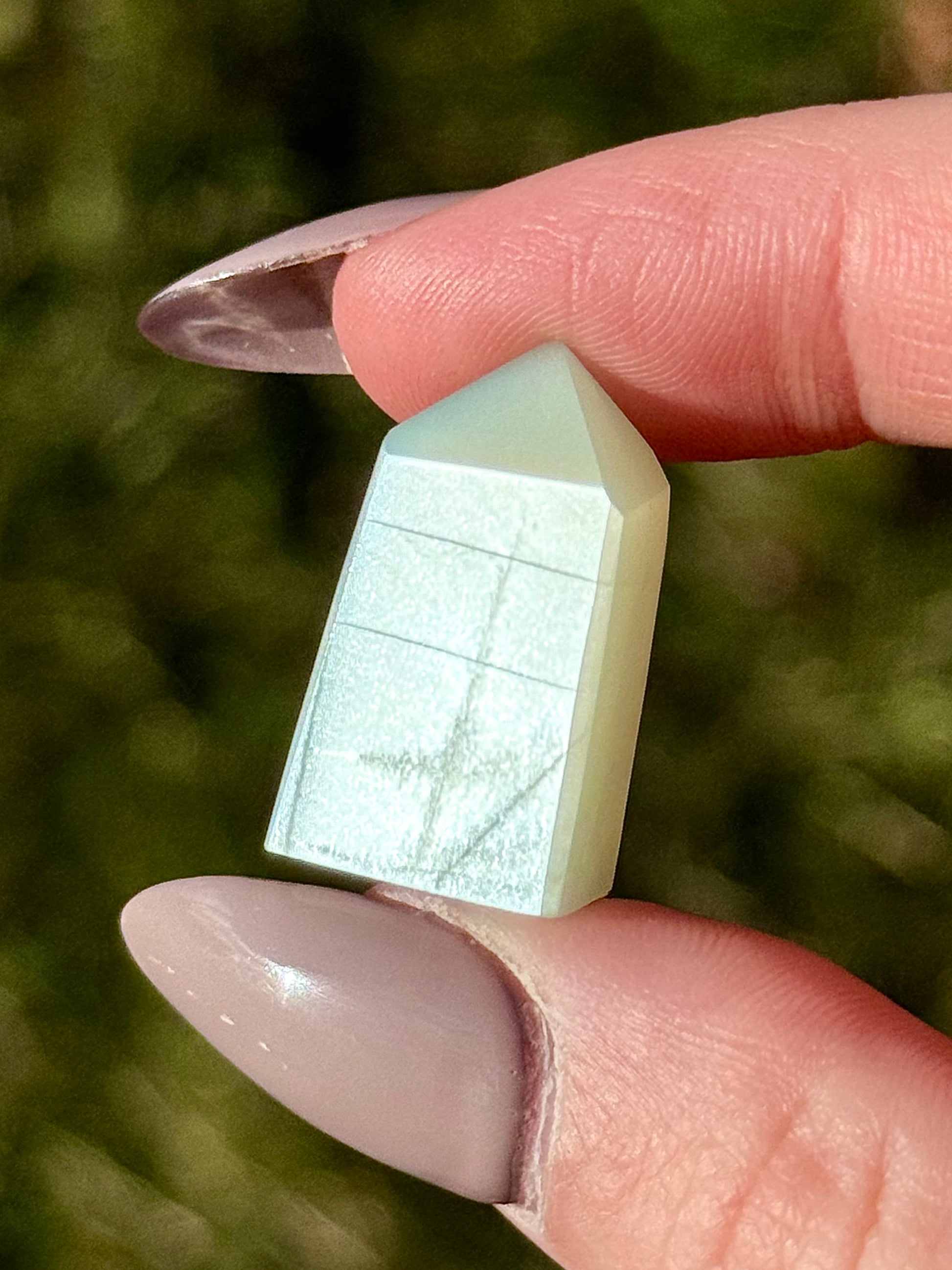 Green moonstone is a rare material, which is why it typically has a high price point. However, our Mini Silky Green Moonstone Towers are extra small in size, making it attainable for anyone to take one home. We love the stunning flash each tower has on all sides! These towers range in heights from about 1" to 1 3/4" tall.