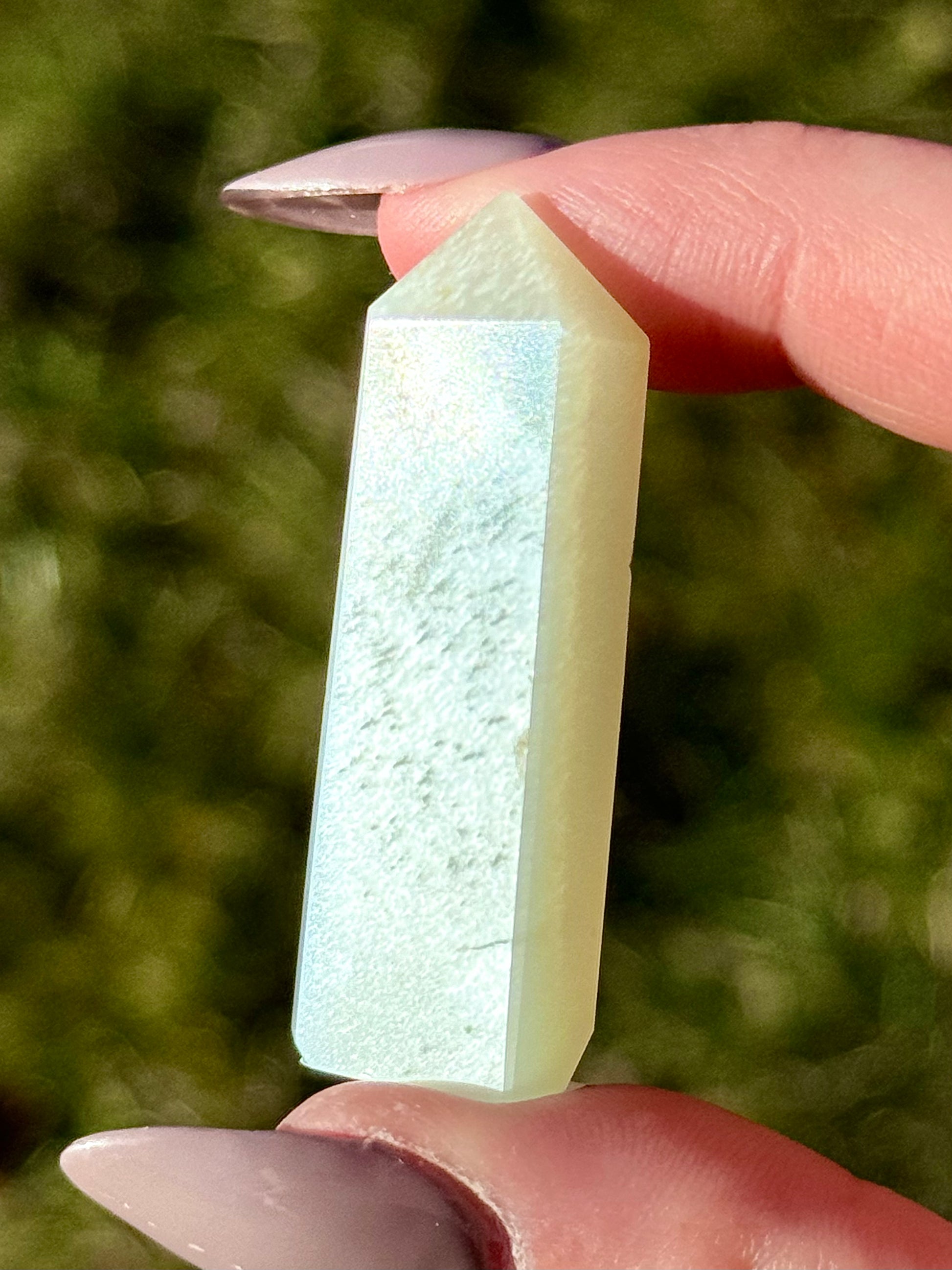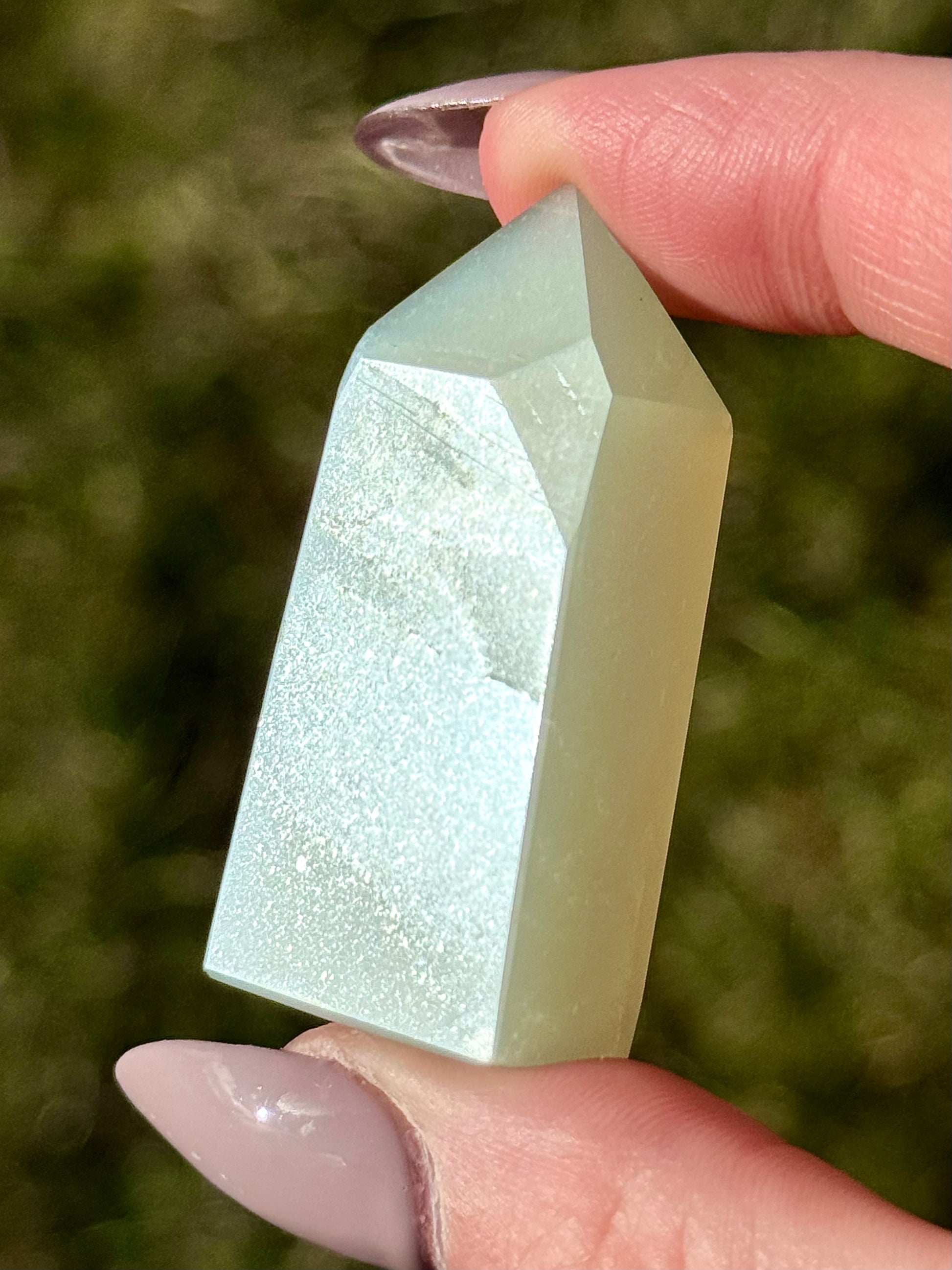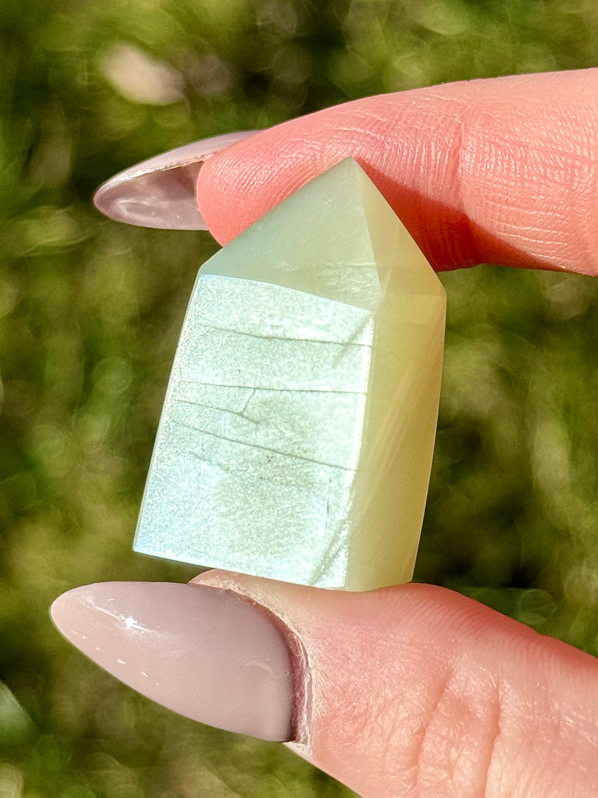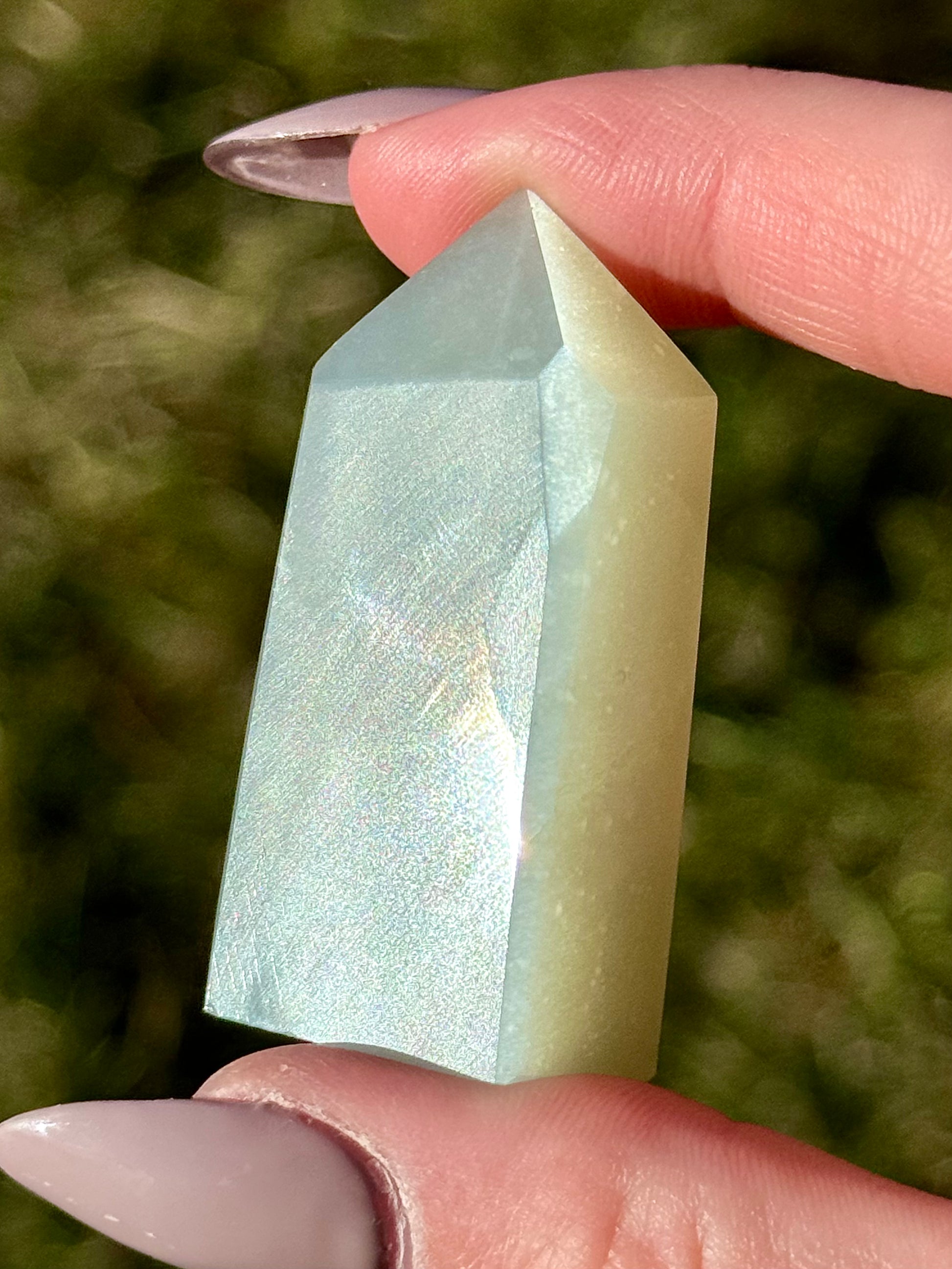 Green moonstone is a rare material, which is why it typically has a high price point. However, our Mini Silky Green Moonstone Towers are extra small in size, making it attainable for anyone to take one home. We love the stunning flash each tower has on all sides! These towers range in heights from about 1" to 1 3/4" tall.