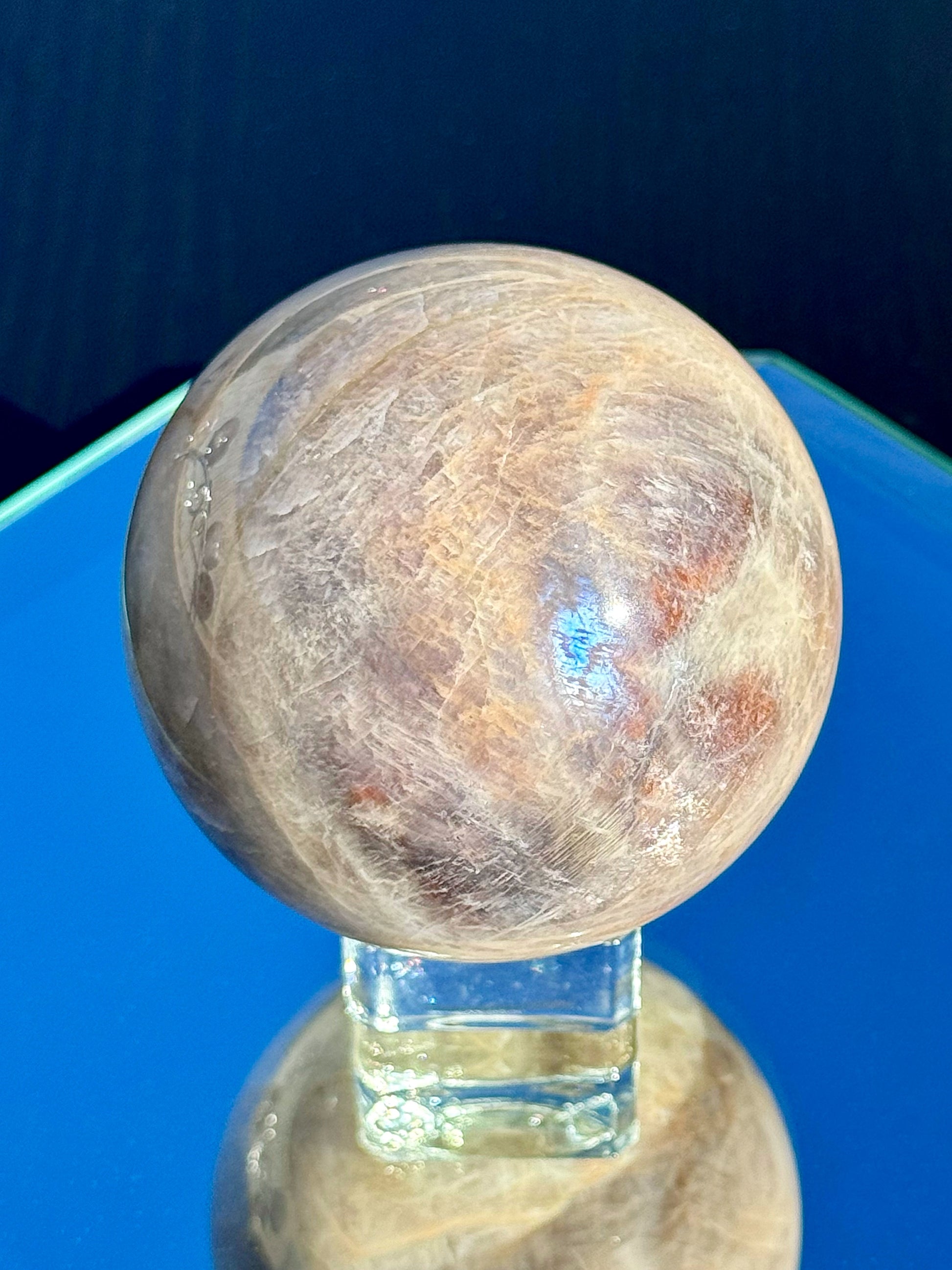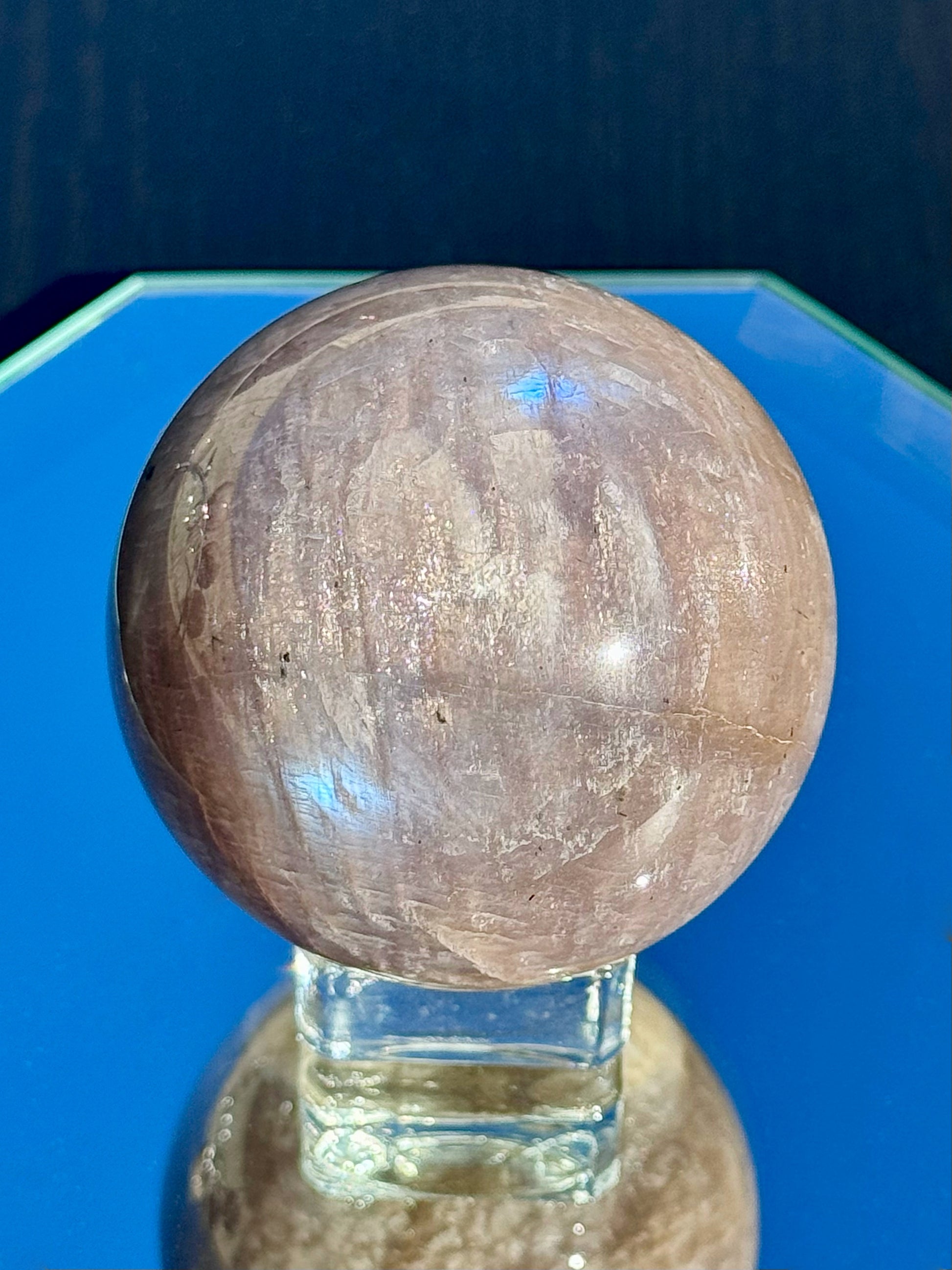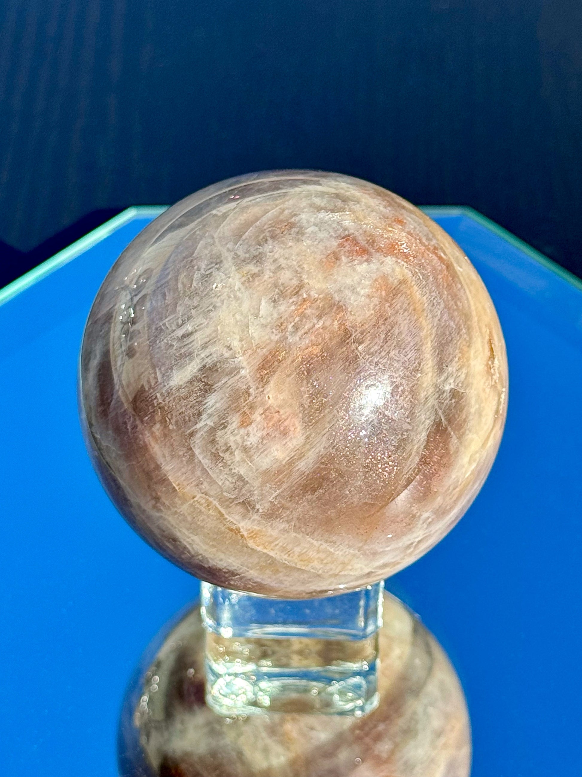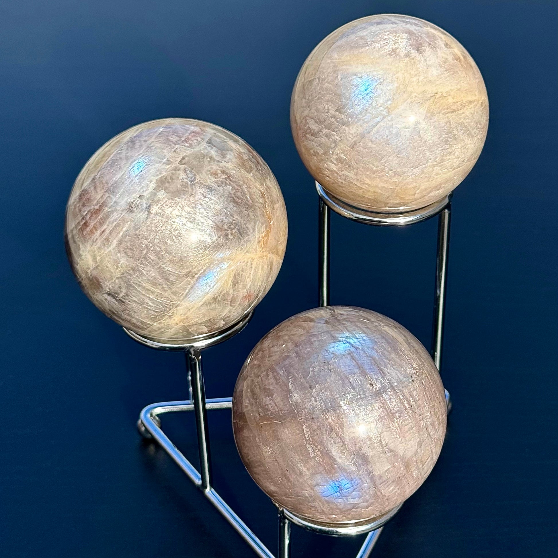 Adorn your space with a Sunstone & Moonstone Sphere that feature the mesmerizing blue moonstone flash and the radiant sparkle of the sunstone. The diameters of these spheres range from 54mm to 63mm.