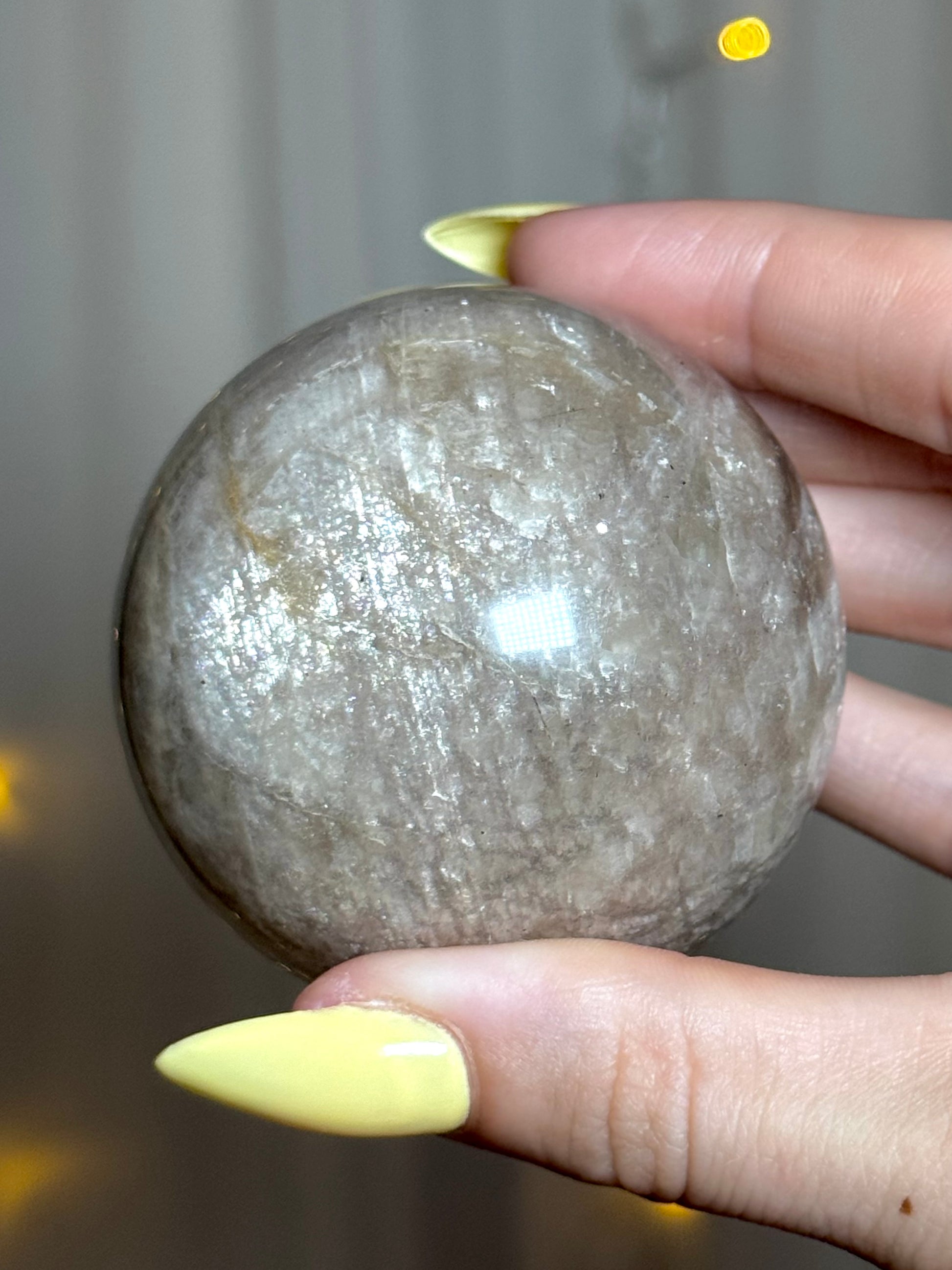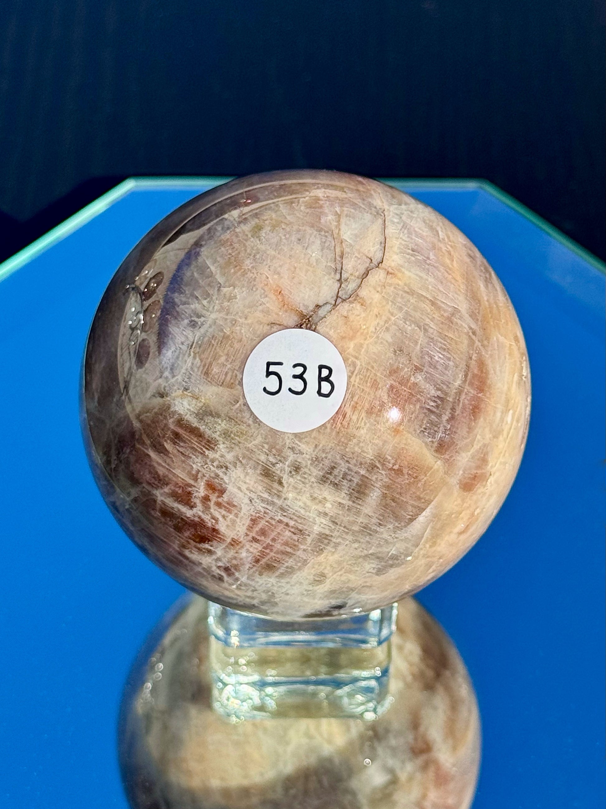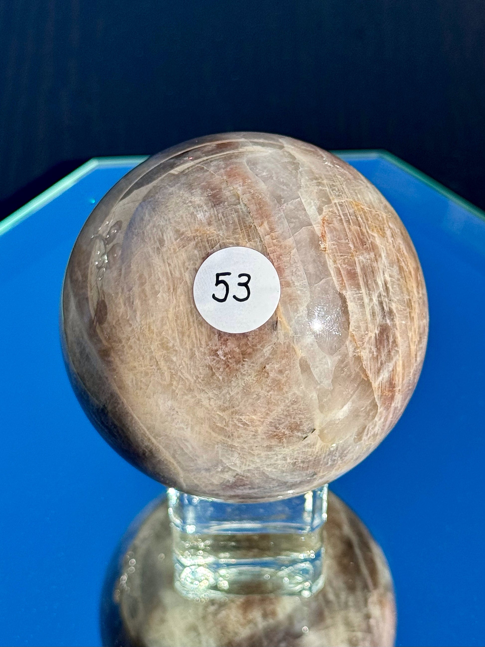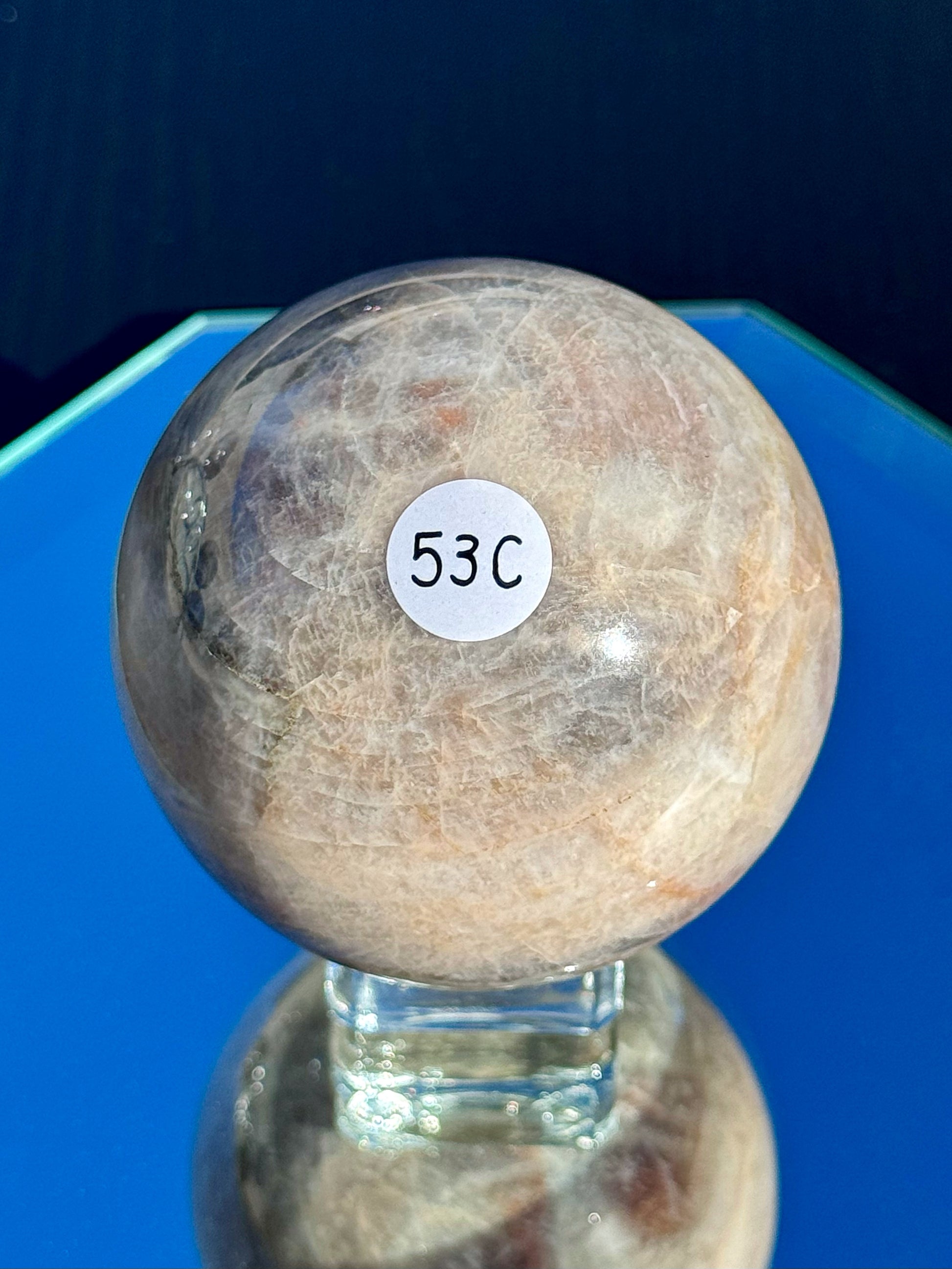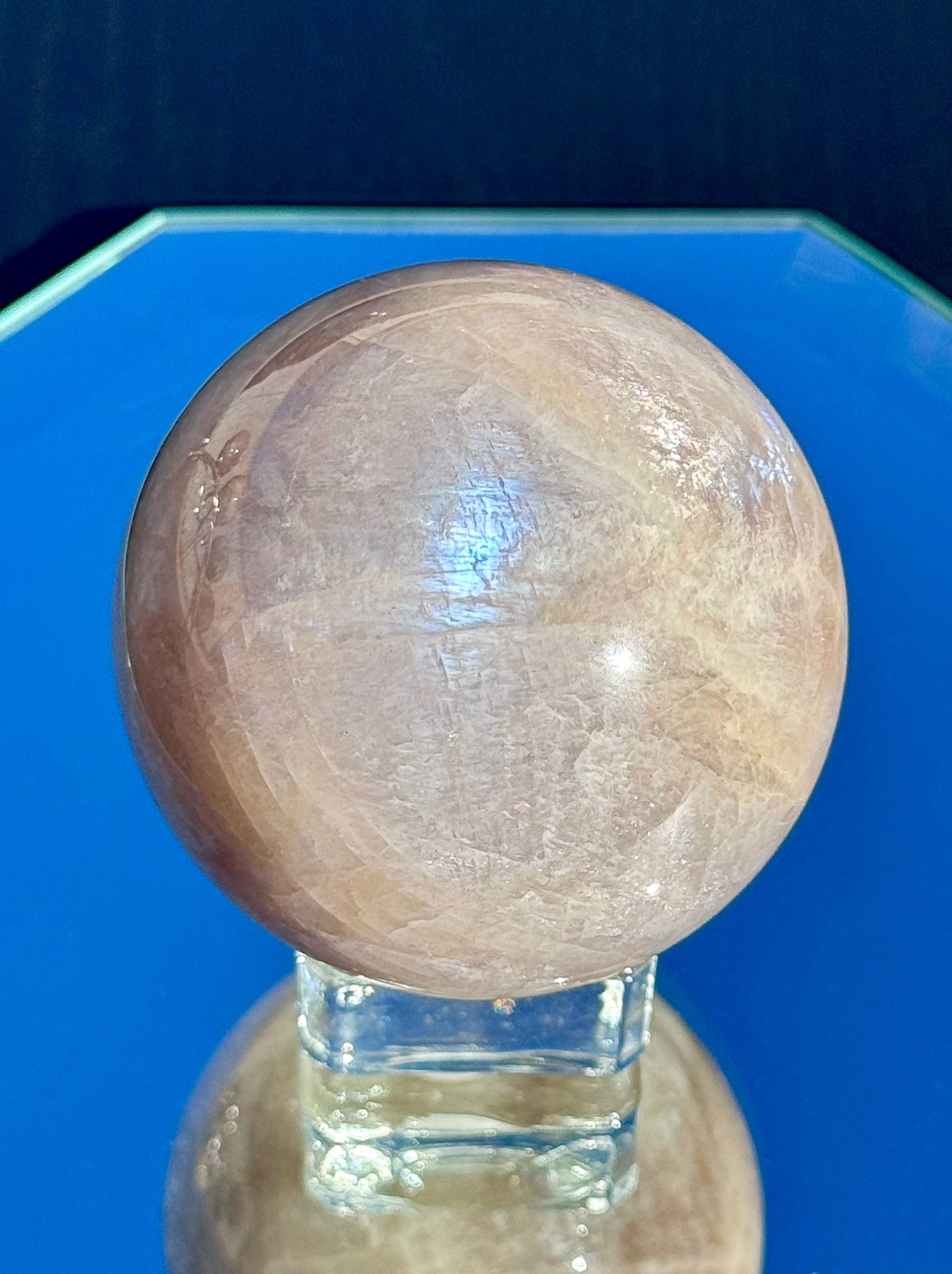 Adorn your space with a Sunstone & Moonstone Sphere that feature the mesmerizing blue moonstone flash and the radiant sparkle of the sunstone. The diameters of these spheres range from 54mm to 63mm.