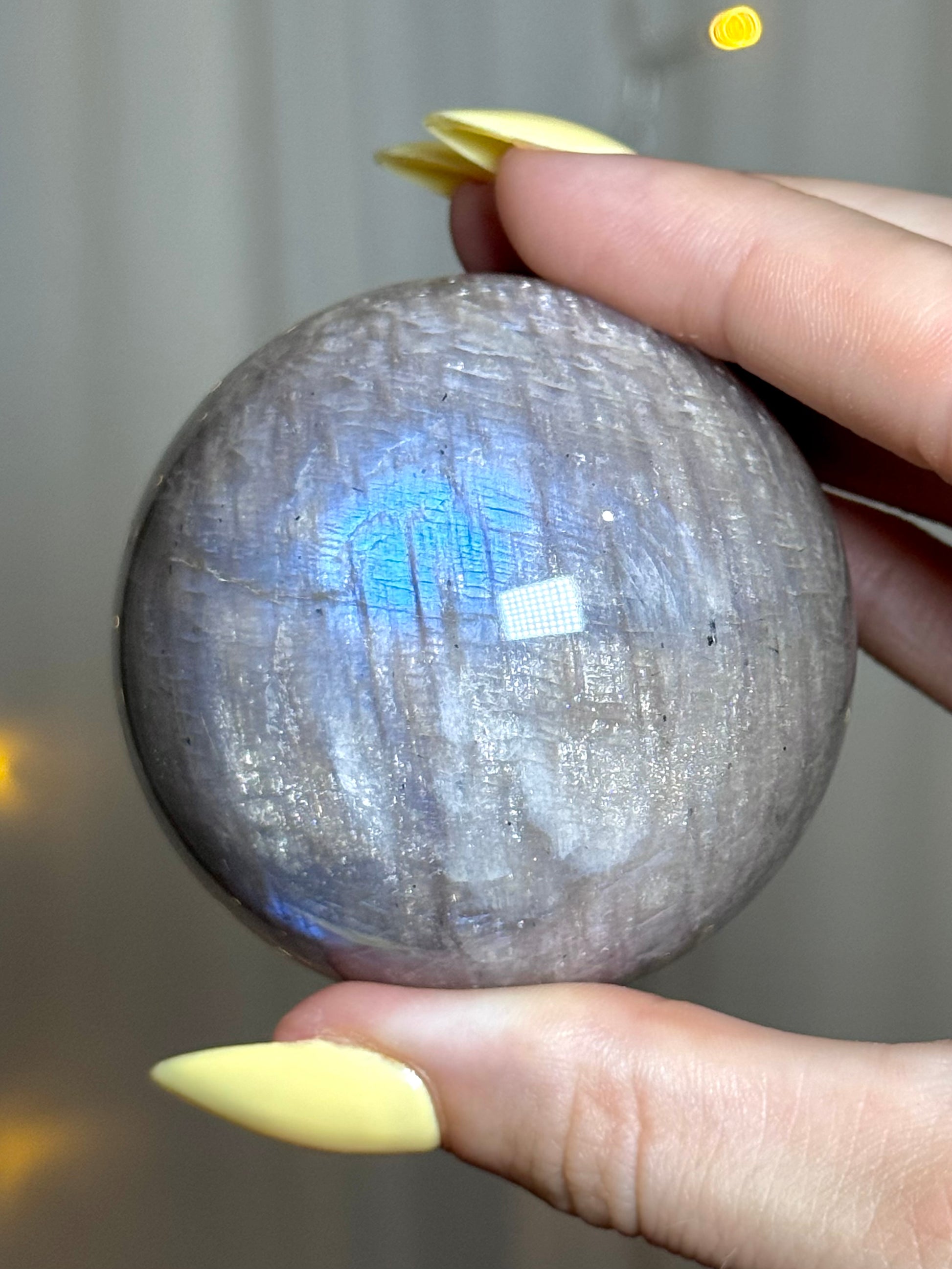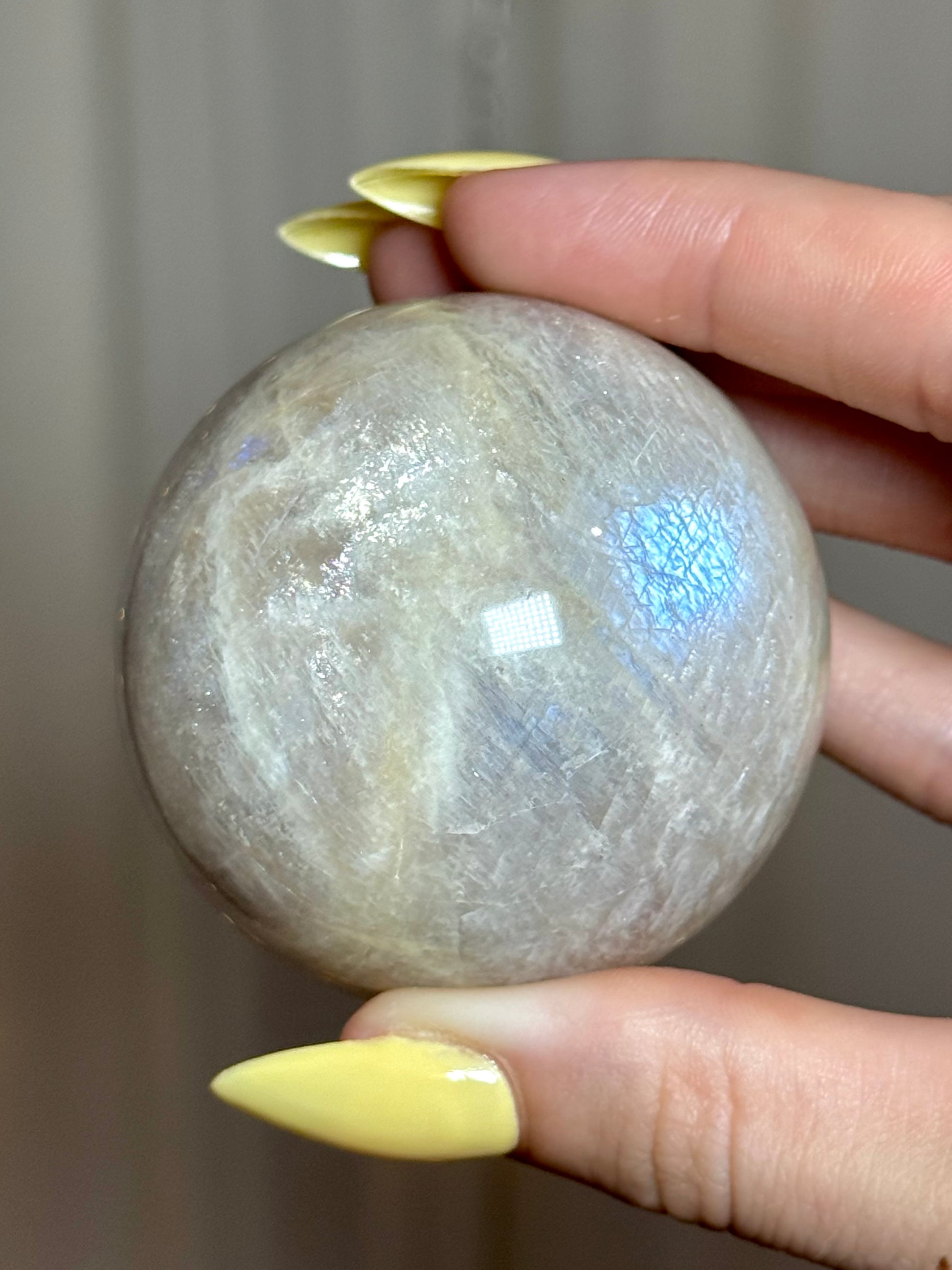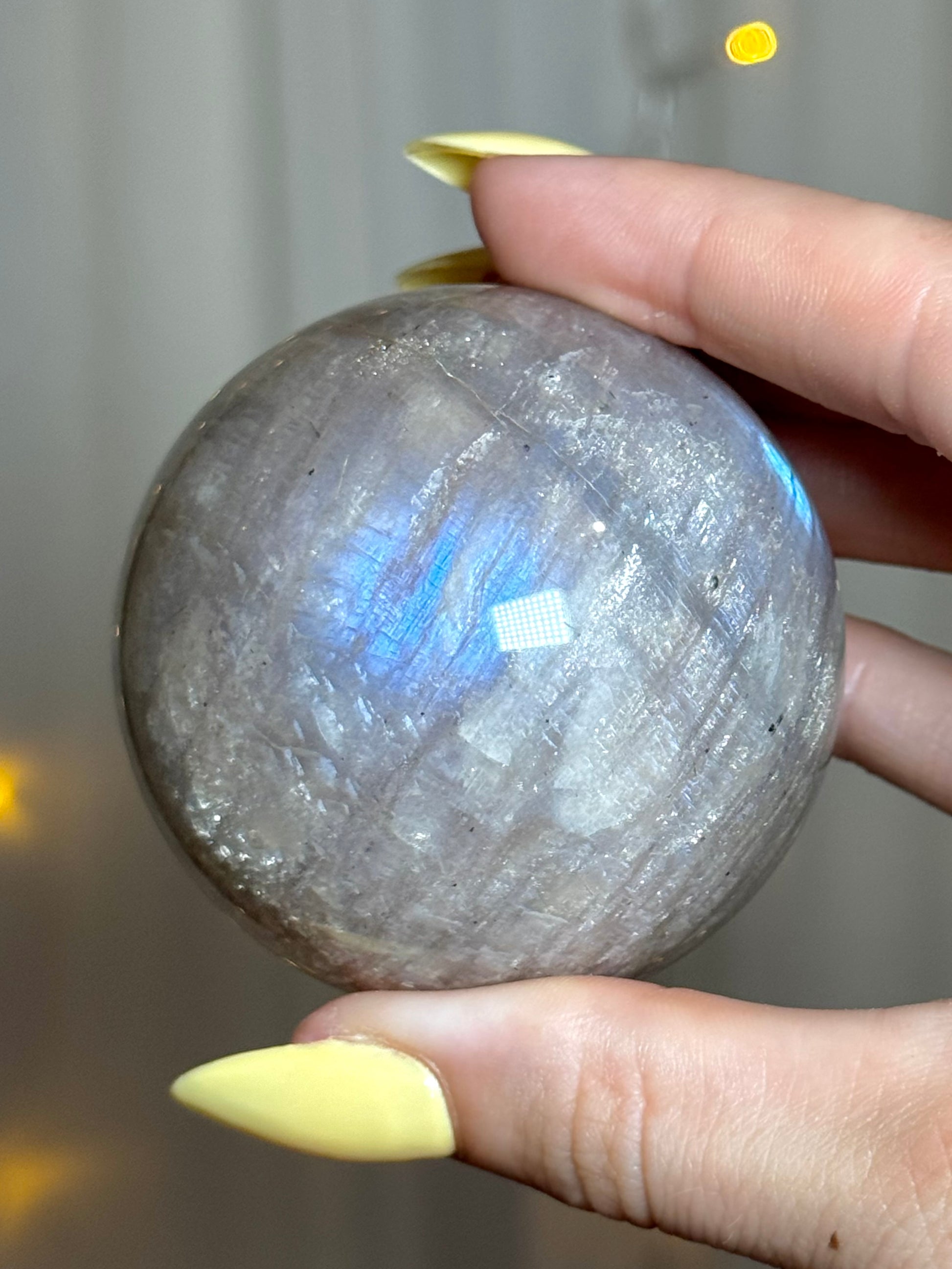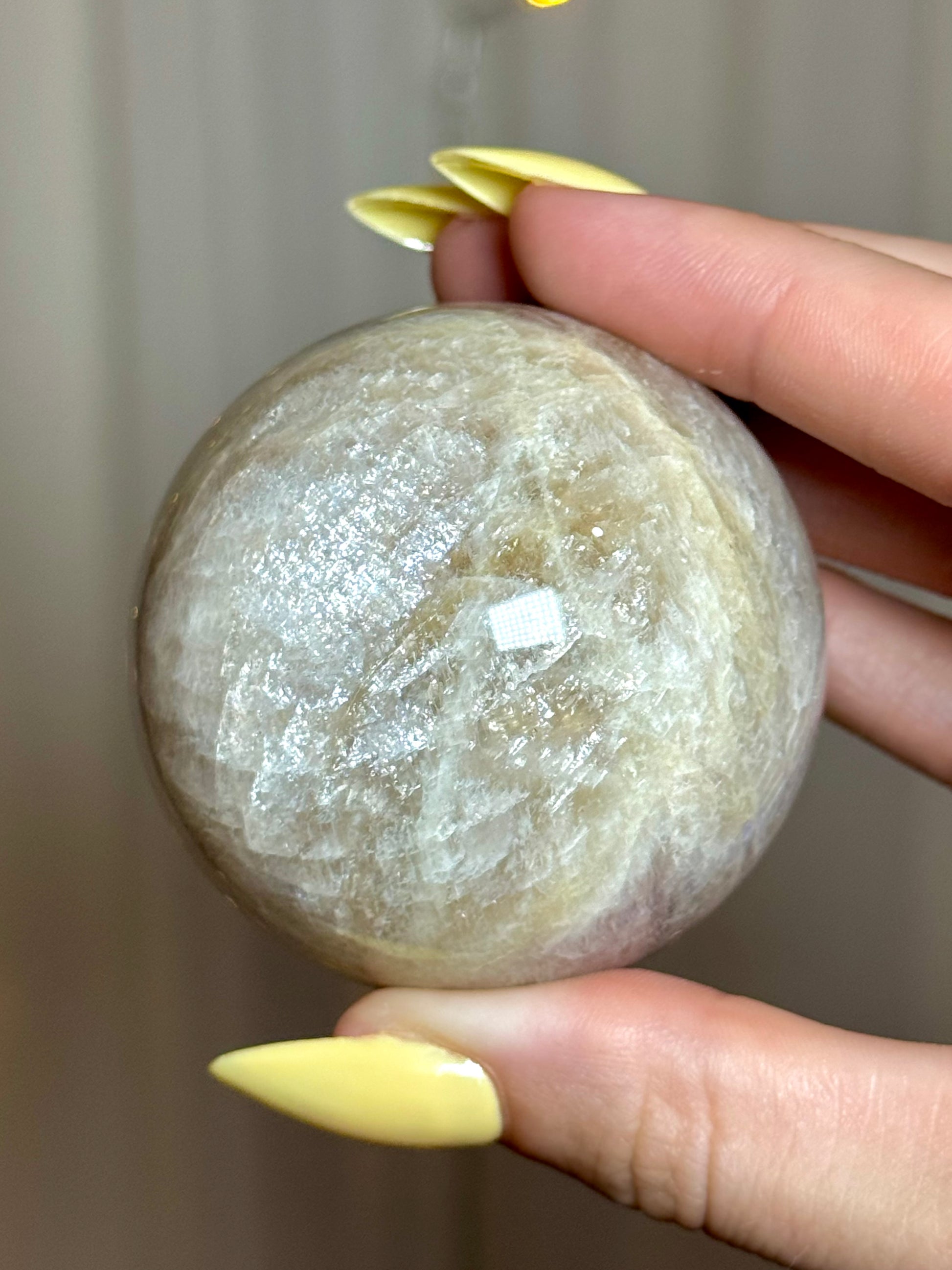 Adorn your space with a Sunstone & Moonstone Sphere that feature the mesmerizing blue moonstone flash and the radiant sparkle of the sunstone. The diameters of these spheres range from 54mm to 63mm.
