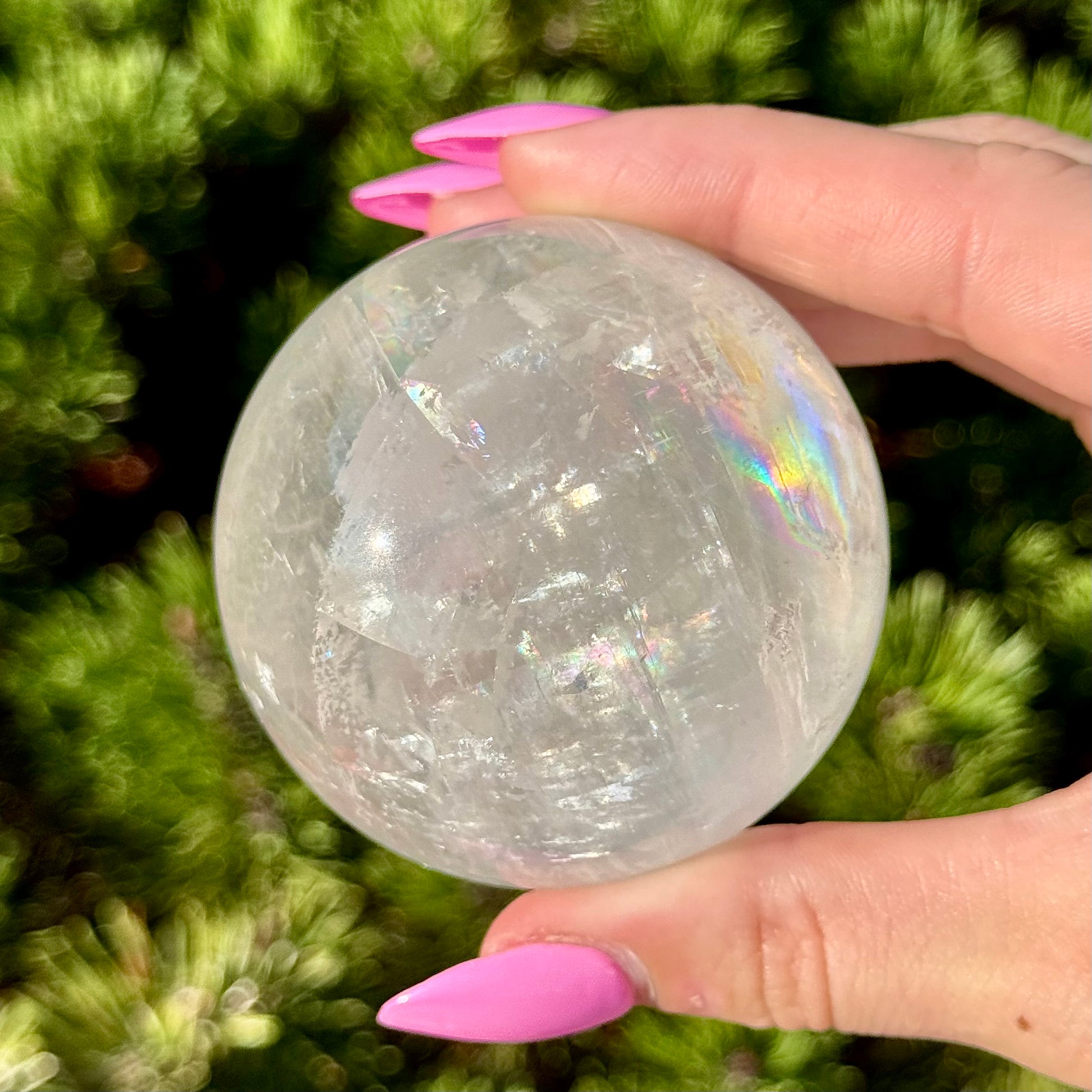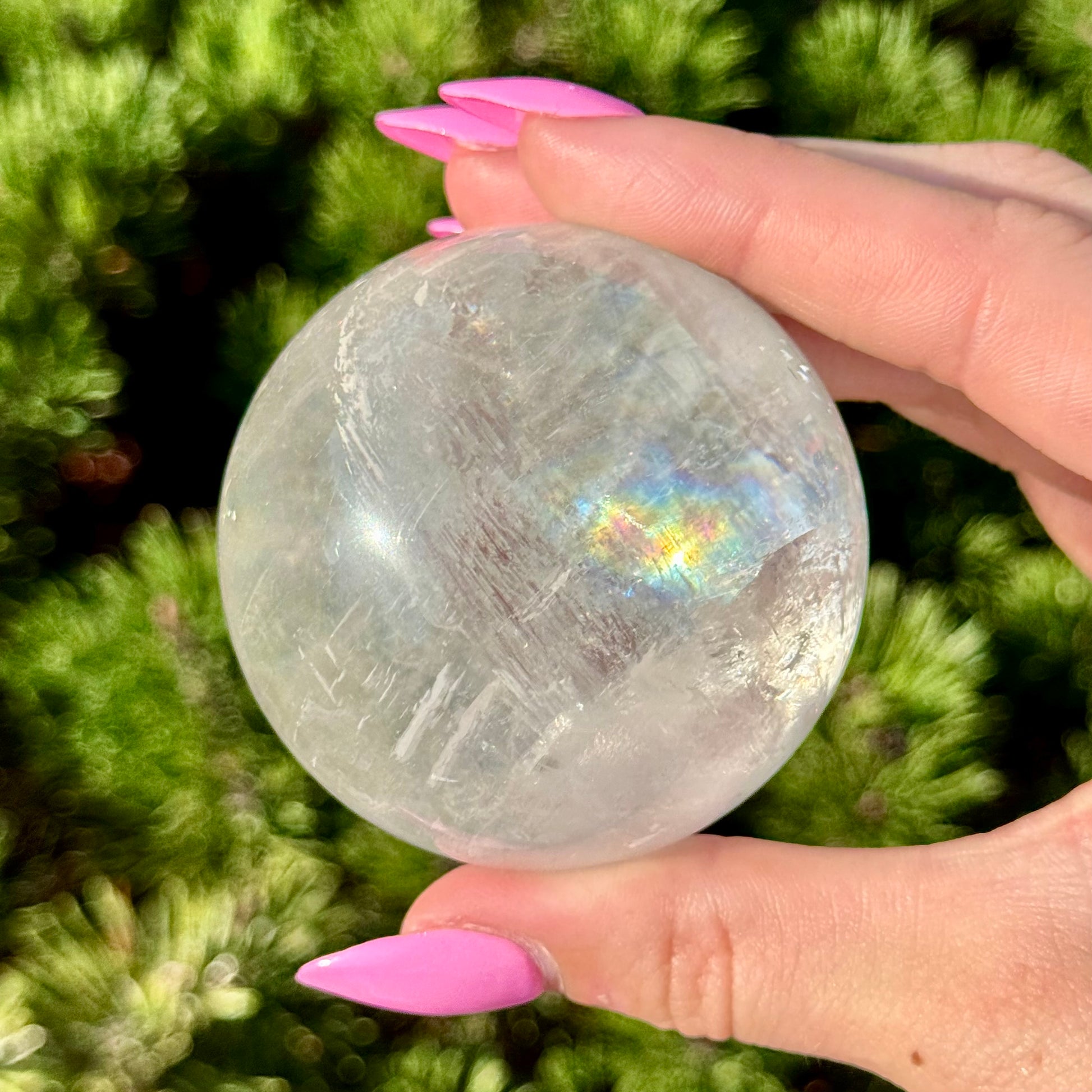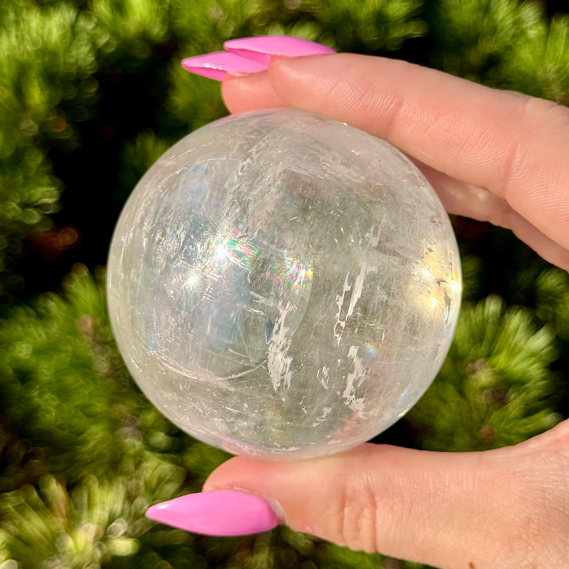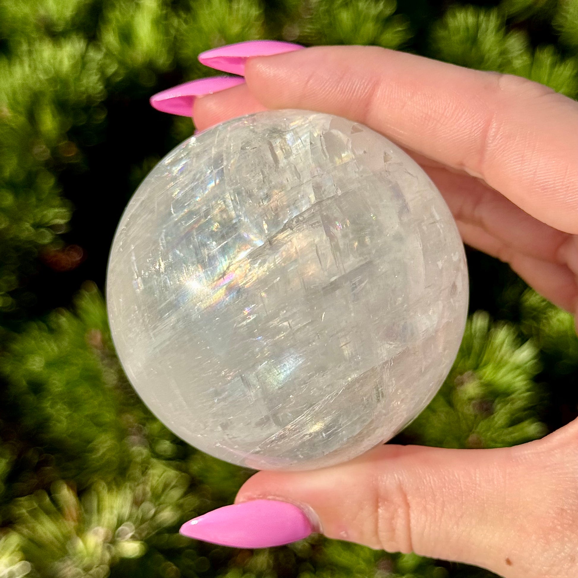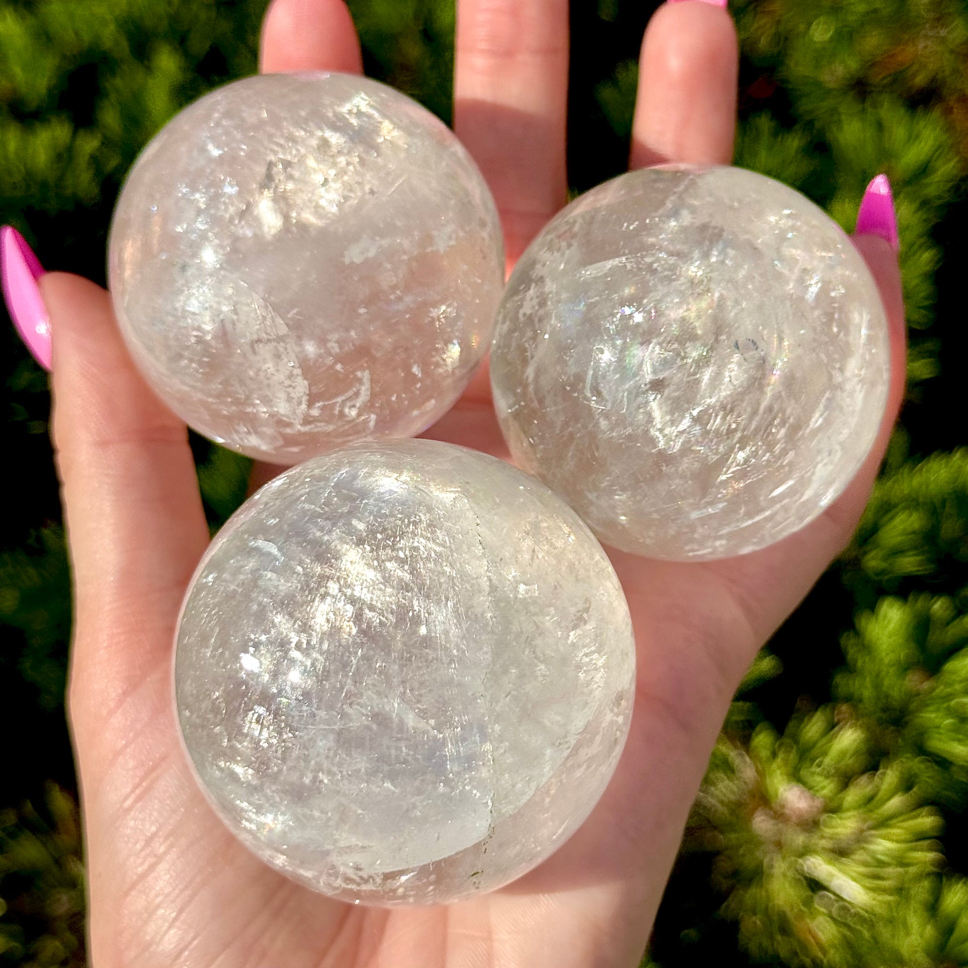 These Optical Calcite Spheres have diameters ranging from 49mm to 61mm. They dazzle with bright flash and vibrant rainbows!