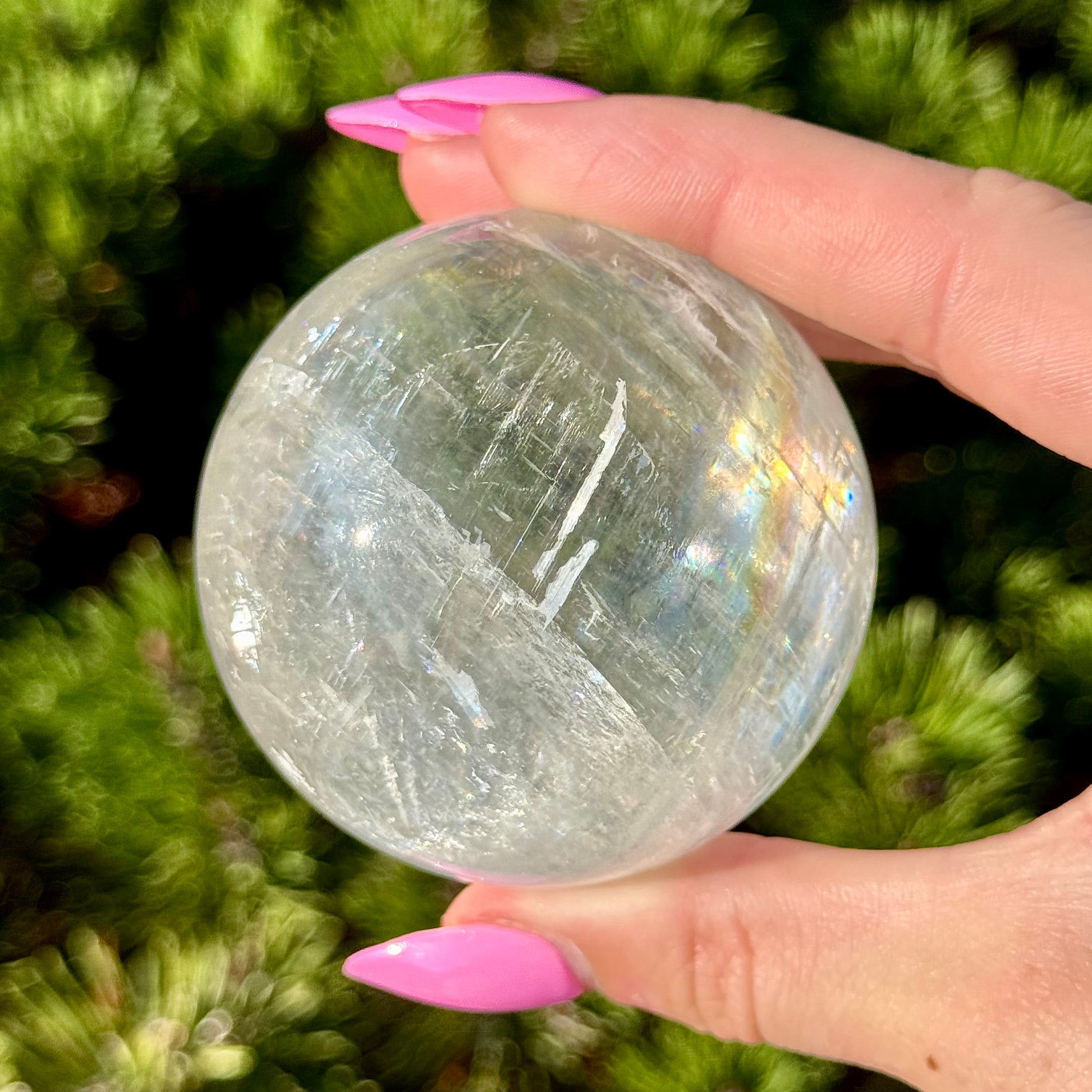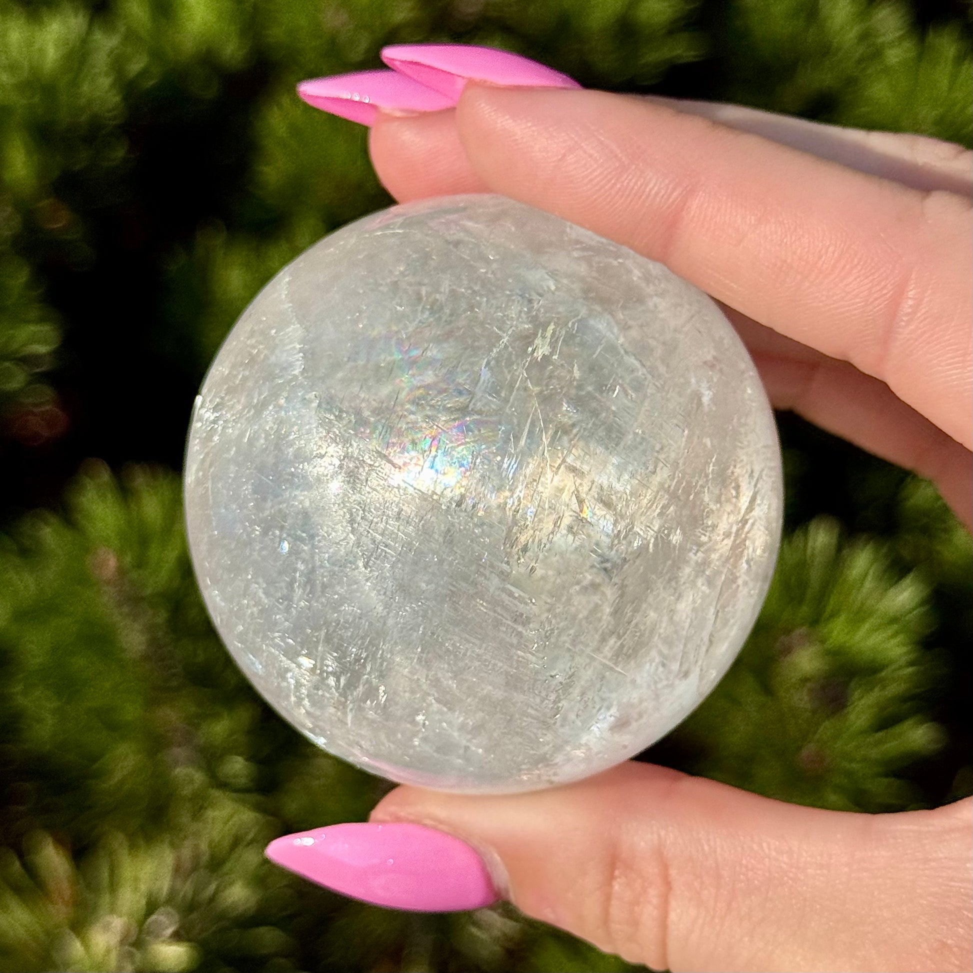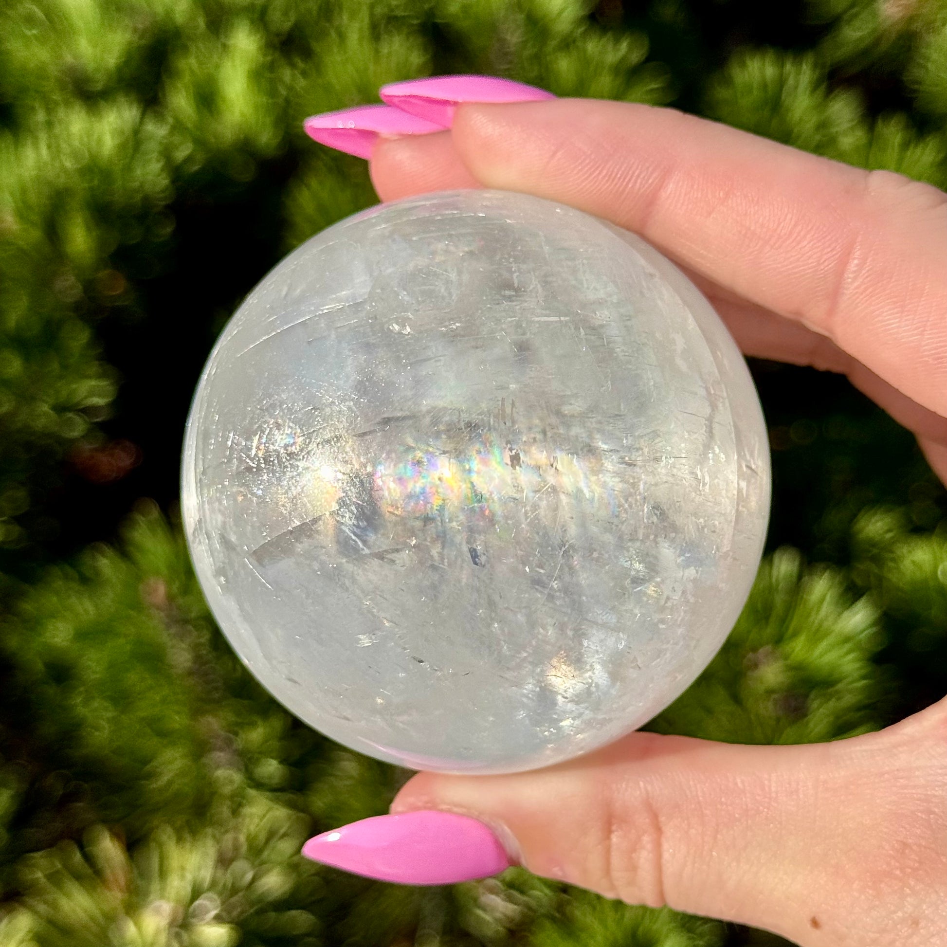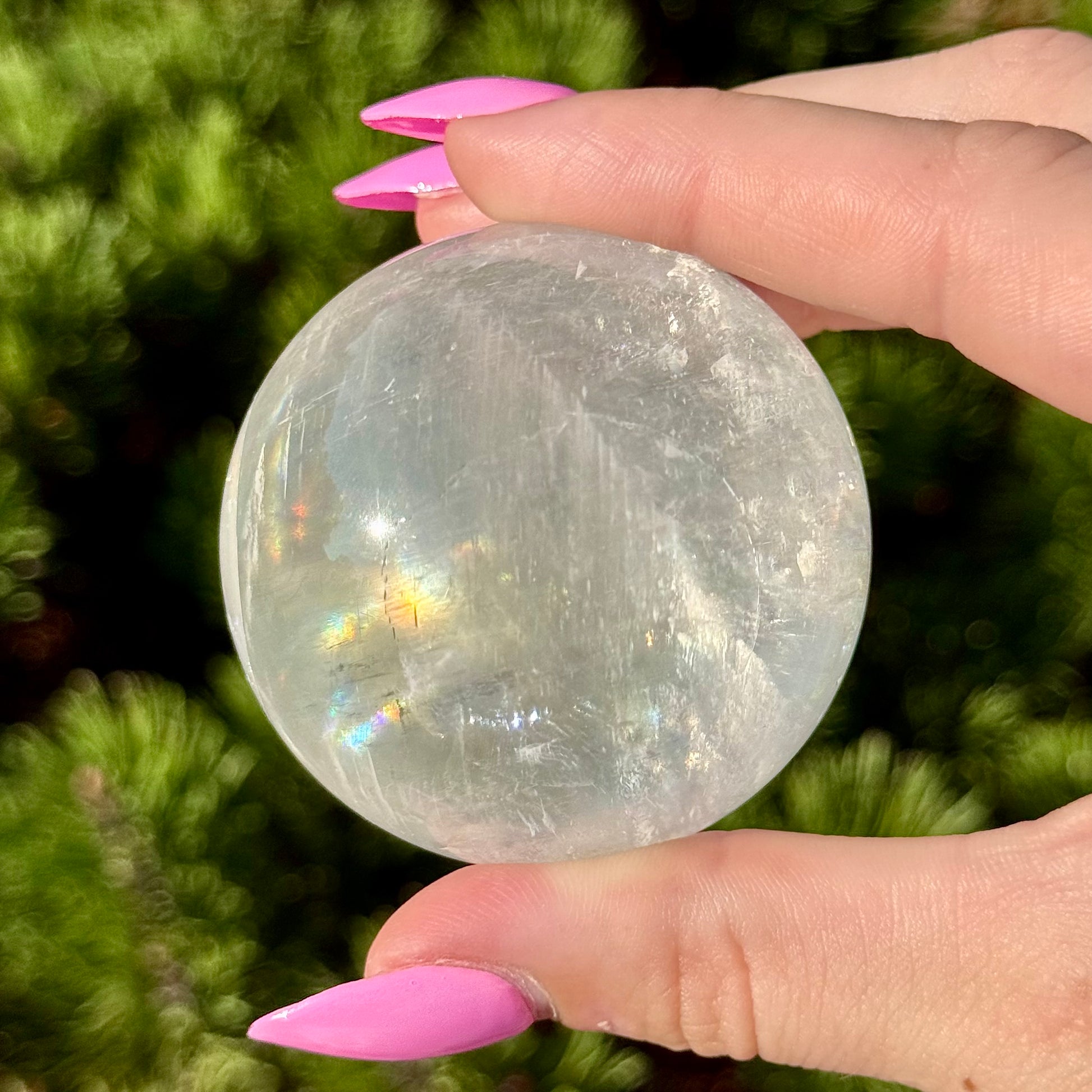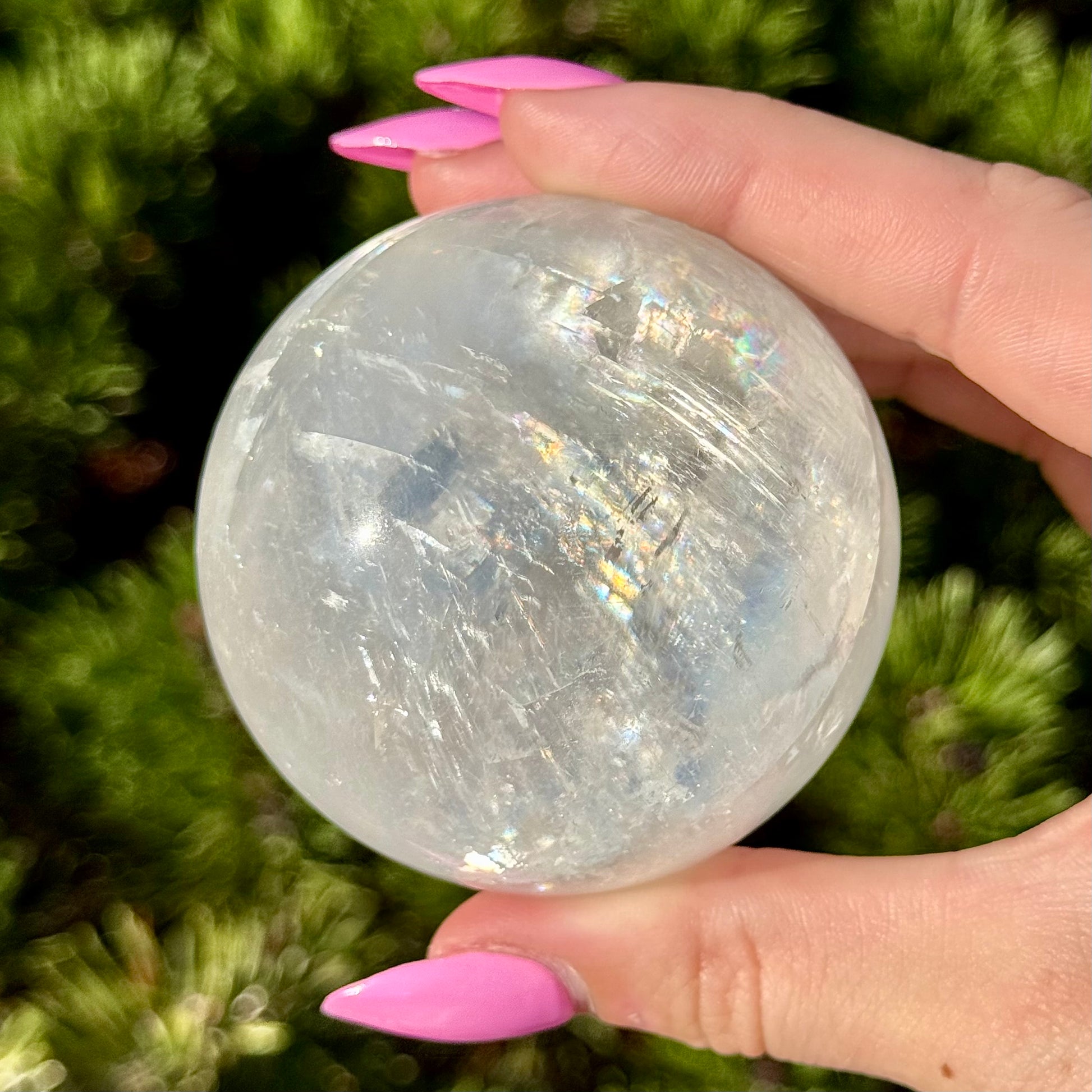 These Optical Calcite Spheres have diameters ranging from 49mm to 61mm. They dazzle with bright flash and vibrant rainbows!