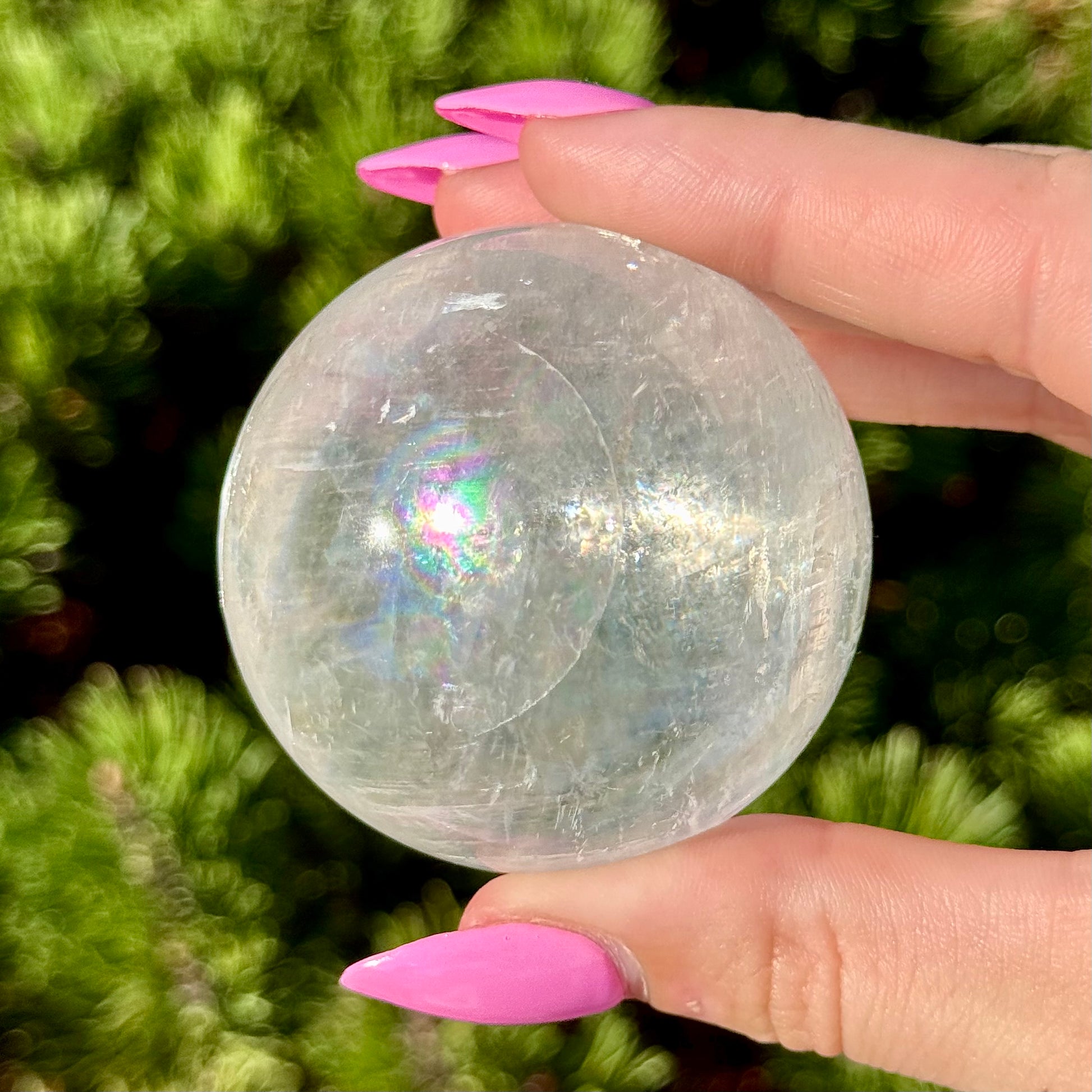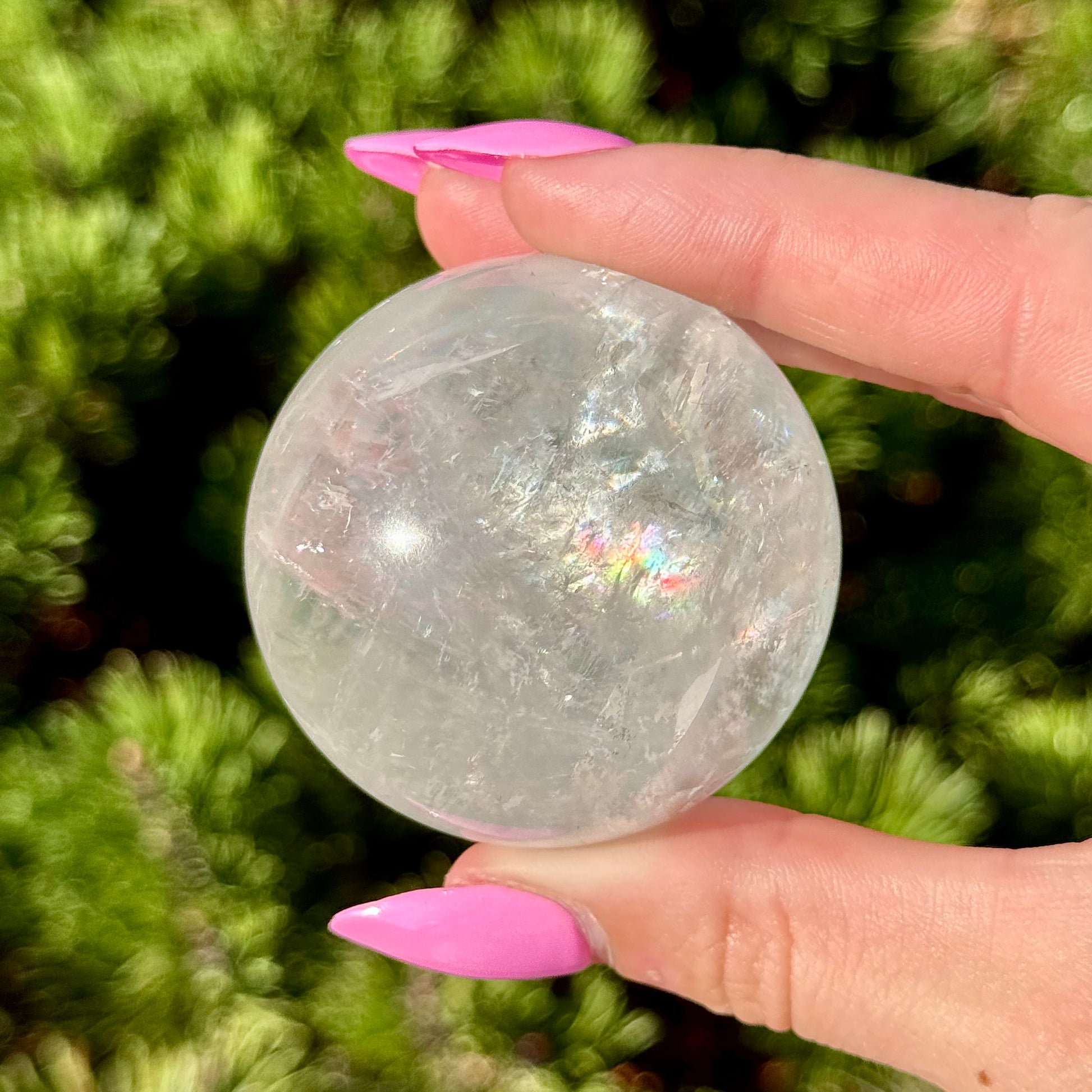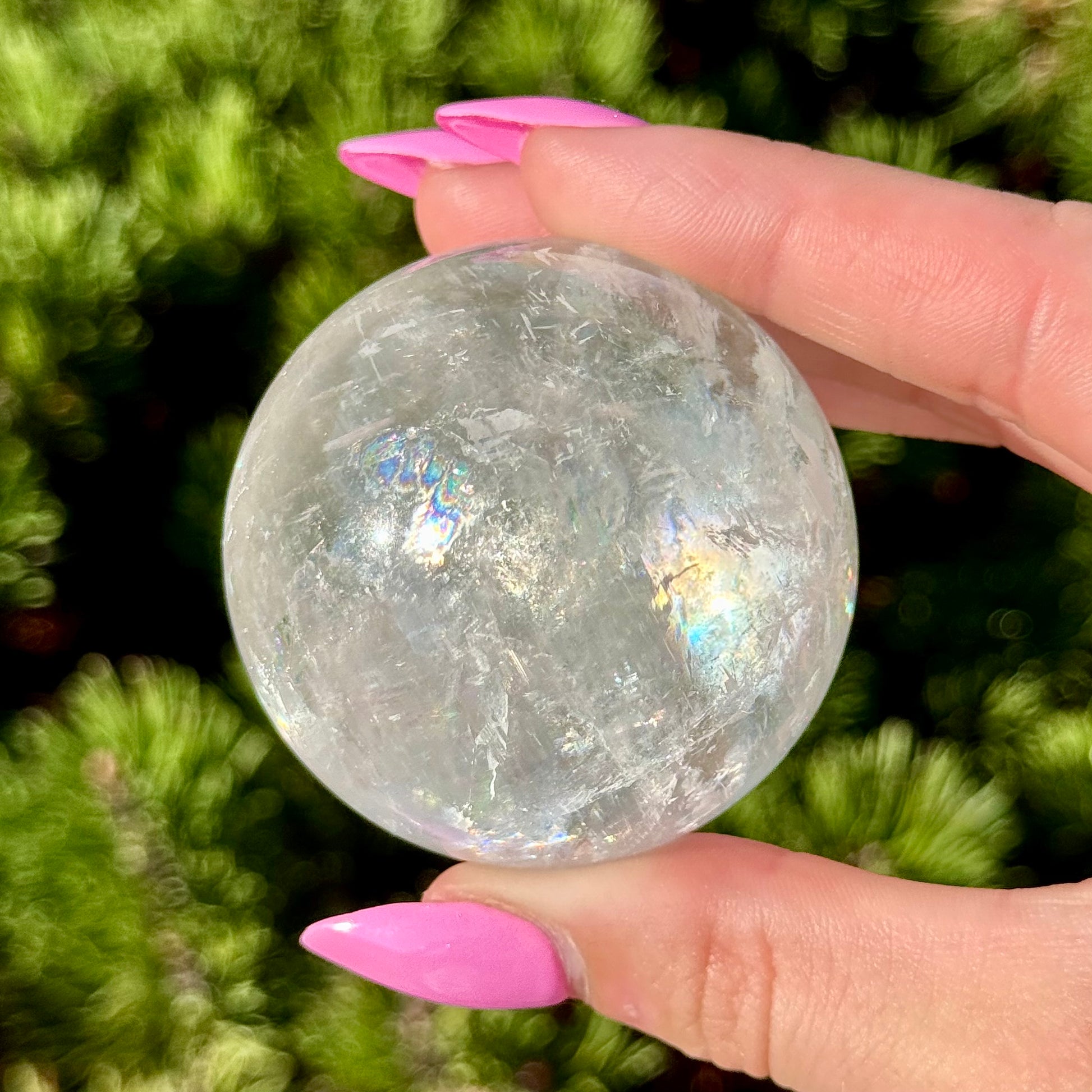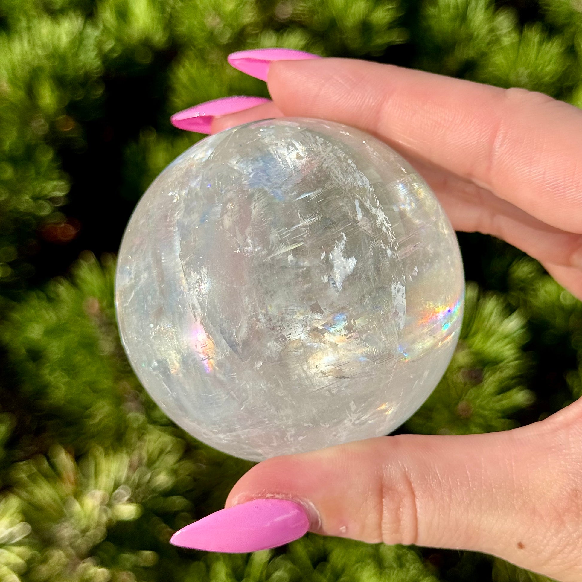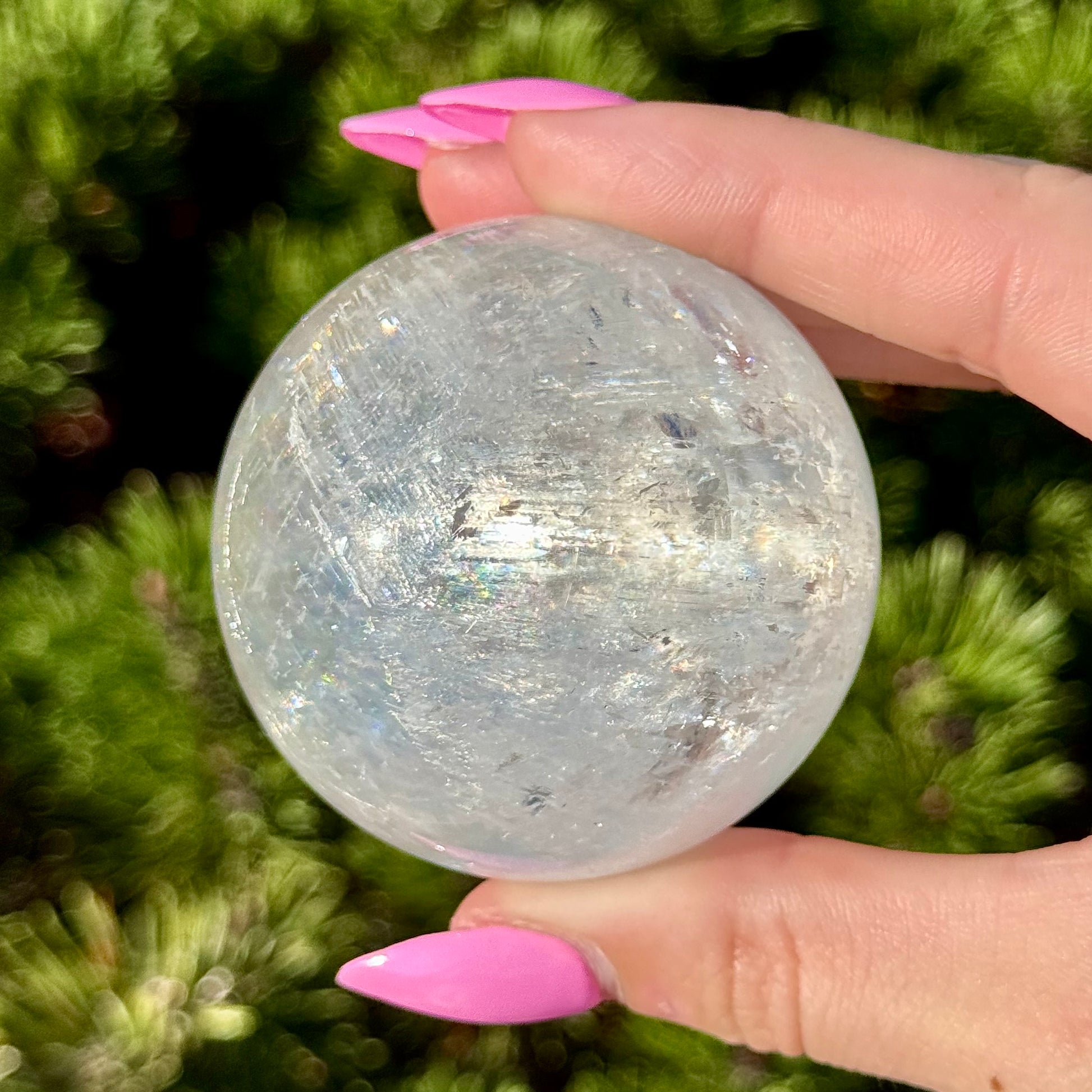 These Optical Calcite Spheres have diameters ranging from 49mm to 61mm. They dazzle with bright flash and vibrant rainbows!