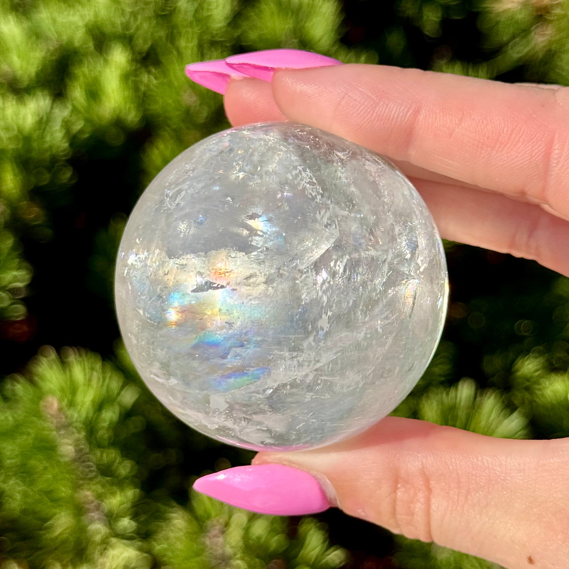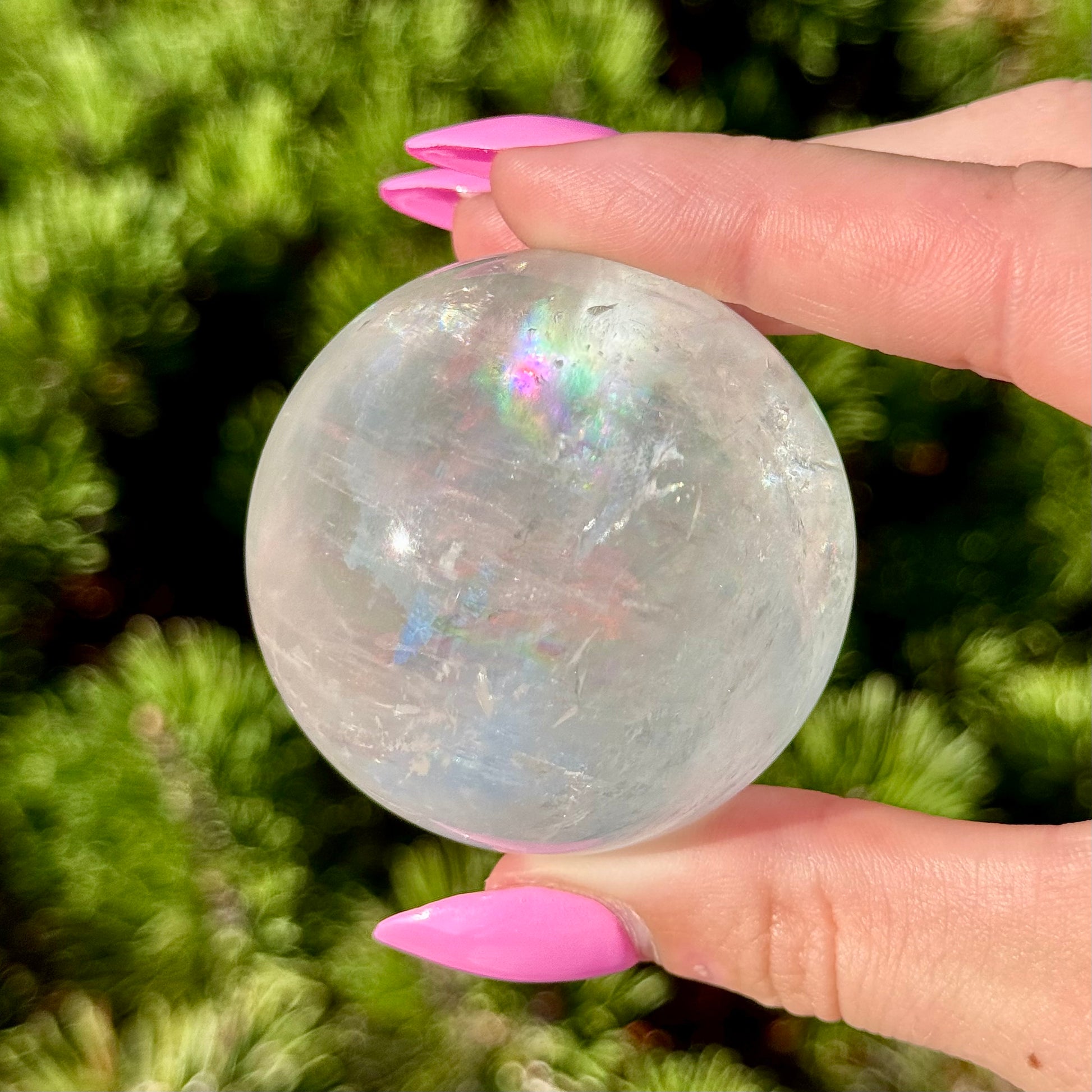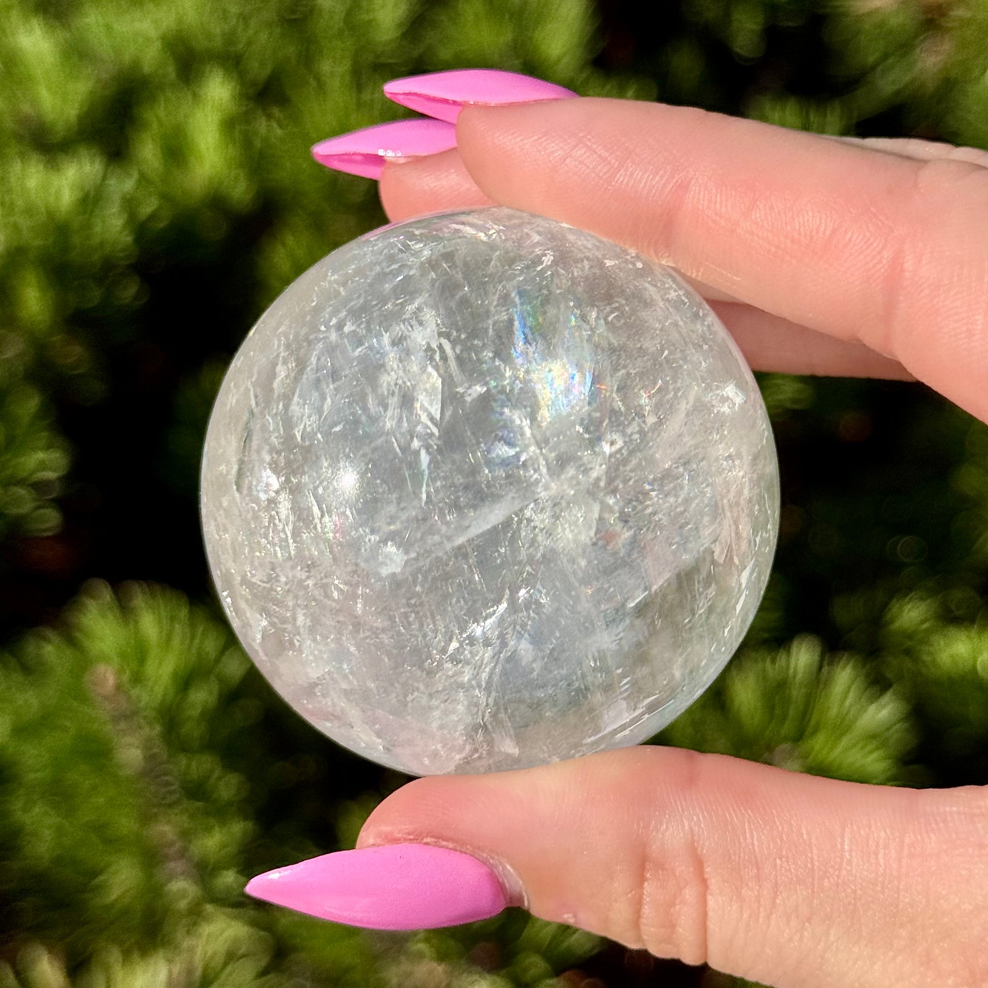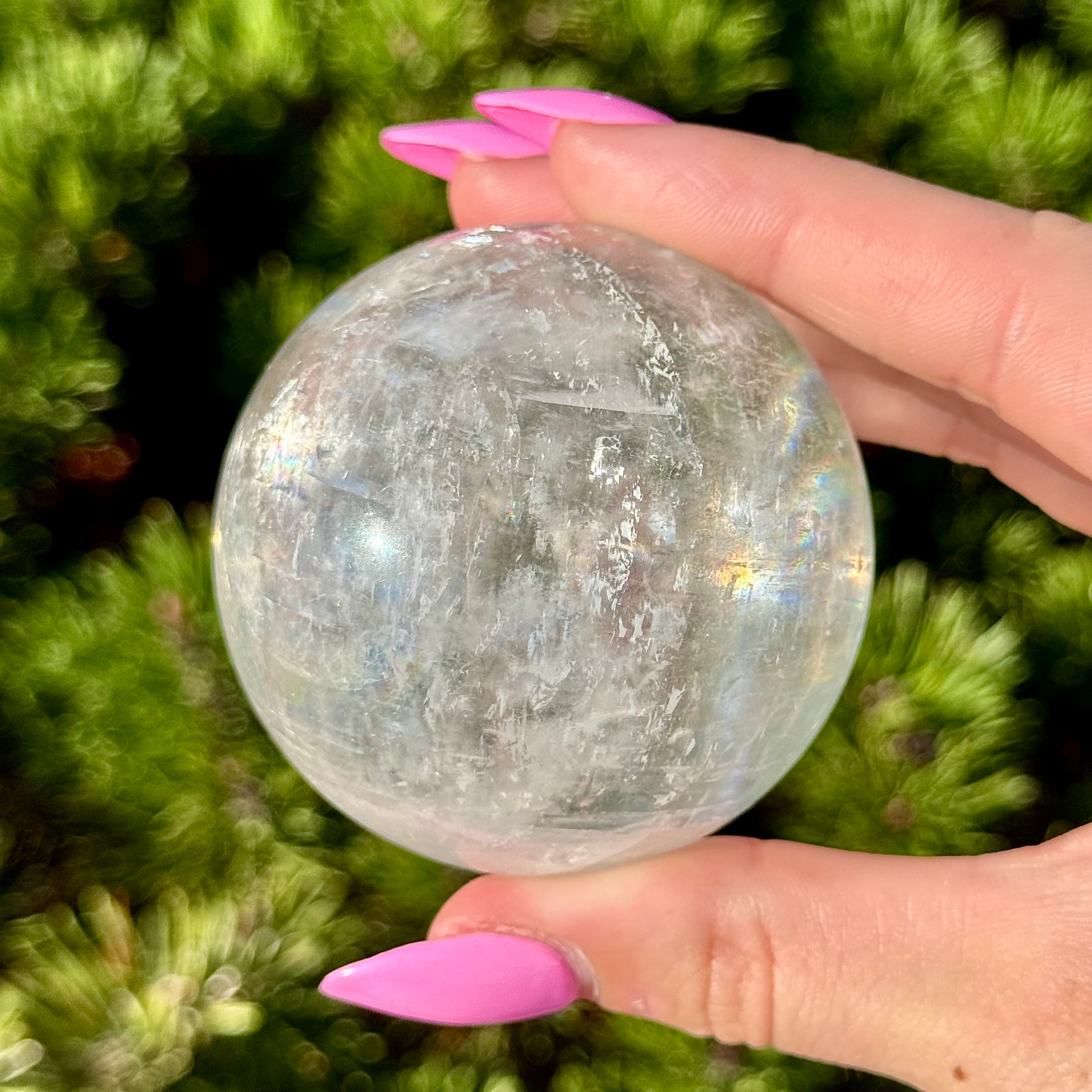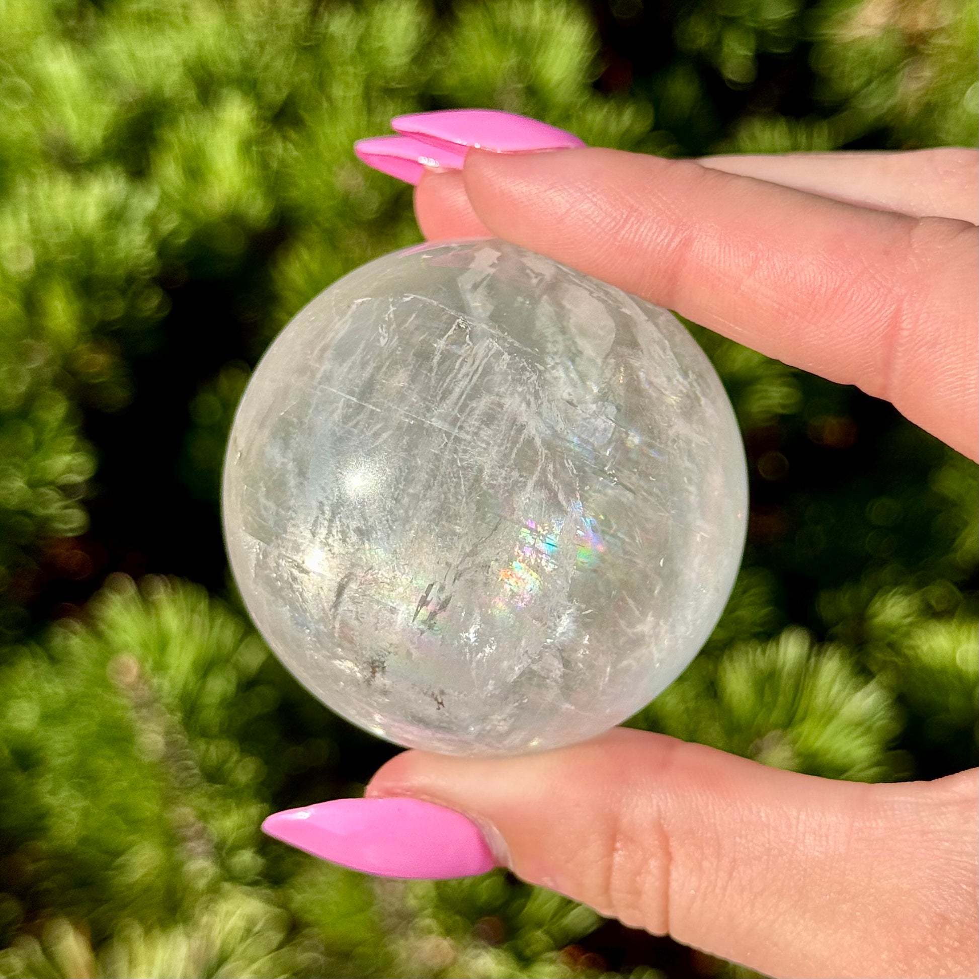 These Optical Calcite Spheres have diameters ranging from 49mm to 61mm. They dazzle with bright flash and vibrant rainbows!